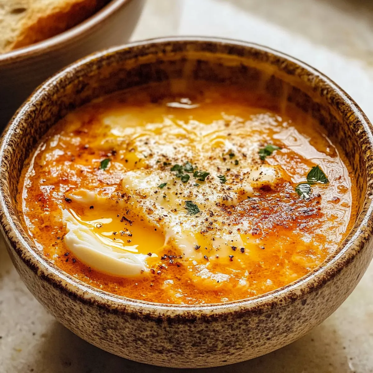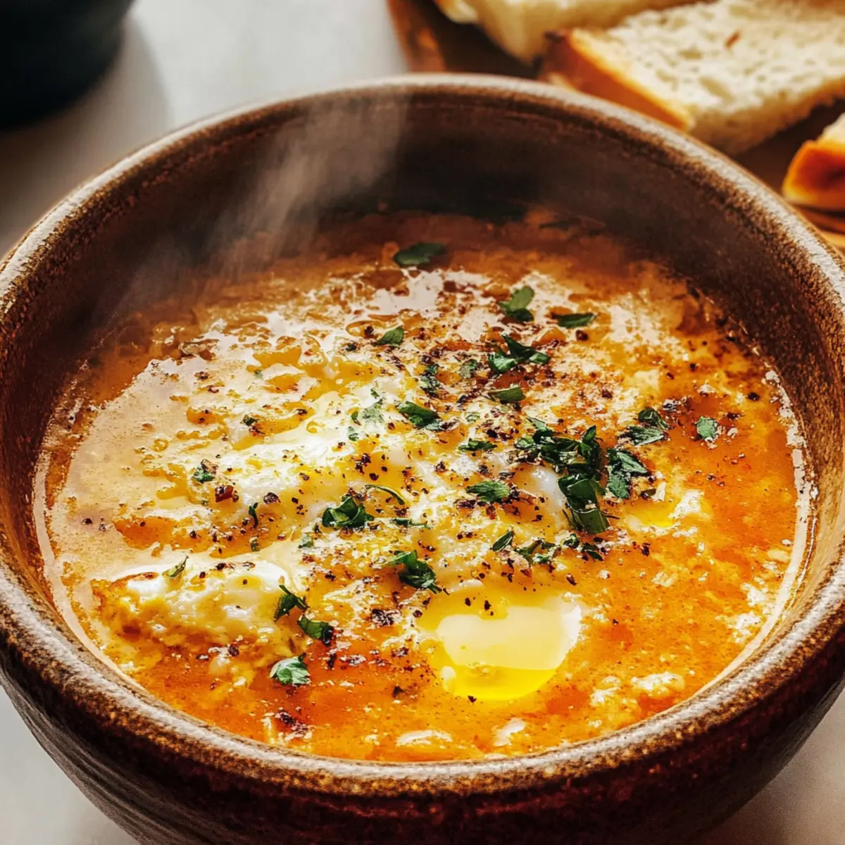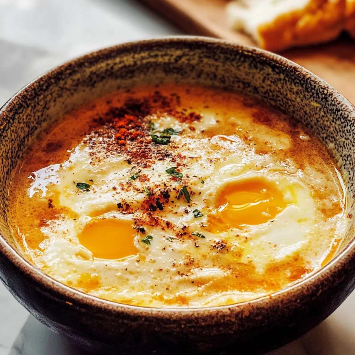 Während ich an einem kühlen Abend am Herd stehe, entfaltet sich der verlockende Duft von gebratenem Knoblauch in meiner Küche und bringt eine wohltuende Wärme mit sich. Diese Sopa de Ajo, die traditionelle spanische Knoblauchsuppe, hat nicht nur den Zauber, die Seele zu erwärmen, sondern ist auch kinderleicht zuzubereiten. Die herrlichen Zutaten wie frischer Knoblauch und herzhafter, alter Brot geben der Suppe ihren unverwechselbaren Charakter. Perfekt als gemütliches Abendessen oder auch als stärkender Snack zwischendurch, bietet sie gleich zwei wunderbare Vorteile: Sie ist eine wahre Freude für jede Geschmacksnase und kann sogar glutenfrei zubereitet werden! Lass uns gemeinsam in die Welt der spanischen Küche eintauchen und entdecken, wie einfach es ist, sich diesen kulinarischen Trost zu Hause zu zaubern. Bist du bereit für ein Rezept, das dich umhauen wird? Warum wirst du die Knoblauchsuppe lieben? Einfachheit: Diese Suppe ist kinderleicht zuzubereiten und erfordert nur minimale Kochkenntnisse, sodass du schnell in den Genuss ihrer Aromen kommst. Wohltuende Wärme: Der tiefgründige Knoblauchgeschmack sorgt dafür, dass du dich sofort wohlfühlst, besonders an kühlen Tagen. Vielseitigkeit: Du kannst das Rezept problemlos anpassen und beispielsweise glutenfreies Brot verwenden oder die Brühe durch Gemüsebrühe ersetzen für eine vegetarische Variante. Nährende Kraft: Die Kombination aus frisch geschnittenem Knoblauch und altbackenem Brot macht diese Suppe nicht nur lecker, sondern auch nahrhaft. Schnelle Zubereitung: Mit nur wenigen Zutaten und in weniger als 30 Minuten fertig, ist sie perfekt für schnelle Abendessen oder spontane Gäste. Genieße die Knoblauchsuppe mit einem Spritzer Olivenöl und einer Prise geräuchertem Paprika für den ultimativen Genuss! Knoblauchsuppe Zutaten • Der folgende Abschnitt enthält die Zutaten für deine köstliche Knoblauchsuppe, die dich mit ihrem Aroma verzaubern wird! Für die Suppe Olivenöl – sorgt für eine reichhaltige Basis und sollte von guter Qualität sein. Knoblauch (8 bis 10 Zehen, sehr dünn geschnitten) – der Hauptgeschmacksträger, dessen Frische entscheidend ist; vermeide vorgehackten Knoblauch. Altes Brot (120 g, zerrissen oder dünn geschnitten) – verleiht der Suppe Struktur; altes Brot nimmt die Brühe auf, ohne matschig zu werden. Geräuchertes Paprika (1 Esslöffel) – sorgt für eine warme und tiefgründige Geschmacksnote; die Menge kann je nach Vorliebe angepasst werden. Hühnerbrühe oder Gemüsebrühe (1,5 bis 2 Liter) – die Basis der Suppe; selbstgemachte Brühe bringt mehr Geschmack, während natriumarme Optionen die Salzigkeit kontrollieren. Eier (4 große, verquirlt) – erzeugen die seidigen Bänder in der Suppe; achte darauf, sie langsam beim Rühren hinzuzufügen für die beste Textur. Salz und Pfeffer – unverzichtbare Gewürze zur Abrundung des Geschmacks; nach eigene Vorliebe anpassen. Für die Garnitur Olivenöl – ein feiner Spritzer obenauf läutet den Genuss ein. Frische Kräuter oder Petersilie – bringen Farbe und Frische dazu, die Suppe ansprechend zu präsentieren. Genieße die Zubereitung deiner Knoblauchsuppe und lass dich von ihrem unverwechselbaren Geschmack überraschen! Schritt-für-Schritt-Anleitung für Knoblauchsuppe Step 1: Olivenöl erhitzen Erhitze in einem großen Topf das Olivenöl bei mittlerer Hitze. Füge die sehr dünn geschnittenen Knoblauchzehen hinzu und brate sie für 2–3 Minuten an, bis sie duften und eine goldene Farbe annehmen, aber nicht braun werden. Achte darauf, dass der Knoblauch nicht anbrennt, um den bitteren Geschmack zu vermeiden. Step 2: Brot hinzufügen Gib das zerrissene alte Brot in den Topf und vermische es gut mit dem Knoblauchöl. Lasse das Brot für weitere 3 Minuten unter gelegentlichem Rühren rösten, damit es die Aromen aufnimmt und leicht knusprig wird. Dadurch erhält die Knoblauchsuppe eine reichhaltige Textur und Geschmackstiefe. Step 3: Brühe einfüllen Gieße die Hühnerbrühe oder Gemüsebrühe in den Topf und zerbrich das Brot dabei in kleinere Stücke, während du umrührst. Bring die Mischung zum kräftigen Simmern und achte darauf, dass das Brot weich wird und die Aromen sich entfalten, etwa 5 Minuten lang. Step 4: Eier einrühren Reduziere die Hitze geringfügig und rühre die verquirlten Eier langsam mit einer Gabel oder einem Schneebesen in die heiße Suppe ein. Dies geschieht idealerweise in einer kreisenden Bewegung, sodass sich zarte Bänder bilden. Achte darauf, dass die Eier gleichmäßig verteilt werden, um eine seidige Textur zu erhalten. Step 5: Abschmecken und anpassen Überprüfe die Konsistenz der Knoblauchsuppe. Wenn sie dir zu dick erscheint, füge nach Belieben etwas mehr Brühe hinzu. Schmecke die Suppe mit Salz, Pfeffer und geräuchertem Paprika ab, sodass die Aromen harmonisch ausgewogen sind und die Suppe pikant wird. Step 6: Servieren Serviere die Knoblauchsuppe sofort in Schüsseln und garniere sie mit einem Spritzer Olivenöl sowie nach Wahl mit frischen Kräutern oder extra geräuchertem Paprika. Diese wohltuende und aromatische Suppe passt hervorragend zu einer Scheibe knusprigem Brot oder einem leichten Salat für eine vollwertige Mahlzeit. Lagerungstipps für Knoblauchsuppe Raumtemperatur:: Knoblauchsuppe sollte nicht bei Raumtemperatur aufbewahrt werden, um die Frische und Sicherheit zu gewährleisten. Kühlschrank:: Bewahre die Suppe in einem luftdichten Behälter im Kühlschrank für bis zu 3 Tage auf, um den besseren Geschmack und die Textur zu erhalten. Gefrierfach:: Du kannst die Knoblauchsuppe bis zu 3 Monate im Gefrierfach aufbewahren. Fülle sie in gefriergeeignete Behälter und lasse etwas Platz für die Ausdehnung. Wiedererwärmen:: Erwärme die Suppe sanft auf dem Herd, füge nach Wunsch frisches Brot hinzu, um die ideale Konsistenz zu bewahren. Was passt zu Knoblauchsuppe? Während du die herrliche Knoblauchsuppe genießt, möchte ich dir einige köstliche Begleiter vorschlagen,