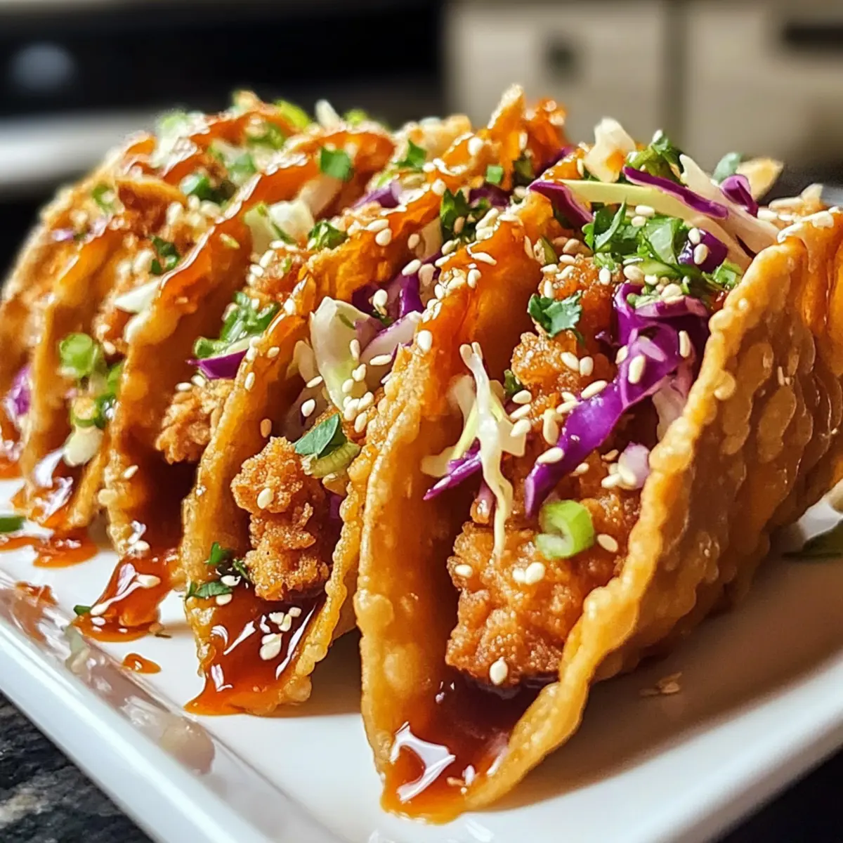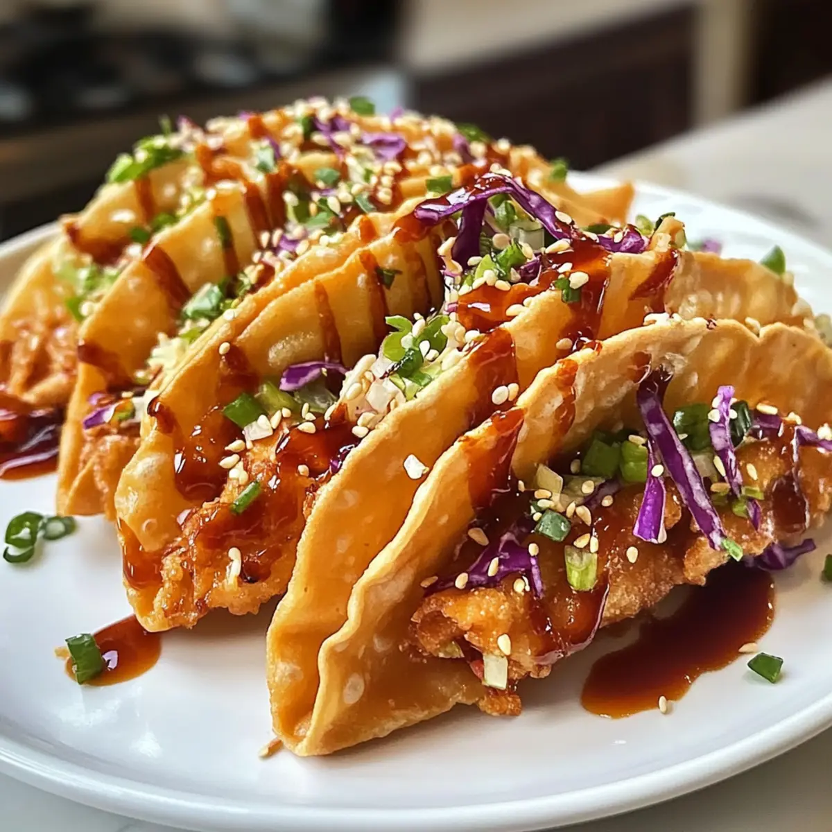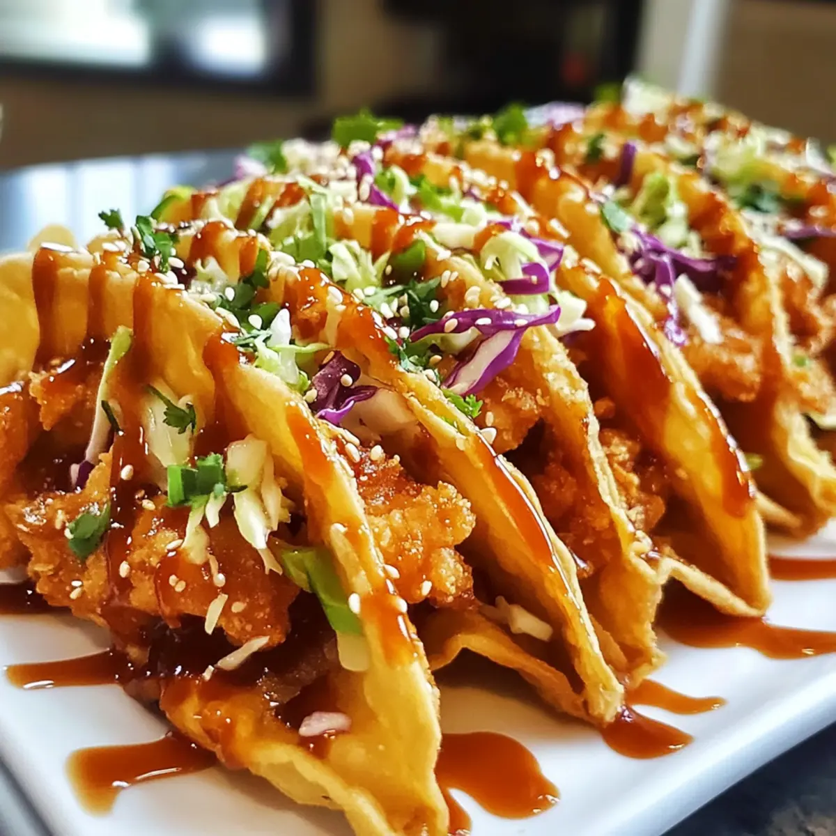 Eines Abends saß ich in meiner Küche und überlegte, was ich aus den Zutaten zaubern könnte, die ich noch im Kühlschrank hatte. Plötzlich kam ich auf die geniale Idee, knusprige Hühnchen-Wonton-Tacos zu kreieren! Diese kleinen Geschmacksexplosionen verbinden den perfekten Crunch von frittierten Wonton-Hüllen mit zartem Teriyaki-Hühnchen und einer bunten, frischen Coleslaw. Dieses Rezept ist nicht nur eine geniale Lösung für hektische Abende, wenn du etwas Beeindruckendes, aber dennoch Schnelles möchtest, sondern auch ein garantierter Hit für deine Gäste. In weniger als 30 Minuten zauberst du ein köstliches Gericht, das schön aussieht und fantastisch schmeckt. Bist du bereit, deine eigenen Wonton-Tacos zu kreieren und das Geschmackserlebnis deiner Küche neu zu definieren? Warum sind Wonton-Tacos ein Muss? Knusprig und lecker: Die Wonton-Hüllen sorgen für einen unwiderstehlichen Crunch, der jeden Biss zum Erlebnis macht. Einfache Zubereitung: In weniger als 30 Minuten kannst du ein Gourmet-Gericht zaubern – perfekt für stressige Abende! Vielseitige Variationen: Egal ob Hühnchen, Garnelen oder Tofu – die Möglichkeiten sind endlos! Frische und Farbe: Die knackige Coleslaw bringt Frische und sorgt für eine ansprechende Präsentation. Party-tauglich: Egal ob als Fingerfood oder Teil eines Taco-Buffets, diese Tacos sind der Hit bei jedem Fest. Wenn du auf der Suche nach weiteren schnellen Rezepten bist, schau dir auch die Kunst der Espresso und das Kinder Bueno Dessert an! Knusprige Hühnchen-Wonton-Taco-Zutaten Für die Füllung Hähnchenbrust ohne Knochen und Haut – Eine großartige Proteinquelle; du kannst auch Garnelen oder Mett verwenden, um verschiedene Geschmäcker zu entdecken. Teriyaki-Sauce – Verleiht Süße und Umami; für mehr Kontrolle über die Zutaten, probiere selbstgemachte Teriyaki-Sauce. Sesamöl – Fügt reichhaltigen Geschmack und Feuchtigkeit hinzu; neutrales Öl kann alternativ verwendet werden. Sojasauce (low-sodium) – Verstärkt den Umami-Geschmack ohne überwältigende Salzigkeit; Tamari ist eine glutenfreie Option. Knoblauch (gehackt) – Bringt ein aromatisches Aroma; keine Substitute nötig. Frischer Ingwer (gerieben) – Fügt Wärme und Zestigkeit hinzu; gemahlener Ingwer kann verwendet werden, wenn frisch nicht verfügbar ist. Für die Coleslaw Coleslaw-Mix (Kohl und Karotten) – Bietet Crunch und Frische; Brokkoli-Slaw kann als alternative Textur verwendet werden. Frühlingszwiebeln (in feine Ringe geschnitten) – Frisches Garnish mit mildem Zwiebelgeschmack; keine Substitute empfohlen. Reisessig – Balanciert die Aromen der Coleslaw; Apfelessig kann im Notfall eingesetzt werden. Honig – Gibt der Coleslaw eine süße Note; für vegane Optionen kann Ahornsirup verwendet werden. Für die Tacos Wonton-Hüllen – Der knusprige Rahmen für die Tacos; gebackene Tortillachips sind eine alternative Möglichkeit. Süßsauer-Sauce – Zum Beträufeln für Süße und einen Hauch von Schärfe; Sriracha ist eine würzigere Option. Sesamkörner – Garniert mit nussigem Geschmack; keine Substitute nötig. Frischer Koriander (gehackt) – Frisches Kräutergarnish, das die Frische verstärkt; Petersilie kann verwendet werden, wenn Koriander nicht bevorzugt wird. Diese knusprigen Hühnchen-Wonton-Tacos sind perfekt für ein schnelles, schmackhaftes Abendessen! Step-by-Step Instructions für Knusprige Hühnchen-Wonton-Tacos Step 1: Hähnchen marinieren In einer Schüssel das Hähnchen mit Teriyaki-Sauce, ½ Esslöffel Sesamöl, Sojasauce, Knoblauch und Ingwer vermengen. Alles gut umrühren, damit das Hähnchen gleichmäßig bedeckt ist. Lass die Mischung für etwa 10 Minuten stehen, damit die Aromen einziehen können. Step 2: Hähnchen anbraten Eine große Pfanne bei mittlerer Hitze erhitzen. Gib das marinierte Hähnchen in die Pfanne und brate es 5 bis 7 Minuten lang an. Rühre regelmäßig um, bis das Hähnchen vollständig durchgegart ist und keine rosa Stellen mehr sichtbar sind. Step 3: Coleslaw vorbereiten Während das Hähnchen brät, in einer separaten Schüssel den Coleslaw-Mix mit den geschnittenen Frühlingszwiebeln, Reisessig, Honig und dem restlichen Sesamöl vermengen. Gut umrühren, damit alle Zutaten gut vermischt sind, und lass den Coleslaw kurz ruhen, um die Aromen zu entfalten. Step 4: Wonton-Hüllen frittieren In einem kleinen Topf ½ Zoll Öl bei mittlerer Hitze erhitzen. Sei vorsichtig und teste die Temperatur, indem du einen Holzlöffel hineinlegst; wenn sich Blasen bilden, ist das Öl bereit. Frittier die Wonton-Hüllen 20 bis 30 Sekunden pro Seite, bis sie goldbraun und knusprig sind. Auf Küchentüchern abtropfen lassen. Step 5: Tacos zusammenstellen Nimm eine knusprige Wonton-Hülle und füge eine Portion des gebratenen Hähnchens hinzu. Gib eine großzügige Menge des vorbereiteten Coleslaws darauf und beträufle alles mit Süßsauer-Sauce. Garniere die Tacos mit Sesamkörnern und frisch gehacktem Koriander für ein tolles Finish. Praktische Tipps für Knusprige Hühnchen-Wonton-Tacos Wonton richtig lagern: Halte die Wonton-Hüllen während der Zubereitung mit einem feuchten Papiertuch bedeckt, damit sie nicht austrocknen. Doppelte Marinade: Verdopple die Menge der Teriyaki-Sauce für die Marinade und reserviere die andere Hälfte, um das gebratene Hähnchen später zu verfeinern. Öltest durchführen: Prüfe die Temperatur des Frittieröls mit einem Holzstäbchen; wenn sofort Blasen aufsteigen, ist es bereit zum Frittieren. Eine frische Zusammenstellung: Bereite das Hähnchen und den Coleslaw im Voraus zu, aber assembliere die Tacos kurz vor dem Servieren, um den Knusprigkeitsfaktor zu bewahren. Flexible Füllungen: Experimentiere mit verschiedenen Proteinen wie Garnelen oder Tofu, um deine Knusprigen Hühnchen-Wonton-Tacos immer wieder neu zu gestalten. Was passt gut zu knusprigen Hühnchen-Wonton-Tacos? Verwandle diese köstlichen Tacos in ein vollkommenes Geschmackserlebnis, indem du sie mit passenden Beilagen