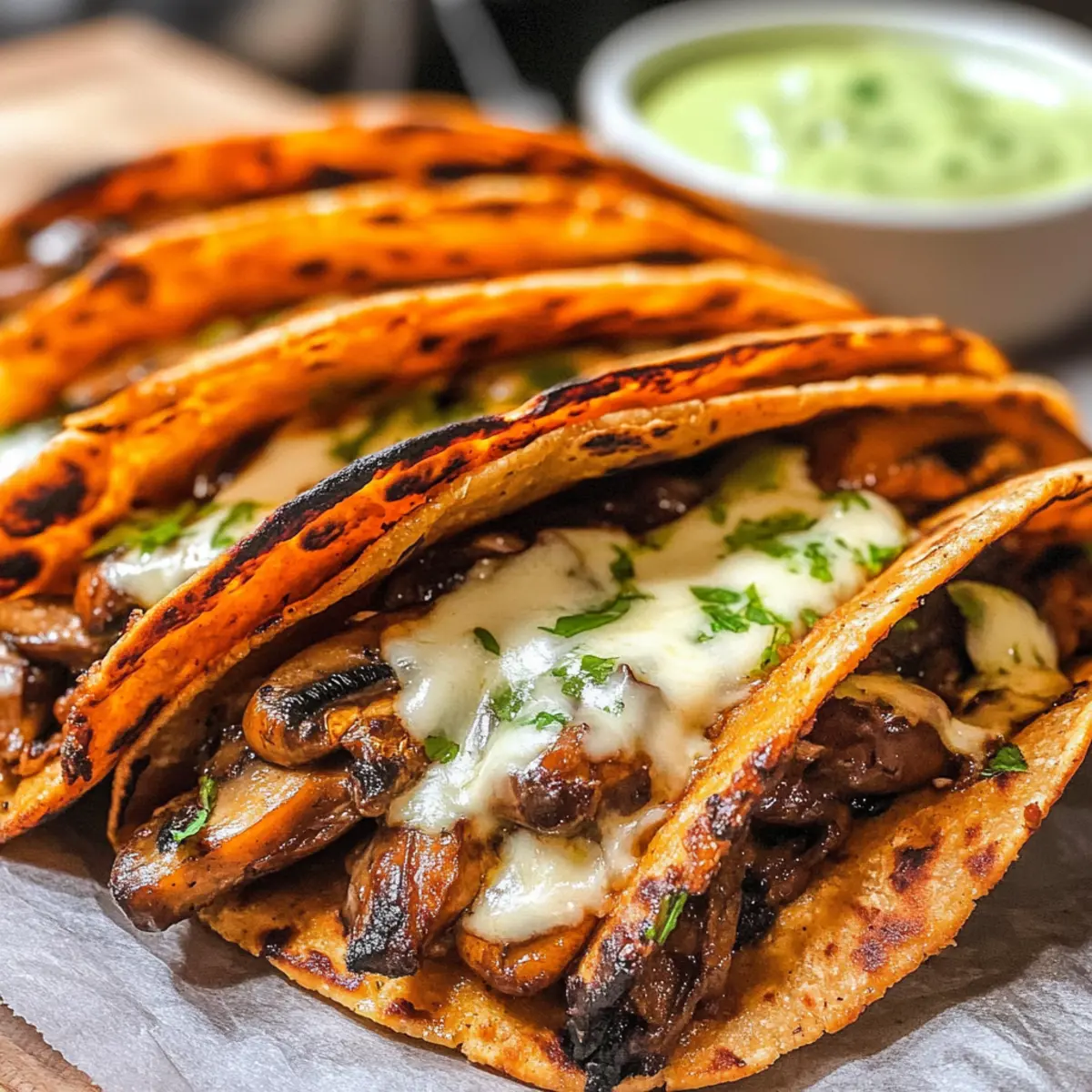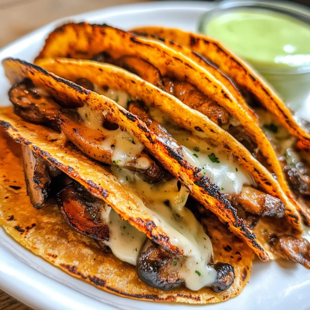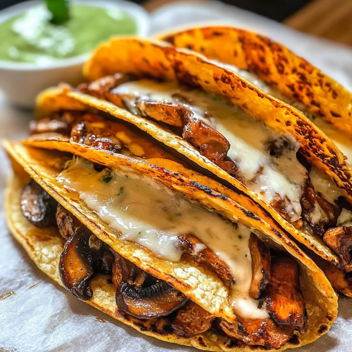 Wenn ich an einen gemütlichen Abend bin, kommt mir sofort der verführerische Gedanke an knusprige Pilz-Tacos in den Sinn! Diese wunderbaren Tacos kombinieren sautierte, saftige Champignons mit schmelzender veganer Mozzarella und goldbraunem Tortilla-Teig – ein echtes Fest für die Sinne. Sie sind nicht nur eine einfache und schnelle Abendessen-Option, sondern auch eine großartige Möglichkeit, das schnelle Essen hinter sich zu lassen und liebevoll zubereitete Mahlzeiten zu genießen. Der zusätzliche Crunch und die herzhafte Füllung machen sie zum perfekten Komfortessen, das selbst an stressigen Tagen Freude bereitet. Ich kann mir gar nicht helfen – hast du schon einmal darüber nachgedacht, was du in deinen Tacos verstecken könntest? Lass uns gemeinsam in die köstliche Welt der knusprigen Pilz-Tacos eintauchen! Warum werden diese Tacos dein Favorit? Einfachheit: Die Zubereitung der knusprigen Pilz-Tacos ist unkompliziert und benötigt nur wenige Schritte, perfekt auch für Kochanfänger. Cremiger Genuss: Die Kombination aus Veganer Mozzarella und zarten Pilzen sorgt für ein geschmackliches Erlebnis, das selbst Käseliebhaber begeistern wird. Vielseitigkeit: Du kannst die Taco-Füllung ganz nach deinem Geschmack anpassen, indem du verschiedene Pilzsorten oder sogar zusätzliche Gemüse wie Spinat hinzufügst. Schnell zubereitet: Die Tacos sind in weniger als 30 Minuten fertig – eine ideale Lösung für spontane Abendessen! Beliebte Wahl: Diese Tacos sind ein Hit bei Freunden und Familie, perfekt für gesellige Abende oder gemütliche Dinnerpartys. Knusprige Pilz-Taco-Zutaten Für die Füllung • Champignons – Die Hauptzutat, die Geschmack und Textur liefert; ersetze sie durch Cremini oder Portobello für mehr Tiefe. • Zwiebel – Fügt Süße und Aroma hinzu; Schalotten können für einen milderen Geschmack verwendet werden. • Olivenöl – Essentiell zum Anbraten der Füllung und Frittieren der Tacos für eine knusprige Außenschicht; Avocadoöl hat einen höheren Rauchpunkt. • Sojasauce – Verleiht der Füllung eine umami Tiefe; Tamari ist eine glutenfreie Option. • Paprika – Sorgt für einen subtilen, rauchigen Geschmack; Cayenne kann für zusätzliche Schärfe verwendet werden. • Knoblauchpulver – Verstärkt den herzhaften Geschmack; frischer, gehackter Knoblauch bietet einen intensiveren Geschmack. • Schwarzer Pfeffer – Zum Würzen der Füllung; nach Geschmack anpassen. • Wasser oder Gemüsebrühe – Hält die Füllung saftig, ohne sie wässrig zu machen. Für die Tacos • Tortillas – Die Basis für deine Tacos, bieten Crunch beim Frittieren; Mais-Tortillas sind eine glutenfreie Option. • Vegane Mozzarella – Schmilzt und bindet die Füllung, sorgt für Cremigkeit; du kannst auch andere vegane Käsesorten verwenden. • Olivenöl zum Frittieren – Sorgt für eine knusprige Außenseite und schmilzt den Käse effektiv. Schritt-für-Schritt-Anleitung für Knusprige Pilz-Tacos Schritt 1: Champignons anbraten Erhitze in einer großen Pfanne 2 Esslöffel Olivenöl bei mittlerer Hitze. Füge die geschnittenen Champignons hinzu und lasse sie für 2-3 Minuten ungestört anbraten, bis sie eine goldene Farbe annehmen. Rühre sie dann um und koche weiter, bis die Flüssigkeit vollständig verdampft ist und die Champignons weich sind, etwa weitere 5 Minuten. Schritt 2: Zwiebel weich dünsten Gib die gewürfelte Zwiebel zu den Champignons in die Pfanne und brate sie für etwa 2-3 Minuten mit, bis sie weich und aromatisch ist. Achte darauf, dass die Zwiebel eine transparente Farbe annimmt, um die Süße hervorzuheben und die Füllung der Knusprigen Pilz-Tacos noch schmackhafter zu machen. Schritt 3: Füllung würzen Mische nun 2 Esslöffel Sojasauce, 1 Teelöffel Paprika, 1 Teelöffel Knoblauchpulver sowie frisch gemahlenen schwarzen Pfeffer nach Geschmack unter die Pilz-Zwiebel-Mischung. Gib einen Spritzer Wasser oder Gemüsebrühe hinzu, um die Füllung saftig zu halten, und koche alles zusammen für weitere 2 Minuten, bis die Aromen gut durchgezogen sind. Schritt 4: Tacos zusammenstellen Nimm die Tortillas und lege auf die Hälfte jeder Tortilla eine Schicht vegane Mozzarella. Bedecke die Käseschicht großzügig mit der Champignonfüllung und füge eine weitere Schicht Mozzarella darüber hinzu. Klappe die Tortilla vorsichtig zu, sodass die Füllung vollständig umschlossen ist, und bereite dich auf das Frittieren vor. Schritt 5: Tacos frittieren Erhitze in der Pfanne bei mittlerer Hitze erneut 2-3 Esslöffel Olivenöl. Lege die gefüllten Tacos vorsichtig in das heiße Öl und brate sie für etwa 2-3 Minuten auf jeder Seite goldbraun und knusprig an. Achte darauf, die Tacos sanft zu drücken, um eine gleichmäßige Knusprigkeit zu erzielen, und serviere sie heiß, um die perfekte Textur zu genießen. Lagerungstipps für Knusprige Pilz-Tacos Zimmertemperatur: Die Tacos sollten am besten direkt nach dem Frittieren serviert werden, um ihre knusprige Textur zu genießen. Kühlschrank: Übrig gebliebene Tacos in einem luftdichten Behälter können bis zu 2 Tage aufbewahrt werden. Stelle sicher, dass sie abgekühlt sind, bevor du sie lagerst, um Feuchtigkeit zu vermeiden. Gefrierer: Für eine längere Lagerung können die gefüllten Tacos bis zu 1 Monat im Gefrierschrank aufbewahrt werden. Wickele sie gut in Folie oder einen Gefrierbeutel, um Gefrierbrand zu vermeiden. Wiedererwärmung: Zum Aufwärmen die Tacos im Ofen bei 180 °C ca. 10–15 Minuten backen, bis sie wieder knusprig sind. So bleibt der Genuss der knusprigen Pilz-Tacos erhalten! Was passt gut zu Knusprigen Pilz-Tacos? Genieße ein vollständiges Geschmackserlebnis, indem du diese köstlichen Tacos mit ausgewählten Beilagen kombinierst, die sowohl Farben als auch Aromen bereichern. Frischer Salat: Ein knackiger, grüner Salat bringt eine erfrischende Note, die die herzhaften Tacos perfekt ergänzt und für ein leichtes, ausgewogenes Abendessen sorgt. Guacamole: Diese cremige Avocado-Dip is