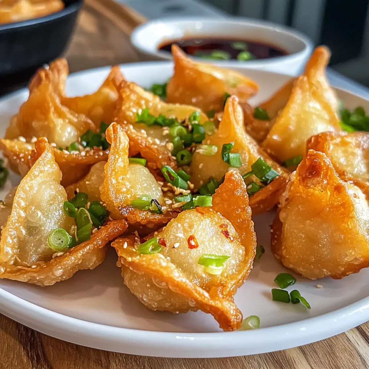 8. Anrichten und servieren: Richte die Wontons auf einem Teller an und serviere sie mit Dip-Saucen.