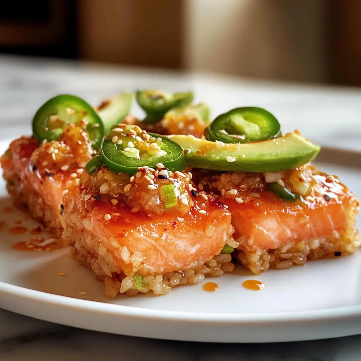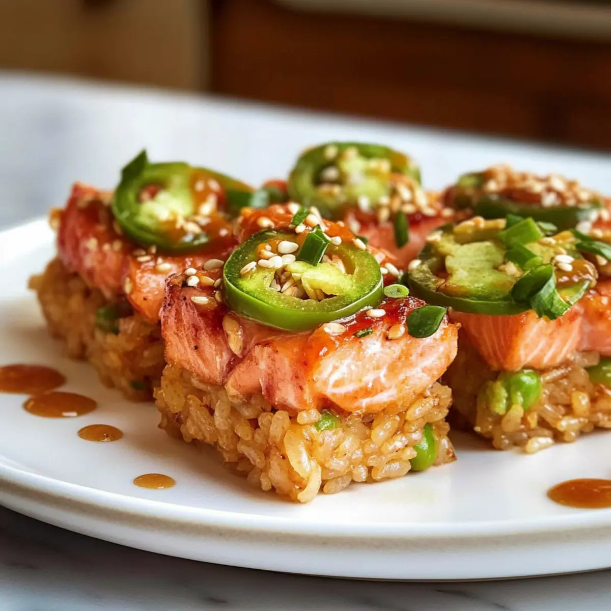 Eines der besten Dinge am Kochen ist die Möglichkeit, sich selbst in die besten Sushi-Restaurants der Stadt zu versetzen. Bei der Zubereitung von Krossreis mit würzigem Lachs erlebe ich einen wahren Geschmackstransport, der die knusprige Textur des Reises mit der saftigen Intensität des Lachses kombiniert. Dieses Rezept bietet nicht nur eine einfache und blitzschnelle Zubereitung, sondern ist auch ein echter Hingucker für jede Dinner-Party oder einen gemütlichen Abend mit der Familie. Ergänzt durch cremige Avocado und eine süßliche Chili-Sauce wird jeder Bissen zu einem Erlebnis, das wiederholt werden will! Neugierig, wie du dieses delikate Gericht selbst zubereiten kannst? Lass uns gemeinsam loslegen! Warum wirst du dieses Rezept lieben? Einfachheit: Die Zubereitung von Krossreis mit würzigem Lachs erfordert nur grundlegende Kochfähigkeiten und ist schnell gemacht. Vielfältig: Variiere die Zutaten mit anderen Sushi-Fischen wie Thunfisch oder verwende Dosenlachs für einen blitzschnellen Genuss. Exquisite Aromen: Die Kombination aus knusprigem Reis, würzigem Lachs und cremiger Avocado sorgt für ein Geschmackserlebnis, das dem besten Sushi-Restaurant in nichts nachsteht. Beeindruckend: Ideal für Dinnerpartys oder gesellige Abende, bringt dieses Gericht sowohl Freunde als auch Familie zum Staunen. Gesund und nahrhaft: Mit gesunden Fetten aus der Avocado und einer ausgewogenen Proteinquelle ist dieses Rezept nicht nur köstlich, sondern auch nahrhaft. Lass dich auch von einem weiteren Rezept inspirieren wie dem Haehnchen Geschnittene Salat, das die perfekte Ergänzung zu deinem kulinarischen Repertoire darstellt! Krossreis mit würzigem Lachs Zutaten Für den Reis Kurzkornreis (Sushi-Reis) – Sorgt für die perfekte klebrige Konsistenz, um die Reisblöcke zu formen; benutze unbedingt Sushi-Reis für die besten Ergebnisse. Reisessig – Fügt eine angenehme Säure hinzu, die den Reichtum des Lachses ausgleicht; kann auch durch weißen Weinessig ersetzt werden. Zucker – Süßt die Reis-Mischung und balanciert die Aromen; Honig oder Agavendicksaft sind geeignete Alternativen. Küchen- oder Meersalz – Verstärkt den Geschmack des Reises; reguliere die Menge, wenn normales Salz verwendet wird, da es salziger sein kann. Neutraler Hochtemperatur-Öl (zum Frittieren) – Unentbehrlich für die Zubereitung der knusprigen Textur; verwende Raps- oder Pflanzenöl. Für den würzigen Lachs Sushi-Qualitätslachs (hautlos) – Der Hauptbestandteil, der den intensiven Geschmack bringt; du kannst auch Sushi-Qualität Thunfisch oder Dosenlachs verwenden. Kewpie-Mayo – Fügt eine cremige Textur mit Umami-Geschmack hinzu und verstärkt die Würze; normale Mayonnaise ist eine alternative Option. Sriracha – Gibt der Lachsmischung eine angenehme Schärfe; passe die Menge nach deinem Geschmack an. Sojasauce – Verleiht der Lachsmischung eine salzige und umami-tiefe Note; Tamari kann für eine glutenfreie Variante genutzt werden. Geröstetes Sesamöl – Fügt einen nussigen Geschmack hinzu, ein extra Schluck für das Servieren sorgt für zusätzlichen Genuss. Für die Garnitur Frühlingszwiebel – Fein gehackt für Frische und zur Garnierung. Avocado – In Scheiben serviert, bringt sie Cremigkeit und balanciert die Schärfe; Gurken können für eine andere Textur verwendet werden. Jalapeño – Bringt einen frischen und scharfen Kick; kann weggelassen oder durch eine mildere Paprika ersetzt werden. Geröstete weiße Sesamsamen – Für den Crunch und als Garnitur. Süßsauere Chilisauce – Für die optimale Präsentation und als süßer Abschluss. Mit diesem köstlichen Rezept für Krossreis mit würzigem Lachs hast du die perfekten Zutaten zur Hand, um deine Gäste zu beeindrucken und für ein einmaliges Geschmackserlebnis zu sorgen! Schritt-für-Schritt-Anleitung für Krossreis mit würzigem Lachs Step 1: Reis zubereiten Spüle den Kurzkornreis (Sushi-Reis) gründlich unter kaltem Wasser ab, bis das Wasser klar ist. Koche den Reis nach Packungsanweisung in einem Reiskocher oder Topf. Währenddessen in einem kleinen Topf Reisessig, Zucker und Salz bei mittlerer Hitze erwärmen, bis sich alles aufgelöst hat. Gieße die Mischung über den gekochten Reis und fächele ihn, um ihn abzukühlen. Step 2: Reis drücken Lege eine 20×20 cm große Backform mit Frischhaltefolie aus und drücke den abgekühlten, gewürzten Reis gleichmäßig hinein, sodass eine flache Schicht entsteht. Stelle die Form in den Gefrierschrank und lasse den Reis etwa 3 Stunden frieren, bis er fest ist. Dies gibt dem Krossreis seine Form und Textur. Step 3: Würzigen Lachs zubereiten Während der Reis gefriert, würfle den sushi-qualitätslachs und kombiniere ihn in einer Schüssel mit Kewpie-Mayo, Sriracha, Sojasauce, geröstetem Sesamöl und fein gehackten Frühlingszwiebeln. Mische alles gut und stelle die Schüssel abgedeckt in den Kühlschrank, damit sich die Aromen von Krossreis mit würzigem Lachs entfalten. Step 4: Reis frittieren Heize in einer großen Pfanne genügend Öl (etwa 1 cm hoch) bei mittlerer bis hoher Hitze auf. Schneide den gefrorenen Reis in Rechtecke (ca. 18 Stück) und lege sie vorsichtig in die heiße Pfanne. Frittiere die Reisblöcke etwa 2–3 Minuten pro Seite, bis sie goldbraun und knusprig sind. Lass sie auf Papiertüchern abtropfen. Step 5: Gericht anrichten Platziere jeden knusprigen Reisblock auf einem Servierteller. Belege die Blöcke großzügig mit einer Scheibe Avocado, einer Portion des würzigen Lachses und, falls gewünscht, mit Jalapeños. Beträufle alles mit geröstetem Sesamöl und süß-saurer Chilisauce für eine köstliche Präsentation. Sofort servieren und genießen! Expertentipps für Krossreis mit würzigem Lachs Reis richtig zubereiten: Achte darauf, den Sushi-Reis gründlich zu spülen; das sorgt für eine perfekte Klebrigkeit und verhindert zerfallende Reisblöcke. Kühlzeit nicht verkürzen: Lass den Reis ausreichend im Gefrierfach, damit er fest wird. Andernfalls 