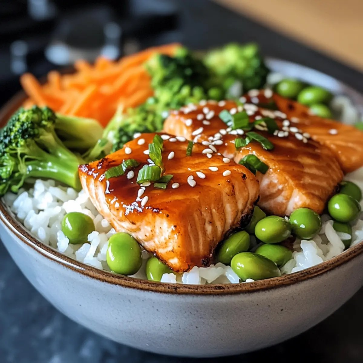 Genießen Sie eine köstliche Krustiger Lachs und Reis Schüssel, perfekt für ein schnelles und gesundes Abendessen.