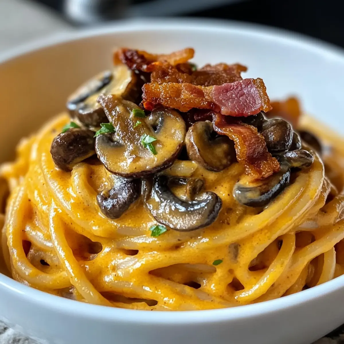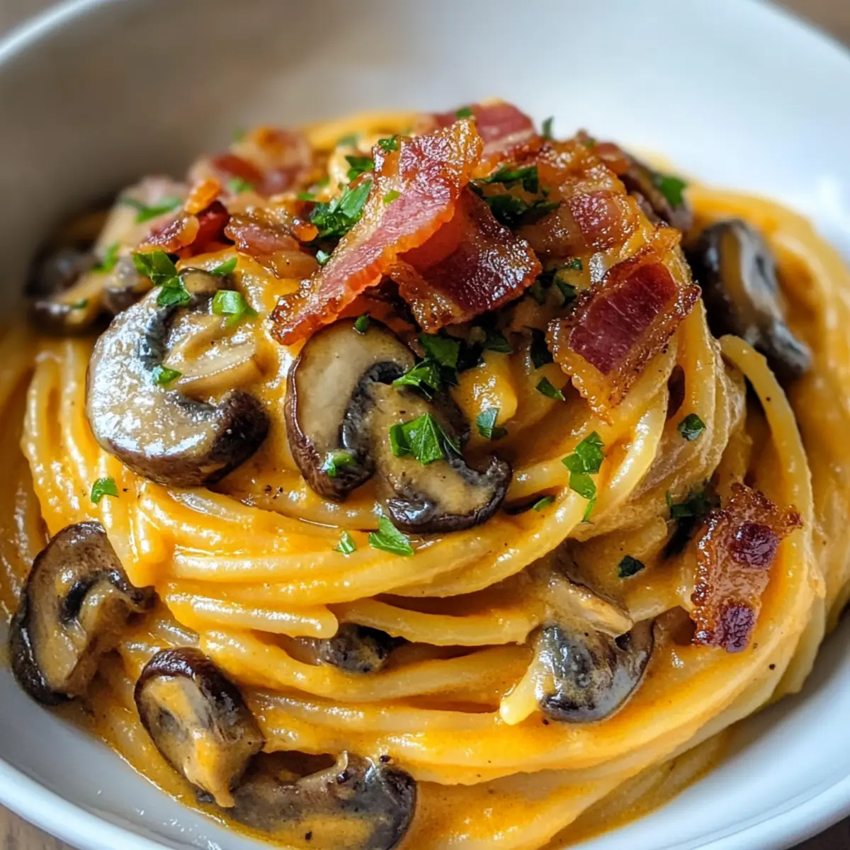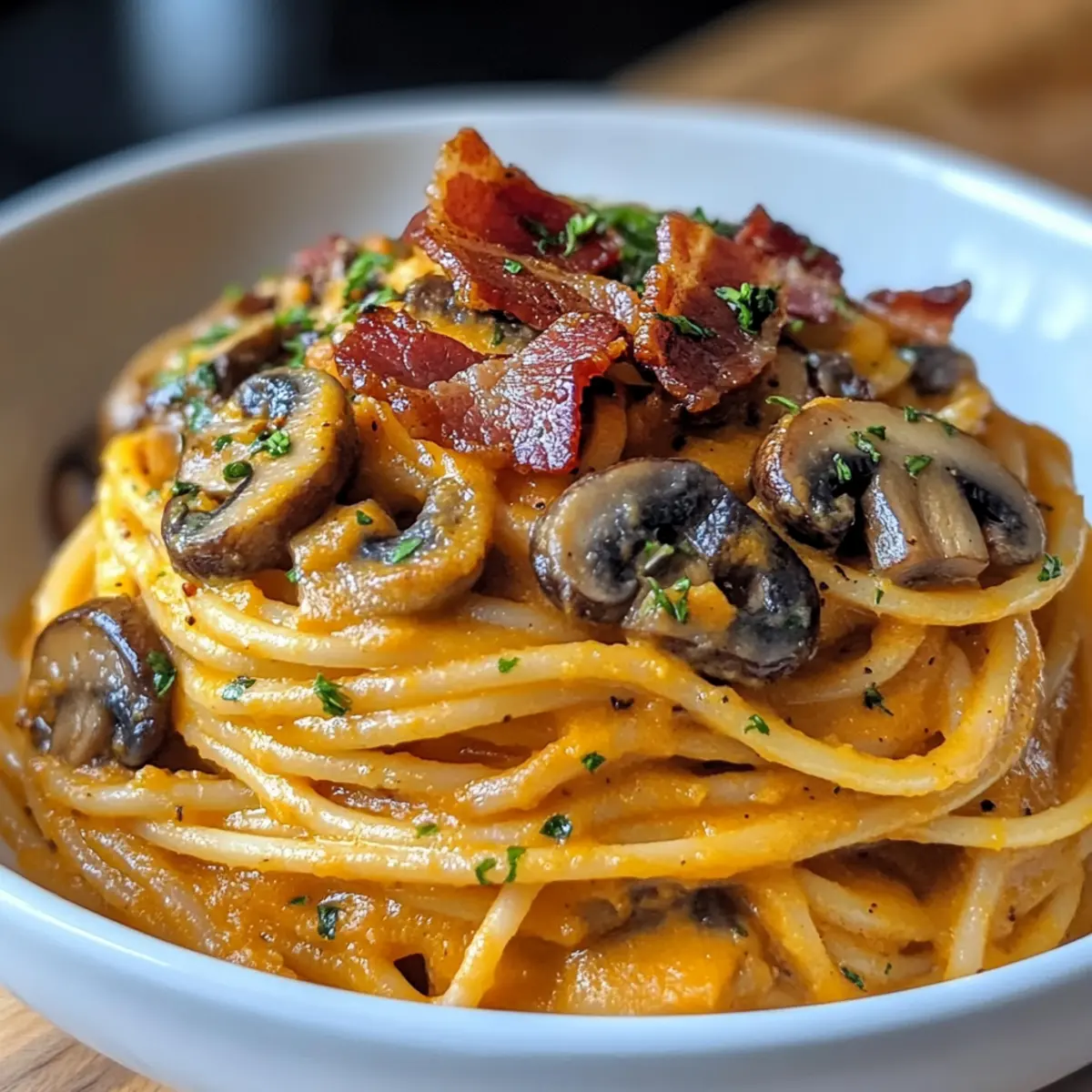 Kürbis und Pilz Spaghetti mit knusprigem Bacon