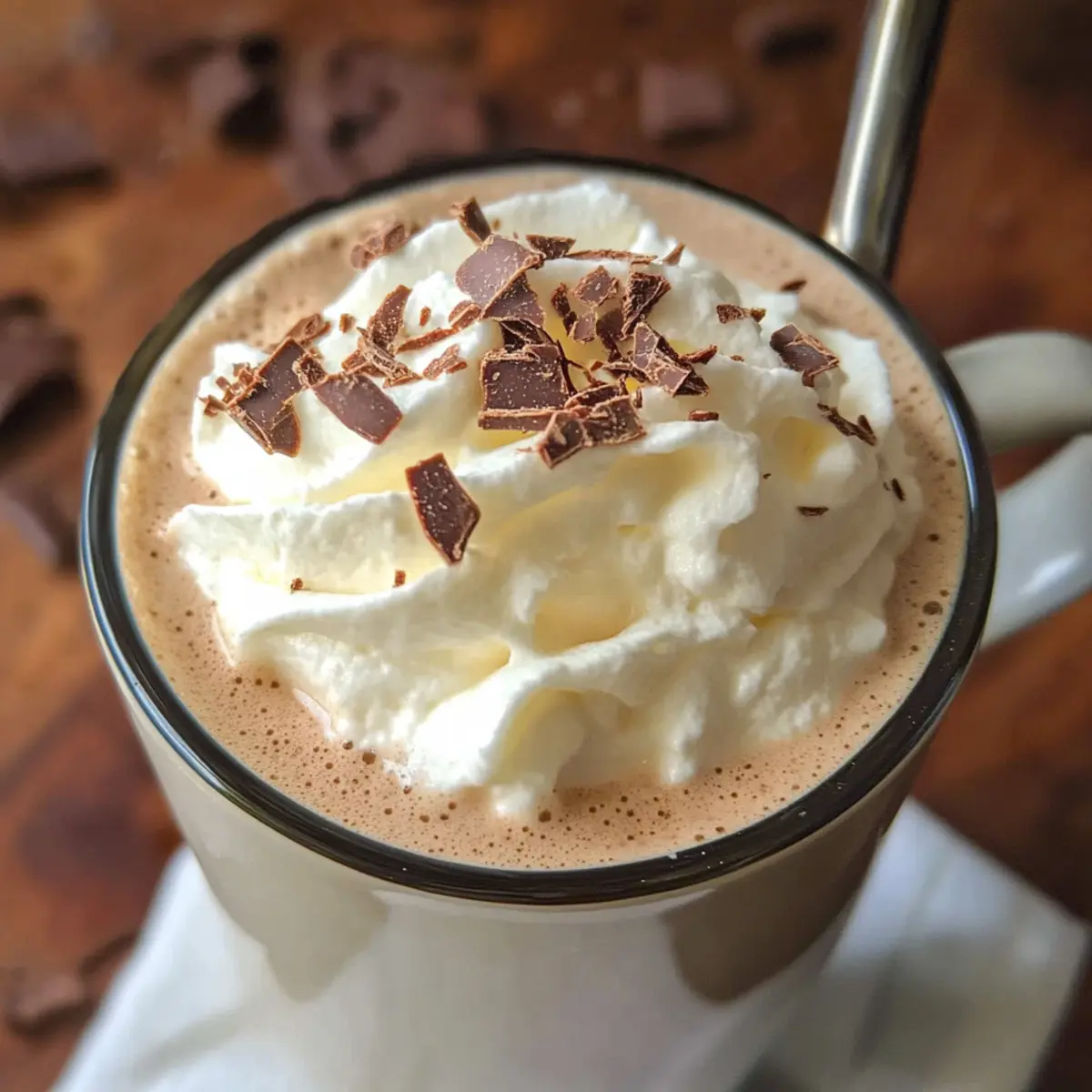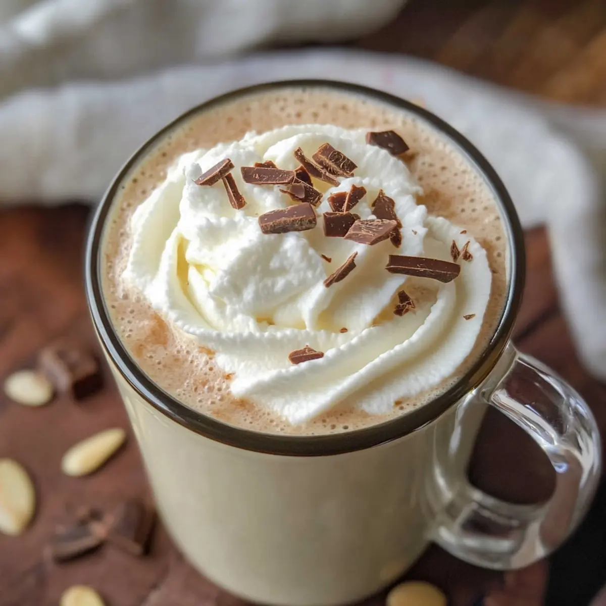 Der erste Schluck dieser Mandel heiße Schokolade ist wie eine warme Umarmung an einem kalten Winterabend. Während draußen die Kälte tobt, schenkt uns dieses cremige und köstliche Getränk nicht nur einen Moment der Entspannung, sondern auch pure Freude, ganz ohne tierische Produkte. Diese stille Verführung ist nicht nur einfach zuzubereiten – in nur 12 Minuten steht diese köstliche, zuckerfreie Wohltat auf dem Tisch – sondern eignet sich auch perfekt für gesellige Abende mit Freunden oder als kleine Auszeit für dich selbst. Die Kombination aus süßen weißen Schokoladendrops und einem Hauch von Mandelaroma macht jede Tasse zu einem kleinen Genussmoment. Bist du bereit, dein Lieblingsgetränk neu zu entdecken und vielleicht sogar einen neuen Winterklassiker zu kreieren? Warum solltest du Mandel heiße Schokolade probieren? Cremiger Genuss: Diese Mandel heiße Schokolade ist eine wahre Verwöhnung für die Sinne und punktet mit ihrer samtigen, reichhaltigen Textur. Einfachheit: Die Zubereitung ist kinderleicht und dauert nur 12 Minuten – perfekt für spontane Auszeiten. Veganfreundlich: Ohne tierische Produkte ist sie ideal für alle, die auf eine pflanzenbasierte Ernährung setzen. Vielfalt: Du kannst die Schokolade nach Herzenslust garnieren, sei es mit Sahne, Schokoladenstückchen oder sogar bunten Marshmallows. Aromatische Höhepunkte: Das Zitat von Mandelgeschmack und die Möglichkeit, verschiedene pflanzliche Milchsorten zu verwenden, machen dieses Rezept besonders vielfältig. Gesellige Momente: Ob allein oder mit Freunden beim Filmabend, diese heiße Schokolade bringt herzliche Wärme in jede Runde. Entdecke auch andere tolle Rezepte wie Streuselkuchen Mit Pudding oder Toast Rezept Mit. Mandel heiße Schokolade Zutaten Für die Basis: • Vanille-Almond-Milch – Diese Milchbasis sorgt für eine cremige Textur und verstärkt den Mandelgeschmack. • Weiße Schokoladendrops – Sie verleihen Süße und reichhaltigen Genuss; für eine vegane Option kannst du stattdessen auch dunkle Schokoladendrops wählen. Optionale Aromen: • Mandelaroma – Verstärkt den Mandelgeschmack; kann weggelassen werden, wenn ein milderer Geschmack gewünscht ist. Für die Garnierung: • Toppings nach Wahl – Personalisiere jede Portion mit Sahne, Schokoladenspänen oder bunten Marshmallows. • Rührstäbchen für heiße Schokolade – Füge Geschmack und Spaß hinzu; du kannst auch Zuckerstangen oder aromatisierte Stäbchen verwenden. So einfach zubereitet, wird die Mandel heiße Schokolade schnell zum winterlichen Lieblingsgetränk! Schritt-für-Schritt-Anleitung für Mandel heiße Schokolade Step 1: Milch erhitzen Gib 4 Tassen Vanille-Almond-Milch in einen beschichteten Topf und erhitze sie bei mittlerer Hitze. Rühre gelegentlich um, bis die Milch warm ist und anfängt, kleine Bläschen zu bilden, jedoch nicht kocht. Dies dauert etwa 5 Minuten. Achte darauf, die Milch nicht zu heiß werden zu lassen, um ein Anbrennen zu vermeiden. Step 2: Schokolade und Aroma hinzufügen Reduziere die Hitze auf niedrig und füge 1 Tasse weiße Schokoladendrops und optional 1 Teelöffel Mandelaroma hinzu. Rühre ständig mit einem Holzlöffel, bis die Schokolade vollständig geschmolzen ist und die Mischung cremig und glatt aussieht. Dies sollte etwa 2–3 Minuten dauern, damit die Aromen gut verschmelzen. Step 3: Servieren Nehme den Topf vom Herd und gieße die heiße Schokolade in Tassen. Achte darauf, dass du die Schokolade mit einer Kelle gleichmäßig verteilst, um sicherzustellen, dass jede Tasse gut gefüllt ist. Du solltest eine samtige, köstliche Konsistenz sehen, die zum Trinken einlädt. Step 4: Garnieren Garnieren die Mandel heiße Schokolade nach Belieben mit deinen Lieblings-Toppings wie Whipped Cream, Schokoladenspänen oder bunten Marshmallows. Um eine spielerische Note hinzuzufügen, füge Rührstäbchen aus Zuckerstangen oder aromatisierten Spiralen hinzu. So wird jede Tasse zu einem individuellen Genussmoment. Step 5: Genießen Serviere die Mandel heiße Schokolade sofort, während sie noch schön warm ist. Nimm einen Schluck und genieße die cremige Textur und die süßen Aromen, die dich an kalten Winterabenden wärmen. Diese köstliche Mischung ist perfekt für einen gemütlichen Abend allein oder bei geselligen Zusammenkünften mit Freunden. Lagerungstipps für Mandel heiße Schokolade Kühlschrank: Bewahre die restliche Mandel heiße Schokolade in einem luftdichten Behälter auf. Sie bleibt so bis zu 3 Tage frisch und geschmackvoll. Aufwärmen: Um die Mandel heiße Schokolade wieder zu genießen, erhitze sie langsam in einem Topf bei niedriger Temperatur oder in der Mikrowelle, bis sie warm ist. Rühre dabei gut um, damit die Konsistenz cremig bleibt. Einfrieren: Wenn du größere Mengen zubereitest, kannst du die heiße Schokolade portionsweise in einem gefriergeeigneten Behälter einfrieren. So ist sie bis zu 2 Monate haltbar. Vermeidung von Klumpen: Beim Wiedererhitzen kann es hilfreich sein, die aufgetaute Schokolade gut umzurühren, um eine glatte Textur zu gewährleisten und Klumpen zu vermeiden. Vorbereitung deiner Mandel heiße Schokolade für stressfreie Genussmomente Die Mandel heiße Schokolade ist ideal für die Vorbereitung im Voraus, perfekt für vielbeschäftigte Tage! Du kannst die Basis aus Vanille-Almond-Milch und weißen Schokoladendrops bis zu 24 Stunden im Voraus zubereiten und im Kühlschrank aufbewahren. Stelle sicher, dass du die Mischung gut abkühlen lässt, bevor du sie in einem luftdichten Behälter aufbewahrst, um die Qualität zu erhalten und ein Anbrennen zu verhindern. Wenn du bereit bist, die heiß begehrte Mandel heiße Schokolade zu genießen, erhitze die Mischung einfach in einem Topf bei mittlerer Hitze und füge optional 1 Teelöffel Mandelaroma hinzu. So hast du in kürzester Zeit ein cremiges und köstliches Getränk, das dich wunderbar wärmt! Was passt zu Mandel heiße Schokolade? Der perfekte Begleiter zu deiner Mandel heiße Schoko
