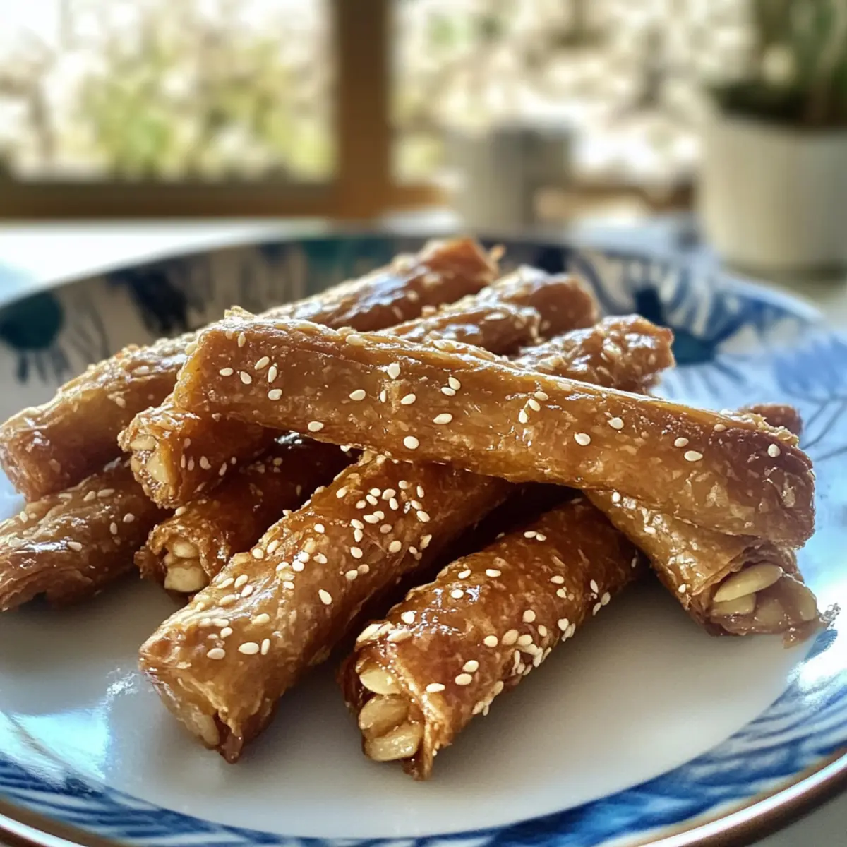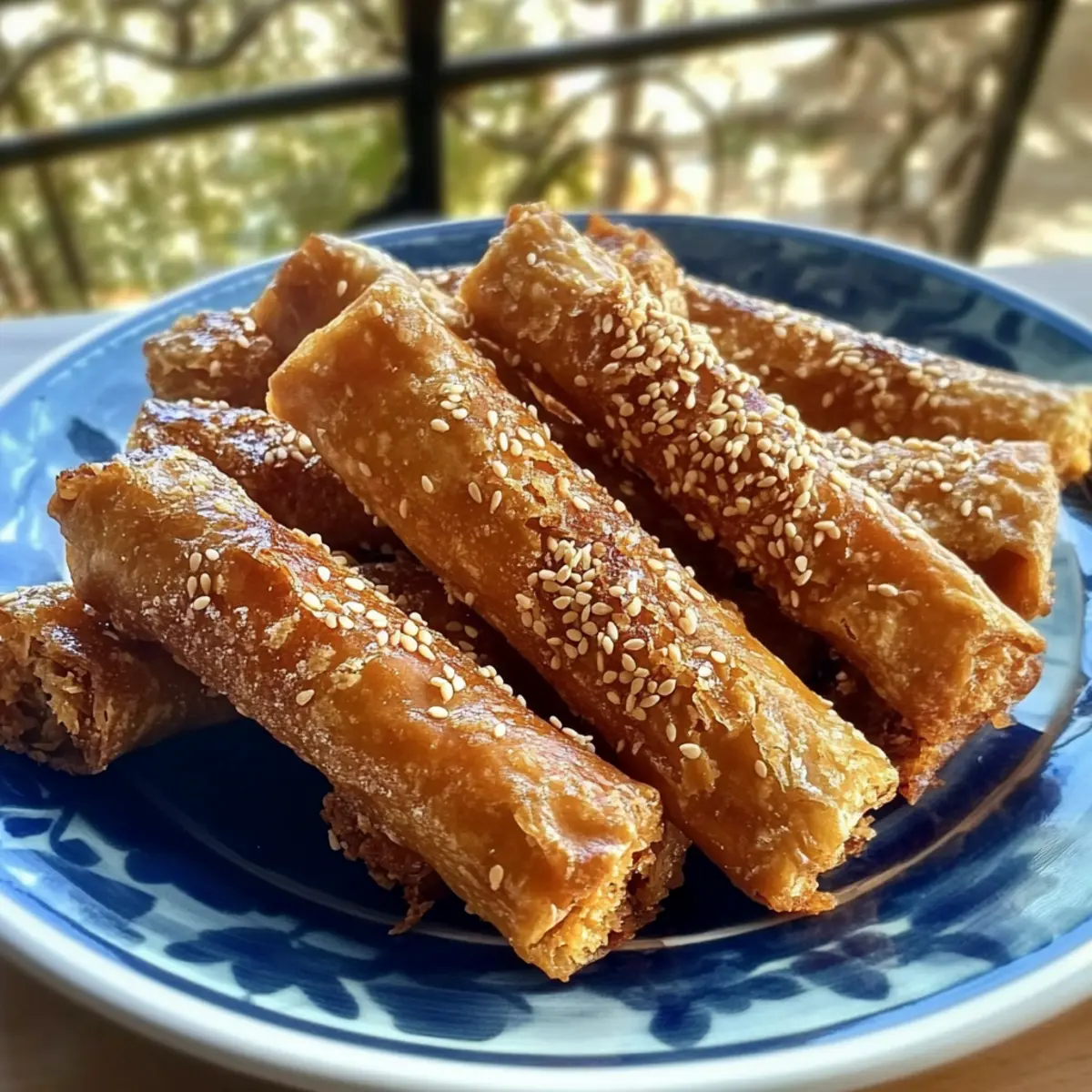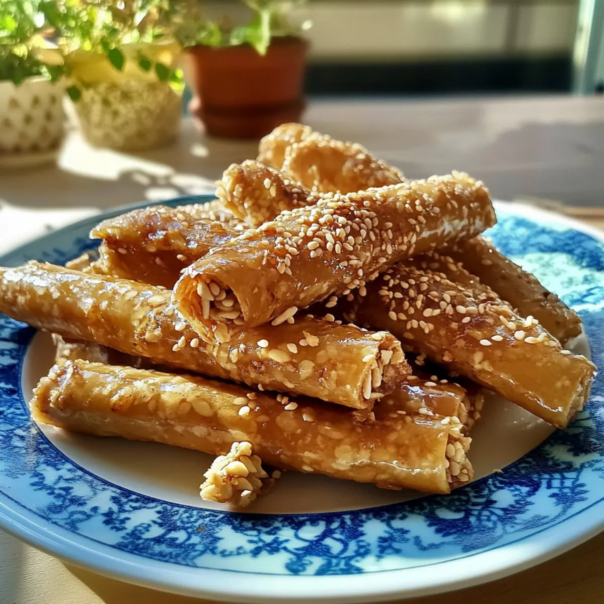 5. Lass die Zigarren abtropfen, lege sie auf eine Servierplatte und bestreue sie mit gerösteten Sesamsamen.