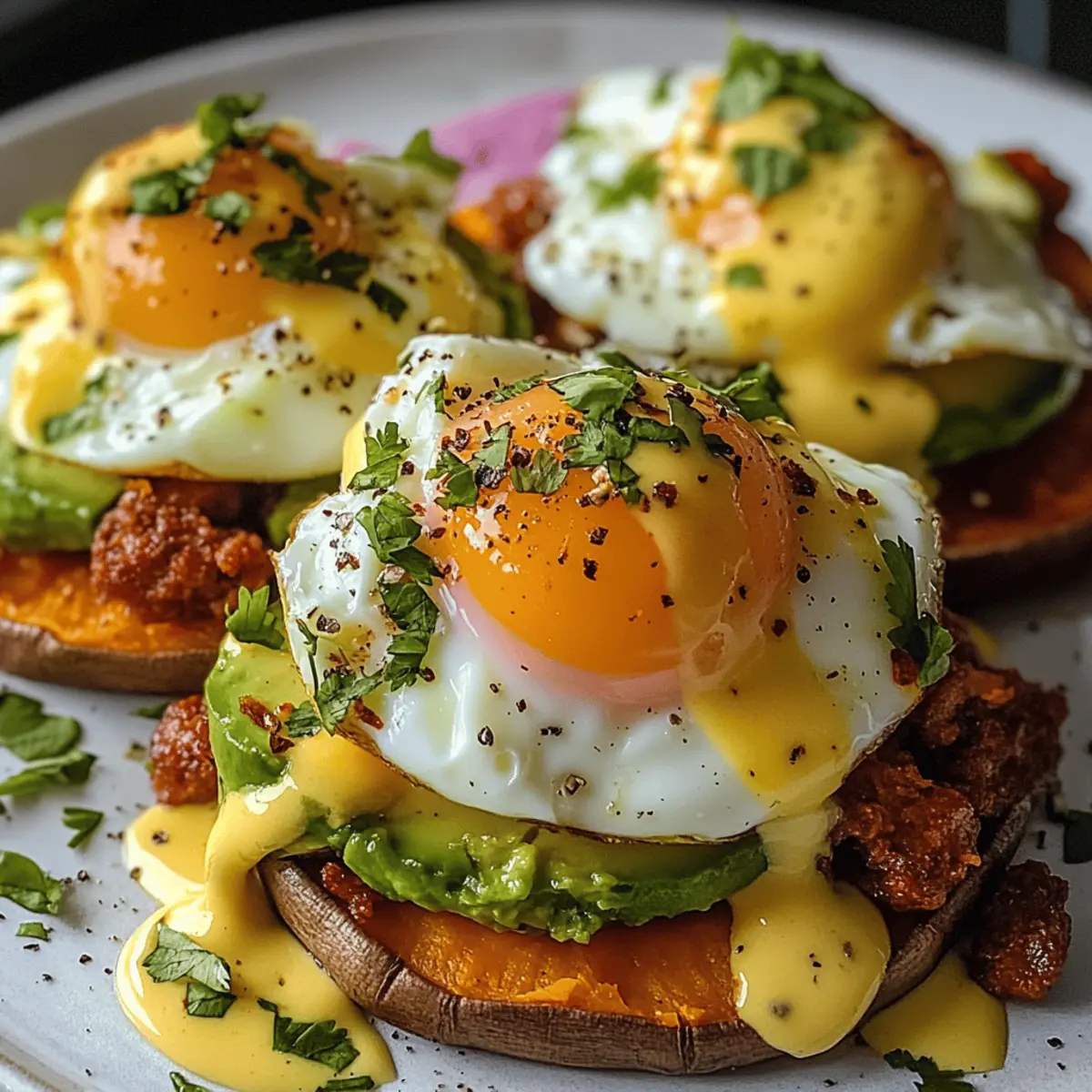 4. Nehme die gerösteten Süßkartoffelscheiben aus dem Ofen und lege sie auf Teller. Toppe sie mit dem Chorizo, gefolgt von Avocado und einem pochierten Ei. Träufle die Chipotle Hollandaise über die Eier und garniere nach Belieben.