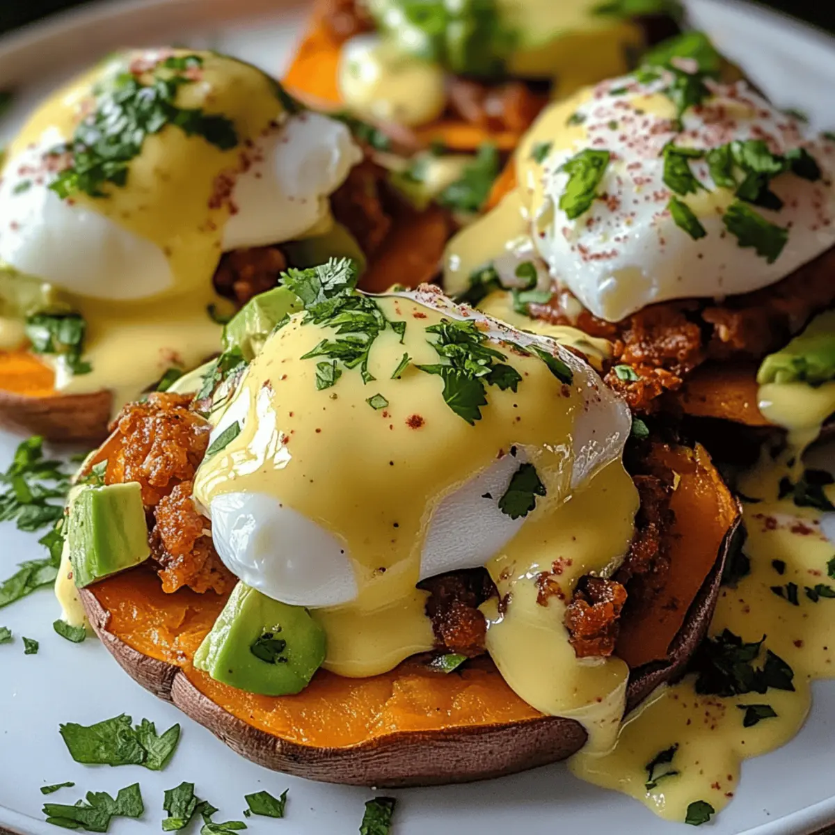Nehme die gerösteten Süßkartoffelscheiben aus dem Ofen und lege sie großzügig auf Teller. Toppe sie mit dem würzigen Chorizo oder der pflanzlichen Variante, gefolgt von einer Scheibe Avocado und einem pochierten Ei. Träufle die Chipotle Hollandaise über die Eier und garniere nach Belieben mit frischem Koriander und Limettenvierteln.