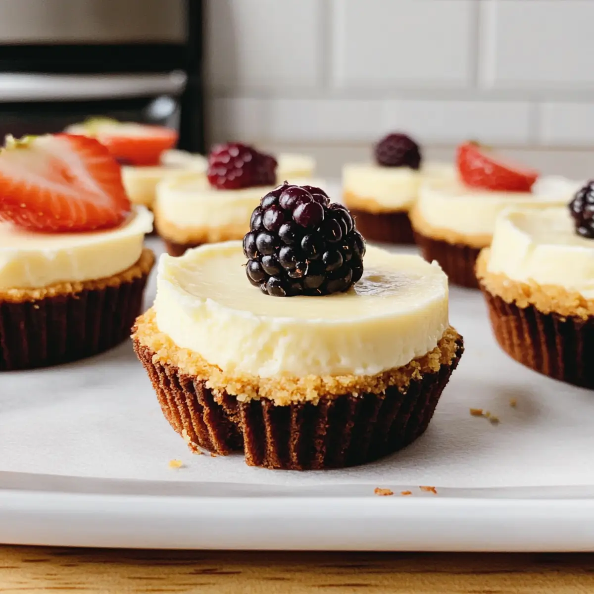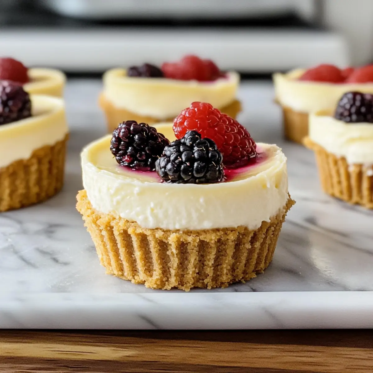 Es gibt nichts Besseres, als den Duft von frisch gebackenem Käsekuchen, der das ganze Haus durchzieht. Diese Mini-Käsekuchen sind der perfekte Weg, um sich selbst und seine Lieben mit einem köstlichen Erlebnis zu verwöhnen. Mit ihrer cremigen Füllung und einer knusprigen graham cracker Kruste sind sie schnell zubereitet und dabei so vielseitig. Egal ob zu einem festlichen Anlass oder bei einem gemütlichen Nachmittag, diese kleinen Leckereien bringen das Café-Feeling direkt nach Hause. Besonders begeistern sie mit der Möglichkeit, sie nach Belieben mit frischen Früchten, Schokolade oder Karamell zu garnieren. Hättest du gedacht, dass so viel Genuss so einfach sein kann? Lass uns gemeinsam in die Welt der Mini-Käsekuchen eintauchen! Warum sind Mini-Käsekuchen so besonders? Cremige Konsistenz: Diese Mini-Käsekuchen bieten eine unvergleichliche, samtige Textur, die jeden Bissen zum Erlebnis macht. Einfach zuzubereiten: Mit nur wenigen Zutaten und einfachen Schritten hast du schnell ein köstliches Dessert für jede Gelegenheit. Vielseitigkeit pur: Ob mit frischen Früchten, einer Schokoladenglasur oder einem Karamellüberzug – die Möglichkeiten sind endlos. Perfekte Portionen: Klein und handlich sind sie ideal für Feste oder einfach zum Naschen zu Hause. Und wenn du auf der Suche nach weiteren köstlichen Ideen bist, schau dir auch unser Rezept für Jalapeno Popper Hühnchen an! Mini-Käsekuchen Zutaten • Diese Zutaten sind der Schlüssel zu deinen perfekt cremigen Mini-Käsekuchen! Für den Boden: Graham Cracker Krümel – Sie bilden die Grundlage und Struktur; sie können auch durch Keksbrösel für einen anderen Geschmack ersetzt werden. Zucker – Fügt sowohl dem Boden als auch der Füllung Süße hinzu; brauner Zucker kann eine karamellige Note verleihen. Ungesalzene Butter – Bindet die Boden-Zutaten und sorgt für einen reichhaltigen Geschmack; kann durch Kokosöl für eine milchfreie Variante ersetzt werden. Für die Füllung: Frischkäse (aus der Packung) – Der Hauptbestandteil der Füllung, der eine cremige Textur schafft; achte darauf, ihn auf Zimmertemperatur zu bringen. Schmand – Steigert die Cremigkeit und bringt eine angenehme Säure; griechischer Joghurt kann für eine leichtere Option verwendet werden. Zucker – Fügt der Füllung Süße hinzu; für ein ausgewogenes Harmonie empfiehlt sich keine direkte Substitution. Echter Vanilleextrakt – Verbessert die Geschmackstiefe; du kannst auch Vanilleschote oder -paste als aromatischen Ersatz nutzen. Eier – Sorgen für Struktur und Stabilität; verwende Zimmertemperatur-Eier für bessere Vermischung. Viel Spaß beim Zubereiten deiner Mini-Käsekuchen! Schritt-für-Schritt-Anleitung für Mini-Käsekuchen Schritt 1: Ofen vorheizen Heize deinen Ofen auf 163°C (325°F) vor und lege ein Muffinblech mit Muffinförmchen aus. Diese Vorbereitung sorgt dafür, dass deine Mini-Käsekuchen gleichmäßig backen und nicht anhaften, sodass sie später mühelos herausgenommen werden können. Schritt 2: Boden zubereiten Vermische in einer Schüssel die Graham Cracker Krümel und den Zucker, bis sie gut kombiniert sind. Füge dann die geschmolzene Butter hinzu und rühre, bis die Mischung feucht ist. Drücke die Mischung gleichmäßig in die Muffinförmchen und backe den Boden für etwa 5 Minuten, bis er leicht goldbraun ist. Schritt 3: Füllung vorbereiten Schlage den weich gewordenen Frischkäse und den Schmand in einer mittelgroßen Schüssel mit einem Mixer glatt. Achte darauf, dass keine Klumpen zurückbleiben. Füge dann den Zucker und den Vanilleextrakt hinzu und mixe weiterhin, bis die Mischung cremig und gut vermischt ist. Schritt 4: Eier einarbeiten Gib die Eier einzeln in die Füllung und mixe auf niedriger Geschwindigkeit, bis sie gerade so integriert sind. Achte darauf, die Füllung nicht zu übermixen, um eine schöne, luftige Textur in deinen Mini-Käsekuchen zu erhalten. Schritt 5: Füllen und backen Verteile die Käsekuchenmasse gleichmäßig auf die vorgebackenen Böden in den Muffinförmchen. Backe die Mini-Käsekuchen etwa 17–20 Minuten, bis die Ränder fest und die Mitte leicht wackelig ist. Diese Konsistenz ist perfekt für einen cremigen Biss. Schritt 6: Abkühlen und kühlen Lasse die Mini-Käsekuchen für etwa 1 Stunde in der Form abkühlen, damit sie sich setzen. Danach solltest du sie für mindestens 3–4 Stunden oder über Nacht in den Kühlschrank stellen. Dies ist entscheidend für die Entwicklung des Geschmacks und die richtige Konsistenz. Was passt zu Mini-Käsekuchen? Erfreue dich an der süßen Kombination gesunder Aromen und frischer Zutaten, die deine Mini-Käsekuchen perfekt ergänzen. Frische Beeren: Die saftigen Noten von Erdbeeren, Himbeeren oder Blaubeeren bieten einen herrlichen Kontrast zur Cremigkeit der Cheesecakes. Sie verleihen einen frischen, fruchtigen Kick, ideal in Kombination mit süßen Desserts. Zarte Schlagsahne: Eine leichte Schicht Schlagsahne fügt eine extra cremige Dimension hinzu. Die luftige Textur umhüllt den Gaumen und verstärkt das Geschmackserlebnis, besonders wenn du sie mit einem Hauch von Vanille verfeinerst. Karamellsoße: Ein würziger Karamellüberzug bringt ein köstliches Toffee-Aroma ins Spiel und intensiviert den Genuss der Käsekuchen. Es sorgt für eine süß-herzhafte Harmonie, die einfach unwiderstehlich ist. Vanilleeis: Eine Kugel cremiges Vanilleeis macht die Mini-Käsekuchen zu einem noch genussvolleren Erlebnis. Die Kälte des Eises schmilzt perfekt in Kombination mit der warmen Cheesecake-Textur und sorgt für eine harmonische Balance. Tee oder Kaffee: Ein aromatischer Schwarztee oder eine Tasse frisch gebrühter Kaffee bringen die Aromen zusammen und offerieren eine vollmundige Begleitung, die den süßen Geschmack perfekt ausgleicht. Zitronencreme: Ein Spritzer Zitronencreme sorgt für erfrischende Säure, die die Süße des Käsekuchens harmonisch ausbalanciert. Es verleiht den Mini-Käsekuchen eine lebendige Note und regt den