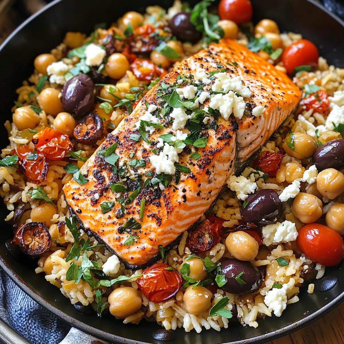 5. Füge die Hälfte der Feta-Mischung in den warmen Reis und mische sie vorsichtig unter, um ihr cremiges Aroma gleichmäßig zu verteilen. Lege den gebratenen Mittelmeerlachs zurück in die Pfanne und platziere die restliche Feta-Mischung obenauf. Erhitze das Ganze leicht, damit sich die Aromen verbinden. Serviere das Gericht warm, garniert mit frisch gehacktem Oregano für einen zusätzlichen Farbtupfer.