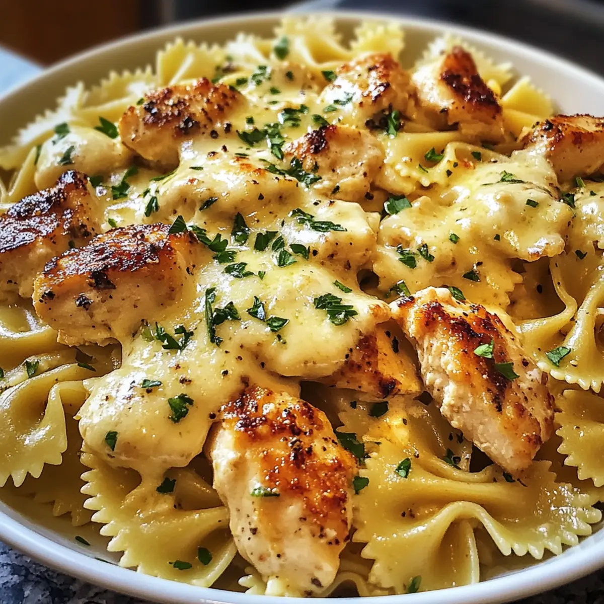 Die Türen zur Küche öffnen sich und der köstliche Duft von geschmolzenem Käse und geröstetem Knoblauch breitet sich aus – ein wahres Fest für die Sinne. Die kreisrunden Fliegenpilze aus Bowtie-Pasta, die wir gleich zaubern, sind nicht nur ein echter Hingucker, sondern auch ein unvergesslicher Genuss! Unser Rezept für die Mozzarella Knoblauchbutter Hähnchen Fliegenpilze ist die perfekte Lösung für hektische Abende und begeistert in nur 30 Minuten. Diese cremige Köstlichkeit lässt sich ganz einfach anpassen: Fügen Sie Ihre Lieblingsgemüse hinzu oder tauschen Sie die Pasta-Form aus, um noch mehr Abwechslung auf den Tisch zu bringen. Ob für die Familie oder den spontanen Abend mit Freunden – diese Mahlzeit wird Ihr Herz und Ihren Magen gleichermaßen erwärmen! Neugierig, wie einfach das geht? Lassen Sie uns gleich loslegen! Warum wird dieses Rezept geliebt? Einfachheit: Der Zubereitungsprozess ist unkompliziert und benötigt nur grundlegende Kochfähigkeiten, sodass Sie in kürzester Zeit ein köstliches Gericht zaubern können. Vielfältige Anpassungsmöglichkeiten: Ob großer Hunger oder ein einfacher Snack – entscheiden Sie selbst, mit welchem Gemüse oder welcher Pasta-Form Sie Ihre Fliegenpilze verfeinern möchten. Köstlicher Geschmack: Die Kombination aus geschmolzener Mozzarella und dem aromatischen Knoblauch sorgt für ein intensives Geschmackserlebnis, das jeder liebt. Ideale Wahl für Feste: Perfekt für gesellige Abende oder ein schnelles Familienessen – diese Pasta begeistert und sorgt für unvergessliche Moment. Gesunde Option: Mit der Möglichkeit, die Butter und Sahne durch leichtere Alternativen zu ersetzen, können Sie dieses Gericht noch gesünder gestalten. Lust auf eine weitere köstliche Abwechslung? Probiere auch unser Rezept für Parmesan Knoblauch Gemuesepommes oder das Bbq Haehnchen Rezept, die ebenfalls schnell zubereitet sind! Mozzarella Knoblauchbutter Hähnchen Fliegenpilze Zutaten • Hier sind die Zutaten, um diese cremige Köstlichkeit zuzubereiten: Für die Pasta Fliegenpilz-Pasta – Der Hauptbestandteil, der die cremige Sauce gut aufnimmt. Substitution: Verwenden Sie Penne, Fusilli oder Spaghetti; die Kochzeit anpassen. Für das Hähnchen Hähnchenbrust – Liefert Herzhaftigkeit und Protein für das Gericht. Substitution: Verwenden Sie Kichererbsen oder Tofu für eine vegetarische Variante. Für die Sauce Olivenöl – Sorgt für Geschmack und verhindert das Ankleben. Butter – Bildet die Grundlage für eine reichhaltige Sauce in Kombination mit Knoblauch. Knoblauch – Intensiviert den Geschmack und sorgt für ein aromatisches Erlebnis. Hühnerbrühe – Flüssigkeit für die Sauce, die zusätzlich Geschmack verleiht. Substitution: Gemüsebrühe für eine vegetarische Option. Schlagsahne – Hauptbestandteil für die cremige Sauce. Substitution: Halbfett-Sahne für eine leichtere Variante. Parmesan – Fügt eine herzhafte, käsige Note zur Sauce hinzu. Geriebener Mozzarella – Schmelzkäse, der eine zähflüssige Textur verleiht. Substitution: Frischer Mozzarella für noch mehr Cremigkeit. Italienisches Gewürz – Sorgt für eine aromatische Kräuternote. Salz & Pfeffer – Wesentliche Gewürze zur Geschmackssteigerung. Für die Garnitur Petersilie – Optional zur Dekoration; bringt Farbe und Frische ins Gericht. Genießen Sie die Zubereitung dieser Mozzarella Knoblauchbutter Hähnchen Fliegenpilze und lassen Sie sich von den Aromen verzaubern! Schritt-für-Schritt-Anleitung für Mozzarella Knoblauchbutter Hähnchen Fliegenpilze Step 1: Pasta Kochen Bring einen großen Topf mit gesalzenem Wasser zum Kochen. Füge die Fliegenpilz-Pasta hinzu und koche sie für etwa 8 bis 10 Minuten, bis sie al dente ist. Rühre gelegentlich, um ein Ankleben zu verhindern. Nach dem Kochen, die Pasta abgießen und beiseite stellen, ohne sie zu spülen, damit die Stärke bleibt. Step 2: Hähnchen Anbraten Erhitze eine große Pfanne bei mittlerer Hitze und gib etwas Olivenöl hinzu. Würze die Hähnchenbrust mit italienischen Gewürzen, Salz und Pfeffer. Brate das Hähnchen 5 bis 7 Minuten lang goldbraun und durchgegart an, bis es eine schöne Farbe hat. Nimm das Hähnchen aus der Pfanne und lege es beiseite. Step 3: Sauce Zubereiten In der gleichen Pfanne schmelze die Butter bei mittlerer Hitze. Füge den gehackten Knoblauch hinzu und brate ihn für etwa 1 Minute an, bis er duftet, aber nicht braun ist. Gieße die Hühnerbrühe und die Schlagsahne dazu, bringe die Mischung zum Köcheln und lasse sie 3 bis 4 Minuten reduzieren, bis sie leicht eingedickt ist. Step 4: Zutaten Kombinieren Rühre den geriebenen Parmesan in die Sauce ein, bis er geschmolzen ist und die Sauce cremig wird. Gib das angebratene Hähnchen zurück in die Pfanne und füge die gekochte Fliegenpilz-Pasta hinzu. Mische alles gut durch, sodass die Pasta gleichmäßig mit der cremigen Sauce überzogen ist. Step 5: Mozzarella Schmelzen Bestreue die Mischung in der Pfanne mit dem geriebenen Mozzarella. Decke die Pfanne ab und lasse sie bei niedriger Hitze 2 bis 3 Minuten stehen, bis der Käse geschmolzen und blubbert. Serviere das Gericht warm, garniert mit frischer Petersilie für einen zusätzlichen Farbtupfer und Geschmack. Was passt gut zu Mozzarella Knoblauchbutter Hähnchen Fliegenpilze? Dieser köstliche Gericht benötigt nur wenige perfekt abgestimmte Beilagen, um ein vollumfängliches und unvergessliches Abendessen zu kreieren. Klassischer Caesar-Salat: Frisch und knackig, dieser Salat ergänzt die cremige Sauce ideal und bringt eine angenehme Frische ins Spiel. Die Kombination aus würzigen Croutons und Parmesan rundet den Geschmack ab. Würziges Knoblauchbrot: Das knusprige, geröstete Brot dient hervorragend dazu, die üppige Sauce aufzusaugen. Ein Must-Have für jeden Pasta-Liebhaber! Gedünstetes Gemüse: Leckeres, leicht gewürztes Gemüse wie Brokkoli oder Zucchini bringt zusätzlich Farbe und Vitamine auf den Tisch. Es bietet eine gesunde Komponente zu der Cremigke