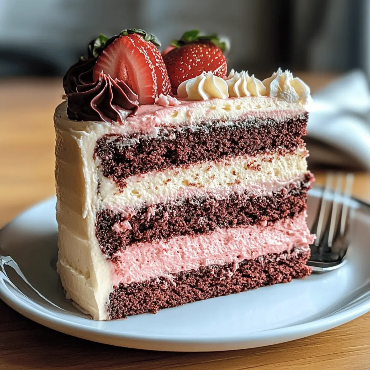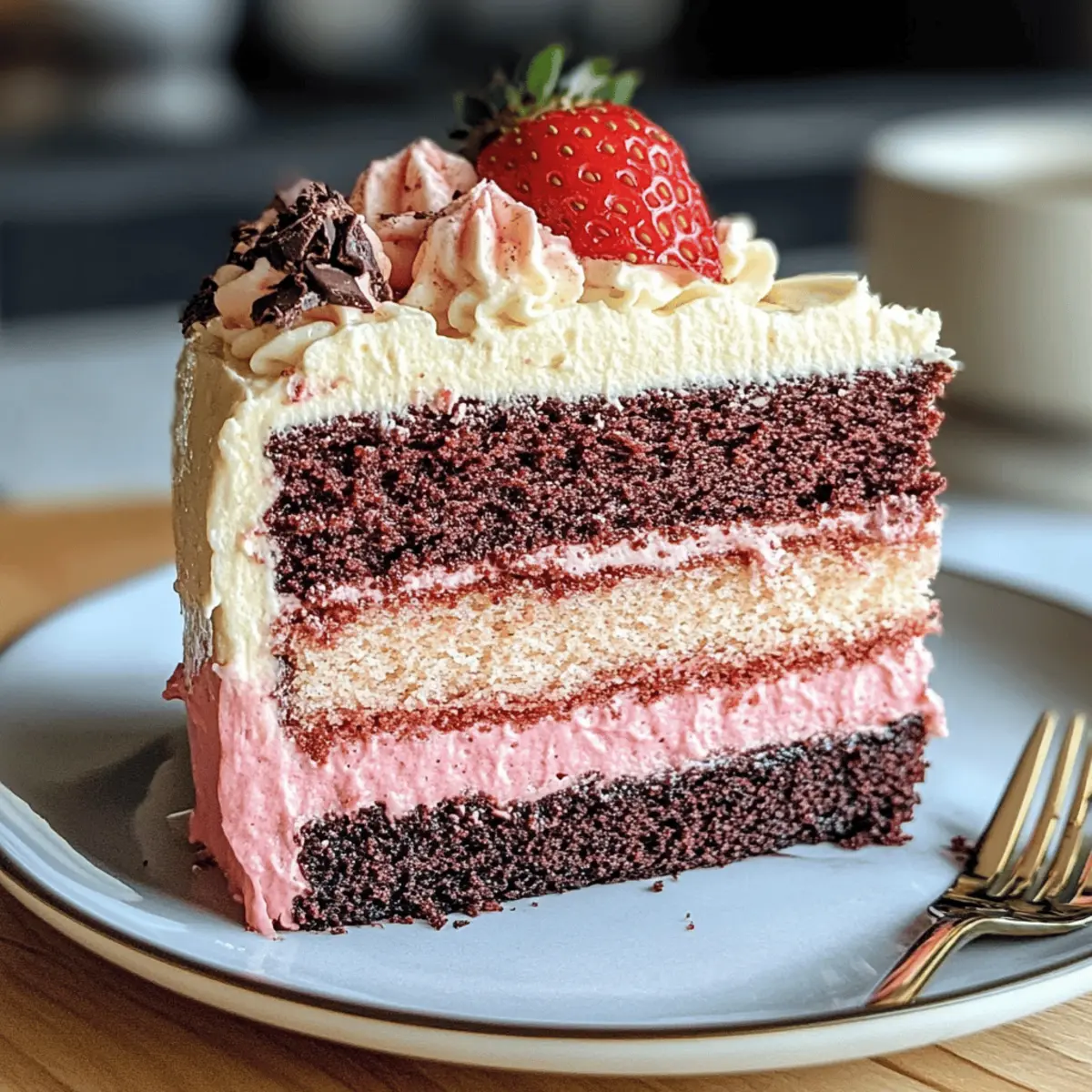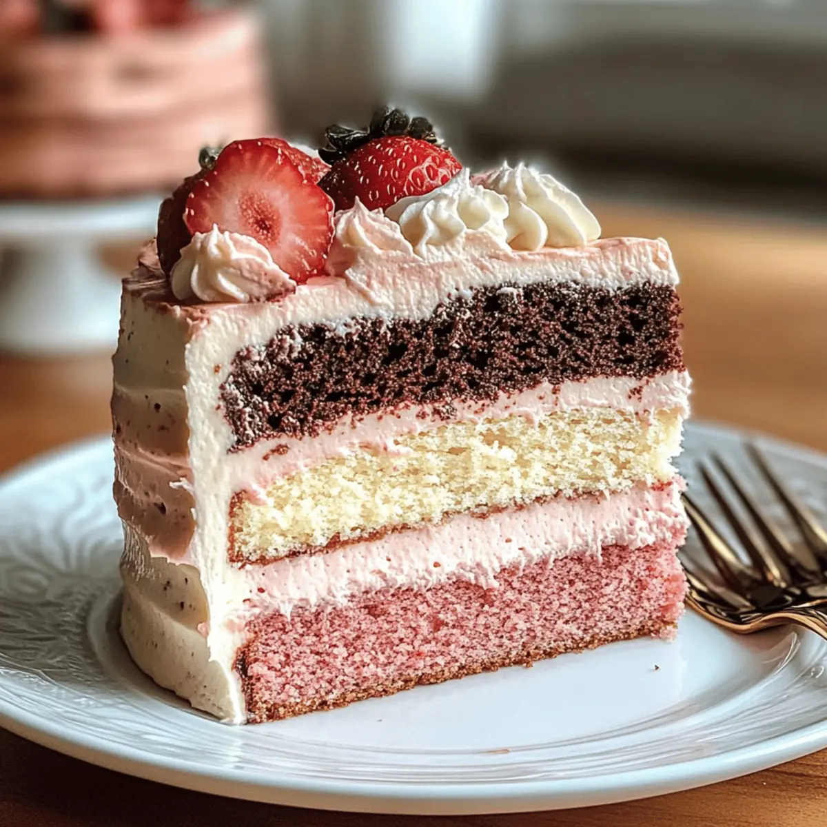 Schritt-für-Schritt-Anleitung für Neapolitaner Kuchen mit Schichten aus Schokolade, Vanille und Erdbeere