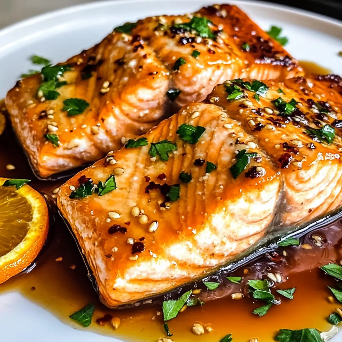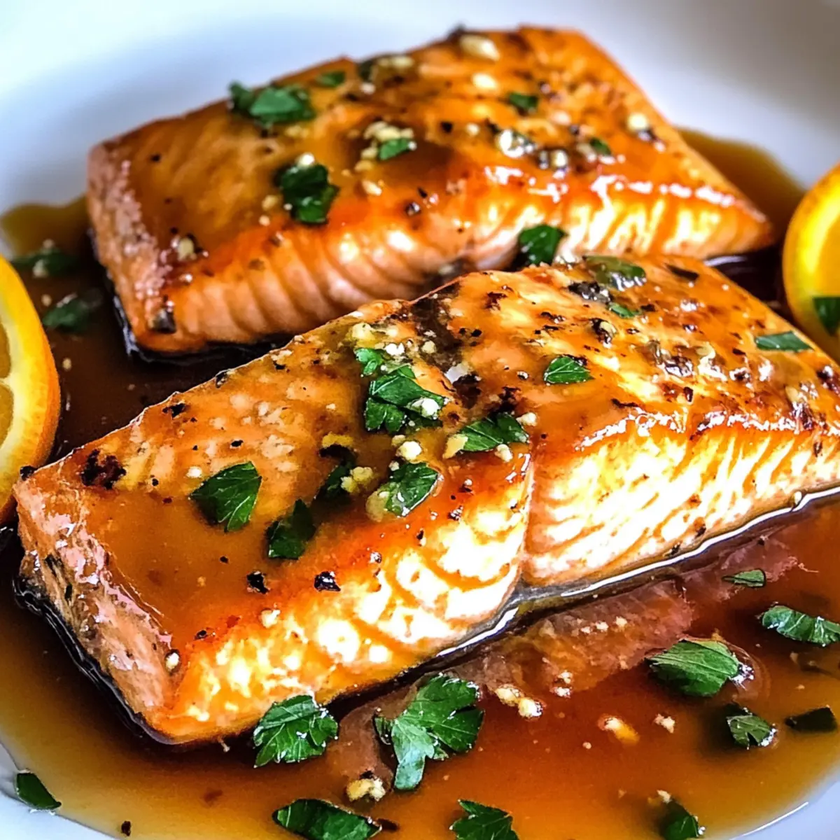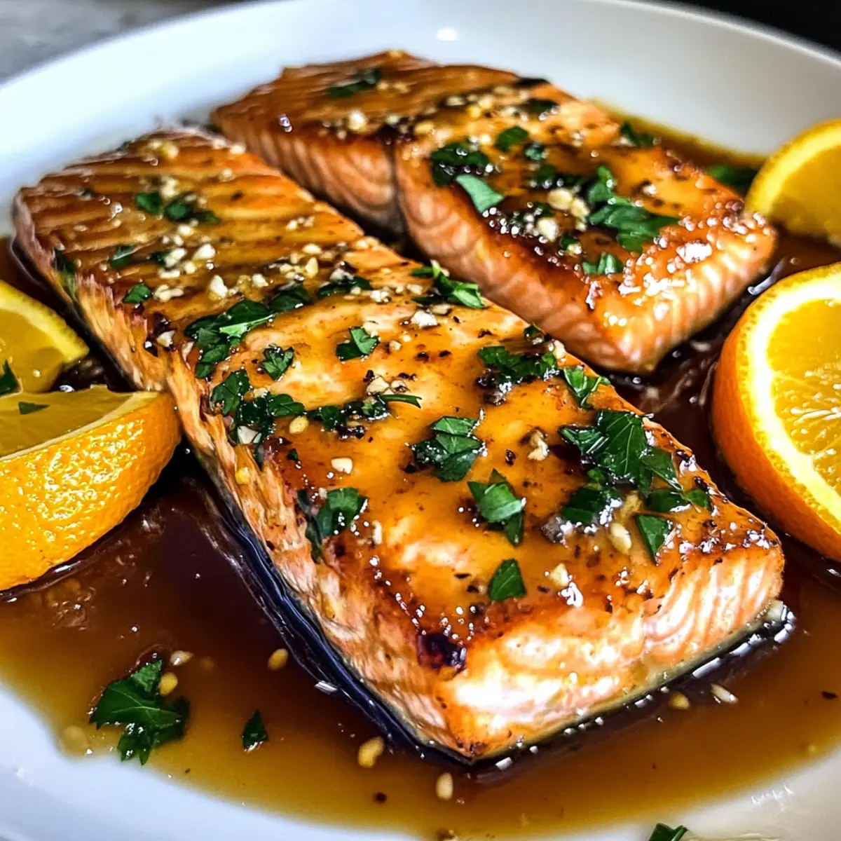 Der Duft von frischen Orangen und geröstetem Lachs erfüllt die Küche und verwandelt sogar den hektischsten Wochentag in einen Moment purer Freude. Mit meinem Rezept für orange glasierten Lachs zaubert ihr ein köstliches Abendessen auf den Tisch, das in nur 15 Minuten zubereitet ist! Diese schnelle und einfache Zubereitung ist nicht nur ein echter Hit bei Kindern und Erwachsenen, sondern auch glutenfrei und ideal für eine gesunde Familienmahlzeit. Die saftigen, zarten Filets, glasiert mit einer süßen Zitrusnote, sind ein komfortabler Genuss, der gleichzeitig ein frisches Geschmackserlebnis bietet. Seid ihr bereit, eure Küche mit diesem strahlenden Gericht zu verwandeln? Warum ein orange glasierten Lachs wählen? Einfachheit: Dieses Rezept ist einfach und benötigt nur grundlegende Kochkenntnisse, perfekt für alle, die in der Küche Zeit sparen möchten. Vielfältige Kombinationen: Variiert den orange glasierten Lachs mit verschiedenen Beilagen oder probiert alternative Fische wie Forelle oder Tilapia – die Möglichkeiten sind endlos! Gesunde Wahl: Mit jedem Bissen genießt ihr eine gesunde Portion Omega-3-Fettsäuren, die klein, aber oho sind! Schnell zubereitet: In nur 15 Minuten zaubert ihr ein köstliches Abendessen, das das Gefühl vermittelt, mehr Zeit in der Küche verbracht zu haben. Familienfreundlich: Dieser Lachs ist nicht nur lecker, sondern auch bei Kindern sehr beliebt – ideal für stressige Wochentage! Schmackhafte Aromen: Die Kombination aus süßer Orange und würzigem Knoblauch bietet ein Geschmacks-Upgrade, das jeden begeistert. Probiert, ihn mit frischem Gemüse oder einem Quinoa-Salat zu kombinieren, um eure Mahlzeiten noch spannender zu gestalten! Zutaten für orange glasierten Lachs • Um das perfekte Geschmackserlebnis zu kreieren, achtet darauf, qualitativ hochwertige Zutaten zu verwenden. Für die Marinade Butter (oder Olivenöl) – fügt einen reichen Geschmack hinzu und hilft beim Anbraten; ersetzt mit Olivenöl für eine milchfreie Option. Sojasauce (oder Tamari) – sorgt für umami-reichen Geschmack; Tamari ist die glutenfreie Wahl. Honig (oder Ahornsirup) – ein süßer Ausgleich für die Glasur, Ahornsirup ist eine vegane Alternative. Knoblauch – sorgt für pikante Tiefe; frischer, gehackter Knoblauch bietet das Maximum an Geschmack. Cornstärke (optional) – zur Verdickung der Glasur; mit Wasser verrühren, bevor ihr es hinzufügt. Für den Lachs Lachsfilets – die Hauptproteinquelle; wählt wild gefangenen Lachs für gesunde Omega-3-Fettsäuren. Salz und Pfeffer – verstärken die natürlichen Aromen; benutzt Meersalz und frisch gemahlenen schwarzen Pfeffer für die besten Ergebnisse. Orangensaft – bildet die süß-säuerliche Basis der Glasur; frisch gepresster Saft aus einer Orange wird empfohlen. Mit diesen Zutaten für euren orange glasierten Lachs bringt ihr nicht nur schnellen Genuss auf den Tisch, sondern auch gesunde und glückliche Gesichter! Schritt-für-Schritt-Anleitung für orange glasierten Lachs Step 1: Pfanne erhitzen Erhitze eine große Pfanne bei mittelhoher Hitze und füge Butter oder Olivenöl hinzu. Lass das Fett erhitzen, bis es zu schimmern beginnt, was etwa 1-2 Minuten dauert. Achte darauf, dass die Pfanne heiß ist, um den Lachs perfekt anzubraten und ein Ankleben zu vermeiden. Step 2: Lachs vorbereiten Würze die Lachsfilets mit Salz und frisch gemahlenem schwarzem Pfeffer auf beiden Seiten. Lege die Lachsfilets mit der Hautseite nach oben in die heiße Pfanne und brate sie für etwa 3-5 Minuten, bis sie goldbraun sind. Die Außenseite sollte leicht knusprig sein, während das Innere noch saftig bleibt. Step 3: Lachs garen Drehe die Lachsfilets vorsichtig um und brate sie für weitere 3-4 Minuten, bis sie eine innere Temperatur von 62°C (145°F) erreichen. Der Lachs sollte außen eine schöne goldene Farbe zeigen, während das Innere opak und zart ist. Verwende ein Fleischthermometer für genaues Messen. Step 4: Glasur zubereiten Nehme die Lachsfilets aus der Pfanne und stelle sie beiseite. In der gleichen Pfanne bei niedrigerer Hitze Orangensaft, Honig, Sojasauce und den gehackten Knoblauch gut verrühren. Lass die Mischung für etwa 1-2 Minuten köcheln, bis alles gut vermischt und leicht erhitzt ist. Step 5: Glasur andicken Erhöhe die Hitze leicht und rühre kontinuierlich, bis die Glasur etwas eindickt, was etwa 30-60 Sekunden dauert. Die Glasur sollte einen leicht sirupartigen Charakter haben, der sich gut an den Lachs anlügt. Halte dabei die Farben der Mischung im Auge – sie sollte fröhlich und glänzend bleiben. Step 6: Lachs glasieren Lege die Lachsfilets zurück in die Pfanne und schwenke sie vorsichtig in der Glasur, um sie gleichmäßig zu beschichten. Lasse sie für eine weitere Minute simmern, damit der Lachs die Aromen der Glasur aufnehmen kann. Die Pfanne sollte schön sizzeln, während die Aromen sich verbinden. Step 7: Servieren Serviere den orange glasierten Lachs warm auf einem Teller, garniert mit frischer Petersilie. Ergänze das Gericht mit Beilagen wie gedünstetem Brokkoli oder gerösteten Kartoffeln, um eine vollwertige Mahlzeit zu kreieren. Die lebendigen Farben des Gerichts machen es besonders einladend! Was passt zu orange glasiertem Lachs? Der Duft von frischen Kräutern und knackigem Gemüse wird eure Sinne verzaubern und zu einem unvergesslichen Essen werden. Gedünsteter Brokkoli: Das zarte Gemüse ergänzt den Lachs mit einem frischen Geschmack und bietet eine schöne Textur. Kombiniert mit Zitrone wird es noch erfrischender. Geröstete Kartoffeln: Diese goldbraunen, knusprigen Kartoffeln sind die perfekte Beilage, um die süße Glasur des Lachses aufzufangen. Sie bieten eine herzhafte Komponente, die jedem Bissen Tiefe verleiht. Quinoa-Salat: Ein leichter, nussiger Quinoa-Salat mit frischem Gemüse bringt nicht nur gesunde Nährstoffe, sondern auch Farbvielfalt auf den Teller. Dies sorgt für ein optisch ansprechendes und schmackhaftes Erlebnis. Cremige Knoblauchmash