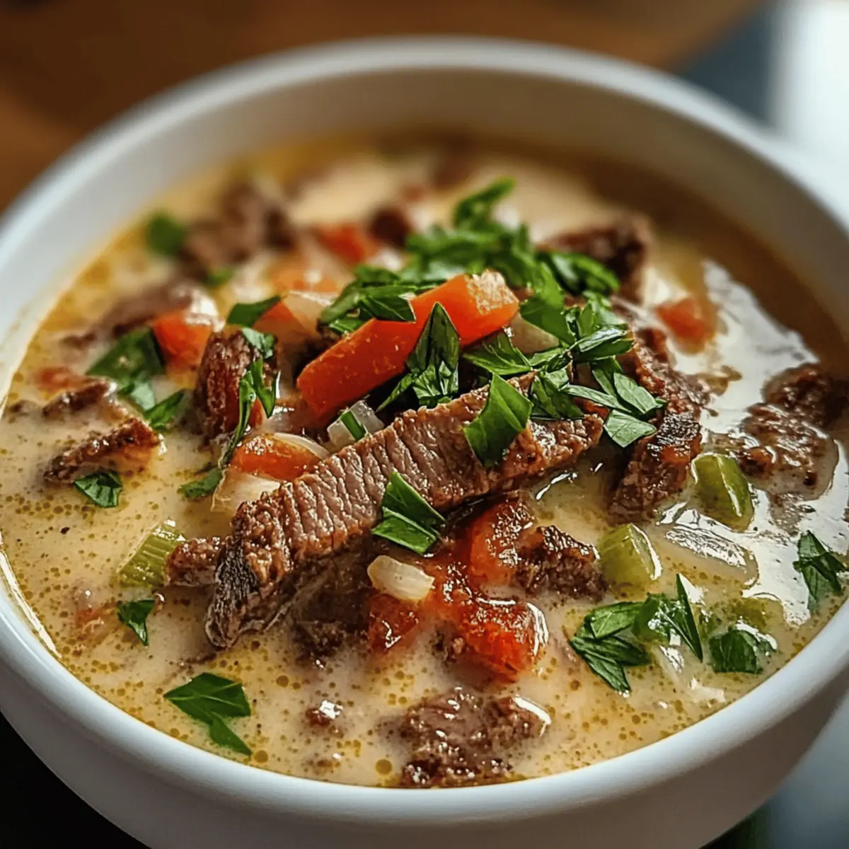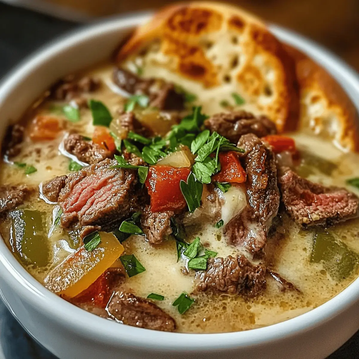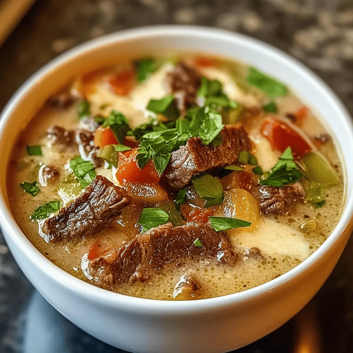 „Stell dir vor, du kommst an einem kalten Abend nach Hause und sehnst dich nach etwas Warmem, Herzhaftem. Diese Hearty Philly Cheesesteak Soup ist die perfekte Antwort auf dieses Bedürfnis. Mit saftigem Rindfleisch, zarten Zwiebeln und bunten Paprika, alles in einer cremigen, käsehaltigen Brühe vereint, kannst du den Genuss eines klassischen Philly Cheesesteaks ganz einfach im Suppenformat erleben. Dieses Rezept ist nicht nur ein echter Crowd-Pleaser, sondern lässt sich auch schnell zubereiten – perfekt für geschäftige Wochentage oder entspannte Wochenenden. Hast du Lust, diese köstliche Umarmung in einer Schüssel auszuprobieren? Lass uns gemeinsam kochen!“ Warum wirst du diese Suppe lieben? Herzhafter Geschmack: Die Kombination aus zartem Rindfleisch, karamellisierten Zwiebeln und bunten Paprika sorgt für Geschmacksexplosionen in jeder Löffel. Cremige Konsistenz: Mit einer schmelzenden Käse-Sauce wird jede Portion zu einem wahren Genuss für die Sinne. Schnelle Zubereitung: In weniger als einer Stunde zauberst du dieses Gericht auf den Tisch – schneller als jeder Lieferservice! Familienfreundlich: Diese Suppe wird mit Sicherheit die ganze Familie begeistern und sich für jedes Alter eignen. Perfekt für Familienessen! Flexibel und Anpassbar: Füge deine Lieblingszutaten hinzu, sei es mehr Gemüse oder verschiedene Käsesorten – du entscheidest, wie das Gericht schmeckt! Die Wahl der Beilagen: Serviere sie mit frischen, knusprigen Brötchen für ein vollendetes Esserlebnis oder genieße sie alleine, wenn du es etwas leichter magst. Philly Cheesesteak Suppe Zutaten • Um diese köstliche Philly Cheesesteak Suppe zuzubereiten, brauchst du einige einfache, aber schmackhafte Zutaten. Für die Brühe Olivenöl – Füge einen Hauch von Reichhaltigkeit hinzu und nutze es zum Sautieren der Gemüse. Kann durch Raps- oder Pflanzenöl ersetzt werden. Zwiebel – Für Süße und Geschmackstiefe; verwende am besten gelbe oder weiße Zwiebeln. Grüne und rote Paprika – Bringen Farbe und Süße; ersetze sie mit anderen Paprikafarbvarianten oder lasse sie weg, wenn du weniger Geschmack möchtest. Sirloin Steak – Die Hauptproteinquelle muss dünn geschnitten sein, um Zartheit zu gewährleisten. Alternativ kannst du Ribeye oder Flank Steak verwenden. Rinderbrühe – Die Basis der Suppe; benutze niedrig-natronische Brühe, um die Salzigkeit zu kontrollieren. Gestückelte Tomaten – Fügen Säure und Feuchtigkeit hinzu; frische gestückelte Tomaten sind ein guter Ersatz oder kann weggelassen werden. Worcestershire-Sauce – Verstärkt den Umami-Geschmack; ersetze sie durch Sojasauce für einen anderen Twist. Getrockneter Thymian – Bietet Kräuternoten; frischer Thymian kann ebenfalls verwendet werden. Rote Pfefferflocken – Optional für etwas Schärfe; lasse sie weg für einen milderen Geschmack. Butter & Allzweckmehl – Zum Herstellen des Roux, der die Suppe eindickt; glutenfreies Mehl kann verwendet werden. Für die Käsesauce Milch – Für eine cremige Konsistenz; kann mit pflanzlicher Milch für eine leichtere Version ersetzt werden. Frischkäse – Verleiht der Suppe eine cremige Textur; Neufchâtel oder pflanzlicher Frischkäse sind ebenfalls geeignet. Provolone- und Mozzarella-Käse – Essenziell für den Cheesesteak-Geschmack; verwende jede geschmolzene Käsesorte und passe die Verhältnisse nach deinem Geschmack an. Knoblauchpulver & Zwiebelpulver – Verbessern das Gesamtgeschmackprofil; frischer Knoblauch und Zwiebeln können ebenfalls verwendet werden. Für das Servieren Frische Petersilie – Bietet einen frischen Garnitur. Alternativ kannst du auch andere Kräuter wie Basilikum oder Koriander verwenden. Krustige Brötchen – Ideal zum Dippen; serviere sie als Beilage für eine zusätzliche Textur. Französisches oder italienisches Brot passt hervorragend dazu. Schritt-für-Schritt-Anleitung für die Philly Cheesesteak Suppe Step 1: Gemüse anbraten Erhitze in einem großen Topf bei mittlerer Hitze das Olivenöl. Gib die gewürfelten Zwiebeln und die Paprika hinzu und brate sie für etwa 8-10 Minuten an, bis sie weich und leicht goldbraun sind. Achte darauf, sie regelmäßig umzurühren, damit sie gleichmäßig garen und aromatisch duften. Step 2: Steak anbraten Erhöhe die Hitze auf mittelhoch und füge das dünn geschnittene Sirloin Steak in den Topf hinzu. Brate das Fleisch für 4-5 Minuten, bis es braun ist, und vermeide es, den Topf zu überfüllen, damit das Steak gut anbraten kann. Es sollte knusprig und zart werden. Step 3: Brühe köcheln lassen Gieße nun die Rinderbrühe in den Topf und füge die gestückelten Tomaten, Worcestershire-Sauce, getrockneten Thymian und rote Pfefferflocken hinzu. Schmecke mit Salz und Pfeffer ab. Decke den Topf ab und lasse die Mischung für 30-60 Minuten auf niedriger Hitze köcheln, um die Aromen perfekt zu verbinden. Step 4: Käsesauce zubereiten Während die Brühe köchelt, schmelze in einem separaten kleinen Topf bei mittlerer Hitze die Butter. Füge das Mehl hinzu und rühre es gut ein. Gieße langsam die Milch hinein und koche die Mischung unter ständigem Rühren, bis sie glatt und leicht eingedickt ist. Integriere dann den Frischkäse, Provolone und Mozzarella, bis die Käsesauce cremig ist. Step 5: Kombinieren Gieße die Käsesauce langsam in die Brühe und rühre gründlich um, bis alles gut vermischt ist. Erhitze die Suppe noch einige Minuten, ohne sie zum Kochen zu bringen, damit der Käse schön schmelzen kann und die perfekte cremige Konsistenz erreicht wird. Step 6: Servieren Verteile die fertige Philly Cheesesteak Suppe gleichmäßig auf Schüsseln. Garniere jedes Gericht mit etwas zusätzlichem Käse und frisch gehackter Petersilie. Serviere die Suppe sofort zusammen mit knusprigen Brötchen zum Dippen – eine perfekte Ergänzung für ein herzhaftes und wärmendes Essen! Expertentipps für Philly Cheesesteak Suppe Hochwertiges Fleisch wählen: Verwende frisches, qualitativ hochwertiges Sirloin Steak