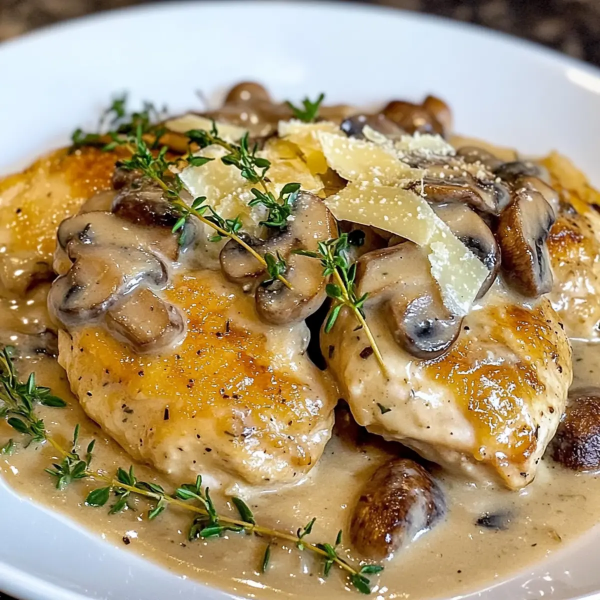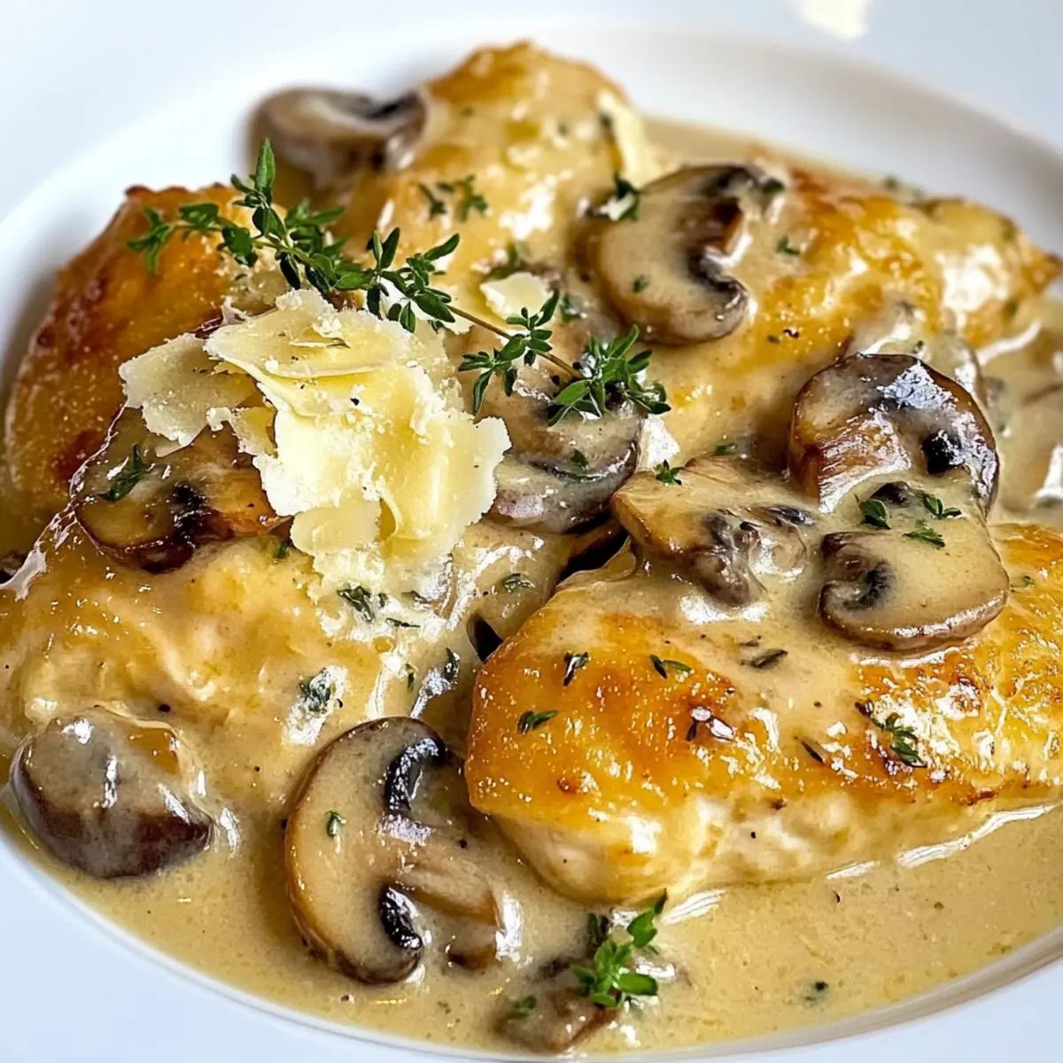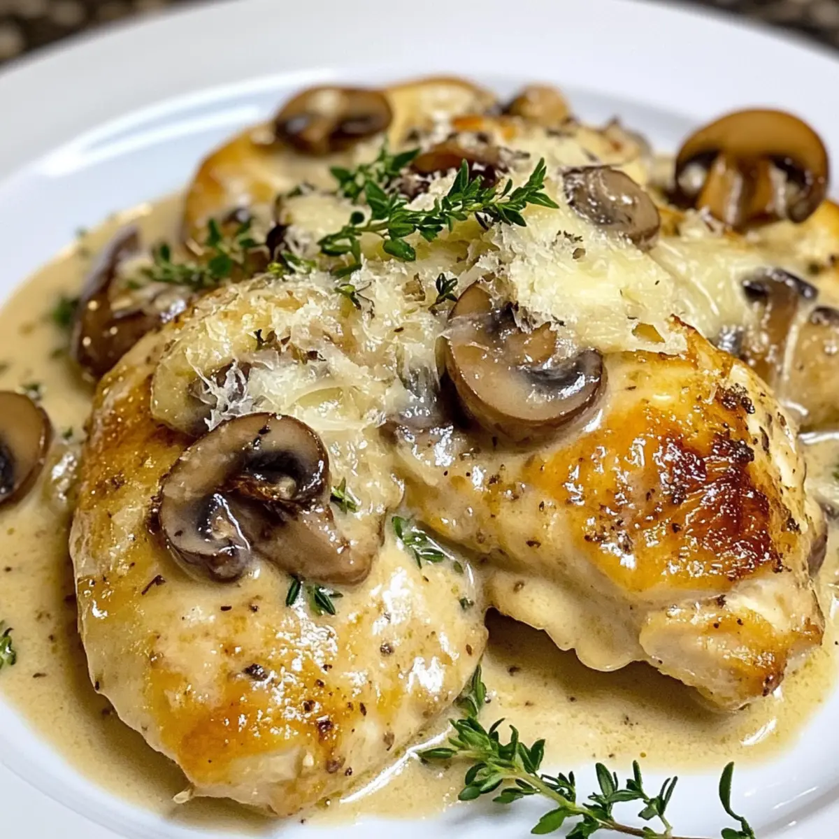 Eines Abends, als ich auf der Suche nach einer schnellen, aber köstlichen Mahlzeit war, entschied ich mich, das Pilz Asiago Hähnchen zu kreieren. Es gelang mir, ein Gericht zusammenzustellen, das sowohl den Gaumen erfreute als auch der Hektik eines modernen Lebensstils gerecht wurde. Diese Kombination aus zartem Hühnchen, erdigen Champignons und dem würzigen Geschmack von Asiago-Käse ist nicht nur perfekt für geschäftige Nächte, sondern auch ein wahrer Publikumsliebling bei meinen Freunden und meiner Familie. In nur 30 Minuten erzielst du ein Gourmet-Erlebnis, das beeindruckt und das Gefühl von behaglicher Hausmannskost vermittelt. Bist du bereit, deinen nächsten Abend mit diesem köstlichen Gericht zu verwandeln? Warum wirst du dieses Rezept lieben? Einfachheit: Die Zubereitung ist denkbar einfach und erfordert nur grundlegende Kochkenntnisse. Aromatische Mischung: Die Kombination aus zarten Champignons und würzigem Asiago-Käse sorgt für einen köstlichen Geschmack, der jeden begeistert. Schnelles Abendessen: In nur 30 Minuten zauberst du ein Gourmet-Gericht auf den Tisch, ideal für stressige Wochentage. Vielseitigkeit: Mit Anpassungsoptionen wie glutenfreiem Mehl oder einer niedrigeren Kohlenhydratversion ist dieses Gericht für jeden geeignet! Probiere auch die Variation Ideen für noch mehr Genuss. Familienfreundlich: Dieses Gericht wird sicher zum Favoriten deiner Lieben und sorgt für strahlende Gesichter am Esstisch. Pilz Asiago Hähnchen Zutaten Hinweis: Bereite dich auf ein schnelles, aber geschmackvolles Abendessen mit diesen Zutaten vor! Hähnchenbrustfilets (3 Stück) – Primäre Proteinquelle; kann durch Hähnchenschenkel für mehr Geschmack ersetzt werden. Champignons (2 Tassen, halbiert) – Fügt Umami und Reichhaltigkeit hinzu; verwende dafür Crimini oder Champignons. Knoblauch (1 Zehe, gehackt) – Verstärkt den Geschmack; frischer Knoblauch ist für den besten Geschmack empfehlenswert. Frischer Thymian (3 Zweige) – Bringt Kräuternoten; kann durch ½ TL getrockneten Thymian ersetzt werden, wenn frisch nicht verfügbar ist. Trocken Weißwein (1½ Tassen) – Sorgt für Säure und Tiefe in der Sauce; ersetze ihn durch Hühnerbrühe für eine alkoholfreie Version. Gewürztes Mehl (½ Tasse) – Zum Wenden des Hähnchens, sorgt für eine knusprige Kruste; kann durch glutenfreies Mehl ersetzt werden. Butter (2 EL) – Zum Anbraten des Hähnchens; Olivenöl kann für eine milchfreie Option verwendet werden. Olivenöl (2 EL) – Wird zum Kochen verwendet; kann durch Pflanzenöl ersetzt werden. Sahne (½ Tasse) – Fügt der Sauce Reichhaltigkeit hinzu; kann durch eine Mischung aus Milch und Sahne ersetzt werden, benötigt eventuell eine Verdickung. Asiago-Käse (⅓ Tasse, gerieben) – Sorgt für einen reichen, salzigen Geschmack; Parmesan oder Romano bieten alternative Geschmacksrichtungen. Salz (½ TL, oder nach Geschmack) – Verstärkt den Geschmack; an persönliche Vorlieben anpassen. Pfeffer (¼ TL, oder nach Geschmack) – Fügt eine milde Schärfe hinzu; nach Geschmack anpassen. Schritt-für-Schritt-Anleitung für Pilz Asiago Hähnchen Step 1: Hähnchen vorbereiten Die Hähnchenbrustfilets auf eine einheitliche Dicke (ca. 0,6 cm) klopfen und in Portionen schneiden. So gewährleistest du eine gleichmäßige Garzeit. Heize zuerst eine große Pfanne bei mittlerer Hitze vor, bevor du fortfährst. Step 2: Hähnchen anbraten Erhitze 1 Esslöffel Butter und 1 Esslöffel Olivenöl in der vorgeheizten Pfanne. Wende die Hähnchenstücke in gewürztem Mehl, sodass sie schön bedeckt sind, und brate sie 5 Minuten pro Seite, bis sie goldbraun sind. Entferne das Hähnchen aus der Pfanne und lege es beiseite. Step 3: Gemüse anbraten Füge das restliche Olivenöl in die Pfanne hinzu und lasse es erhitzen. Gib die halbierten Champignons und die gehackte Knoblauchzehe hinein. Brate sie 4-5 Minuten an, bis die Champignons goldbraun sind und die Aromen gut entfalten. Step 4: Ablöschen der Pfanne Gieße den trockenen Weißwein hinzu und löse die angebrannten Reste vom Pfannenboden. Dies dauert etwa 2 Minuten und sorgt dafür, dass alle Aromen perfekt miteinander verschmelzen. Step 5: Thymian hinzufügen Zerdrücke die frischen Thymianzweige leicht und füge sie zur Champignonmischung hinzu. Lege das Hähnchen wieder in die Pfanne und bringe alles zum Kochen. Reduziere die Hitze, decke die Pfanne ab und lasse das Gericht 15-20 Minuten köcheln, bis das Hähnchen durchgegart ist. Step 6: Sauce vollenden Nehme das Hähnchen erneut aus der Pfanne und rühre die Sahne sowie den geriebenen Asiago-Käse ein. Koche bei niedriger Hitze weiter, bis der Käse schmilzt und die Sauce um die Hälfte reduziert ist – dies dauert etwa 3-5 Minuten. Step 7: Servieren Gib das Hähnchen zurück in die Pfanne und erhitze es gründlich. Garniere das Gericht mit frischem Thymian, bevor du es servierst. Das Pilz Asiago Hähnchen wird am besten heiß, zum Beispiel über Pasta oder mit Beilagen wie Reis genossen. Lagerungstipps für Pilz Asiago Hähnchen Kühlschrank: Das Gericht kann bis zu 3 Tage im Kühlschrank aufbewahrt werden. Stelle sicher, dass es in einem luftdichten Behälter gelagert wird, um die Frische zu bewahren. Gefrierfach: Pilz Asiago Hähnchen kann bis zu 3 Monate eingefroren werden. Verpacke das Gericht in einem gefriergeeigneten Behälter oder in Gefrierbeuteln, um Gefrierbrand zu vermeiden. Wiederehitzen: Zum Erwärmen solltest du das Gericht sanft auf dem Herd erhitzen. Füge einen Schuss Sahne oder Brühe hinzu, um die Sauce cremig zu halten und ihre Konsistenz zu verbessern. Aufwärmen im Ofen: Alternativ kannst du das Hähnchen im Ofen bei 175 °C für etwa 20 Minuten aufwärmen. Decke es dabei mit Aluminiumfolie ab, um ein Austrocknen zu verhindern. Tipps für das beste Pilz Asiago Hähnchen Gleichmäßige Dicke: Stelle sicher, dass die Hähnchenbrust gleichmäßig geklopft ist. Dies gewährleistet eine gleichmäßige Garzeit und zartes Fleisch. Aromen intensivier