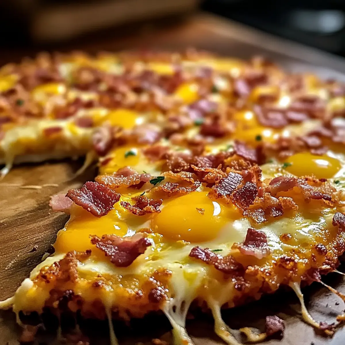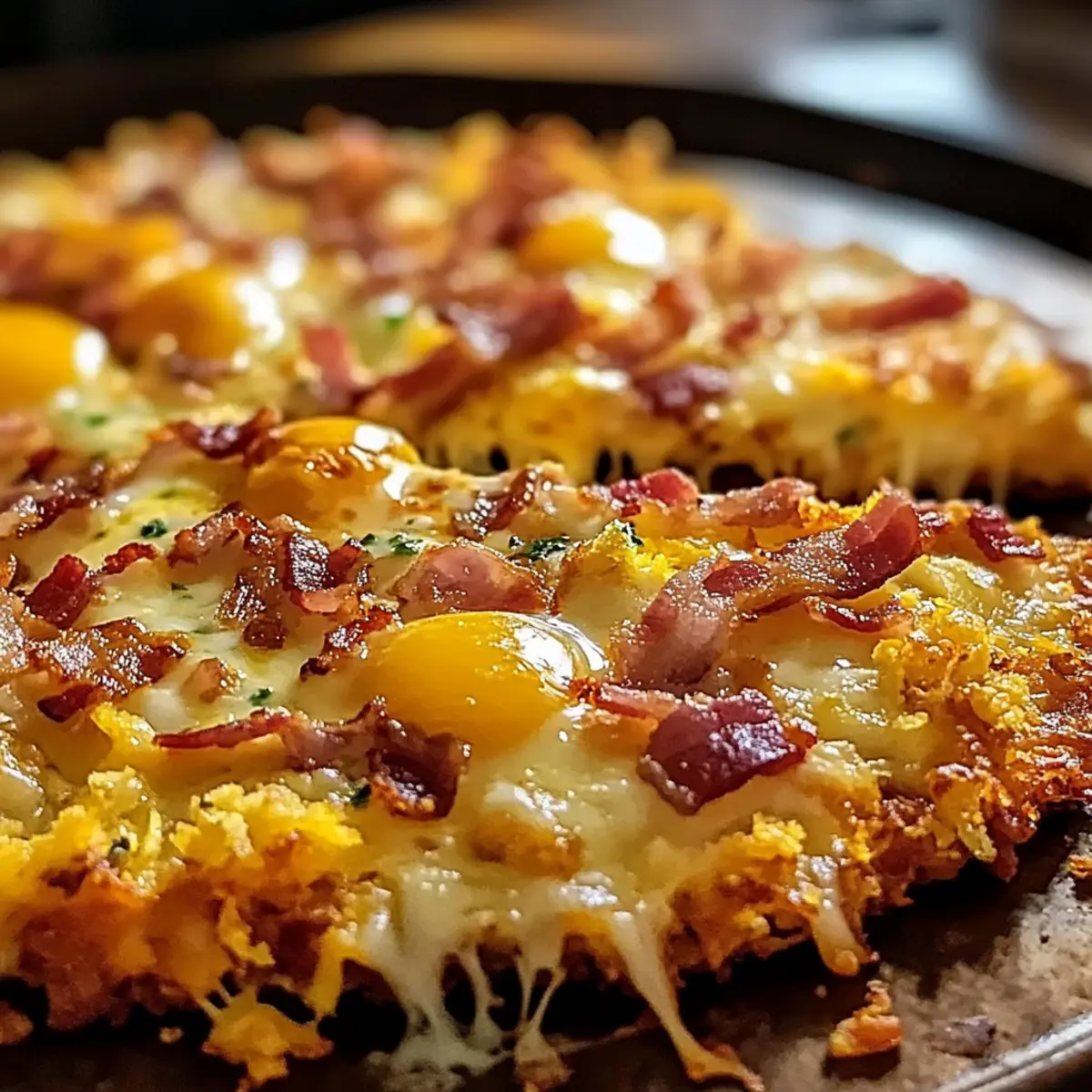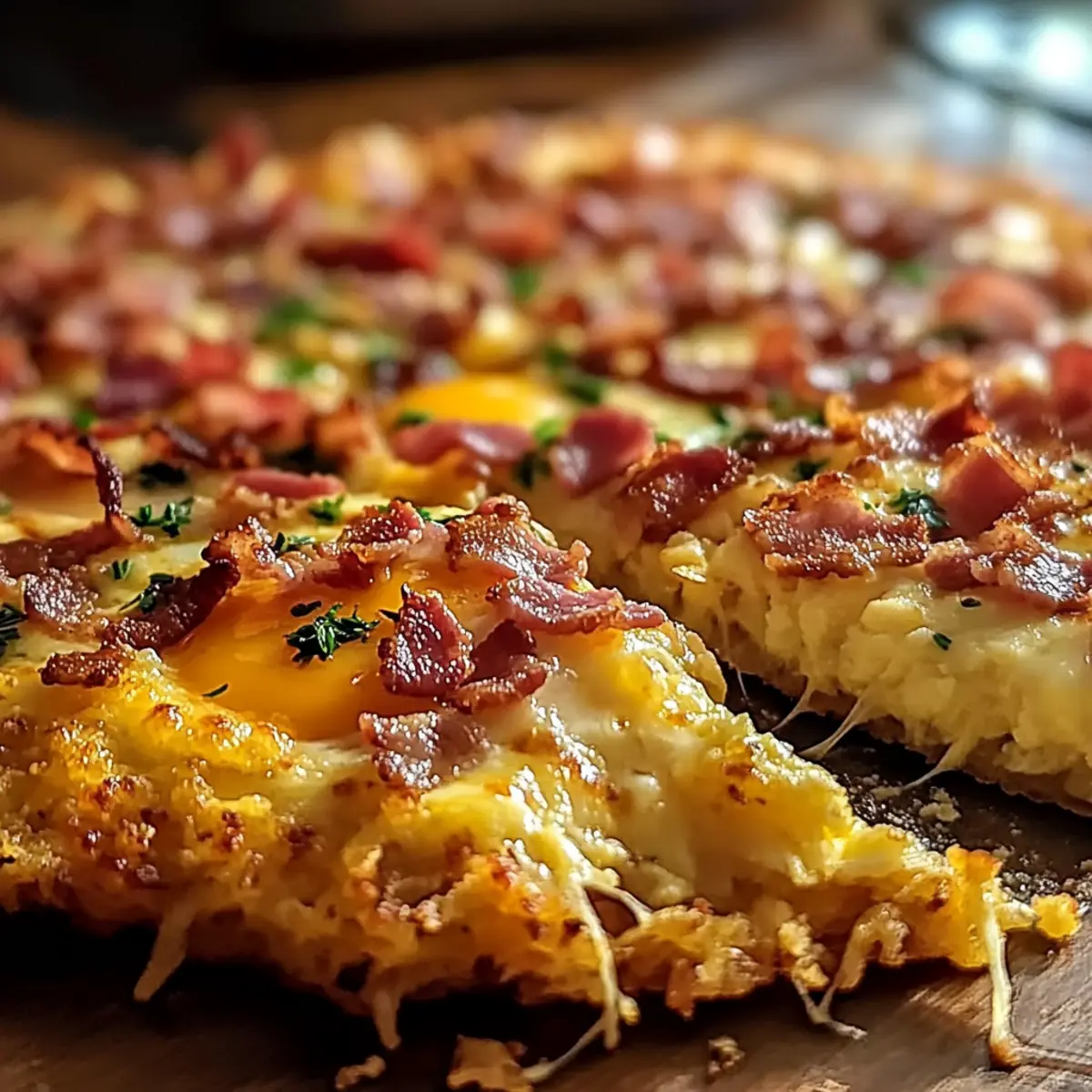Das Gefühl, wenn man morgens in die Küche kommt und der verführerische Duft einer frisch gebackenen Pizza durch den Raum zieht, ist unvergleichlich! Diese Easy Breakfast Pizza mit Hash Brown-Kruste vereint die besten Frühstückselemente in einem leckeren Gericht, das sowohl Familienherzen als auch den Gaumen erfreut. Mit einer knusprigen hash brown Kruste, die perfekt mit fluffigen Rühreiern, herzhaftem Speck und schmelzendem Käse belegt ist, lässt sich der Morgen wie im Nu genießen. Ideal für ein entspanntes Wochenende oder als schnelles Gericht unter der Woche, sorgt dieser herzliche Genuss für unvergessliche Momente am Frühstückstisch. Wer hätte gedacht, dass man den Klassiker Pizza so kreativ abändern kann? Neugierig auf das Rezept? Warum wirst du diese Pizza lieben? Einfachheit: Die Zubereitung dieser Pizza ist ein Kinderspiel – ein perfektes Rezept für Küchenneulinge und Profis! Vielfältig: Ob mit herzhaftem Speck oder frischem Gemüse, du kannst die Zutaten ganz nach deinem Geschmack anpassen. Herzhaft und lecker: Die Kombination aus knuspriger Hash-Brown-Kruste und saftigen Rühreiern bringt jeden Bissen zum Schmelzen. Schnell zubereitet: Nur wenige Schritte trennen dich von diesem köstlichen Frühstückserlebnis. Ideal für hektische Morgen! Familienfreundlich: Dieses Gericht kommt bei der ganzen Familie gut an – perfekt für Sonntagsbrunch oder im Alltag. Wenn du andere kreative Frühstücksideen suchst, schau dir auch unser Avocado Toast Rezept an! Zutaten für die Pizza und Hash-Brown-Kruste • Hier sind die Zutaten, die du für die perfekte Frühstücks-Pizza benöt! Für die Kruste Hash Browns – Die Grundlage der Pizza, sorgt für Struktur und Knusprigkeit. Verwende gefrorene Hash Browns für mehr Bequemlichkeit. Butter – Für Geschmack und damit die Kruste schön bräunt. Du kannst auch Olivenöl für eine leichtere Option verwenden. Salz und Pfeffer – Verbessert den Geschmack des Gerichts. Nach Geschmack anpassen. Für den Belag Bacon – Fügt eine herzhafte, knusprige Textur hinzu. Kann durch Truthahn-Bacon ersetzt oder für eine vegetarische Variante ganz weggelassen werden. Eier – Dienen als Hauptfüllung, liefern hochwertiges Protein. Verwende Eiersubstitute für eine cholesterinärmere Option. Würfelschinken – Für eine zusätzliche Fleischschicht. Lass ihn für eine vegetarische Pizza weg; ersetze ihn durch zusätzliches Gemüse oder Feta-Käse. Geriebener Käse – Für eine schmelzende, köstliche Oberseite. Mische Sorten wie Cheddar und Mozzarella für einen reichen Schmelz. Optionale Toppings Zwiebeln, Paprika oder Champignons – Füge zusätzliche Geschmäcker und Texturen hinzu. Lass deiner Kreativität beim Einsetzen saisonaler Gemüse freien Lauf. Mit diesen Zutaten bist du bestens gerüstet, um deine eigene Pizza und Hash-Brown-Kruste zu kreieren und dein Frühstückserlebnis zu bereichern! Schritt-für-Schritt-Anleitung für die Pizza und Hash-Brown-Kruste Step 1: Ofen vorheizen Heize deinen Ofen auf 220°C (425°F) vor, damit er die richtige Temperatur zum Backen der Pizza und Hash-Brown-Kruste erreicht. Dies ist entscheidend, damit die Kruste schön knusprig wird. Während der Ofen sich aufheizt, kannst du bereits mit den Vorbereitungsschritten beginnen. Step 2: Hash Browns formen Nimm die gefrorenen Hash Browns und drücke sie gleichmäßig in eine Stoneware-Pizzaform. Achte darauf, dass sie eine feste Krustenform ergeben, die den Belag gut hält. Die Kombination aus Knusprigkeit und Struktur wird später die Grundlage deiner Pizza und Hash-Brown-Kruste sein. Step 3: Butter hinzufügen Schmelze etwas Butter und träufle sie gleichmäßig über die Hash Brown-Kruste. Dies sorgt nicht nur für mehr Geschmack, sondern hilft auch, die Kruste goldbraun zu bräunen. Wenn du eine leichtere Option bevorzugst, kannst du stattdessen auch Olivenöl verwenden. Step 4: Würzen Streue eine Prise Salz und Pfeffer über die Kruste, um die Aromen zu verstärken. Achte darauf, die Gewürze gleichmäßig zu verteilen, damit jeder Biss gut gewürzt ist. Diese einfache Würzung hebt den Geschmack deiner Pizza und Hash-Brown-Kruste deutlich hervor. Step 5: Kruste backen Schiebe die Pizza und Hash-Brown-Kruste in den vorgeheizten Ofen und backe sie für 20-25 Minuten. Achte darauf, dass die Oberfläche goldbraun und knusprig wird. Dies ist ein wichtiger Schritt, um eine perfekte Basis für den Belag zu schaffen. Step 6: Speck anbraten In einer Pfanne kannst du jetzt den Speck bei mittlerer Hitze anbraten, bis er knusprig ist. Dies dauert etwa 5-7 Minuten. Achte darauf, den Speck regelmäßig zu wenden, um gleichmäßige Knusprigkeit zu erreichen. Lass ihn auf einem Papiertuch abtropfen, bevor du ihn zerbrichst. Step 7: Eier rühren In derselben Pfanne, in der du den Speck zubereitet hast, schlage die Eier auf und rühre sie bei mittelgeringer Hitze, bis sie fluffig und leicht gestockt sind. Dies dauert etwa 3-4 Minuten. So erhältst du die perfekte Füllung für deine Pizza und Hash-Brown-Kruste. Step 8: Pizza belegen Nimm die gebackene Kruste aus dem Ofen und verteile die Rühreier gleichmäßig darauf. Streue den zerbröselten Speck darüber. Diese Kombination aus Eiern und Speck sorgt für einen herzhaften Geschmack, der deinen Gaumen erfreuen wird. Step 9: Zusätzliche Toppings hinzufügen Füge nun den gewürfelten Schinken und weitere gewünschte Toppings hinzu. Du kannst die Auswahl nach deinem Geschmack anpassen: Gemüse, wie Zwiebeln oder Paprika, fügt frische Aromen hinzu. Diese Freiheit beim Belegen macht die Pizza und Hash-Brown-Kruste noch vielseitiger. Step 10: Käse draufstreuen Verteile den geriebenen Käse gleichmäßig über der Pizza und Hash-Brown-Kruste. Dies sorgt für eine köstliche, schmelzende Schicht, die beim Backen wunderbar goldbraun wird. Wähle eine Käsesorte oder eine Mischung, um zusätzliche Geschmackstiefe zu erzielen. Step 11: Ein weiteres Mal backen Backe die Pizza und Hash-Brown-Kruste für weitere 2