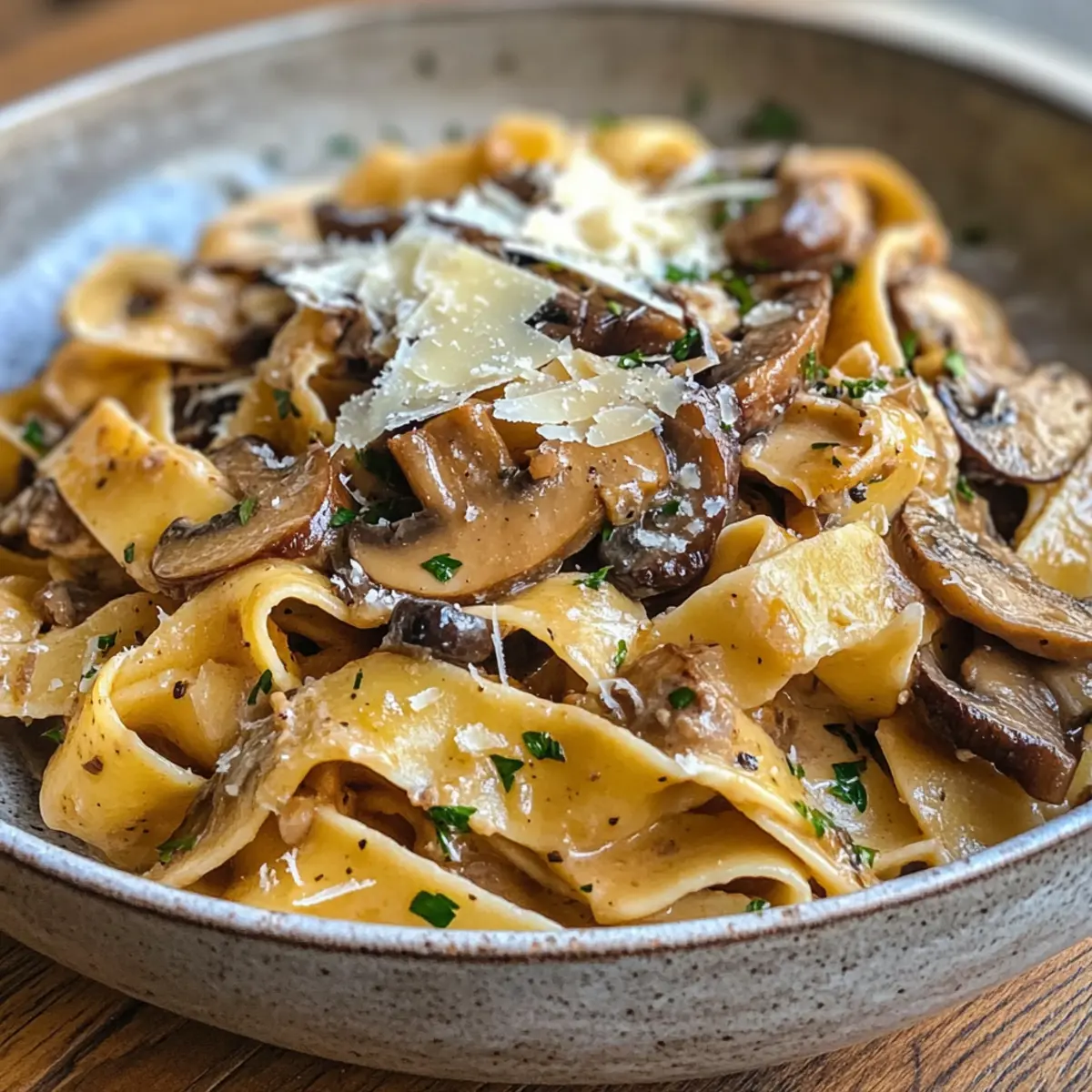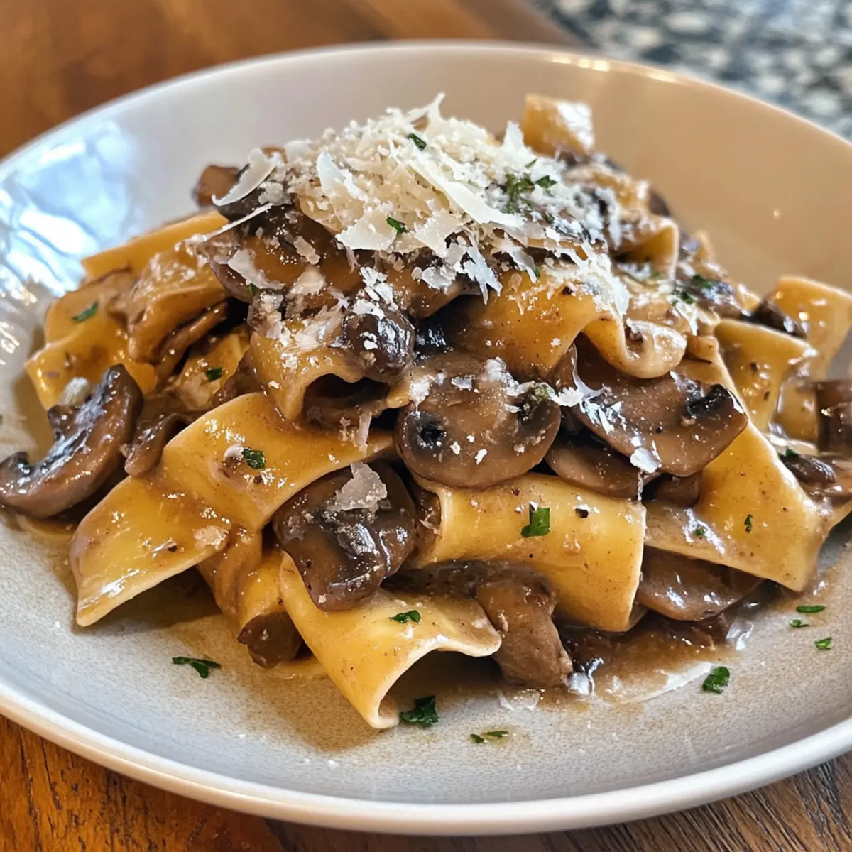 8. Serviere die Portobello-Pilz-Pappardelle sofort. Garniere das Gericht nach Belieben mit frischen Parmesanraspeln.