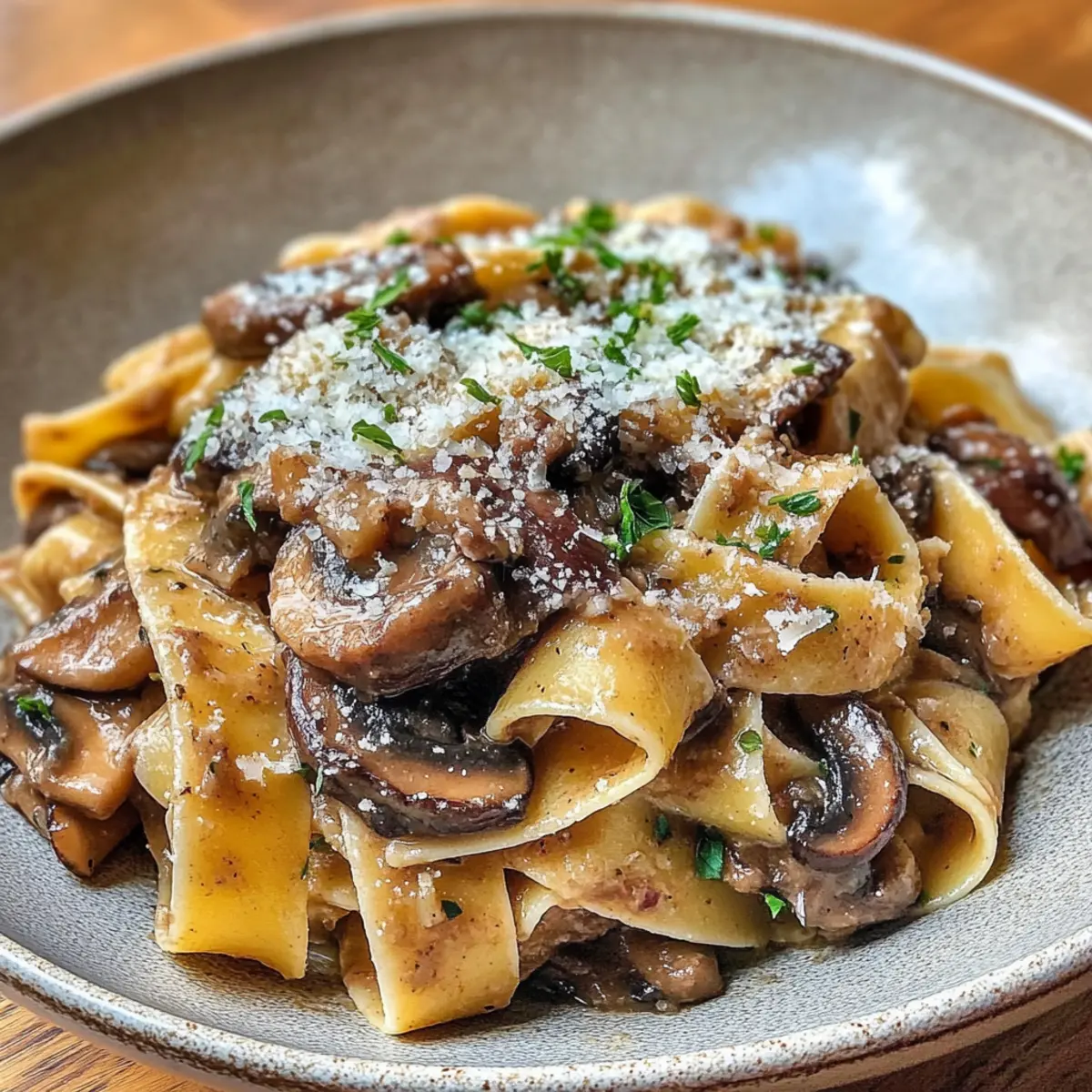 Genießen Sie Portobello-Pilz-Pappardelle, ein schnelles, herzhaftes und vegetarisches Gericht, das die Aromen der italienischen Küche einfängt.