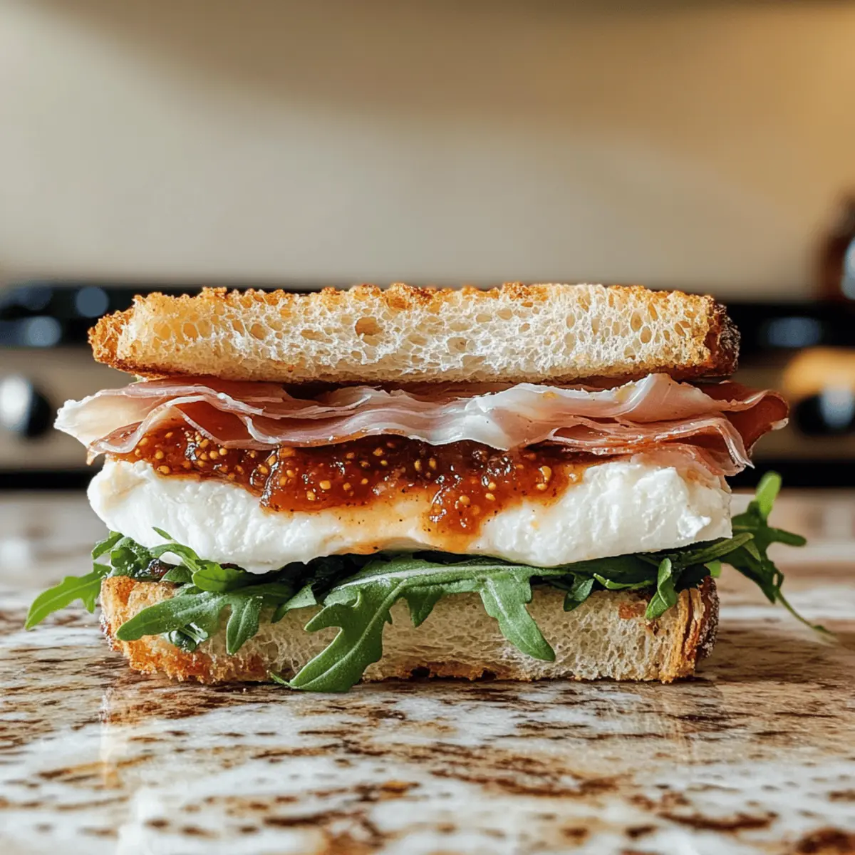 Ein köstliches Prosciutto und Käse Sandwich, vereint mit Chili Feigenmarmelade für ein unvergleichliches Geschmackserlebnis.