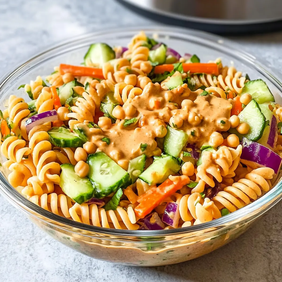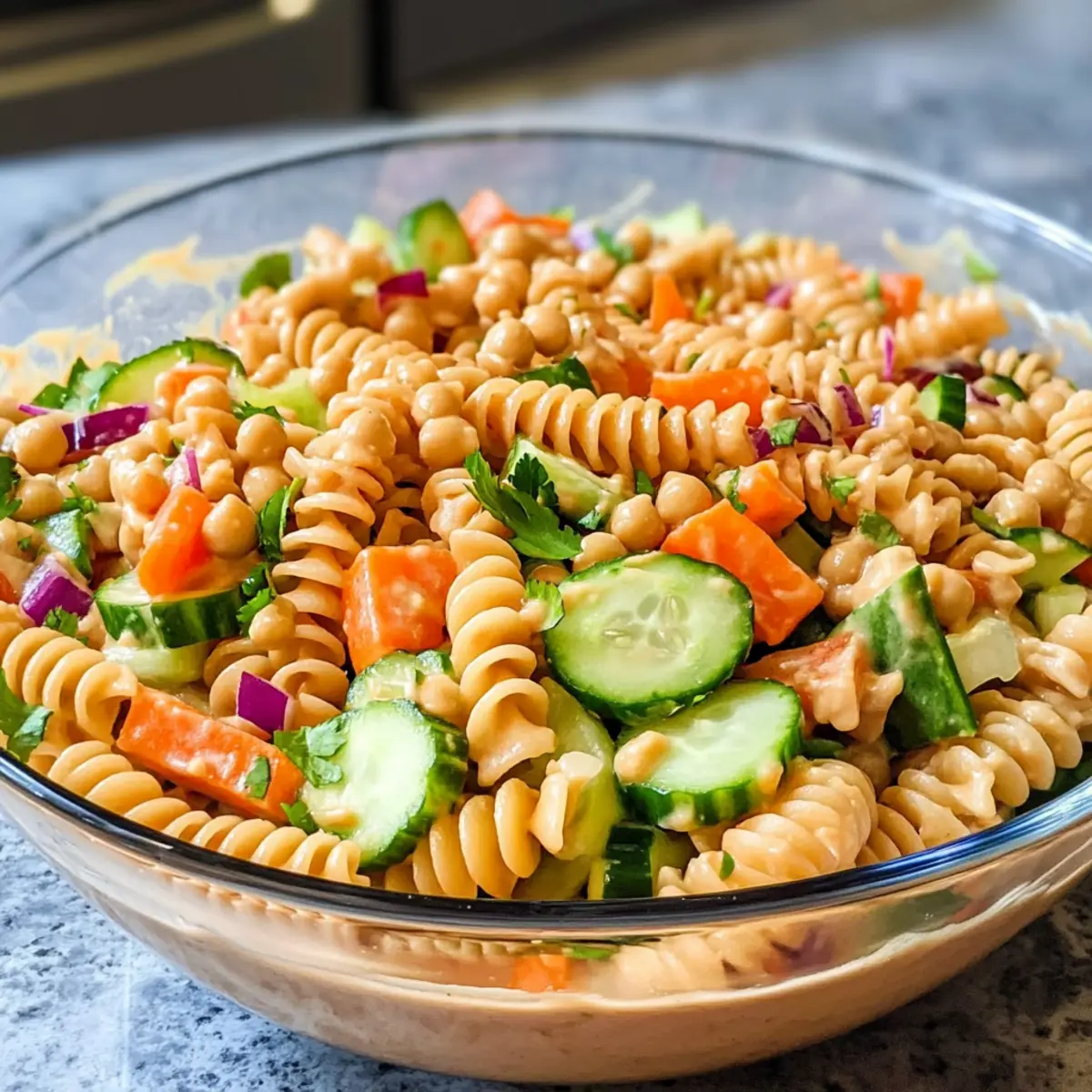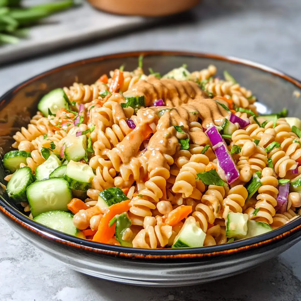 Der erste Biss in meinen Proteinreichen Thai-Pasta-Salat offenbart die explosive Kombination aus knackigem Gemüse und dem nussigen Aroma einer cremigen Erdnusssauce – ein ganzes Geschmackserlebnis in nur einem Löffel. Diese schmackhafte Speise verbindet häusliche Gemütlichkeit mit einer gesunden Note, denn sie ist nicht nur vegan und glutenfrei, sondern bietet auch erstaunliche 14 Gramm Protein pro Portion dank der innovativen Garbanzobohnen-Pasta. Das Beste daran? Die Zubereitung dauert lediglich 20 Minuten, was sie zum perfekten Gericht für vielbeschäftigte Küchenchefs macht, die auf der Suche nach einer nahrhaften und dennoch schnell zuzubereitenden Mahlzeit sind. Neugierig, wie diese köstliche Mischung entsteht? Lass uns gemeinsam zaubern! Warum solltest du diesen Salat lieben? Frische und Vielfalt: Dieser Proteinreiche Thai-Pasta-Salat bringt frisches Gemüse und köstliche Aromen zusammen. Einfach und Schnell: In nur 20 Minuten zubereitet, eignet sich dieses Rezept perfekt für hektische Tage. Vielseitigkeit pur: Variiere die Zutaten nach Geschmack – probiere zum Beispiel edamame oder frische Kräuter wie Koriander oder Minze aus! Nährstoffreich: Mit 14 Gramm Protein pro Portion unterstützt er dich optimal bei deiner Ernährung. Und falls du Lust auf etwas Abwechslung hast, schau dir auch unser Rezept für Avocado Toast Radieschen oder die Vegane Linsenknoedel Curry an! Zutaten für Proteinreichem Thai-Pasta-Salat Für die Sauce: Ahornsirup – sorgt für Süße; du kannst auch Agavendicksaft als vegane Option verwenden. Ungewürzter Reisessig – bringt Säure; Apfelessig eignet sich als Alternative. Erdnussbutter – bildet die Basis für das cremige Dressing; verwende Mandel- oder Sonnenblumenbutter als nussfreie Substitute. Orangensaft – trägt zur Fruchtigkeit bei; frisch gepresster Saft hat den besten Geschmack. Knoblauch (gehackt) – verleiht ein aromatisches Aroma; frischer Knoblauch intensiviert den Geschmack. Flüssige Aminosäuren – bieten einen herzhafteren Geschmack, ähnlich wie Sojasauce; Sojasauce kann verwendet werden, wenn du nicht glutenfrei bist. Sriracha – optional für etwas Schärfe; passe die Menge deinem Geschmack an. Für den Salat: Kichererbsennudeln – proteinreiche, glutenfreie Pasta; für glutenhaltige Ernährung kannst du Vollkorn- oder herkömmliche Pasta verwenden. Frühlingszwiebeln – sorgen für Frische und Knackigkeit; gehackte rote Zwiebeln sind ein guter Ersatz. Kohl – bietet Crunch und Textur; zerhackter Grünkohl ist eine gute Alternative. Geriebene Karotten – fügen Farbe und Süße hinzu; diese können durch geriebene Rote Bete ersetzt werden. Gehackte Gurke – sorgt für erfrischende Knackigkeit; andere knackige Gemüsesorten wie Paprika können ebenfalls verwendet werden. Dieser proteinreiche Thai-Pasta-Salat vereint gesunde Zutaten und bringt dir Freude in der Küche! Schritt-für-Schritt-Anleitungen für den Proteinreichen Thai-Pasta-Salat Step 1: Pasta kochen Koche die Kichererbsennudeln gemäß der Packungsanweisung in einem großen Topf mit sprudelndem Wasser für etwa 7–9 Minuten, bis sie al dente sind. Gieße die Nudeln anschließend in ein Sieb ab und spüle sie kurz unter kaltem Wasser ab, um den Kochprozess zu stoppen und ein Verkleben zu verhindern. Lass die Nudeln gut abtropfen. Step 2: Dressing zubereiten In einer großen Schüssel vermischst du 3 Esslöffel Ahornsirup, 2 Esslöffel ungewürzten Reisessig, 4 Esslöffel Erdnussbutter, 3 Esslöffel frisch gepressten Orangensaft, 1 Teelöffel gehackten Knoblauch, 2 Esslöffel flüssige Aminosäuren und nach Belieben Sriracha. Rühre die Mischung mit einem Schneebesen kräftig, bis eine glatte, cremige Sauce entsteht, die gut emulgiert ist. Step 3: Zutaten kombinieren Sobald die Kichererbsennudeln abgekühlt sind, gib sie in die vorbereitete Schüssel mit dem Dressing. Füge 4 gehackte Frühlingszwiebeln, 1 Tasse gehackten Kohl, 1 Tasse geriebene Karotten und 1 Tasse gehackte Gurken hinzu. Diese frischen Zutaten bringen Knackigkeit und Farbe in deinen Proteinreichen Thai-Pasta-Salat. Step 4: Vermischen und servieren Verwende eine große Gabel oder einen Löffel, um alle Zutaten vorsichtig miteinander zu vermengen, bis alles gleichmäßig mit dem Dressing bedeckt ist. Achte darauf, dass die Nudeln und das Gemüse gut durchmischt sind. Lasse den Salat entweder bei Raumtemperatur stehen oder kühle ihn für ca. 10–15 Minuten im Kühlschrank, um die Aromen intensivieren zu lässt. Proteinreichem Thai-Pasta-Salat Variationen Entfessle deine Kreativität in der Küche und passe diesen köstlichen Salat nach deinem Geschmack an! Nussfrei: Ersetze die Erdnussbutter durch Sonnenblumenbutter für eine nussfreie Variante. Du kannst auch ein köstliches Tahini-Dressing zubereiten. Diese Alternativen sorgen dafür, dass jeder genießen kann, ohne auf Geschmack zu verzichten. Zusätzliche Proteine: Füge Edamame oder gegrillten Tofu hinzu, um den Proteingehalt noch weiter zu steigern. So wird dein Salat nicht nur nahrhaft, sondern auch sättigend – perfekt für einen aktiven Lebensstil. Frische Kräuter: Verleihe dem Salat einen zusätzlichen Frischekick, indem du frischen Koriander oder Minze hinzufügst. Diese Kräuter bringen einen aromatischen Hauch und beleben das Geschmackserlebnis. Würzig: Möchtest du es schärfer machen? Füge mehr Sriracha hinzu oder probiere frisch gehackte Chilischoten aus. So wird jeder Bissen zu einem feurigen Genuss. Verschiedene Nudeln: Experimentiere mit anderen Pasta-Sorten wie z.B. Vollkorn oder Quinoanudeln, wenn du keine Kichererbsennudeln zur Hand hast. Das sorgt für Abwechslung und bringt verschiedene Texturen in dein Gericht. Gemüsevariationen: Probiere statt Gurken oder Karotten knackige Paprika oder Radieschen. Diese Gemüse sorgen für neuen Biss und bringen Farbe in deinen Salat, was das Aussehen und den Geschmack aufpeppen kann. Obstige Note: Füge etwas Ananas oder Mango für eine süß-fruchtige Komponente hi