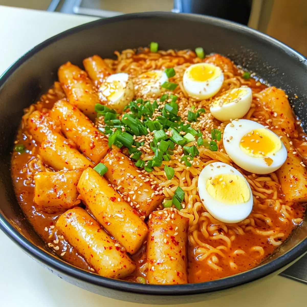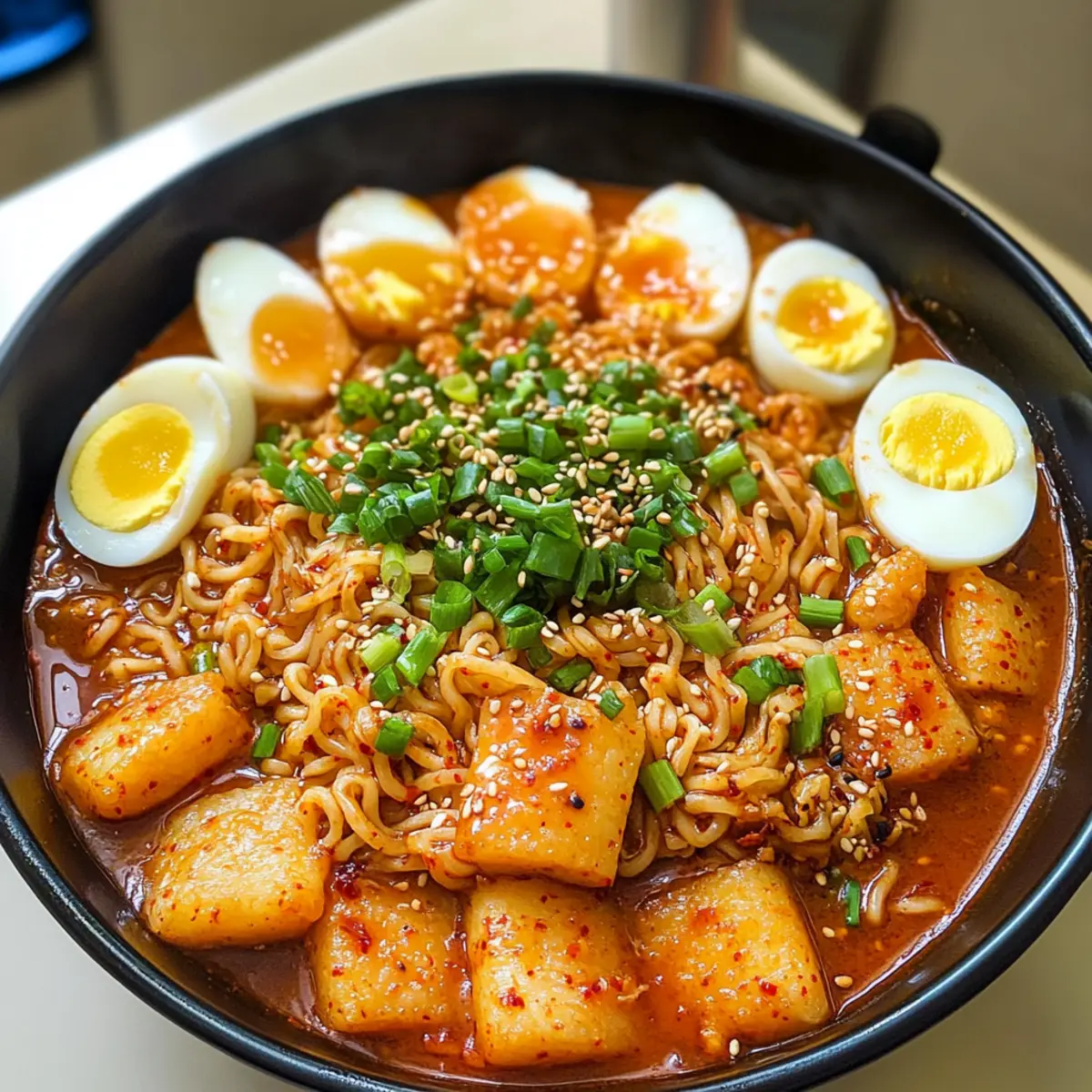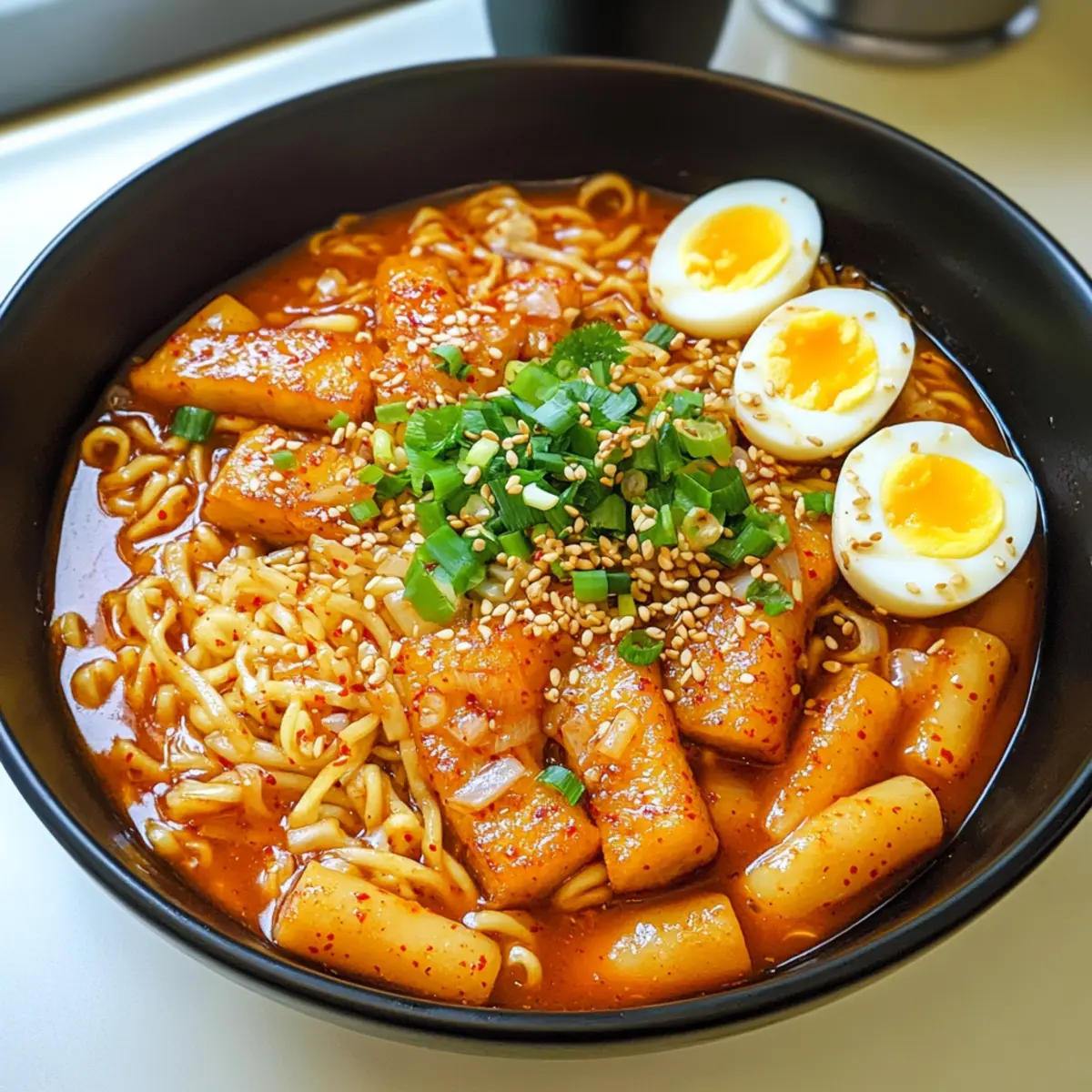 Mit einem verführerischen Duft, der an den Straßenständen Seouls erinnert, bringt diese einfache und schnelle Rabokki ein Stück koreanisches Streetfood direkt in eure Küche. Die Kombination aus zähen, scharfen Reisküchlein und zarten Ramen-Nudeln, verpackt in einer herzhaften Soße, ist ein absoluter Genuss! In nur einem Topf könnt ihr diese wärmende, tröstliche Mahlzeit zaubern, die perfekt für ein entspanntes Mittagessen oder ein geselliges Abendessen ist. Und nicht nur das: Rabokki ist auch ein großartiges Gericht für alle, die schnelle Rezepte schätzen und gleichzeitig auf der Suche nach einer gesunden, doch herzhaften Option sind. Seid ihr bereit, euren Gaumen mit einer köstlichen Kombination aus Hitze und Genuss zu verwöhnen? Dann lasst uns gleich loslegen! Warum ist Rabokki so besonders? Schnelligkeit: In weniger als 30 Minuten zaubert ihr ein köstliches Gericht, das sich perfekt für geschäftige Tage eignet. Vielseitigkeit: Individualisiert euer Rabokki mit verschiedenen Proteinquellen oder Gemüse – von Tofu bis zu frischen Karotten, die Optionen sind endlos! Wohlfühl-Food: Der herzhaft-warme Geschmack und die angenehme Schärfe machen dieses Gericht zu einem echten Seelenschmeichler. Einfache Zubereitung: Eine einzige Pfanne genügt, um alles zu vereinen – ideal zum entspannten Kochen und Minimalisieren des Abwaschs. Kulturelles Erlebnis: Mit jedem Bissen taucht ihr in die lebendige Straßenszene Seouls ein, ohne dafür euer Zuhause verlassen zu müssen. Probiert auch unsere anderen leckeren Rezepte wie Mini Protein Cheesecakes oder High Protein Eiweiss, um eure Kochkünste weiter zu verfeinern! Rabokki Zutaten Für die Soße • Sojasauce – sorgt für einen herzhaften Umami-Geschmack. Substitution: Tamari für eine glutenfreie Option. • Zucker – balanciert die Schärfe der Soße. Substitution: Honig oder Agavensirup. • Gochugaru – bringt Schärfe und rauchigen Geschmack ins Spiel. Substitution: Paprika mit einer Prise Cayenne für die Schärfe. • Gochujang – eine süße und scharfe koreanische Chilipaste, die die Soße eindickt. Keine direkte Substitution; bei milderem Geschmack weniger Chili-Pulver verwenden. • Minced Garlic – verleiht einen aromatischen Geschmack, der in der koreanischen Küche unerlässlich ist. Frisch oder pulverisiert verwendbar. • Anchovy Stock Tablets – verstärkt den Reichtum der Brühe. Substitution: Hausgemachte Fisch- oder Gemüsebrühe. Für die Hauptzutaten • Kohl – sorgt für Textur und Frische. Substitution: Bok Choy oder Grünkohl. • Frühlingszwiebeln – bietet einen milden Zwiebelgeschmack und Frische. Substitution: Schnittlauch oder Schalotten. • Reisküchlein (Tteokbokki) – die charakteristische Zutat, die Authentizität verleiht. Substitution: Dicke Nudeln, wenn nicht verfügbar, aber Kochzeit anpassen. • Fischkuchen – fügt Protein und Textur hinzu. Substitution: Tofu oder Hähnchen für eine vegetarische/andere Proteinoption. • Gekochte Eier – cremige Textur und zusätzliches Protein. Substitution: Weglassen für eine vegane Version. • Ramen-Nudeln – Basis für das Gericht, die schnell kochen. Substitution: Jede Instant-Nudel kann verwendet werden. Für die Garnitur • Gehackte Frühlingszwiebeln und weiße Sesamsamen – Garnitur für ein frisches Finish. Optional, aber empfohlen für die Präsentation. Entdeckt, wie man mit diesen Zutaten die köstliche Rabokki zubereitet und erlebt, warum sie zu einem wahren Geschmackserlebnis wird! Schritt-für-Schritt-Anleitung für Rabokki Step 1: Soße zubereiten Verrühre in einer Schüssel die Sojasauce, den Zucker, Gochugaru, Gochujang und den gehackten Knoblauch gut miteinander, bis eine homogene Soße entsteht. Stelle die Mischung beiseite, damit sie die Aromen entfalten kann. Diese Soße wird der star des Rabokki-Gerichts, also achte darauf, dass sie gut gemischt ist. Step 2: Brühe ansetzen In einem großen Topf bringst du 3½ Tassen Wasser mit 2 Anchovy Stock Tablets zum Kochen. Lass das Wasser auf hoher Hitze kochen, bis sich die Tabellen vollständig aufgelöst haben. Achte darauf, dass die Brühe schön aromatisch ist, bevor du die Soße hinzufügst. Step 3: Soße hinzufügen Sobald die Brühe kocht, füge die vorbereitete Soße hinzu und rühre gut um. Lass die Mischung für etwa 2 Minuten köcheln, damit sich die Aromen verbinden und die Soße etwas eindickt. Du solltest eine schöne, glänzende Flüssigkeit sehen, die bereit ist für die nächsten Zutaten. Step 4: Gemüse und Reisküchlein hinzufügen Füge nun den geschnittenen Kohl und die Frühlingszwiebeln in die Brühe hinzu. Gib anschließend die Reisküchlein (Tteokbokki) dazu und lass alles bei mittlerer Hitze 8 bis 10 Minuten köcheln. Achte darauf, dass der Kohl weich wird und die Reisküchlein die Aromen aufnehmen. Step 5: Fischkuchen und Eier einfügen Nach dem Köcheln integrierst du die Fischkuchen und die halbierten gekochten Eier in die Mischung. Schaffe einen kleinen Platz in der Mitte des Topfes, damit die Nudeln später gleichmäßig garen können. Lass die Mischung für weitere 2 Minuten auf niedriger Hitze köcheln. Step 6: Ramen-Nudeln kochen Setze die Ramen-Nudeln in den freigelassenen Bereich in der Mitte des Topfes. Decke den Topf ab und koche die Nudeln für 3 bis 4 Minuten, bis sie weich und zart sind. Überprüfe zwischendurch die Konsistenz, um sicherzustellen, dass sie nicht zu weich werden. Step 7: Anrichten und servieren Sobald die Nudeln gar sind, serviere das Rabokki heiß in Schalen. Garniere das Gericht mit gehackten Frühlingszwiebeln und weißen Sesamsamen für einen frischen Finish. Dein köstliches Rabokki ist jetzt bereit, genossen zu werden! Rabokki Variationen und Alternativen Lass deiner Kreativität freien Lauf und passe dieses köstliche Gericht an deinen persönlichen Geschmack an! Vegan: Ersetze die Fischkuchen durch Tofu und lasse die Eier weg, um eine schmackhafte vegane Variante zu erhalten. So bleibt das Gericht le
