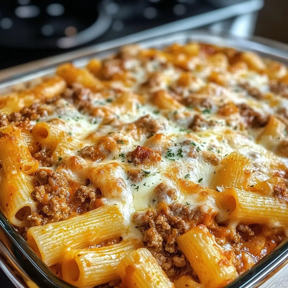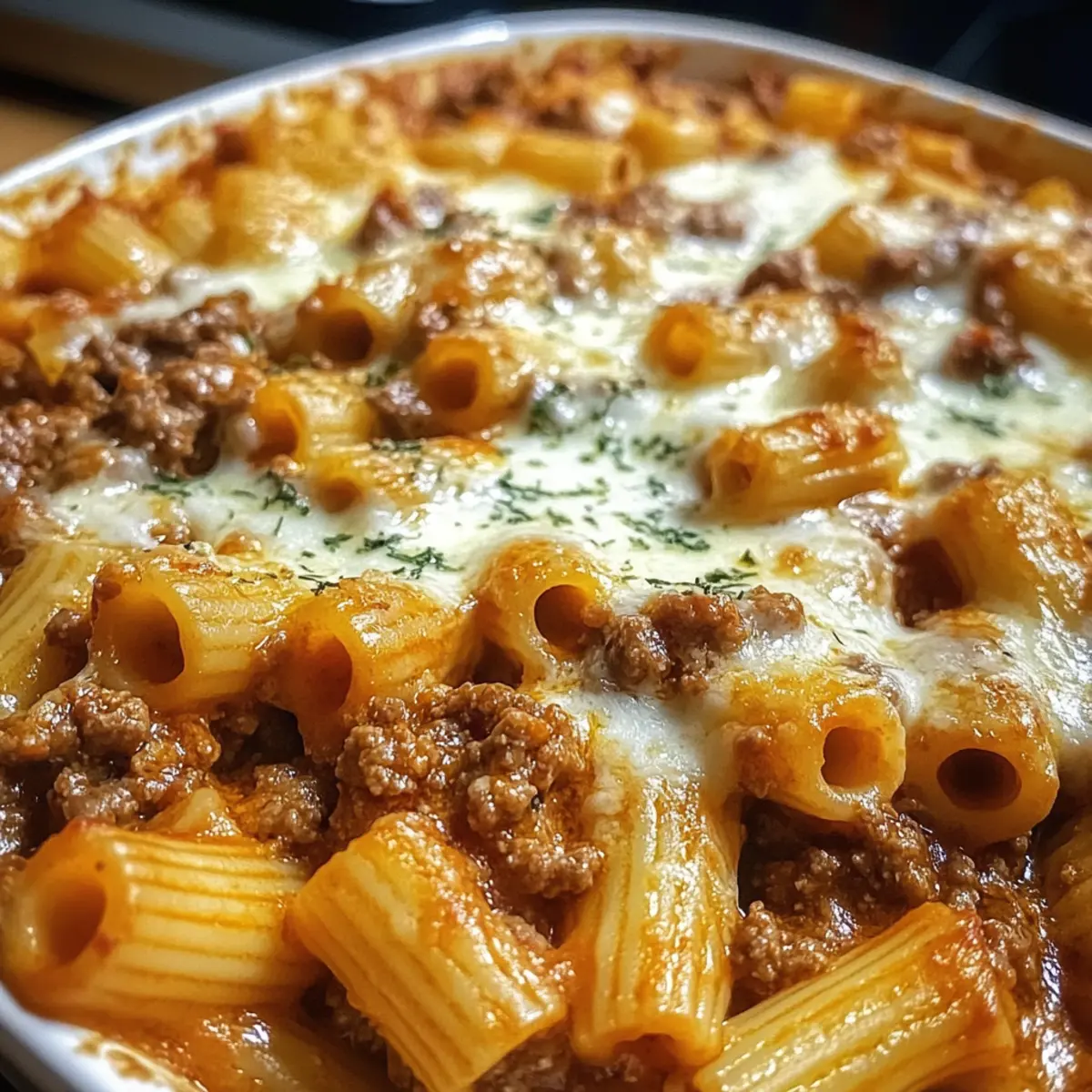 Ein herzhaftes Rindfleisch Rigatoni Käse Auflauf, perfekt für gemütliche Abende.< 40 words.