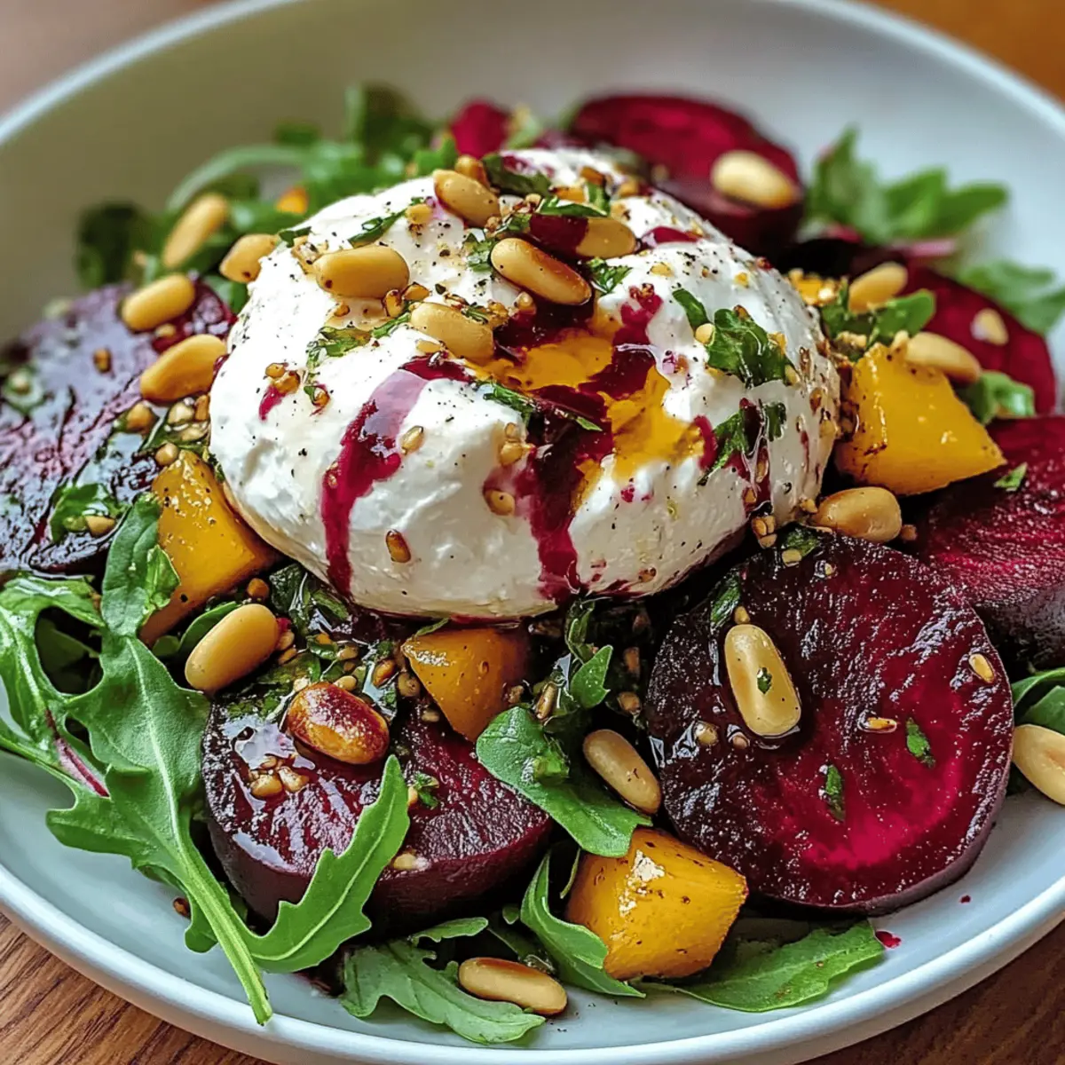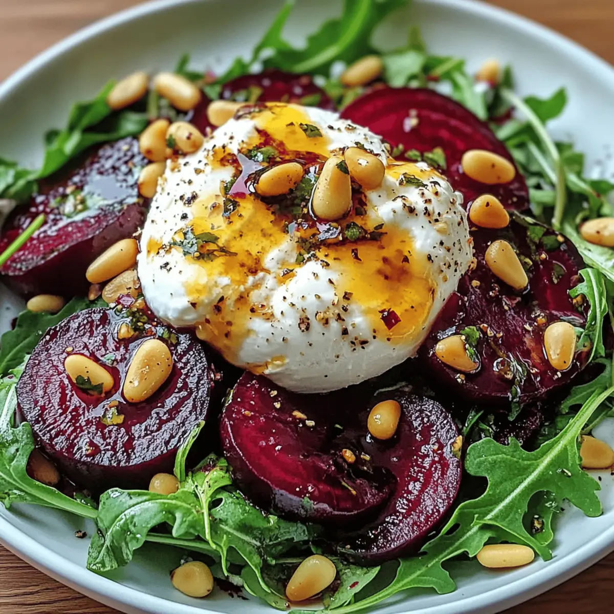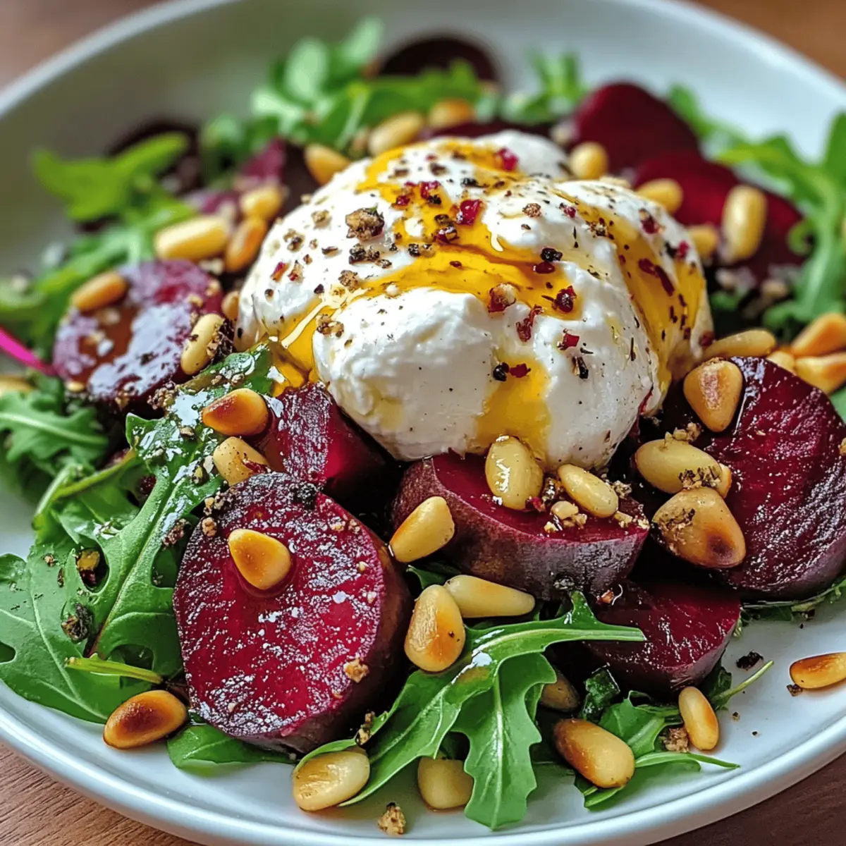 Es ist kaum zu fassen, wie einfach und schnell ein wahrer Augenschmaus zubereitet werden kann. Die Kombination aus gerösteten Beeten, cremiger Burrata und knackigen Pinienkernen, gebettet auf einem Bett von pikanter Rucola, macht den „Elegant Beet and Burrata Salad with Crunchy Pine Nuts“ zu einem wahren Fest für die Sinne. Dieses Rezept ist nicht nur ein köstlicher Genuss, sondern auch eine elegante Lösung für ungezwungene Dinnerpartys oder die perfekte Belohnung nach einem langen Tag. Mit wenig Aufwand zauberst du ein Gericht, das sowohl optisch als auch geschmacklich begeistert. Neugierig, wie sich die Aromen entfalten und perfektionieren lassen? Warum wirst du diesen Salat lieben? Einfachheit: Die Zubereitung ist unkompliziert und erfordert nur grundlegende Kochkenntnisse. Frische Aromen: Die Kombination aus gerösteten Beeten und cremiger Burrata sorgt für ein geschmackliches Erlebnis der Extraklasse. Vielseitigkeit: Du kannst Zutaten nach Belieben anpassen, wie zum Beispiel die Nüsse oder Käsesorten. Probiere auch unser Mac Cheese Rezept für einen weiteren Genuss! Schnell zubereitet: In weniger als einer Stunde ist dieser Salat servierbereit – ideal für spontane Dinnerpartys. Ein echter Hingucker: Die leuchtenden Farben und die ansprechende Präsentation machen ihn zum Star jeder Tafel. Lass dich von der Eleganz dieses Gerichts begeistern und serviere ihn zusammen mit einem köstlichen Ciabatta Sandwich Rezept für ein komplettes Menü! Zutaten für den Rote Bete Burrata Salat • Wenn du auf der Suche nach einem Rezept für eine elegante und leckere Salat-Option bist, dann lies weiter! Für den Salat Rote Beete – Die süße und erdige Basis sorgt für ein intensives Aroma. Baby-Rucola oder Mischsalat – Bietet eine pfeffrige Note und knackige Textur. Burrata – Die cremige Komponente schmilzt perfekt im Mund. Pinienkerne – Fügen Crunch und nussigen Geschmack hinzu. Für die Dressing Extra-Virgin Olivenöl – Wichtig für das Anrichten und Rösten der Beete. Balsamico-Glasur – Sorgt für eine süß-säuerliche Note im Dressing. Dijon-Senf – Fügt dem Dressing eine feine Schärfe hinzu. Honig oder Ahornsirup – Süßungsmittel im Dressing für eine geschmackliche Balance. Zitronensaft oder Rotweinessig – Sorgt für die nötige Säure, um die Aromen zu harmonisieren. Optional Rote Zwiebel – Gibt eine scharfe Note hinzu, kann aber weggelassen werden, wenn gewünscht. Dieser Rote Bete Burrata Salat ist nicht nur ein Fest für die Sinne, sondern auch ernährungsphysiologisch ausgewogen und glutenfrei, wenn die richtigen Zutaten verwendet werden. Schritt-für-Schritt-Anleitung für den Rote Bete Burrata Salat mit knusprigen Pinienkernen Schritt 1: Rote Beete rösten Heize den Ofen auf 200 °C vor. Wickele die gewaschenen Rote Beete in Alufolie und lege sie auf ein Backblech. Röste die Beete für 45-60 Minuten, bis sie zart sind – du kannst mit einem Messer testen, ob sie leicht durchzustechen sind. Nach dem Rösten lasse sie abkühlen, schäle die Beete, und schneide sie in dünne Scheiben. Schritt 2: Pinienkerne rösten Erhitze eine trockene Pfanne bei mittlerer bis niedriger Hitze. Gib die Pinienkerne hinein und röste sie unter ständigem Rühren etwa 3-5 Minuten, bis sie goldbraun und aromatisch sind. Achte darauf, nicht zu lange zu rösten, da sie schnell anbrennen können. Stelle die gerösteten Pinienkerne beiseite, während du mit den nächsten Schritten fortfährst. Schritt 3: Dressing anrühren In einer kleinen Schüssel vermische 4 Esslöffel extra-natives Olivenöl, 2 Esslöffel Balsamico-Glasur, 1 Teelöffel Dijon-Senf, 1 Teelöffel Honig oder Ahornsirup und den Saft einer halben Zitrone. Schlage die Zutaten mit einem Schneebesen kräftig durch, bis sie gut emulgiert sind. Schmecke das Dressing mit Salz und Pfeffer ab und stelle es zur Seite. Schritt 4: Salat anschichten Nimm eine große Servierschüssel und beginne, die Baby-Rucola oder Mischsalat als Basis zu legen. Darauf kommen die geschnittenen Rote Beete, die zerbrochene Burrata und die gerösteten Pinienkerne. Wenn du magst, füge auch einige dünne Scheiben rote Zwiebel hinzu. Das Anschichten sorgt für einen schönen Look und geschmackliche Harmonie im Rote Bete Burrata Salat. Schritt 5: Mit Dressing verfeinern Träufle das vorbereitete Dressing gleichmäßig über den Salat. Verwende einen Löffel oder eine kleinen Kelle, um sicherzustellen, dass alle Zutaten benetzt sind. Die Aromen des Dressings werden die süßen, erdigen Beete, die cremige Burrata und die knackigen Pinienkerne harmonisch ergänzen. Serviere den Salat sofort, um die Frische der Zutaten zu genießen. Expertentipps für den Rote Bete Burrata Salat Tender Beets sicherstellen: Achte darauf, dass die Beete vor dem Herausnehmen aus dem Ofen zart sind. Das garantiert den idealen Geschmack und die beste Textur für deinen Rote Bete Burrata Salat. Pinienkerne genau beobachten: Röste die Pinienkerne bei mittlerer bis niedriger Hitze und rühre ständig um, um ein Anbrennen zu vermeiden. So bleibt ihr nussiger Geschmack erhalten. Frische Zutaten verwenden: Baue den Salat erst kurz vor dem Servieren zusammen, damit die Blätter knackig und die Burrata cremig bleiben. Deine Gäste werden den Unterschied schmecken! Dressing anpassen: Scheue dich nicht, das Dressing nach deinem Geschmack auszuprobieren. Füge mehr oder weniger Honig hinzu, um die Süße des Rote Bete Burrata Salats nach deinem Gusto zu justieren. Optionale Zutaten: Experimentiere mit weiteren Zutaten wie Zitrusfrüchten oder anderen Nüssen. Vielfalt bringt neue Geschmackserlebnisse und macht deinen Salat noch interessanter! Lagerungstipps für den Rote Bete Burrata Salat Zimmertemperatur: Lass den Salat maximal 1 Stunde bei Zimmertemperatur stehen, um die Frische der Zutaten zu erhalten. Kühlschrank: Bewahre übrig gebliebenen Salat in einem luftdichten Behälter im Kühlschrank auf und genieße ihn innerhalb von 1-2 Tagen. Die Creme von der Burrata kann 