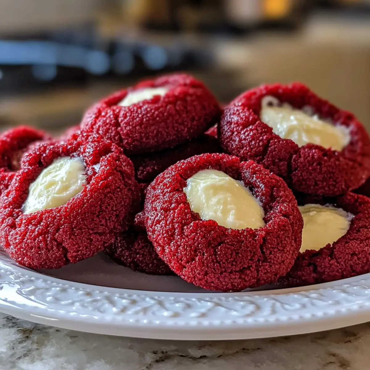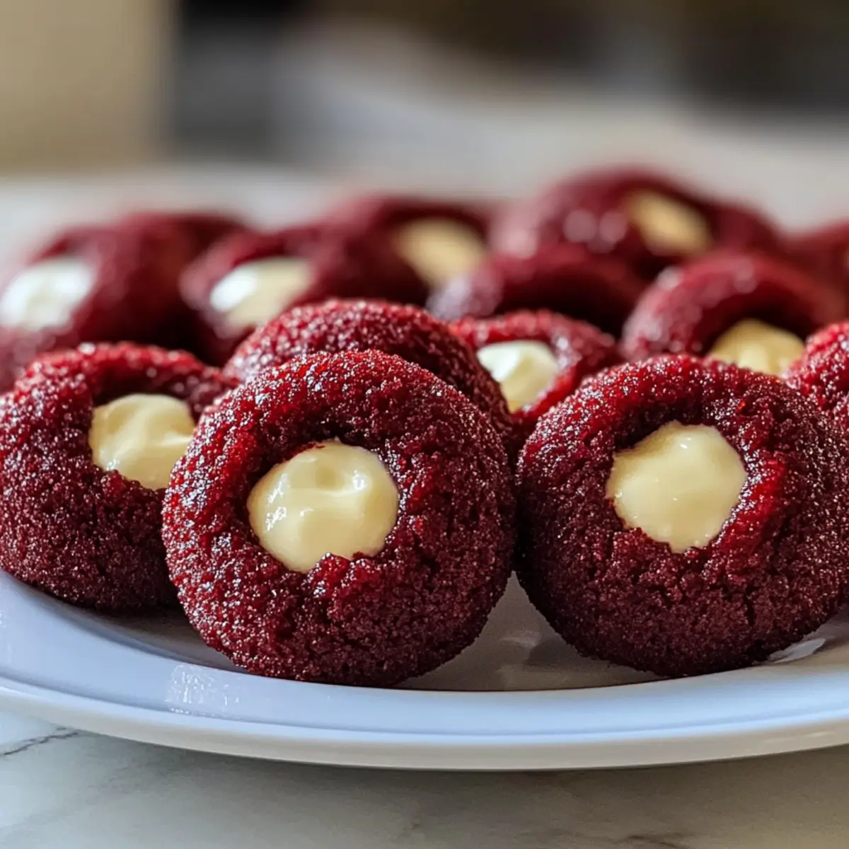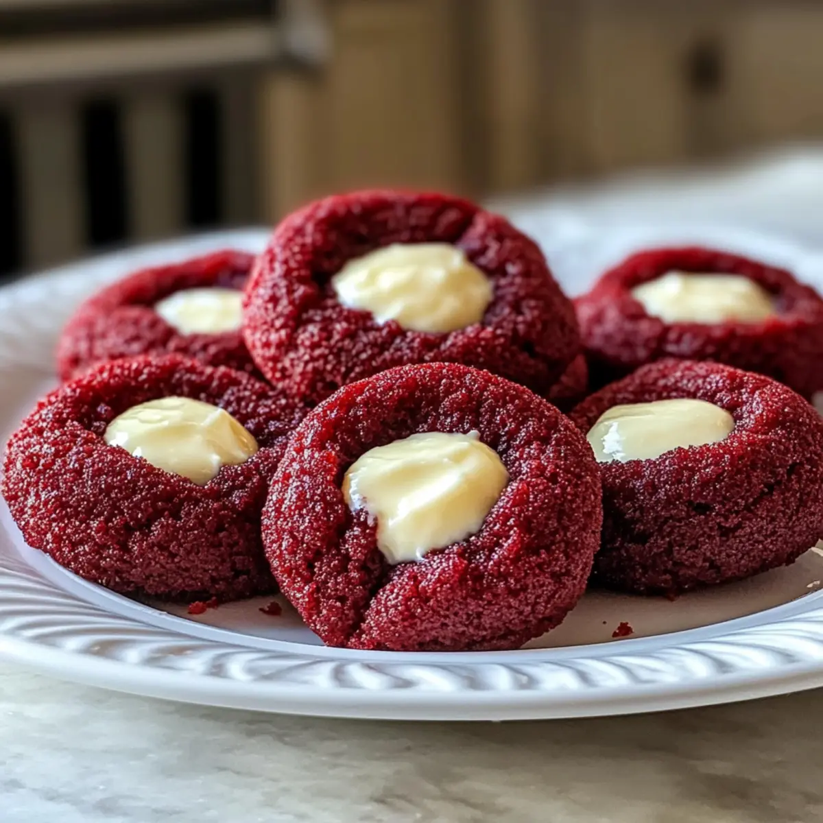 Diese Rote Samt Daumenabdruckkekse sind weich, zart und gefüllt mit einer unwiderstehlichen Creme aus Frischkäse. Ideal für jeden Anlass!