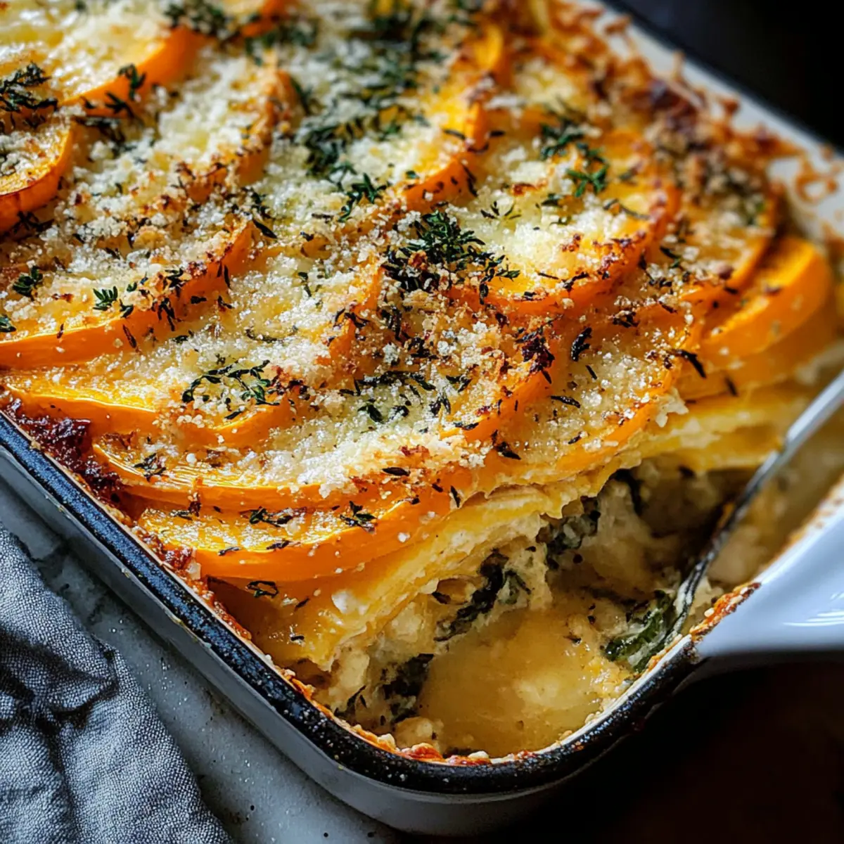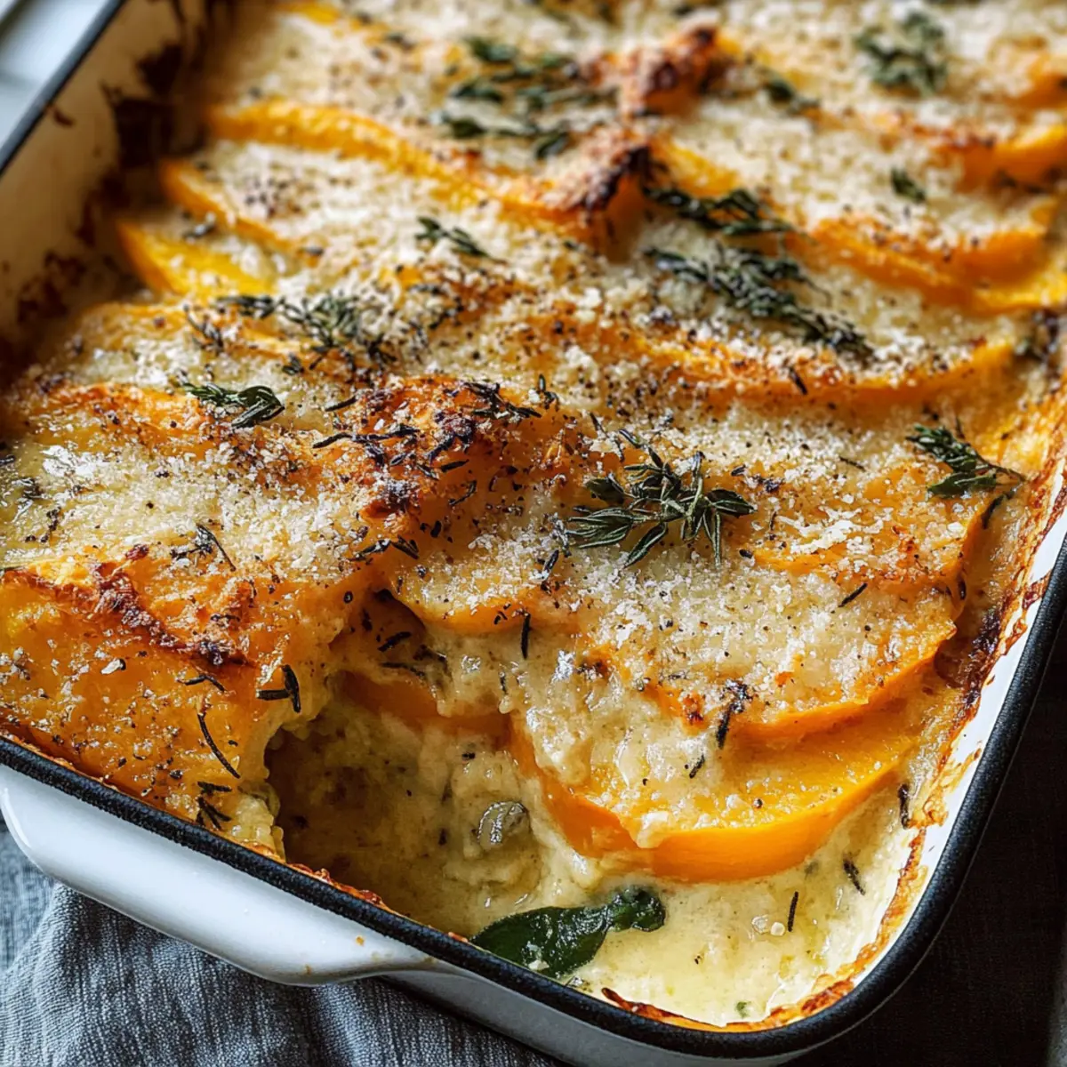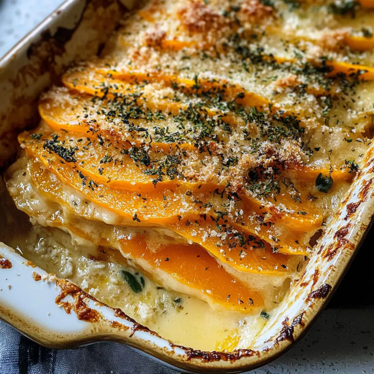 Als die ersten Blätter zu Boden fallen und die Luft nach Ernte riecht, beginnt für mich die Zeit der gemütlichen Familienessen und festlichen Feiern. Ich erinnere mich an die warmen, einladenden Gerüche in der Küche, die einen herbstlichen Klassiker ankündigen: Salbei Butternusskürbis Gratin. Diese vegetarische Beilage bringt nicht nur die süße, nussige Note des Butternusskürbisses zur Geltung, sondern verführt mit einer cremigen, mit frischen Kräutern aromatisierten Sauce und dem knusprigen Parmesan-Topping. Egal, ob für Thanksgiving oder Weihnachten, dieses einfache, aber elegante Rezept wird Ihre Gäste begeistern und ein Lächeln auf die Gesichter der Liebsten zaubern. Mit seiner kurzen Zubereitungszeit und der Möglichkeit, es im Voraus vorzubereiten, ist dieses Gericht die perfekte Ergänzung für jede festliche Tafel. Welche Geheimnisse wird Ihr Gratine verbargen halten? Warum werden Sie dieses Rezept lieben? Einfachheit: Die Zubereitung ist unkompliziert und erfordert nur grundlegende Kochkenntnisse, wodurch Sie in kürzester Zeit ein köstliches Gericht auf den Tisch zaubern. Herzhafter Geschmack: Der süße Butternusskürbis gepaart mit frischem Salbei und cremiger Sauce gibt diesem Gratin einen beeindruckenden, robusten Geschmack, der die Herzen Ihrer Gäste erobern wird. Vielseitigkeit: Perfekt als Beilage zu Festtagsgerichten, passt es hervorragend zu gebratenem Fleisch oder auch zu einem frischen grünen Salat. Vorbereitungsfreundlich: Bereiten Sie es im Voraus zu und heizen Sie es nur noch vor. So haben Sie mehr Zeit, um Ihre Gäste zu genießen! Gesund und nahrhaft: Dieses vegetarische Gericht ist reich an Vitaminen und genau das Richtige für eine bewusste Ernährung. Ideal für alle, die köstliche, saisonale Speisen schätzen! Salbei Butternusskürbis Gratin Zutaten • Entdecken Sie die Aromen des Herbstes mit diesen köstlichen Zutaten! Für das Gratin • Butternusskürbis – sorgt für Süße und eine cremige Textur; wählen Sie mittlere Kürbisse für gleichmäßige Scheiben. • Schalotte – bringt ein mildes Zwiebelaroma, das die Sauce vertieft; kann durch gelbe Zwiebel ersetzt werden. • Knoblauch – fügt aromatische Noten hinzu; frisch ist am besten. • Butter – notwendig für die Zubereitung einer Roux, die für einen reichhaltigen Geschmack sorgt; verwenden Sie Olivenöl für eine milchfreie Option. • Mehl – wirkt als Verdickungsmittel für die Sahnesauce; glutenfreies Mehl eignet sich für eine glutenfreie Variante. • Gemüsebrühe – sorgt für tiefen Geschmack; kann durch Hühnerbrühe ersetzt werden. • Schlagsahne – kreiert eine reichhaltige Sauce; halb mit Milch ersetzen für eine leichtere Variante. • Parmesan – sorgt für eine knusprige, herzhafte Kruste; verwenden Sie Nährhefe für eine vegane Option. • Salbei – verleiht dem Gericht ein erdiges Aroma; frisch ist vorzuziehen, getrockneter kann jedoch im Notfall verwendet werden. • Zwiebelpulver – verstärkt den Gesamtgeschmack; optional, aber empfohlen für zusätzliche Tiefe. • Pfeffer – zum Würzen; nach Geschmack anpassen. Für das Topping • Frische Schnittlauch – als Garnierung für einen frischen Farb- und Geschmacksakzent. Genießen Sie die Vorfreude auf die Zubereitung dieses Salbei Butternusskürbis Gratins, das Ihr Festmahl bereichern wird! Schritt-für-Schritt-Anleitung für Salbei Butternusskürbis Gratin Step 1: Ofen vorheizen und Kürbis vorbereiten Heizen Sie Ihren Ofen auf 200°C vor. Schälen Sie den Butternusskürbis und schneiden Sie ihn in dünne Halbmonde. Achten Sie darauf, die Kerne zu entfernen, um eine gleichmäßige Textur im Gratin zu erreichen. Bereiten Sie auch alle anderen Zutaten vor, um einen reibungslosen Ablauf bei der Zubereitung Ihres Salbei Butternusskürbis Gratins zu gewährleisten. Step 2: Schalotte und Knoblauch sautieren In einem mittelgroßen Topf die Butter bei mittlerer Hitze schmelzen. Fügen Sie die fein gehackte Schalotte und den Knoblauch hinzu und sautieren Sie beides für etwa 1–2 Minuten, bis die Mischung duftet und leicht golden ist. Dieser Schritt verleiht Ihrer Sauce die notwendige Tiefe, bevor Sie mit dem nächsten Schritt fortfahren. Step 3: Roux herstellen Streuen Sie das Mehl über die Mischung im Topf und rühren Sie gut um, um eine glatte Roux zu bilden. Dann gießen Sie nach und nach die Gemüsebrühe hinein, während Sie ständig mit einem Schneebesen weiterrühren. Kochen Sie die Mischung unter Rühren, bis sie anfängt, einzudicken, ohne dass sie dabei kocht. Step 4: Sahnesauce vollenden Reduzieren Sie die Hitze und geben Sie die Schlagsahne, Zwiebelpulver, schwarzen Pfeffer und den frischen Salbei in die Sauce. Rühren Sie, bis die Sauce eine gleichmäßige, cremige Konsistenz erreicht und warm ist, aber nicht kocht. Diese geschmackvolle Mischung wird das Herzstück Ihres Salbei Butternusskürbis Gratins bilden. Step 5: Schichten des Gratins Fetten Sie eine 23×33 cm große Auflaufform ein, um ein Ankleben zu verhindern. Gießen Sie etwa ein Drittel der Sahnesauce auf den Boden der Form. Schichten Sie die Hälfte der Butternusskürbisscheiben gleichmäßig darauf und streuen Sie eine kleine Menge Parmesan dazwischen, um zusätzliche Geschmacksdimensionen hinzuzufügen. Step 6: Fertigstellen der Schichten Gießen Sie die verbleibende Sahnesauce über die Kürbisscheiben und sorgen Sie dafür, dass alles gleichmäßig bedeckt ist. Legen Sie ein Blatt Backpapier auf die Auflaufform und decken Sie sie mit Alufolie ab, um ein Anbrennen während des Backens zu verhindern. Diese Abdeckung bewahrt auch die Feuchtigkeit im Gericht. Step 7: Backen des Gratins Platzieren Sie die vorbereitete Form in den vorgeheizten Ofen und lassen Sie das Salbei Butternusskürbis Gratin für 20 Minuten backen. Nach dieser Zeit nehmen Sie die Folie und das Backpapier ab, bestreuen es mit dem restlichen Parmesan und backen es weitere 10 Minuten, bis die Oberseite goldbraun und knusprig ist. Step 8: Garnieren und
