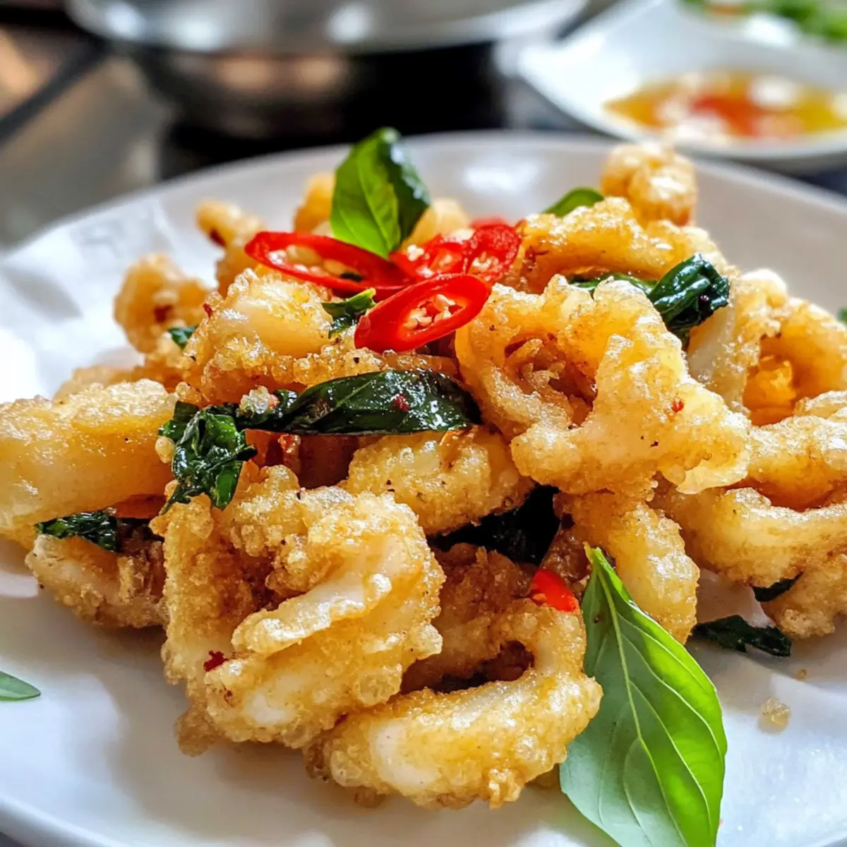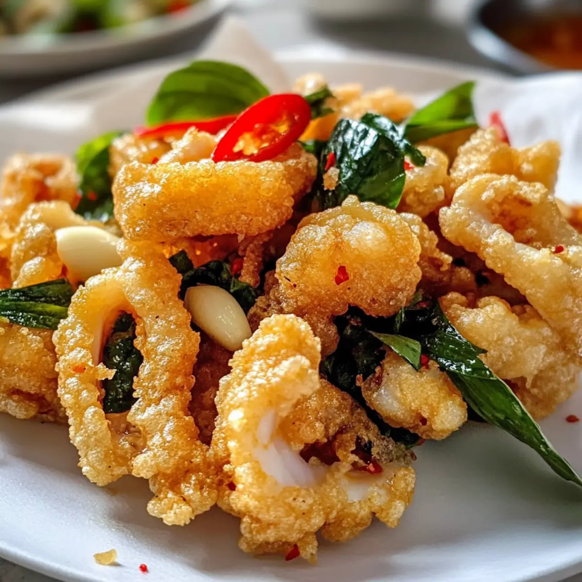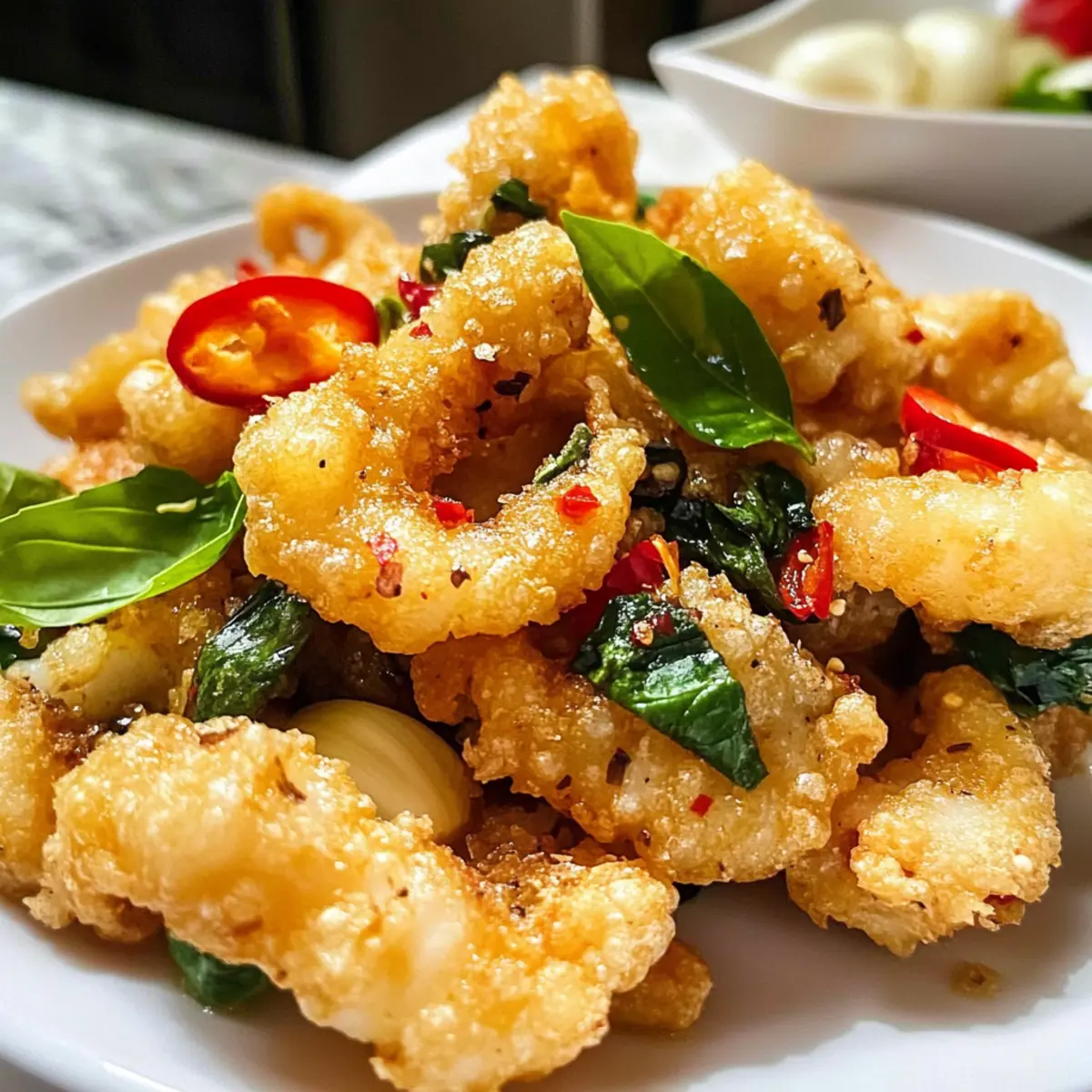 Das Knacken der perfekt frittierten Hülle, gefolgt von der zarten Textur des Tintenfischs, ist ein Erlebnis, das man nicht missen möchte. In meinem Rezept für Salz und Pfeffer Tintenfisch lehne ich mich an die köstlichen Techniken der taiwanesischen Küche an und bringe Ihnen eine neue Appetitanregung, die sowohl als Snack als auch als Beilage glänzt. Der wunderbare Fusion-Geschmack von knusprigem Teig, würzigem Chili, aromatischem Knoblauch und frischem Basilikum sorgt dafür, dass dieses Gericht bei jedem Anlass zum Star auf dem Tisch wird. Zubereitungszeit ist minimal und garantiert, dass Sie den frischen, knusprigen Genuss in kürzester Zeit servieren können. Neugierig, wie Sie diese köstliche Spezialität selbst zubereiten können? Warum werden Sie diesen Rezept lieben? Einzigartig lecker: Der fusionierte Geschmack aus aromatischem Knoblauch, frischem Basilikum und einer Prise Chili sorgt für ein Geschmackserlebnis, das Ihre Gäste begeistern wird. Einfach nachvollziehbar: Das Rezept erfordert nur grundlegende Kochfähigkeiten und wenige Zutaten, sodass selbst Kochanfänger tolle Ergebnisse erzielen können. Perfekte Textur: Die Kombination aus knuspriger Panade und zartem Tintenfisch bietet ein unvergessliches Esserlebnis, das an gehobene Speisen erinnert. Vielseitig einsetzbar: Ob als Snack, zu einem gemütlichen Abendessen oder als Teil eines festlichen Buffets – dieser Salz und Pfeffer Tintenfisch passt zu nahezu jedem Anlass! Schnell zubereitet: Mit einer minimale Zubereitungszeit von nur 30 Minuten haben Sie dieses köstliche Gericht im Handumdrehen auf dem Tisch. Wenn Sie nach weiteren einfachen, köstlichen Rezepten suchen, könnten auch Luftfritteuse Popcorn Rezept oder Kaese Kartoffel Heissluftfritteuse interessant für Sie sein! Zutaten für Salz und Pfeffer Tintenfisch • Die perfekte Grundlage für Ihr Rezept. Für den Tintenfisch Tintenfisch (oder Calamari) – Frischer Tintenfisch sorgt für den besten Geschmack und die beste Textur; Sie können auch andere Meeresfrüchte verwenden, wenn gewünscht. Shaoxing Wein – Dieser Marinadekomponente verleiht Tiefe und entfernt Fischaromen; alternativ können Sie weißen Wein oder Reisessig verwenden. Meersalz – Verstärkt den Geschmack; verwenden Sie feines Salz, das sich leicht in der Marinade auflöst. Weißer Pfeffer – Bringt eine milde Schärfe; schwarzer Pfeffer kann ersetzt werden, aber der Geschmack wird leicht variieren. Für die Panade Mehl – Bildet die Basis für die knusprige Panade; glutenfreies Mehl kann hier eine gute Alternative sein. Maisstärke – Unterstützt die Schaffung einer leichten, knusprigen Textur; kann durch Reismehl ersetzt werden. Für das Frittieren Frittieröl (Sonnenblumen- oder Rapsöl) – Ideal zum Frittieren, wählen Sie Öle mit einem hohen Rauchpunkt. Für die Aromen Knoblauch – Fügt aromatischen Geschmack hinzu; dünn schneiden und trocknen, um Soggenuss zu verhindern. Frische Chili – Sorgt für eine Prise Schärfe; die Menge je nach Schärfevorliebe anpassen. Frische Basilikumblätter – Verleiht ein aromatisches Aroma; thailändischer Basilikum kann für einen stärkeren Geschmack verwendet werden. Entdecken Sie die Freude am Kochen mit diesem köstlichen Rezept für Salz und Pfeffer Tintenfisch, das Ihre Sinne verzaubern wird! Schritt-für-Schritt-Anleitung für Salz und Pfeffer Tintenfisch Schritt 1: Tintenfisch vorbereiten Schneiden Sie den frischen Tintenfisch in gleichmäßige, mundgerechte Stücke. Achten Sie darauf, die Oberfläche des Tintenfischs leicht einzu-ritzen, um ein besseres Garen und eine angenehme Textur zu gewährleisten. Dies sollte in ungefähr 5 Minuten erledigt sein. Schritt 2: Marinieren Geben Sie die vorbereiteten Tintenfischstücke in eine Schüssel und fügen Sie Shaoxing-Wein, feines Meersalz und weißen Pfeffer hinzu. Vermischen Sie alles gut und lassen Sie die Marinade 15 Minuten im Kühlschrank einziehen. Dies verteilt die Aromen gleichmäßig und entfernt den fischigen Geruch. Schritt 3: Panade zubereiten Während der Tintenfisch mariniert, mischen Sie in einer weiteren Schüssel das Mehl, die Maisstärke, eine Prise Salz und weißen Pfeffer. Anschließend rühren Sie die Mischung gut um, um sicherzustellen, dass alle trockenen Zutaten gleichmäßig verteilt sind. Schritt 4: Öl erhitzen Erhitzen Sie das Frittieröl in einem tiefen Topf auf 180°C (350°F). Verwenden Sie ein Küchenthermometer oder werfen Sie ein kleines Stück Brot hinein, um die Temperatur zu testen. Das Öl ist bereit, wenn das Brot brutzelt und goldbraun wird. Schritt 5: Tintenfisch panieren Nehmen Sie die marinierten Tintenfischstücke und wenden Sie sie in der Mehlmischung, sodass jeder Bissen vollständig bedeckt ist. Lassen Sie überschüssiges Mehl abtropfen, bevor Sie mit dem Frittieren fortfahren. Schritt 6: Tintenfisch frittieren Legen Sie die panierten Tintenfischstücke vorsichtig in das heiße Öl und frittieren Sie sie etwa 2 Minuten lang. Wenden Sie die Stücke nach 1 Minute für ein gleichmäßiges Garen. Sobald sie goldbraun und knusprig sind, können Sie sie herausnehmen. Schritt 7: Aromen hinzufügen Fügen Sie schnell den vorbereiteten, dünn geschnittenen Knoblauch, die frischen Basilikumblätter und die Chili in das heiße Öl dazu. Seien Sie vorsichtig beim Hinzufügen der feuchten Zutaten, damit es nicht spritzt. Frittieren Sie alles für weitere 1-2 Minuten, bis die Aromen goldbraun und knusprig sind. Schritt 8: Abtropfen und servieren Entfernen Sie den frittierten Tintenfisch und die aromatischen Zutaten mit einem Schaumlöffel und lassen Sie sie auf Küchenpapier abtropfen. Servieren Sie den köstlichen Salz und Pfeffer Tintenfisch sofort heiß, vielleicht mit etwas zusätzlichem weißen Pfeffer für den sofortigen Genuss. Variationen für Salz und Pfeffer Tintenfisch Gestalten Sie das Rezept nach Ihren Wünschen und bringen Sie neue Geschmackserlebnisse auf den Tisch! Alternativen zum Tintenfisch: Tauschen Sie Tintenfisch gegen ga