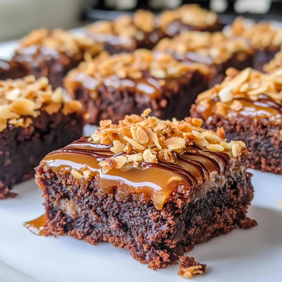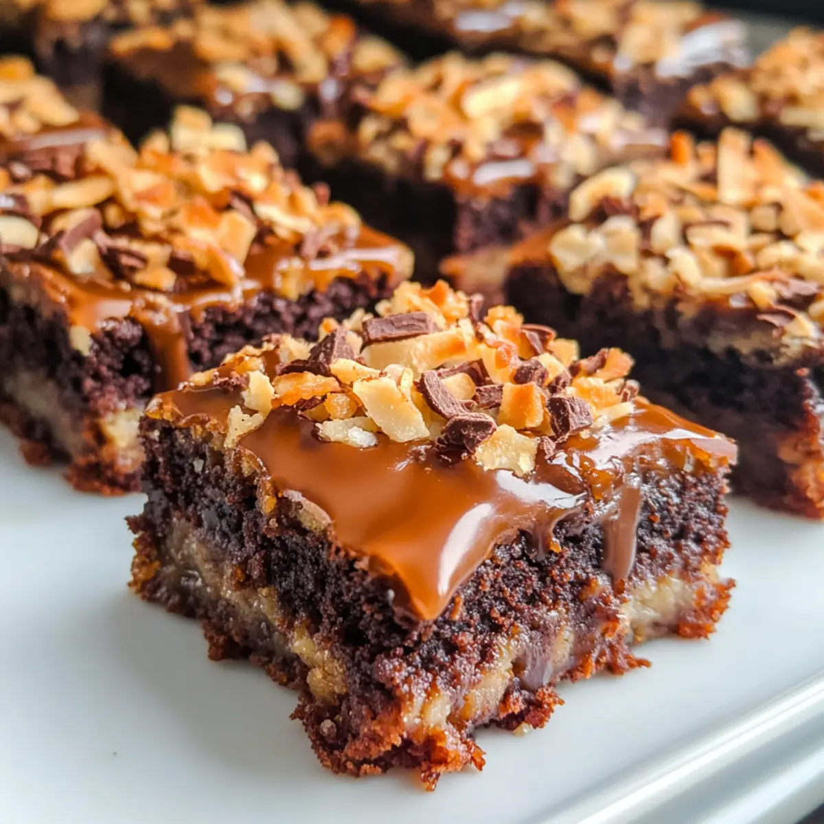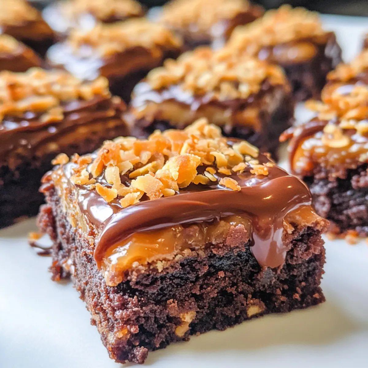 Als ich diese Woche in den Laden ging, fiel mein Blick auf die absoluten Klassiker unter den Süßigkeiten: die Samoa Cookies. Ihre verlockende Kombination aus Schokolade, Karamell und geröstetem Kokosnuss hat mich sofort inspiriert, eine Variante zuzubereiten – die Easy Samoa Brownies! Diese verführerischen Stücke sind nicht nur kinderleicht zubereitet, sondern bieten auch das Beste aus zwei Welten: den intensiven Schokoladengeschmack eines Brownies und die süße Versuchung einer Karamell- und Kokosnuss-Oberfläche. In nur 45 Minuten sind diese Brownies fertigin einer cremigen, fudgy Textur, die einfach glücklich macht. Wer könnte dazu schon Nein sagen? Neugierig, wie einfach es sein kann, dieses süße Vergnügen selbst zu kreieren? Warum sind Samoa Brownies unwiderstehlich? Einfachheit: Mit nur wenigen Zutaten und einer einfachen Anleitung sind diese Samoa Brownies ein Kinderspiel. Raffinierter Geschmack: Die Kombination aus reichem Schokoladengeschmack, süßem Karamell und geröstetem Kokosnuss lässt die Geschmacksknospen explodieren! Perfekte Textur: Der fudgy Brownie-Boden harmoniert perfekt mit der knusprigen Kokosnuss. Vielseitigkeit: Ob als Dessert nach dem Abendessen oder als süße Kleinigkeit für eine Feier, diese Brownies passen immer. Und wenn du Lust auf Abwechslung hast, probiere sie mit Cheesecake Brownies Einfaches zu kombinieren – so kreierst du das perfekte Spiel mit Texturen und Aromen! Samoa Brownies Zutaten Für den Brownieboden • Boxed Brownie Mix – bildet die Grundlage für diese köstlichen Samoa Brownies; kann durch selbstgemachten Brownieteig ersetzt werden. • Vegetable Oil – sorgt für Feuchtigkeit und Reichtum im Brownie; kann durch geschmolzenes Kokosnussöl für einen zusätzlichen Geschmack ersetzt werden. • Eggs – unverzichtbar für Struktur und Feuchtigkeit; ein Ei-Ersatz macht die Brownies vegan. • Water – hilft beim Mischen des Brownieteigs; kein Ersatz nötig, aber aromatisierte Flüssigkeiten können zusätzlichen Geschmack verleihen. Für die Toppings • Shredded Coconut – bringt eine herrliche Textur und den unverwechselbaren Kokosgeschmack; ungesüßter Kokos kann verwendet werden, wenn es weniger süß sein soll. • Caramel Ice Cream Topping – verleiht eine süße Note und sorgt für ein klebriges Topping; selbstgemachtes Karamell sorgt für einen authentischeren Geschmack. • Semi-Sweet Chocolate Chips – zum Drizzlen obenauf; Milchschokolade oder Zartbitter können nach Belieben substituiert werden. Viel Spaß beim Zubereiten deiner Samoa Brownies! Schritt-für-Schritt-Anleitung für Samoa Brownies Step 1: Ofen vorheizen Heize deinen Ofen auf 175 Grad Celsius vor und fette eine Backform (ca. 20×20 cm) gut ein. Diese Vorbereitung ist wichtig, damit die Samoa Brownies gleichmäßig backen und sich später leicht aus der Form lösen lassen. Du kannst auch Backpapier verwenden, um die Form auszulegen. Step 2: Brownie-Mischung herstellen Bereite die Brownie-Mischung gemäß den Anweisungen auf der Verpackung vor. Mische den Brownie-Mix mit Pflanzenöl, Eiern und Wasser in einer großen Schüssel. Rühre kräftig um, bis eine glatte und klumpenfreie Masse entsteht. Diese Kombination sorgt für den schokoladigen Basisgeschmack deiner Samoa Brownies. Step 3: Brownie-Boden backen Verteile den Brownieteig gleichmäßig in der vorbereiteten Backform und backe ihn für etwa 30-35 Minuten. Die Brownies sind fertig, wenn die Ränder fest sind und ein Zahnstocher in der Mitte leicht feuchte Krümel hat. Achte darauf, nicht zu lange zu backen, damit die Brownies innen schön fudgy bleiben. Step 4: Kokosnuss rösten Während die Brownies im Ofen backen, verteile den geraspelten Kokos auf einem Backblech und röste ihn für etwa 3-5 Minuten im Ofen. Rühre den Kokos öfter um, damit er gleichmäßig goldbraun wird und lecker duftet. Dieses Rösten verstärkt den Kokosgeschmack in deinen Samoa Brownies. Step 5: Karamell hinzufügen Entferne die Brownies nach dem Backen aus dem Ofen und lasse sie vollständig abkühlen. Wenn die Brownies abgekühlt sind, gieße die Karamellsoße gleichmäßig über die Oberfläche und verwende einen Spatel, um sie gut zu verteilen. Dieses süße Topping sorgt für das besondere Geschmackserlebnis deiner Samoa Brownies. Step 6: Geröstete Kokosnuss und Schokolade hinzufügen Bestreue die Karamellschicht großzügig mit der gerösteten Kokosnuss. Schmelze anschließend die Schokoladenstückchen in der Mikrowelle oder über einem Wasserbad und träufle sie über die Kokosnuss. Diese Kombination von Karamell, Kokos und Schokolade macht die Samoa Brownies unwiderstehlich lecker. Step 7: Kühl stellen und servieren Lass die Samoa Brownies im Kühlschrank stehen, bis die Schokolade und der Karamell fest sind, etwa 30 Minuten. Schneide die Brownies anschließend in gleichmäßige Quadrate und serviere sie. Diese schokoladigen, süßen Leckerbissen sind perfekt für jeden Anlass und werden sicher beliebt sein! Was passt zu Samoa Brownies? Ein unvergessliches Dessert-Erlebnis wird durch die perfekte Begleitung noch bereichernder! Vanilleeis: Die kühle, cremige Textur von Vanilleeis harmoniert wunderbar mit der warmen, fudgy Konsistenz der Samoa Brownies. Frischer Obstsalat: Die Frische und Säure der Früchte bieten einen erfrischenden Kontrast zur Süße der Brownies. Schlagsahne: Ein zusätzlicher Löffel Schlagsahne bringt eine Luftigkeit, die das alles umrahmt und den Genuss erhöht. Kaffee: Ein kräftiger Kaffee rundet das süße Erlebnis ab und hebt die Aromen von Schokolade und Karamell hervor. Kokosnuss-Milchshake: Ein cremiger Kokosnuss-Milchshake verstärkt den Kokosgeschmack und bietet eine angenehme Erfrischung. Karamell-Sauce: Ein zusätzlicher Drizzel Karamell-Sauce macht das Dessert noch verlockender und sorgt für extra Süße. Gönn dir mit diesen Begleitern den ultimativen Genuss deiner Samoa Brownies! Tipps für die besten Samoa Brownies Backzeit überwachen: Achte darauf, die Brown