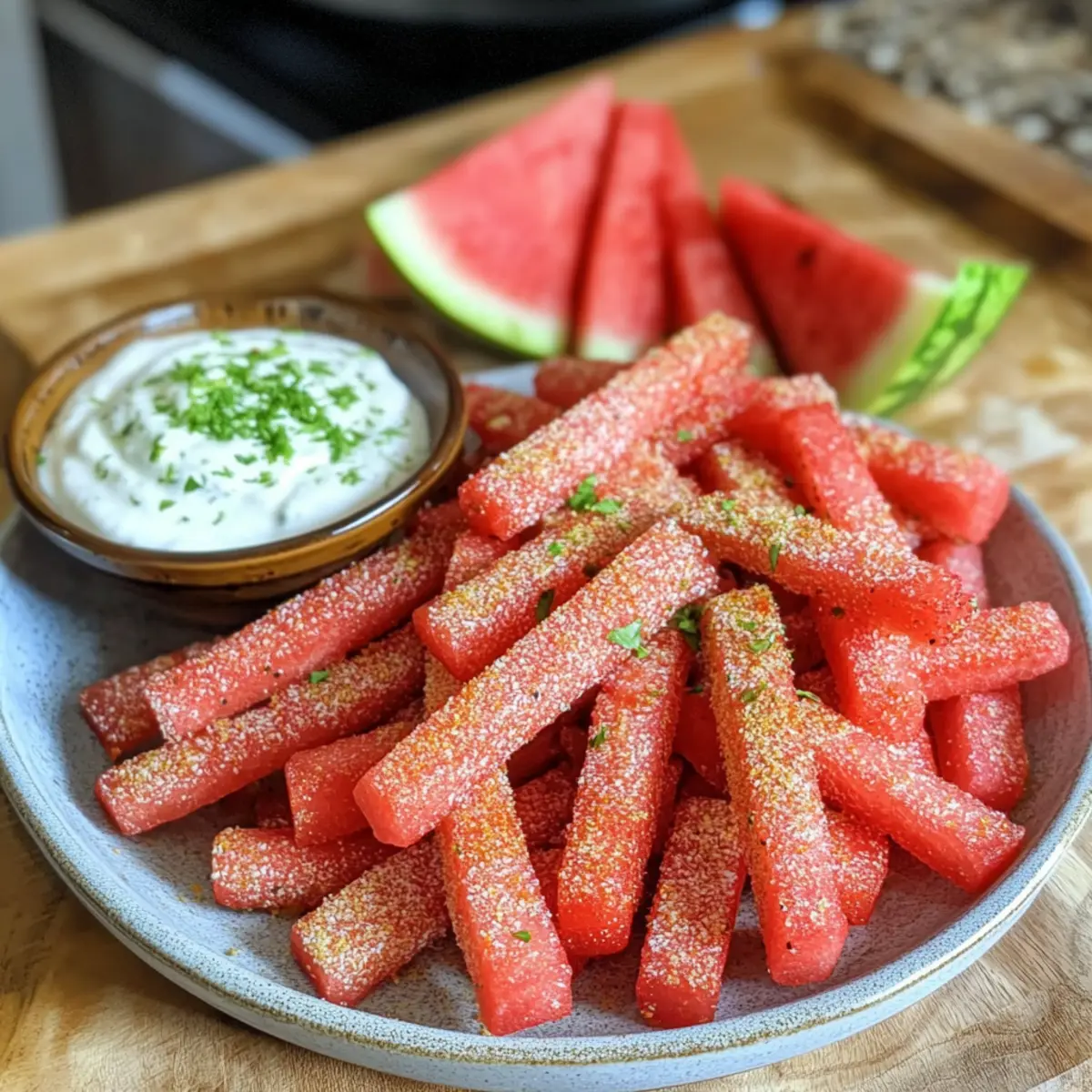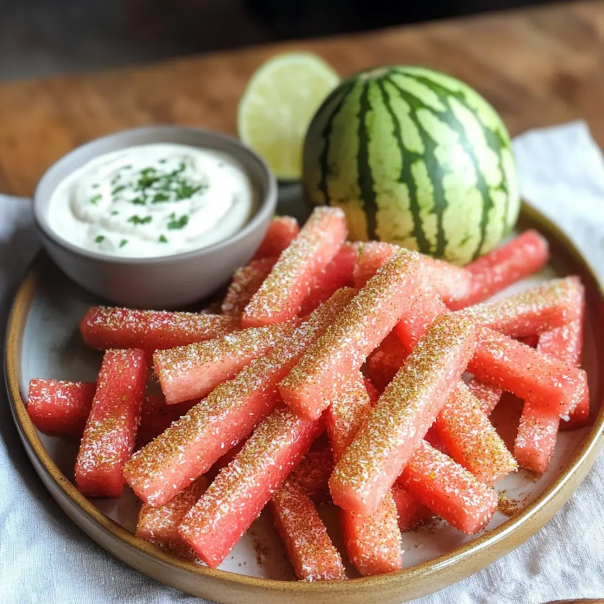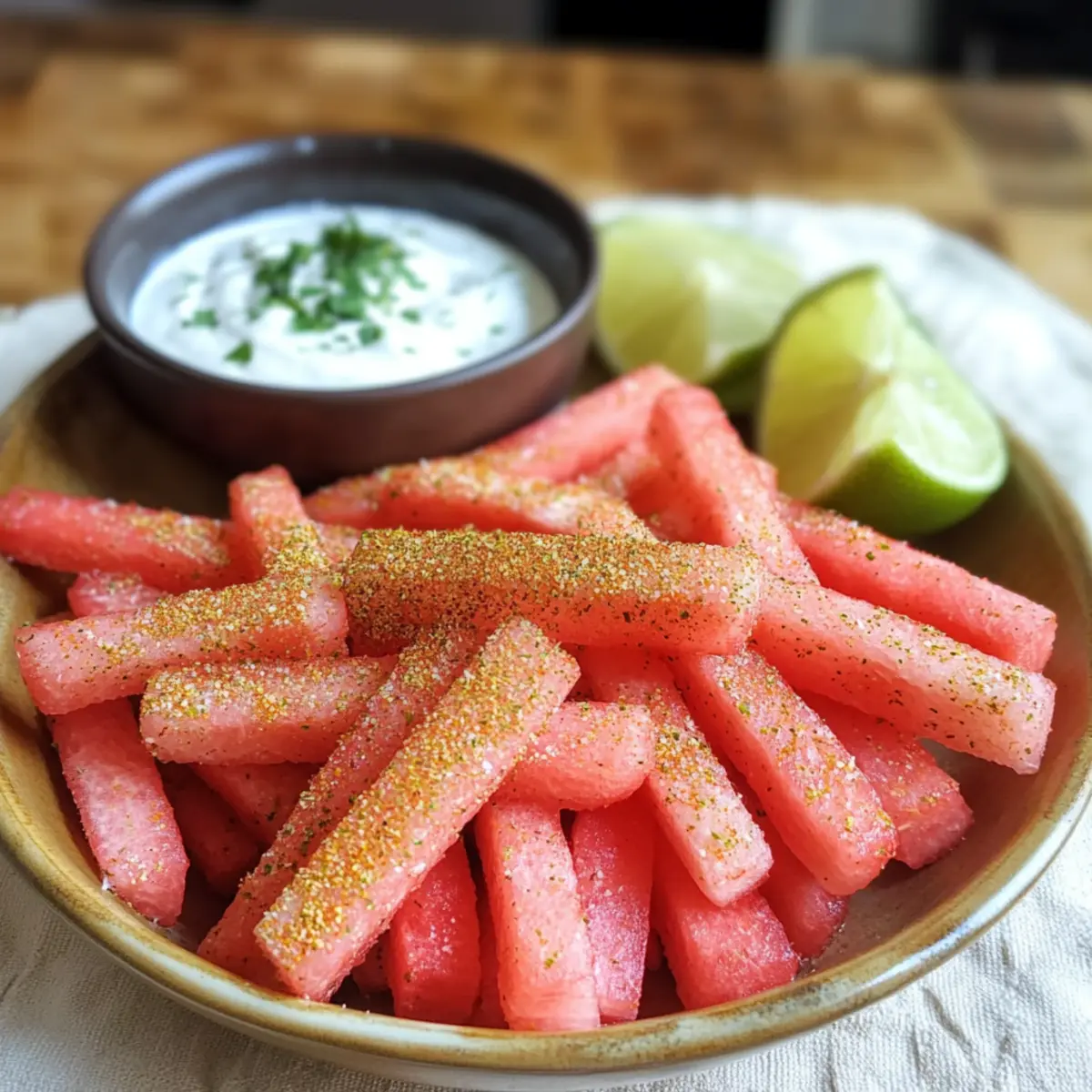 Wenn die Sonne strahlt und die Temperaturen steigen, ist es an der Zeit, frische und knusprige Snacks zu genießen. Scharfe Wassermelonen-Pommes mit einem cremigen Kokos-Limetten-Dip sind genau das, was du brauchst, um dich an heißen Tagen zu erfrischen. Dieses vegane und glutenfreie Rezept benötigt kaum Zeit in der Küche und sorgt dafür, dass du dich gesund und glücklich fühlst. Die Kombination aus süßer Wassermelone und dem würzigen Zauber des Tajin verspricht nicht nur einen Genuss für die Augen, sondern auch für den Gaumen. Wer könnte da widerstehen? Vielleicht sind diese bunten Pommes deine neue Lieblingsbeschäftigung beim nächsten Grillen oder Picknick? Lass uns gemeinsam in die Zubereitung eintauchen! Warum sind Wassermelonen-Pommes so besonders? Erfrischend: Diese Scharfen Wassermelonen-Pommes bieten eine unerwartete und fruchtige Auflage für deine Snack-Zeit im Sommer. Die Kombination aus frischer Wassermelone und dem würzigen Tajin sorgt für einen erfrischenden Geschmack, der deinen Gaumen begeistert. Schnelle Zubereitung: In nur wenigen Minuten bist du bereit, diese köstlichen Pommes zu servieren. Perfekt für spontane Snacks oder als gesunde Beilage für dein nächstes BBQ! Vegan und glutenfrei: Genieße diese leckere Nascherei ganz ohne Gewissensbisse. Der Kokos-Limetten-Dip rundet das Geschmackserlebnis ab und hält das Rezept gesund und leicht. Vielseitig: Diese Pommes sind nicht nur ein Hit für dich, sondern auch ein geselliger Snack, der bei deinen Gästen gut ankommt. Sie sind eine tolle Ergänzung zu anderen Sommergerichten, wie dem Cremigen Haehnchen Reis. Farbenfroh: Ansprechend und bunt angerichtet sind diese Pommes ein wahrer Blickfang auf jedem Tisch und bei jedem Picknick. Die Kombination von Farben und Texturen macht sie einfach unwiderstehlich! Scharfe Wassermelonen-Pommes Zutaten • Diese köstlichen Scharfen Wassermelonen-Pommes sind einfach zuzubereiten und perfekt für einen gesunden Snack! Für die Pommes Wassermelone – Der Hauptbestandteil, der natürliche Süße und Erfrischung bietet; achte darauf, die Schale zu entfernen und in Pommesform zu schneiden. Tajin Classic Seasoning – Verleiht den Pommes eine pikante und würzige Note; toll als ein Spritzer auf der Wassermelone, um den Geschmack hervorzuheben, oder ersetze es durch eine Mischung aus Salz, Chili-Pulver und Limettenzesten. Für den Dip Kokos-Joghurt – Dient als cremige Basis für den Dip, bleibt dabei milchfrei; du kannst auch normalen Kokosjoghurt verwenden. Limette – Bringt frischen Geschmack und Säure in den Dip; frischer Limettensaft sorgt für das beste Ergebnis. Kokoszucker – Fügt dem Dip Süße hinzu; benutze ihn nach Bedarf, besonders wenn die Wassermelone schon süß genug ist, um den perfekten Geschmack zu erreichen. Schritt-für-Schritt-Anleitung für Scharfe Wassermelonen-Pommes mit Kokos-Limetten-Dip Step 1: Dip vorbereiten In einer mittelgroßen Schüssel den Kokos-Joghurt, den Limettensaft, die Limettenzesten und den Kokoszucker gut vermengen, bis eine cremige Konsistenz entsteht. Die Mischung sollte gut kombiniert sein und eine glatte Textur haben. Decke die Schüssel ab und stelle den Dip für mindestens 15 Minuten in den Kühlschrank, damit die Aromen gut durchziehen können. Step 2: Wassermelone schneiden Nehme eine reife Wassermelone und schneide sie zuerst in zwei Hälften. Entferne die Schale und schneide das Fruchtfleisch in pommesartige Stäbchen. Die Pommes sollten etwa 1 cm dick sein, damit sie stabil bleiben und eine knackige Textur erhalten. Arrangiere die geschnittenen Pommes auf einem großen Servierteller. Step 3: Pommes würzen Streue großzügig Tajin Classic Seasoning über die frisch geschnittenen Wassermelonen-Pommes. Achte darauf, dass alle Seiten gut gewürzt sind, um den scharfen Geschmack gleichmäßig zu verteilen. Du kannst mehr oder weniger Tajin verwenden, je nach deinem persönlichen Geschmack. Die Pommes sollten jetzt eine schöne, würzige Schicht haben. Step 4: Anrichten und servieren Serviere die Scharfen Wassermelonen-Pommes zusammen mit dem vorbereiteten Kokos-Limetten-Dip. Stelle den Dip in die Mitte des Tellers oder in eine kleine Schale daneben. Die Kombination aus süßer Wassermelone und dem scharfen Dip macht das Gericht besonders ansprechend. Diese erfrischenden Snacks sind ideal für jede Gelegenheit! Variationen & Alternativen Verwandle die Scharfen Wassermelonen-Pommes mit deiner eigenen kreativen Note! Lass dich von diesen abwechslungsreichen Ideen inspirieren, um das Rezept ganz nach deinem Geschmack zu gestalten. Scharf: Verwende scharfen Chili-Pulver statt Tajin für eine extra feurige Note! Experimentiere mit unterschiedlichen Schärfegraden, um herauszufinden, wie heiß du es magst. Fruchtig: Kombiniere die Wassermelonen-Pommes mit Ananas- oder Mango-Streifen für einen tropischen Twist. Das sorgt für zusätzliche Süße und Farbe auf deinem Tisch. Avocado-Toast: Wenn du nach einer herzhafteren Option suchst, serviere zu den Pommes einen einfachen Avocado Toast Radieschen. Das cremige Avocado-Püree verstärkt das Geschmackserlebnis und nährt dich gut! Joghurt-Variante: Ersetze den Kokos-Joghurt durch ein aromatisiertes pflanzliches Joghurt, um dem Dip eine neue Geschmacksrichtung zu geben. Kiwi oder Beeren-Joghurt bringen eine interessante Frische! Nussig: Füge gehackte Nüsse, wie Mandeln oder Pistazien, zum Dip hinzu. Das sorgt für einen knusprigen Biss und erhöht den Nährwert erheblich. Zügeln Süße: Du kannst den Kokoszucker ganz weglassen, wenn die Wassermelone bereits super süß ist. Dies vermindert die Kalorienzufuhr und verleiht dem Dip einen fruchtigen Charakter. Käse-Zusatz: Für einen herzhaften Kick sprinkle etwas Feta oder geriebenen Parmesan über die Pommes vor dem Servieren. Die Kombination von süßer Wassermelone und salzigem Käse ist einfach köstlich! Egal, für welche Varianten du dich entscheidest, das wichtigste ist, dass du Spaß beim Ausprobieren hast! Experten