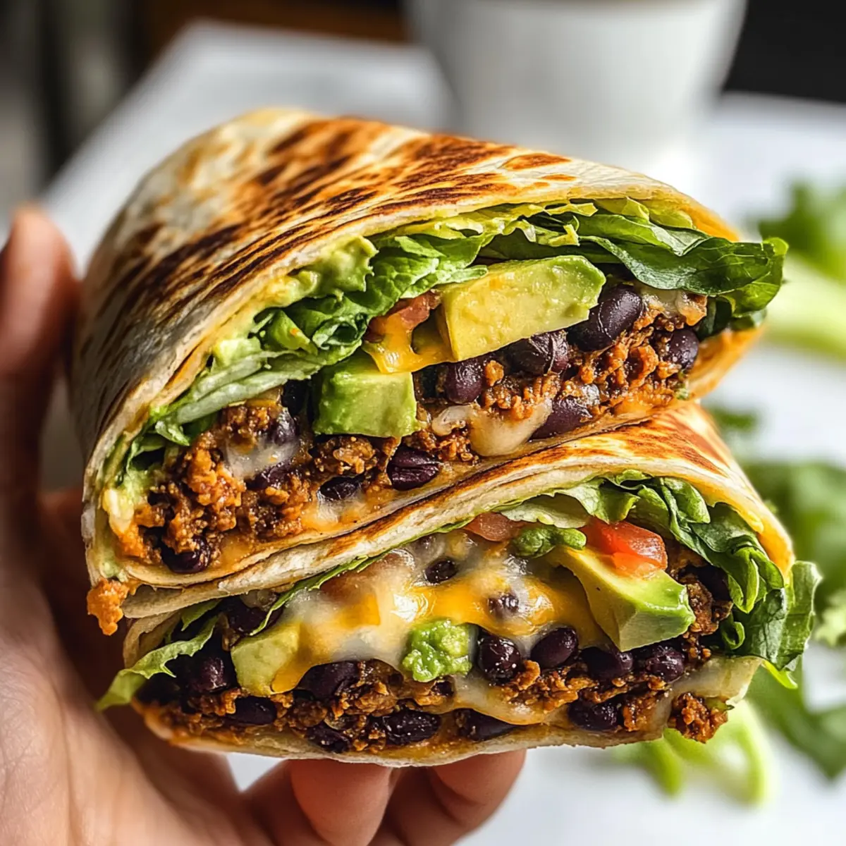 Einer der besten Wege, um den Feierabend zu zelebrieren, ist ein schnelles, selbstgemachtes Essen, das zugleich gesund und köstlich ist. Mein Rezept für den Schwarze Bohnen Crunch Wrap bringt all das und noch mehr auf den Tisch – in nur 20 Minuten! Dieser Wrap kombiniert proteinreiche schwarze Bohnen mit knackigem Gemüse und ist somit nicht nur budgetfreundlich, sondern auch extrem anpassbar für jeden Geschmack. Egal, ob du ein schnelles Abendessen nach einem langen Tag suchst oder einen geselligen Abend mit Freunden planst, dieser Crunch Wrap ist die perfekte Lösung. Würdest du lieber eine würzige Note hinzufügen oder ihn klassisch halten? Lass uns loslegen! Warum ist dieser Wrap so besonders? Einfache Zubereitung: Die Schritte sind schnell und unkompliziert, ideal für Kochanfänger und beschäftigt. Köstliche Variationen: Dieser Wrap lässt sich nach deinem Geschmack anpassen – probiere es mit verschiedenen Bohnen oder Gemüse! Nährstoffreich: Vollgepackt mit Ballaststoffen und Proteinen, ist er eine gesunde Wahl für jede Tageszeit. Perfekt für Geselligkeit: Egal, ob beim Abendessen oder beim Filmabend, die Crunch Wraps werden deine Gäste begeistern! Budgetfreundlich: Mit einfachen Zutaten hält sich dein Geldbeutel glücklich, während du leckere Mahlzeiten genießt. Zauberhafte Texturen: Die Kombination aus knusprig und cremig sorgt für ein unwiderstehliches Esserlebnis – perfekt für jeden, der eine Abwechslung von Fast Food sucht. Probier auch meinen Proteinriegel Schokoladen Erdnussbutter für einen süßen Snack auf der Seite! Schwarze Bohnen Crunch Wrap Zutaten • Dieser Wrap ist nicht nur lecker, sondern auch anpassbar und gesund! Für die Wraps Große Tortilla (Burrito-Größe) – Die perfekte Basis für deinen Crunch Wrap; auch in Vollkorn oder glutenfreier Variante erhältlich. Canned schwarze Bohnen – Eine großartige Quelle für Protein und Ballaststoffe; gründlich abspülen und abtropfen lassen, bevor du sie verwendest. Für die Füllung Olivenöl – Ideal zum Anbraten von Zwiebeln und verleiht einen reichen Geschmack. Zwiebel – Für Süße und Tiefe, alternativ können auch Schalotten verwendet werden. Knoblauchpulver – Intensiviert den Geschmack; frischer Knoblauch kann für mehr Aroma genutzt werden. Chilipulver – Fügt Würze hinzu; nach Geschmack anpassen oder durch Kreuzkümmel ersetzen. Paprika – Bringt Farbe und milden Geschmack; probiere geräucherte Paprika für eine rauchige Note. Kreuzkümmel – Für einen warmen, erdigen Geschmack; kann reduziert oder weggelassen werden. Salz – Hebt die Aromen hervor; nach Bedarf anpassen. Für frische Zutaten Tomaten (gewürfelt) – Sorgt für frische und Feuchtigkeit; auch in der Dosenversion erhältlich. Jalapeños – Bringt Schärfe; simpelt weglassen oder durch Paprika ersetzen. Scharfe Sauce – Optional, für zusätzlichen Schwung; nach individuellem Geschmack dosieren. Zerkleinerter Käse – Für Cremigkeit; als pflanzliche Alternative kann veganer Käse verwendet werden. Sauerrahm – Fügt Reichtum hinzu; griechischer Joghurt ist eine gesündere Option. Zerkleinerter Römersalat – Sorgt für Knusprigkeit; kann auch durch Spinat ersetzt werden. Avocado (optional) – Bringt zusätzliche Cremigkeit, kann aber bei fettärmerer Zubereitung weggelassen werden. Tostada – Für zusätzlichen Crunch; auch gebackene Chips sind eine leichtere Option. Genieße deinen Schwarze Bohnen Crunch Wrap und passe ihn nach Belieben an! Schritt-für-Schritt-Anleitung für Schwarze Bohnen Crunch Wrap Schritt 1: Zwiebeln anbraten Erhitze in einer großen Pfanne bei mittlerer Hitze etwas Olivenöl. Gib die gewürfelten Zwiebeln hinzu und brate sie etwa 3 Minuten lang, bis sie glasig und leicht goldbraun sind. Dies verleiht deinem Schwarze Bohnen Crunch Wrap eine süßliche Note und bereitet die Grundlage für den vollen Geschmack. Schritt 2: Gewürze und Bohnen hinzufügen Streue Knoblauchpulver, Chilipulver, Paprika, Kreuzkümmel und Salz über die Zwiebeln. Rühre gut um und füge dann die gewürfelten Tomaten, schwarzen Bohnen und Jalapeños hinzu. Lass alles bei schwacher Hitze für 3-4 Minuten köcheln, bis sich die Aromen vermischen und die Mischung leicht eingedickt ist. Schritt 3: Wraps zusammenstellen Nimm eine große Tortilla und füge eine großzügige Portion der Bohnenmischung in die Mitte hinzu. Schichte darauf zerkleinerten Käse, einen Löffel Sauerrahm, Römersalat und optional Avocado. Um eine knusprige Textur zu erzielen, lege eine Tostada ganz oben auf die Füllung. Schritt 4: Wraps falten Falte die Seiten der Tortilla über die Füllung, um die Mischung vollständig einzuschließen. Lege dann eine kleinere Tortilla oben drauf, um deinen Schwarze Bohnen Crunch Wrap zusammenzuhalten. Stelle sicher, dass alles gut verpackt ist, damit beim Braten nichts herausfällt. Schritt 5: Wraps braten Erhitze eine saubere Pfanne auf mittlerer Hitze und sprühe sie leicht mit Olivenöl ein. Lege den gefalteten Wrap mit der Falte nach unten in die Pfanne und brate ihn 2-3 Minuten lang, bis die Unterseite goldbraun und knusprig ist. Dies sorgt dafür, dass dein Wrap eine köstliche Textur erhält. Schritt 6: Wrap drehen Sorgfältig den Wrap umdrehen und die andere Seite für weitere 2-3 Minuten braten, bis auch diese goldbraun ist. Achte darauf, dass beide Seiten schön knusprig sind. Der Schwarze Bohnen Crunch Wrap ist jetzt bereit, serviert zu werden! Schritt 7: Servieren Nimm die Wraps aus der Pfanne und schneide sie vorsichtig in der Mitte durch. Serviere deine leckeren Crunch Wraps heiß, optional garniert mit Salsa oder frischem Koriander für zusätzliche Frische und Geschmack. Vorbereitungen für den perfekten Schwarzen Bohnen Crunch Wrap Die Vorbereitung des Schwarzen Bohnen Crunch Wraps ist ein Kinderspiel und ideal für vielbeschäftigte Kochbegeisterte! Du kannst die Füllung – bestehend aus Zwiebeln, gewürfelten Tomaten, schwarzen Bohnen und Gewürzen – bis zu 3 Tage im Voraus