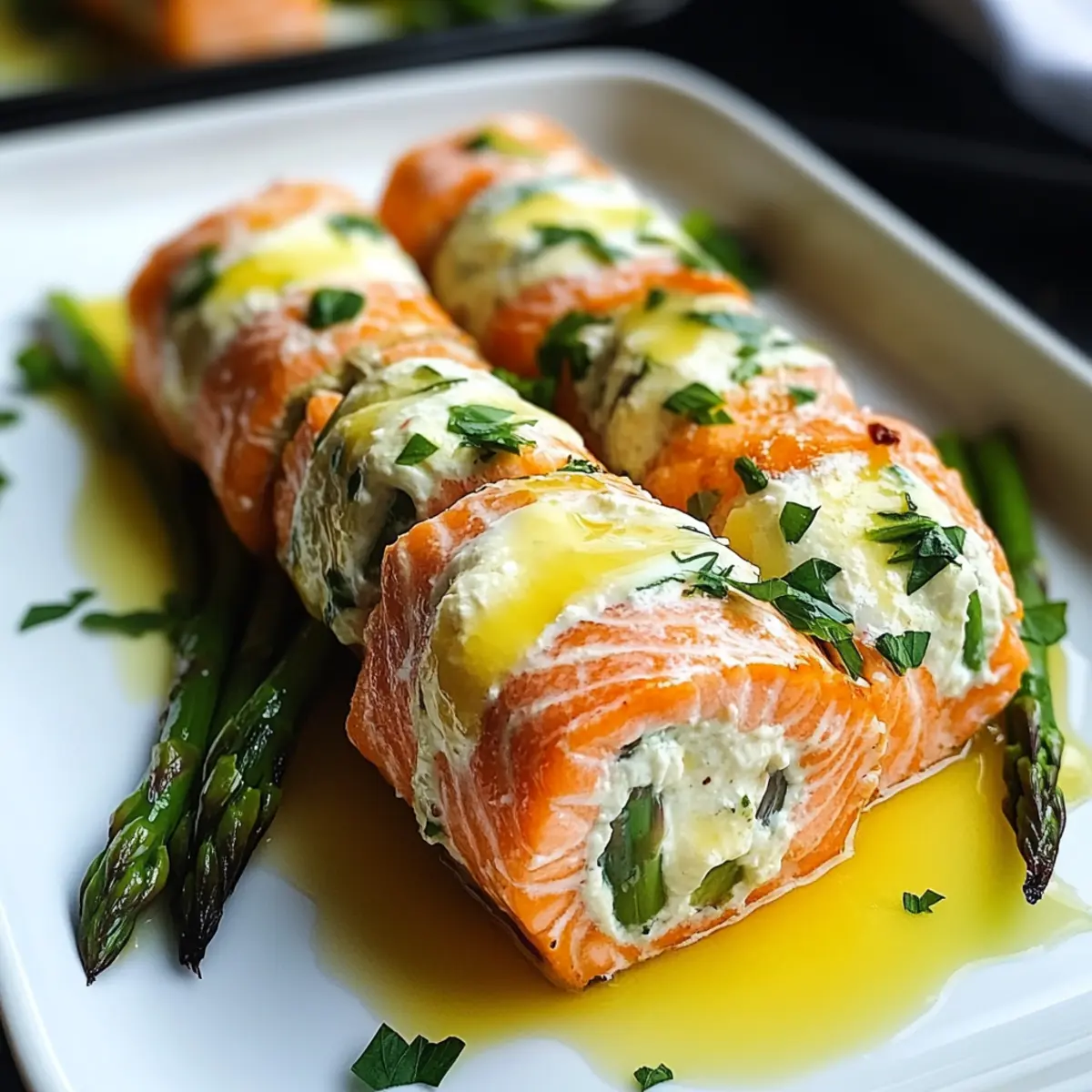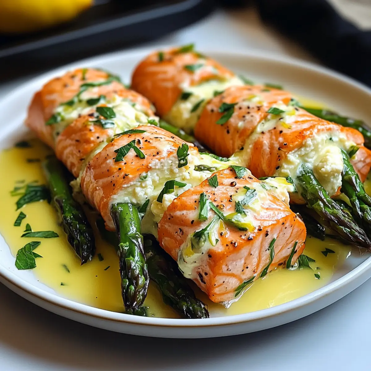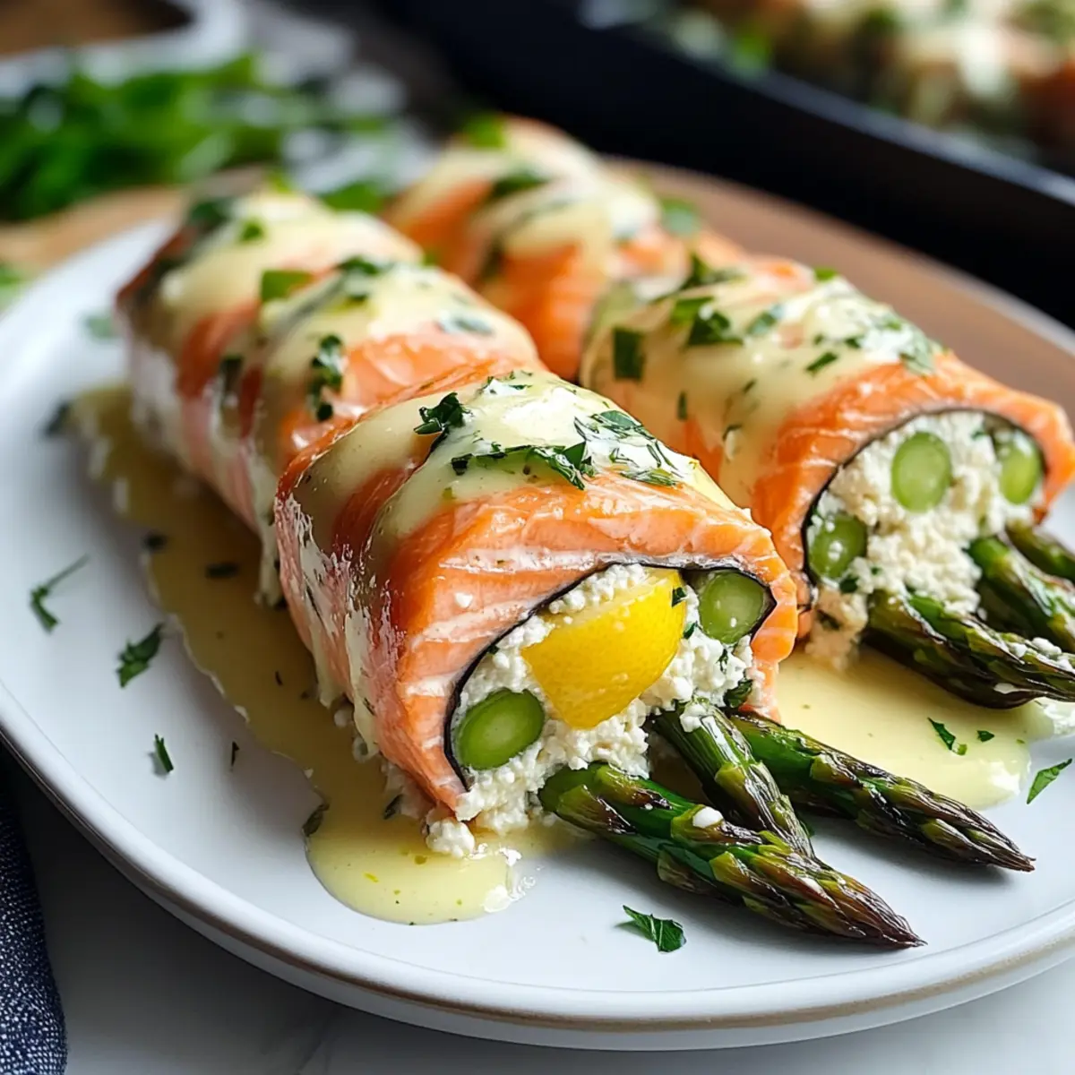 Es gibt Küchenmomente, die einen direkt ins Herz treffen. Heute präsentiere ich euch meine Spargel und Zitronen-Basilikum-Ricotta gefüllte Lachs-Rollen mit Zitronensauce – ein wahres Fest für die Sinne! Diese herzhafte Köstlichkeit vereint zarten, saftigen Lachs mit einer cremigen Füllung aus frisch zubereiteter Ricotta, während knackiger Spargel für den perfekten Biss sorgt. Ideal für besondere Anlässe oder einfach, um euch selbst zu verwöhnen, ist dieses Rezept nicht nur ein wahrer Hingucker, sondern bietet auch die Vorteile einer schnellen Zubereitung und einer gesunden Portion Omega-3-Fettsäuren. Lasst uns gemeinsam die Kunst der Feinkostküche entdecken – seid ihr bereit, euren Liebsten etwas Außergewöhnliches zu servieren? Warum werden diese Lachs-Rollen geliebt? Aromen, die begeistern: Die Kombination aus zartem Lachs, cremigen Ricotta und frischem Spargel sorgt für ein Geschmackserlebnis der Extraklasse. Einfache Zubereitung: Mit nur wenigen Zutaten und einem klaren Rezept gelingt euch dieses Gourmetgericht spielend. Gesunde Wahl: Reich an Omega-3-Fettsäuren, ist dieses Gericht nicht nur lecker, sondern auch nährstoffreich. Vielseitig kombinierbar: Serviert die Lachs-Rollen mit einem knackigen Salat oder Quinoa für eine vollwertige Mahlzeit. Beeindruckendes Erlebnis: Ob für ein Festessen oder ein romantisches Dinner, diese Lachs-Rollen werden garantiert zum Highlight – ideal, um eure Gäste zu überraschen! Spargel und Zitronen-Basilikum-Ricotta Zutaten Für die Füllung Ricotta Käse – bildet die Basis der Füllung und sorgt für Cremigkeit. Frisches Basilikum – verleiht der Füllung aromatische, kräuterige Noten. Zitronenabrieb und Saft – bringt eine erfrischende Zitrusnote und hebt die Aromen hervor. Knoblauchpulver – fügt eine herzhafte Tiefe hinzu, ohne andere Geschmäcker zu überlagern. Zwiebelpulver – sorgt für zusätzliche würzige Komplexität; optional. Salz und Pfeffer – unerlässlich zum Balancieren der Aromen; verwende Meersalz für extra Geschmack. Für die Lachs-Rollen Lachsfilets – die Hauptproteinquelle, reich an Omega-3-Fettsäuren; kann durch Forelle oder Kabeljau ersetzt werden. Spargel – bringt eine knackige Frische, die wunderbar zur cremigen Füllung passt; blanchiere ihn für eine lebendige Farbe. Olivenöl – zum Anbraten der Lachs-Rollen, sorgt für eine köstliche Kruste. Für die Zitronensauce Schlagsahne – verleiht der Sauce Reichhaltigkeit; halbiere es für eine leichtere Version. Hühnerbrühe – fügt Tiefe und milde Aromen hinzu; Gemüsebrühe für eine vegetarische Option verwenden. Dijon-Senf – bringt eine subtile Würze in die Sauce; achte darauf, glutenfreien Senf zu verwenden, falls nötig. Butter – sorgt für einen glänzenden Abschluss der Sauce; vegane Butter für eine milchfreie Variante verwenden. Zum Garnieren Gehackte Petersilie – verleiht eine frische Farbe und einen leicht pfeffrigen Geschmack; Chives können als milde Alternative verwendet werden. Diese Spargel und Zitronen-Basilikum-Ricotta gefüllte Lachs-Rollen mit Zitronensauce sind nicht nur ein echter Genuss für den Gaumen, sondern auch einfach zuzubereiten! Schritt-für-Schritt-Anleitung für Spargel und Zitronen-Basilikum-Ricotta gefüllte Lachs-Rollen mit Zitronensauce Step 1: Ofen vorheizen Heize deinen Ofen auf 375°F (190°C) vor, um sicherzustellen, dass die Spargel und Zitronen-Basilikum-Ricotta gefüllten Lachs-Rollen gleichmäßig gebacken werden. Bereite ein Backblech vor, indem du es mit Backpapier auslegst oder leicht einfettest, um ein Ankleben zu verhindern. Während der Ofen Aufheizt, kannst du mit der Füllung beginnen. Step 2: Füllung zubereiten In einer großen Schüssel mische den Ricotta-Käse, frisches Basilikum, Zitronenabrieb, Zitronensaft, Knoblauchpulver, Zwiebelpulver, Salz und Pfeffer. Rühre alles gut um, bis die Mischung cremig und homogen ist. Diese Füllung wird die Basis der Spargel und Zitronen-Basilikum-Ricotta gefüllten Lachs-Rollen, also achte darauf, dass sie gut vermischt ist. Step 3: Spargel blanchieren Bring einen kleinen Topf mit Wasser zum Kochen und blanchiere die Spargelstangen 1-2 Minuten lang. Achte darauf, dass sie hellgrün und zart, aber noch knackig sind. Daraufhin gib die Spargel in eine Schüssel mit Eiswasser, um den Kochprozess zu stoppen, und lasse sie für einige Minuten abkühlen, bevor du sie trocknest. Step 4: Lachs vorbereiten Nimm die Lachsfilets und tupfe sie mit einem Papierhandtuch trocken. Würze beide Seiten der Filets großzügig mit Salz und Pfeffer. Diese Würze wird den Geschmack der Spargel und Zitronen-Basilikum-Ricotta gefüllten Lachs-Rollen hervorragend ergänzen, also achte darauf, dies gleichmäßig zu machen. Step 5: Rollen formen Lege eines der Lachsfilets auf ein Brett und verteile eine großzügige Menge der Ricotta-Füllung darauf. Platziere 2-3 blanchierte Spargelstangen in der Mitte des Filets und rolle es vorsichtig, aber fest auf. Verwende Zahnstochern, um die Rolle zu sichern. Wiederhole diesen Vorgang mit den restlichen Lachsfilets, um insgesamt 4-6 Lachs-Rollen zu formen. Step 6: Lachs anbraten Erhitze in einer großen, ofenfesten Pfanne einen Esslöffel Olivenöl bei mittlerer Hitze. Lege die Lachs-Rollen mit der Naht nach unten in die Pfanne und brate sie 2-3 Minuten lang an, bis sie goldbraun sind. Drehe die Rollen vorsichtig um und brate die andere Seite ebenfalls an, um eine schöne Kruste zu erhalten, bevor du sie in den Ofen schiebst. Step 7: Lachs backen Übertrage die Pfanne mit den angebratenen Lachs-Rollen in den vorgeheizten Ofen und backe sie für 10-12 Minuten. Achte darauf, dass der Lachs gar ist und sich mit einer Gabel leicht flaken lässt, bevor du ihn herausnimmst. Diese Backzeit sorgt dafür, dass die Spargel und Zitronen-Basilikum-Ricotta gefüllten Lachs-Rollen perfekt zart sind. Step 8: Zitronensauce zubereiten In einem kleinen Topf bei mittlerer Hitze kombinierst du Schlagsahne, Hühnerbrühe, Butter, Dijon-