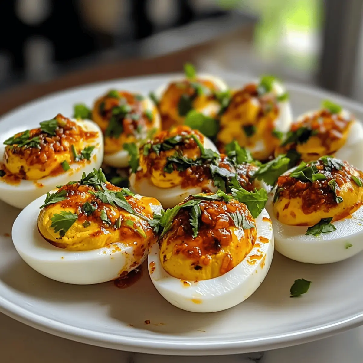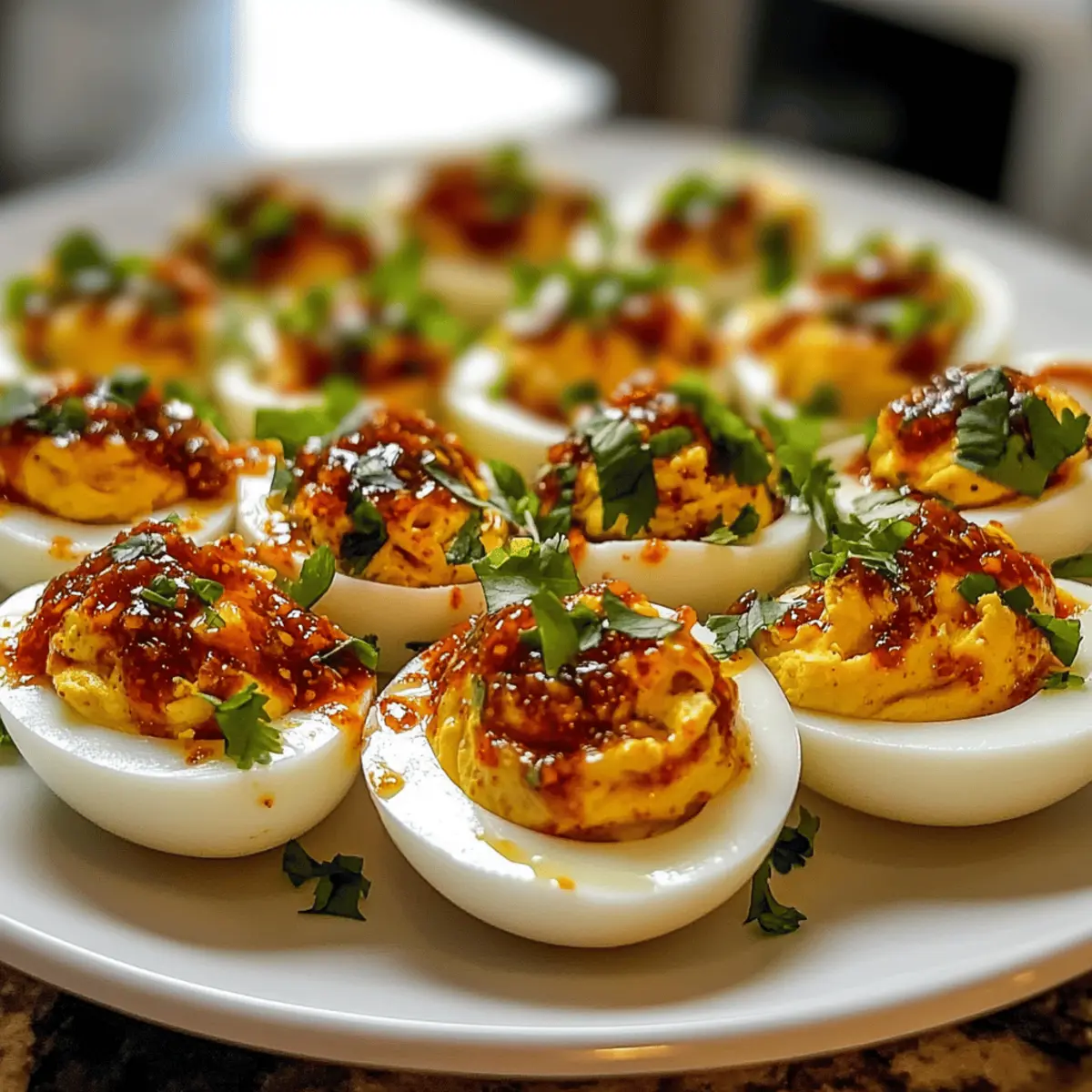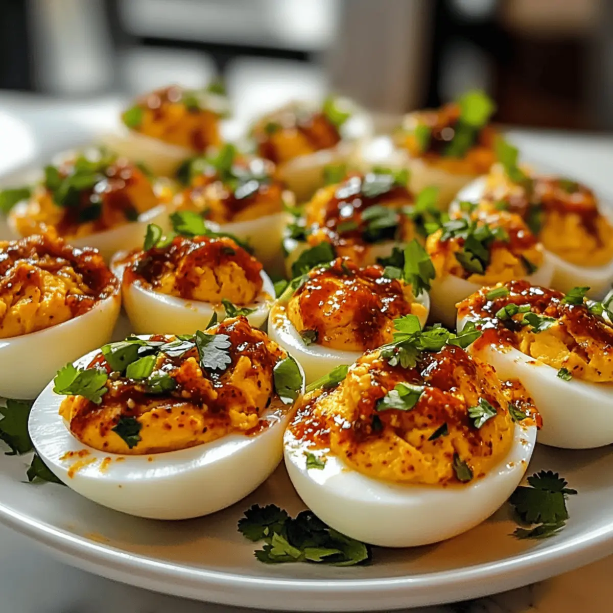 Als ich neulich bei einem Freund zu Besuch war, setzte ich mich in die Küche und blickte auf einen wunderschönen Teller mit Spicy Chili Garlic Deviled Eggs. Diese kleinen Köstlichkeiten waren nicht nur ein Fest für die Augen, sondern versprachen auch einen aufregenden Geschmack. Mit ihrer perfekten Mischung aus Schärfe und Cremigkeit wurden sie zum Star des Abends – und ich konnte einfach nicht widerstehen, ein Rezept für diese leckeren Häppchen zu teilen. In nur 25 Minuten sind diese deviled eggs nicht nur schnell zubereitet, sondern auch eine wunderbare Möglichkeit, um Gäste zu beeindrucken, ohne stundenlang am Herd zu stehen. Und das Beste? Sie sind glutenfrei und passen wunderbar in eine low-carb Ernährung! Wer kann da schon widerstehen? Welche kreativen Variationen würdest du ausprobieren? Warum sind diese Eier so besonders? Einzigartiger Geschmack: Diese Spicy Chili Garlic Deviled Eggs vereinen Schärfe und Cremigkeit auf perfekte Weise. Jeder Bissen ist ein kleines Abenteuer für deinen Gaumen! Einfach zuzubereiten: In nur 25 Minuten hast du ein leichte und köstliche Appetizer, die selbst Kochanfängern gelingen. Vielfältige Variationen: Passe das Rezept an deinen Geschmack an: Ob mit Avocado statt Mayonnaise oder einem Extra-Pfeffer kick – die Möglichkeiten sind endlos. Eindrucksvoll: Diese Eier sind garantiert ein Hingucker auf jedem Buffet und werden deine Gäste begeistern! Gesunde Wahl: Low-carb und glutenfrei – perfekt für eine Vielzahl von Ernährungsweisen. Vielleicht möchtest du auch unser leckeres Kinder Bueno Dessert probieren – eine süße Ergänzung zu deiner Vorspeise! Spicy Chili Knoblauch Eier Zutaten Für die Füllung Große Eier – Die Basis für deine Spicy Chili Garlic Deviled Eggs, unverzichtbar für die Struktur. Mayonnaise – Für die Cremigkeit; du kannst sie durch Avocado oder griechischen Joghurt ersetzen, um eine gesündere Variante zu erhalten. Dijon-Senf – Für das geschmackliche Upgrade; verleihe den Eiern einen würzigen Kick, um den besten Geschmack zu erzielen. Chili-Knoblauch-Sauce – Die Schärfe; abhängig von deinem persönlichen Schärfegrad anpassen oder auch andere scharfe Soßen verwenden. Reisessig – Für die Säure, um die Aromen auszubalancieren; kann weggelassen werden, wenn du es wünscht. Salz & Pfeffer – Zum Würzen; nach Geschmack anpassen. Für das Topping Sriracha – Für zusätzlichen Kick und optische Anziehung; je nach Vorliebe dosieren. gehackter Koriander oder Frühlingszwiebeln – Für Frische; optional zur Verbesserung des Geschmacks und der Präsentation. Mit diesen Zutaten kannst du sicherstellen, dass deine Spicy Chili Garlic Deviled Eggs zum absoluten Hit werden! Schritt-für-Schritt-Anleitung für Spicy Chili Knoblauch Eier mit Wow-Effekt Schritt 1: Eier kochen Bring einen Topf mit kaltem Wasser zum Kochen und lege die großen Eier vorsichtig hinein. Decke den Topf ab und koche die Eier 12 Minuten lang bei niedriger Hitze, bis sie fest sind. Achte darauf, dass das Wasser kräftig blubbert, um eine gleichmäßige Garweise zu gewährleisten. Schritt 2: Eisbad vorbereiten Bereite während die Eier kochen ein Eisbad vor. Fülle eine große Schüssel mit kaltem Wasser und füge Eiswürfel hinzu. Nach 12 Minuten nimmst du die Eier vorsichtig aus dem Wasser und legst sie direkt ins Eisbad. Lass sie dort etwa 5 Minuten ziehen, damit sie schnell abkühlen. Schritt 3: Eier schälen Halte das gekühlte Ei unter kaltem, fließendem Wasser, während du die Schale vorsichtig abklopfst. Beginne am breiteren Ende, wo sich meist eine Luftblase befindet. Das Wasser hilft, die Schale leichter zu lösen, und sorgt dafür, dass deine Spicy Chili Knoblauch Eier eine schöne äußere Form behalten. Schritt 4: Eigelb herausnehmen Schneide die geschälten Eier längs in zwei Hälften. Mit einem Teelöffel nimmst du vorsichtig das Eigelb aus jeder Eiweißhälfte und gibst es in eine Rührschüssel. Achte darauf, das Eiweiß ganz zu lassen, damit deine Füllung später gut hineinpasst. Schritt 5: Füllung zubereiten Zerdrücke die Eigelbe in der Schüssel mit einer Gabel. Mische sie gründlich mit Mayonnaise, Dijon-Senf, Chili-Knoblauch-Sauce, Reisessig, Salz und Pfeffer. Rühre, bis eine cremige und perfekt gewürzte Mischung für deine Spicy Chili Knoblauch Eier entsteht. Schritt 6: Füllung einfüllen Fülle die vorbereitete Mischung großzügig zurück in die leeren Eiweiße. Du kannst dies mit einem Löffel machen oder die Mischung in einen Spritzbeutel füllen, um ein elegantes Aussehen zu erzielen. Achte darauf, dass du die Eier gleichmäßigportionierst, um eine ansprechende Präsentation zu gewährleisten. Schritt 7: Anrichten und garnieren Gib zum Schluss eine Prise Sriracha auf jede gefüllte Eihälfte für zusätzlichen Geschmack und Farbe. Garniere die Spicy Chili Knoblauch Eier mit frisch gehacktem Koriander oder Frühlingszwiebeln, um einen frischen Kontrast und einen schönen visuellen Effekt zu erzielen. Tipps für die besten Spicy Chili Knoblauch Eier Schärfe anpassen: Beginne mit weniger Chili-Knoblauch-Sauce und steigere den Anteil nach Geschmack, um den gewünschten Schärfegrad für deine Spicy Chili Knoblauch Eier zu erreichen. Eier richtig schälen: Halte die Eier unter kaltem, fließendem Wasser, um die Schale leichter zu lösen und die Form der Eiweiße zu erhalten. Kühlen nicht vergessen: Lasse die Eier nach dem Kochen vollständig abkühlen, um das Schälen zu erleichtern und eine schöne Präsentation sicherzustellen. Praktisches Topping: Verwende einen Spritzbeutel, um die Füllung präzise einzufüllen und ein ansprechenderes Aussehen zu erzielen. Vielfalt genießen: Experimentiere mit verschiedenen Zutaten wie Avocado oder griechischem Joghurt, um gesündere Alternativen für deine Spicy Chili Knoblauch Eier zu schaffen. Was passt zu Spicy Chili Knoblauch Eier? Genieße die perfekte Kombination aus leckeren täglich Gerichten und unwiderstehlichen Beilagen zu diesen feurigen H