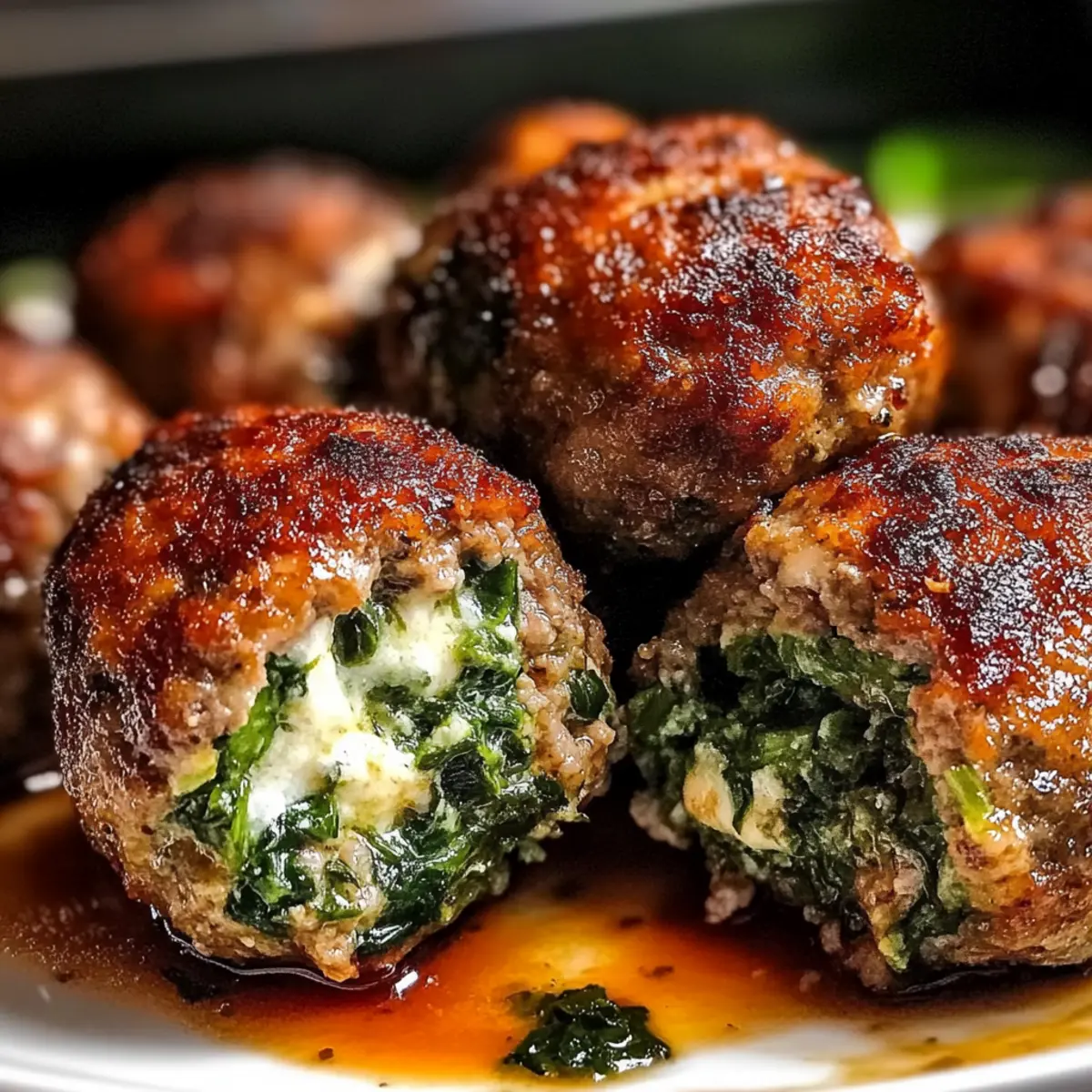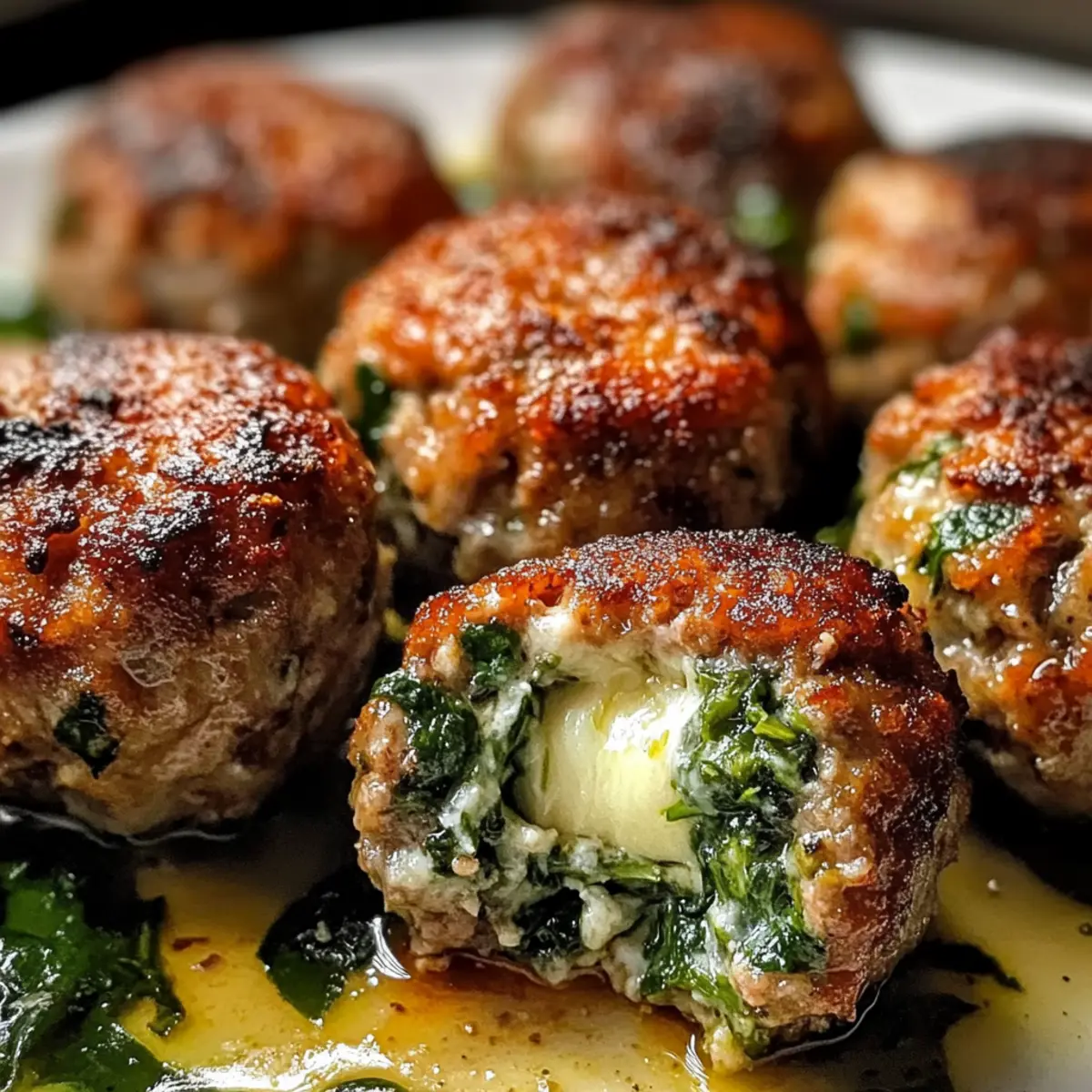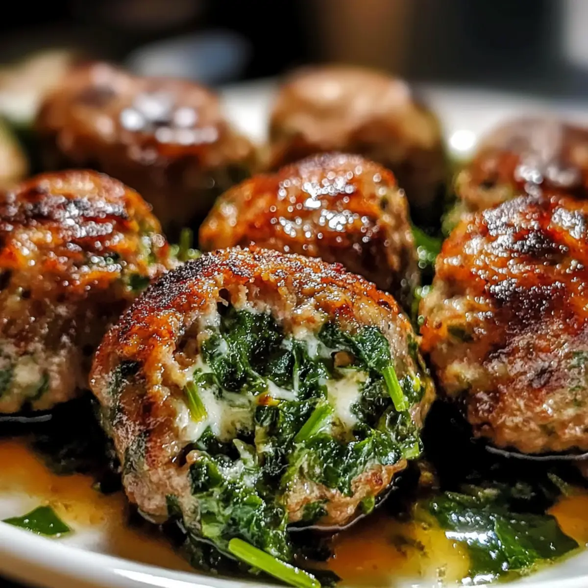 Der köstliche Duft von frisch gebackenem Brot und saftigen Fleischbällchen erfüllt die Küche – genau so begann meine Liebe zur italienischen Küche. Mit diesen Spinach Garlic Mozzarella Stuffed Meatballs zauberst du ein Comfort Food, das nicht nur deinen Gaumen erfreut, sondern auch deine Lieben um den Tisch versammelt. Sie sind nicht nur schnell und einfach zuzubereiten, sondern auch perfekt zum Vorbereiten für geschäftige Wochentage oder gesellige Abende. Die Kombination aus würzigem Knoblauch, frischem Spinat und schmelzendem Mozzarella in der Mitte lässt die Herzen aller Feinschmecker höher schlagen. Bist du bereit, das nächste Familienessen zu einem unvergesslichen Erlebnis zu machen? Warum wirst du dieses Rezept lieben? Einfache Zubereitung: Die Herstellung dieser köstlichen Fleischbällchen erfordert nur grundlegende Kochkenntnisse und ist somit für jeden erreichbar. Herzhafter Geschmack: Die Kombination aus aromatischem Knoblauch, frischem Spinat und schmelzendem Mozzarella sorgt für einen unvergesslichen Genuss, der garantiert alle begeistert. Vielfältige Variationen: Experimentiere mit verschiedenen Fleischsorten oder Käsevarianten, um das Gericht an deine Vorlieben anzupassen, sei es mit Frischkaese Spinat Haehnchen oder Parmesan Knoblauch Gemuesepommes. Perfekt für die Woche: Bereite sie im Voraus vor und genieße ein schnelles, herzhaftes Abendessen an geschäftigen Tagen. Beliebtes Gericht: Diese gefüllten Fleischbällchen sind ein echter Publikumsmagnet, ideal für gesellige Abende oder Familienessen! Zutaten für Spinach Garlic Mozzarella Stuffed Meatballs Für die Fleischbällchen: Gemahlenes Rindfleisch oder Pute – ist die Hauptproteinquelle. Du kannst fettfreies Geflügel für eine leichtere Variante verwenden. Frischer Spinat – bietet Nährstoffe und eine lebendige Farbe. Dämpfe ihn, um den Geschmack zu intensivieren; wähle frische, knackige Blätter. Knoblauch – verleiht aromatische Tiefe. Verwende gehackten Knoblauch für die besten Ergebnisse. Zwiebel (optional) – bringt Süße und Feuchtigkeit. Fein hacken, falls verwendet. Ei – dient als Bindemittel für die Fleischmasse. Ein großes Ei ist ausreichend. Semmelbrösel – sorgt für Struktur und Textur. Du kannst Haferflocken oder Mandelmehl für glutenfreie Varianten verwenden. Geriebener Parmesan – bringt einen herzhaften Geschmack. Verwende qualitativ hochwertigen Käse für mehr Tiefe. Mozzarella-Würfel (niedrige Feuchtigkeit) – das schmelzende Zentrum der Bällchen; am besten kühl lagern, um Leckagen beim Kochen zu vermeiden. Italienische Gewürze – bietet ein klassisches italienisches Geschmacksprofil. Nach Geschmack anpassen. Salz & Pfeffer – essentielle Gewürze zur Verbesserung aller Aromen. Rote Pfefferflocken (optional) – fügt Wärme und Würze hinzu. Nach Vorliebe anpassen. Gehackte Petersilie (optional) – frische Garnierung für das Finish; bringt Farbe und Frische. Genieße dieses Rezept und lass dich von den köstlichen Aromen verzaubern! Schritt-für-Schritt-Anleitung für Spinach Garlic Mozzarella Stuffed Meatballs Step 1: Spinat und Knoblauch anbraten Erhitze eine Pfanne bei mittlerer Hitze und füge etwas Olivenöl hinzu. Gib den frischen Spinat und den gehackten Knoblauch hinein und brate sie etwa 3-4 Minuten an, bis der Spinat zusammengefallen ist. Nimm die Pfanne vom Herd und lasse die Mischung kurz abkühlen, bevor du sie fein hackst. Step 2: Fleischmasse vorbereiten In einer großen Schüssel kombiniere das gemahlene Fleisch, das Ei, die Semmelbrösel, den geriebenen Parmesan, die italienischen Gewürze, den gehackten Spinat sowie Salz und Pfeffer. Mische die Zutaten sanft, bis alles gut verbunden ist, aber achte darauf, die Masse nicht zu überarbeiten, damit die Fleischbällchen zart bleiben. Step 3: Fleischbällchen formen Nehme eine Portion der Fleischmischung und forme sie um einen kalten Mozzarella-Würfel, sodass dieser vollständig umhüllt ist. Achte darauf, dass die Bällchen gut verschlossen sind, um ein Auslaufen des Käses beim Kochen zu verhindern. Wiederhole diesen Schritt, bis alle Zutaten verarbeitet sind. Step 4: Fleischbällchen kochen Wähle eine der beiden Kochmethoden: Heize deinen Ofen auf 200°C vor und lege die Bällchen auf ein Backblech. Backe sie 20-25 Minuten lang, bis sie goldbraun sind. Alternativ kannst du sie in einer Pfanne mit etwas Öl bei mittlerer bis hoher Hitze 6-8 Minuten pro Seite anbraten, bis sie schön gebräunt sind. Step 5: (Optional) In Marinara-Sauce köcheln lassen Wenn du möchtest, kannst du die fertig gebratenen Fleischbällchen in einer warmen Marinara-Sauce 5-10 Minuten leicht köcheln lassen. Dies verleiht den Bällchen zusätzliches Aroma und sorgt für eine saftige Textur – ideal für eine italienische Note. Step 6: Ruhen lassen Lasse die Fleischbällchen nach dem Kochen 5 Minuten ruhen, bevor du sie servierst. Dadurch bleibt der Käse schön geschmolzen und das Fleisch saftig. Serviere die Spinach Garlic Mozzarella Stuffed Meatballs heiß, eventuell mit einer Beilage deiner Wahl. Lagerungstipps für Spinach Garlic Mozzarella Stuffed Meatballs Kühlschrank: Bewahre die gekochten Fleischbällchen in einem luftdichten Behälter im Kühlschrank auf, wo sie bis zu 3 Tage frisch bleiben. Gefrierschrank: Ungekochte Fleischbällchen können bis zu 2 Monate im Gefrierschrank gelagert werden. Friere sie zunächst auf einem Backblech ein, bevor du sie in einen Gefrierbeutel umfüllst. Aufwärmen: Die aufgetauten oder gekochten Fleischbällchen können leicht auf dem Herd oder in der Mikrowelle erwärmt werden. Achte darauf, sie gut durchzuerhitzen, um Geschmack und Saftigkeit beizubehalten. Vorbereiten: Du kannst die Fleischbällchen im Voraus zubereiten und einfrieren, was sie zu einer perfekten Option für schnelle Abendessen macht, wenn die Zeit knapp ist. Was passt zu Spinach Garlic Mozzarella Stuffed Meatballs? Der köstliche Duft und die herzhaften Geschmäcker dieser Fleischbällchen mache
