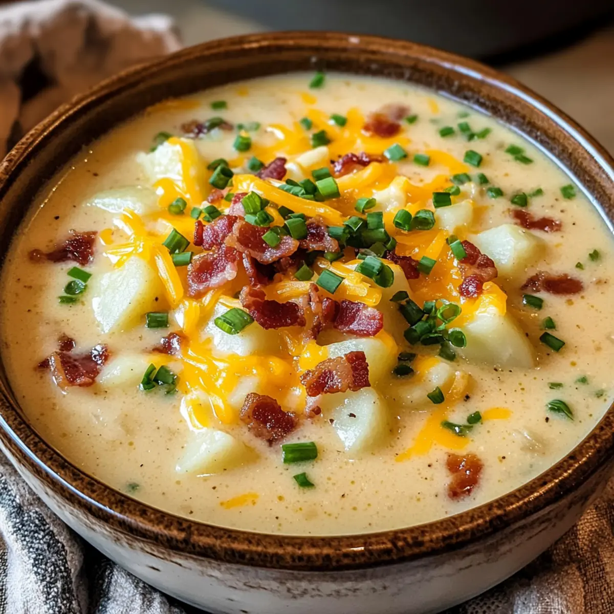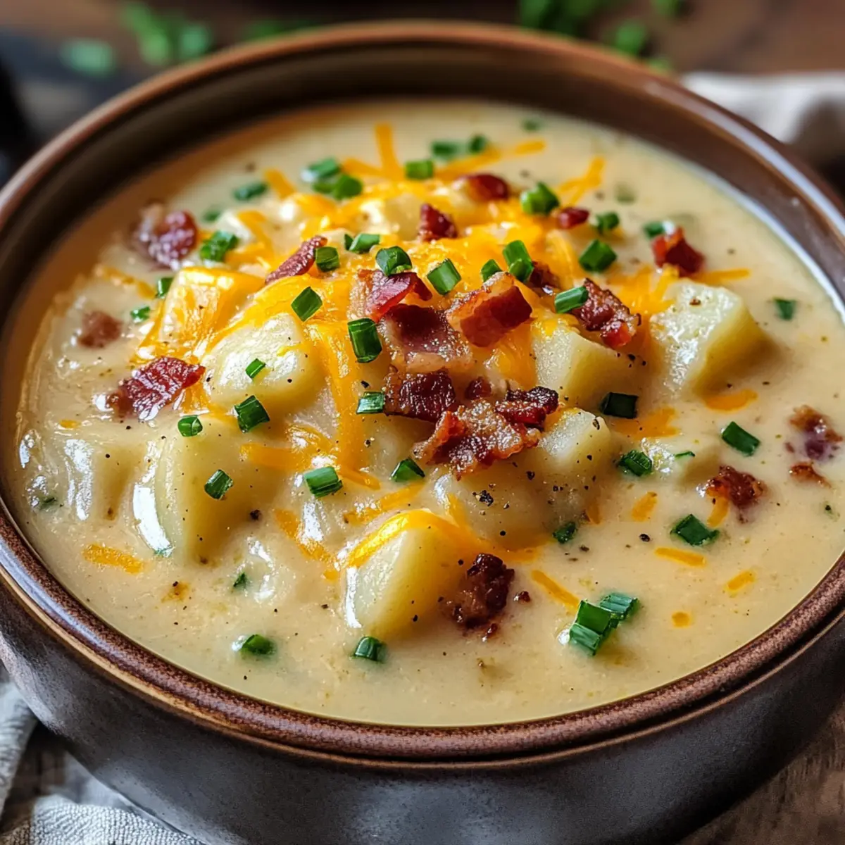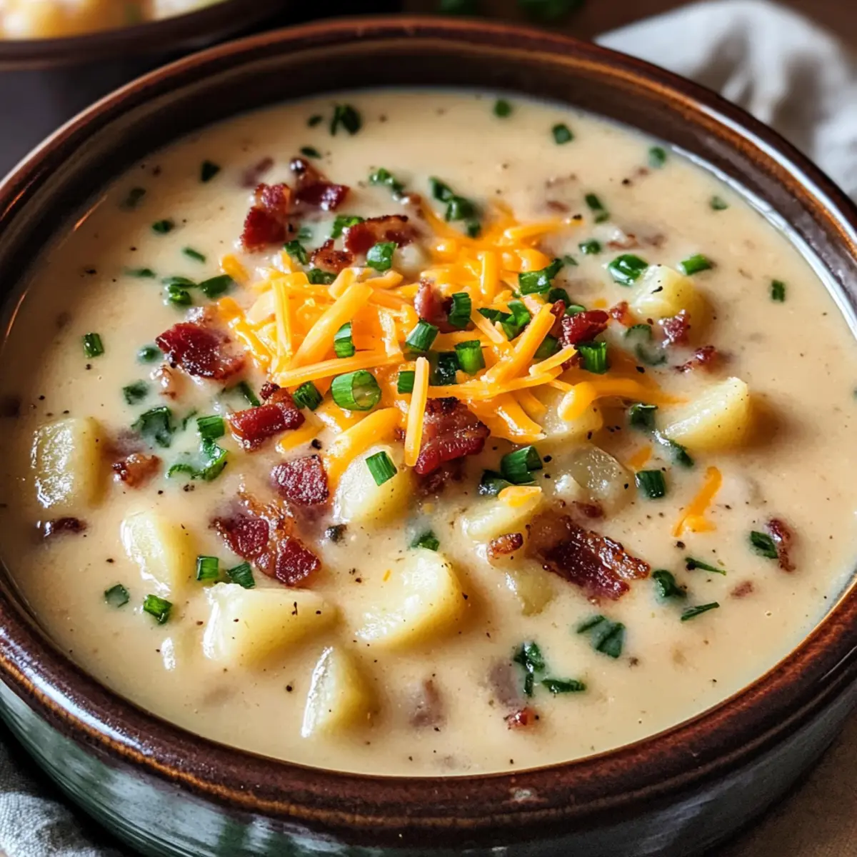 Als ich kürzlich nach einem Rezept suchte, das die Seele wärmt und leicht zuzubereiten ist, stieß ich auf die köstliche Steakhaus Kartoffelsuppe – eine gelungene Nachahmung der beliebten Variante aus dem Outback Steakhouse. Diese cremige Kartoffelsuppe verwandelt gewöhnliche Abende in etwas ganz Besonderes und bringt die gemütlichen Erinnerungen an das Restaurant direkt in meine Küche. Mit zarten Kartoffeln, knusprigem Bacon und einer samtigen, käsehaltigen Brühe ist dieses Gericht nicht nur ein Comfy Food-Hit, sondern auch ein Familienliebling, der viel Freude bereitet und kein großes Zeitinvestment erfordert. Wer kann da schon widerstehen? Bist du bereit, die Aromen zu entdecken, die diese Suppe so unwiderstehlich machen? Warum ist diese Suppe so unwiderstehlich? Herzhaft und cremig: Diese Steakhaus Kartoffelsuppe vereint die besten Eigenschaften von Komfortnahrung in einem Topf. Einfache Zubereitung: Selbst Anfänger in der Küche können problemlos den köstlichen Geschmack erzielen. Vielfältige Zutaten: Mit einfachen Rezeptvariationen, wie der Verwendung von Knoblauchbutter Steakspitzen Rezept, bleibt es spannend. Perfekte Konsistenz: Die samtige Textur sorgt für ein Genussgefühl, das jeder lieben wird. Familienfreundlich: Dieses Rezept bringt die ganze Familie zusammen und verwandelt selbst die einfachsten Abende in besondere Anlässe. Mach dich bereit, die Herzen deiner Lieben mit dieser unwiderstehlichen Suppe zu erobern! Steakhaus Kartoffelsuppe Zutaten • Diese Zutaten machen Ihre Steakhaus Kartoffelsuppe zum Highlight jeder Mahlzeit! Für die Suppe Russet Kartoffeln – sorgen für die perfekte Cremigkeit beim Kochen; Yukon Gold Kartoffeln können für eine süßere Note verwendet werden. Bacon – bringt herzhaften, knusprigen Geschmack; alternativ kann auch Putenbacon für eine leichtere Version genutzt werden. Zwiebel – verstärkt die Grundaromen mit einer angenehmen Süße; für beste Ergebnisse gelbe oder weiße Zwiebeln verwenden. Knoblauch – verleiht der Brühe tiefgründiges Aroma; fein gehackt sorgt er für gleichmäßige Verteilung. Hühnerbrühe – bildet die geschmackvolle Basis der Suppe; kann mit Gemüsebrühe für eine vegetarische Variante ersetzt werden. Vollmilch – fügt Cremigkeit hinzu; auch fettarme Milch oder Sahne können als Ersatz dienen. Schlagsahne – bereichert die Suppe und sorgt für ein luxuriöses Mundgefühl; kann weggelassen werden für eine leichtere Option, erzeugt dann jedoch eine andere Textur. Butter – hilft beim Andicken der Suppe und fügt zusätzlichen Reichtum hinzu. Allzweckmehl – wird als Verdickungsmittel verwendet; glutenfreies Mehl kann für eine glutenfreie Variante eingesetzt werden. Salz, schwarzer Pfeffer, Paprika, Knoblauchpulver – Gewürze, die den Geschmack intensivieren; nach Geschmack anpassen. Geriebener Cheddar-Käse – sorgt für einen köstlichen, cremigen Geschmack; auch andere schmelzbare Käsesorten oder pflanzliche Alternativen sind möglich. Sauerrahm – wird zum Servieren für die gewünschte Säure verwendet; kann durch griechischen Joghurt für eine leichtere Alternative ersetzt werden. Garnitur (Optional) – Gehackte Frühlingszwiebeln, zusätzlicher geriebener Käse und knusprige Baconsplitter bringen Farbe und zusätzlichen Geschmack. Schritt-für-Schritt-Anleitung für Steakhaus Kartoffelsuppe Schritt 1: Zutaten vorbereiten Schäle die Russet Kartoffeln und würfele sie in gleichmäßige Stücke. Hacke den Bacon in kleine Stücke und schneide die Zwiebel sowie den Knoblauch fein. Lege alles bereit, damit du während des Kochens schnell arbeiten kannst. Schritt 2: Bacon braten Erhitze einen großen Topf bei mittlerer Hitze und brate den Bacon für etwa 8-10 Minuten, bis er knusprig ist. Rühre gelegentlich um, damit er gleichmäßig bräunt. Nimm den Bacon anschließend aus dem Topf und lasse das ausgelassene Fett zum Braten der Zwiebeln drin. Schritt 3: Gemüse anbraten Füge die gewürfelte Zwiebel und den gehackten Knoblauch in den Topf mit dem Baconfett hinzu. Sauté für etwa 4-5 Minuten, bis die Zwiebeln weich und durchscheinend sind. Dadurch entfalten sich die Aromen und bilden eine geschmackvolle Basis für die Steakhaus Kartoffelsuppe. Schritt 4: Kartoffeln kochen Gib die gewürfelten Kartoffeln in den Topf und übergieße sie mit der Hühnerbrühe. Bring die Mischung zum Kochen und reduziere dann die Hitze. Lasse die Kartoffeln für 15-20 Minuten sanft köcheln, bis sie zart sind und sich leicht mit einer Gabel zerdrücken lassen. Schritt 5: Suppe andicken In einer separaten Pfanne bei mittlerer Hitze die Butter schmelzen. Füge das Allzweckmehl hinzu und rühre es für 1-2 Minuten um, um eine Mehlschwitze zu erstellen. Gieße dann nach und nach die Milch und die Schlagsahne hinein, wobei du ständig rührst, um Klumpen zu vermeiden. Diese Mischung wird die Steakhaus Kartoffelsuppe schön cremig machen. Schritt 6: Käse und Gewürze hinzufügen Gieße die dicke Mischung in den Topf mit den Kartoffeln und rühre alles gut um. Füge den geriebenen Cheddar-Käse, Salz, Pfeffer, Paprika und Knoblauchpulver hinzu. Rühre, bis der Käse geschmolzen und die Suppe gut vermischt ist, etwa 3-4 Minuten. Schritt 7: Fertigstellen und servieren Erhitze die Suppe auf niedriger Stufe, bis sie vollständig durchgewärmt ist. Überprüfe die Würze und passe sie nach Bedarf an. Serviere die Steakhaus Kartoffelsuppe heiß, garniert mit dem knusprigen Bacon, zusätzlichem Käse und frischen Frühlingszwiebeln für den perfekten Finish. Lagerungstipps für Steakhaus Kartoffelsuppe Kühlschrank: Bewahre die Steakhaus Kartoffelsuppe in einem luftdichten Behälter auf, bis zu 3 Tage haltbar. Kühle sie schnell ab, um die Frische zu bewahren. Wiedererwärmen: Erwärme die Suppe bei niedriger Hitze unter ständigem Rühren, um ein Anbrennen zu vermeiden. Ein Spritzer Milch kann helfen, die Cremigkeit zurückzubringen. Einfrieren: Aufgrund des hohen Milch- und Sahnegehalts sollte diese Supp