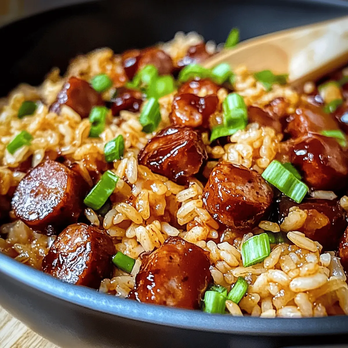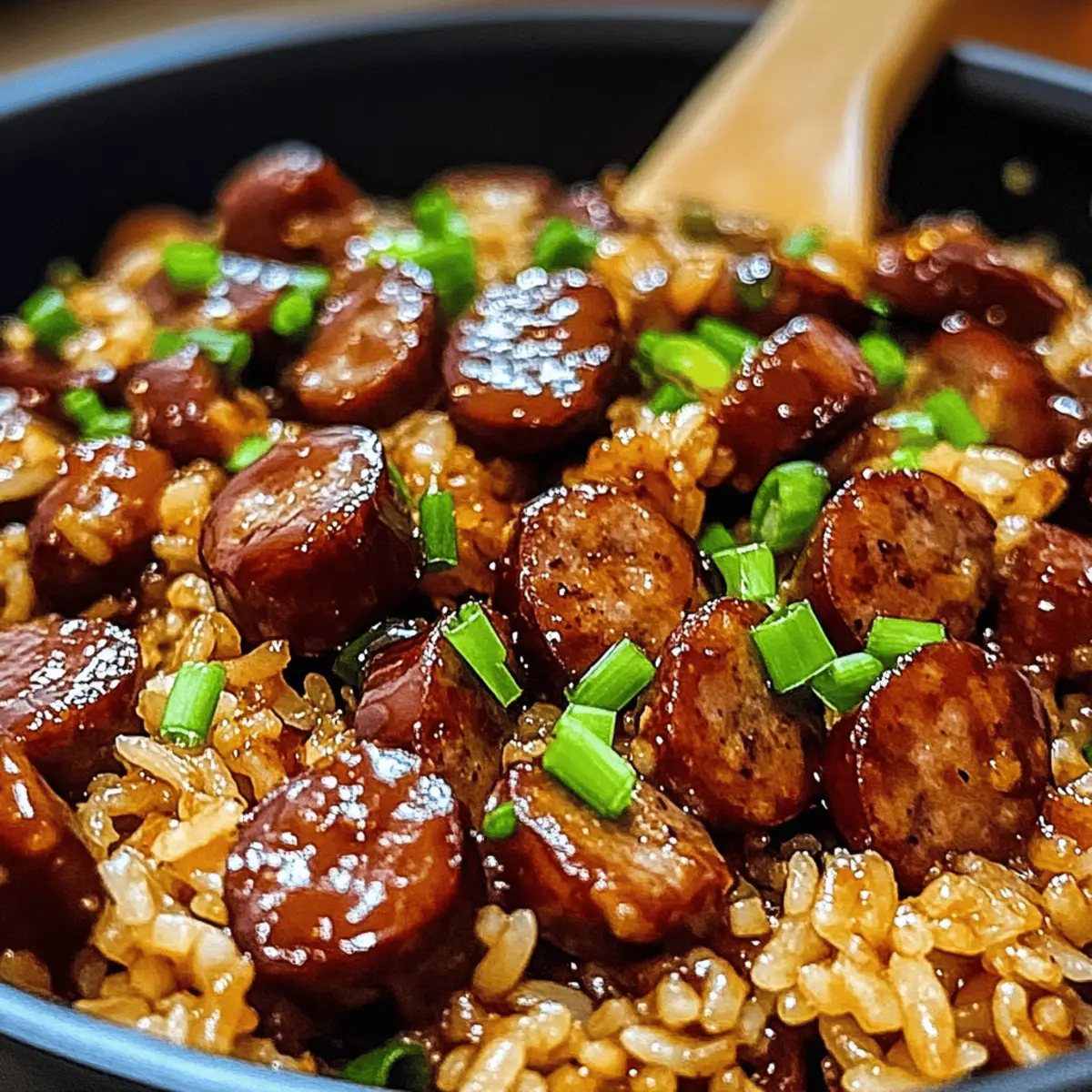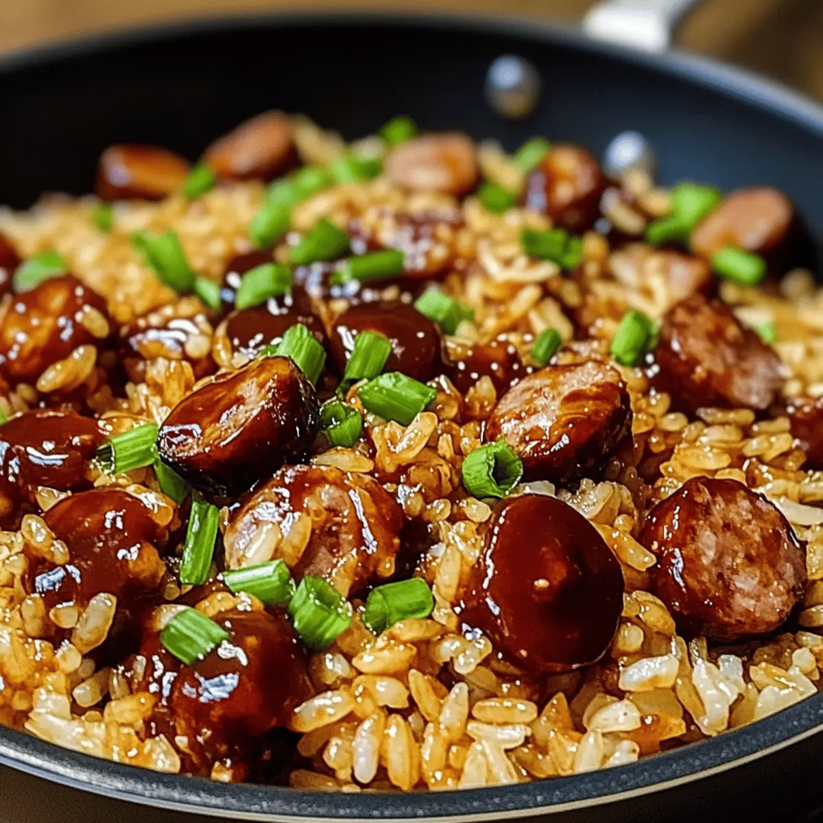 Die Küche war erfüllt von einem verlockenden Duft, als ich die Idee hatte, ein einmaliges Gericht zu kreieren, das nicht nur den Gaumen erfreut, sondern auch Zeit spart. Mein One-Pan Sweet and Tangy BBQ Sausage Rice ist die perfekte Lösung für alle, die sich nach einem unkomplizierten und geschmackvollen Essen sehnen. In weniger als 30 Minuten vereint diese köstliche Kombination von würzigen Würstchen und fluffigem Reis die besten Aromen von süßem BBQ und herzhaftem Umami. Dieses Gericht ist nicht nur ein wahrer Publikumsliebling an stressigen Abenden, sondern auch ideal für gesellige Zusammenkünfte mit Freunden oder der Familie. Bereit, Ihr Kochspiel auf die nächste Stufe zu heben? Lassen Sie uns gemeinsam in die Zubereitung eintauchen! Warum werden Sie dieses Rezept lieben? Einfachheit: Das Rezept ist unkompliziert und benötigt nur grundlegende Kochfähigkeiten, wodurch es sowohl für Anfänger als auch für erfahrene Köche geeignet ist. Köstlicher Geschmack: Die Kombination aus würziger Wurst und süßem BBQ-Sauce sorgt für ein Geschmackserlebnis, das sowohl herzhaft als auch befriedigend ist. Vielseitigkeit: Variieren Sie die Zutaten nach Ihrem Belieben, seien es andere Wurstsorten oder zusätzliches Gemüse wie Paprika oder Spinat. Schnelle Zubereitung: In weniger als 30 Minuten servierfertig – perfekt für hektische Wochentage oder spontane Gäste. Perfekte Konsistenz: Der klebrige Reis umschmeichelt die karamellisierten Würstchen, was zu einem herzhaften und einladenden Gericht führt. Wenn Sie nach weiteren schnellen Rezepten suchen, probieren Sie auch Bbq Haehnchen Geschnittene oder Mac Cheese Kaese! Süß-saurer BBQ Wurstreis Zutaten Für den Reis • Langkornreis (1 1/2 Tassen) – Der Reis absorbiert die Aromen optimal und sorgt für eine angenehme Textur. • Hühnerbrühe (2 1/2 Tassen) – Fügt Feuchtigkeit und zusätzlichen Geschmack hinzu. Verwenden Sie eine natriumarme Brühe für eine leichtere Variante. Für die Wurst und das Gemüse • Rauchende Wurst (1 lb) – Sorgt für reichhaltigen Geschmack und Protein. Sie können auch Kielbasa oder Andouille für unterschiedliche Geschmäcker verwenden. • Zwiebel (1 mittelgroß, fein gehackt) – Bringt Süße und Tiefe in das Gericht. Probieren Sie Schalotten oder Lauch als Alternativen. • Knoblauch (2 Zehen, gehackt) – Verstärkt das Aroma und den Geschmack. Frischer Knoblauch sorgt für die besten Ergebnisse. • Grüne Zwiebeln oder Petersilie (optional, als Garnierung) – Fügt Frische und Farbe hinzu. Für die Sauce und das Würzen • Olivenöl (2 EL) – Ideal zum Anbraten der Zutaten. Sie können auch Pflanzenöl oder geschmolzene Butter verwenden. • BBQ-Sauce (1/2 Tasse) – Verleiht dem Gericht Süße und einen würzigen Kick. Wählen Sie eine ausgewogene oder scharfe Soße nach Ihrem Geschmack. • Sojasauce (1 EL, optional) – Fügt Tiefe und Umami-Geschmack hinzu. Verwenden Sie glutenfreie Sojasauce oder Tamari für eine glutenfreie Option. • Salz und Pfeffer – Nach Geschmack hinzufügen, um das Gericht abzurunden. Dieses Rezept für süß-saurer BBQ Wurstreis wird sicher ein Hit in Ihrer Küche! Schritt-für-Schritt-Anleitung für Süß-saurer BBQ Wurstreis Step 1: Wurst anbraten Erhitzen Sie 2 Esslöffel Olivenöl in einer großen Pfanne bei mittlerer bis hoher Hitze. Geben Sie die in Scheiben geschnittene rauchende Wurst hinein und braten Sie sie für 3-4 Minuten, bis sie auf beiden Seiten schön goldbraun ist. Danach nehmen Sie die Wurst aus der Pfanne und legen Sie sie beiseite. Step 2: Zwiebeln und Knoblauch sautieren Reduzieren Sie die Hitze auf mittlere Stufe und fügen Sie die fein gehackte Zwiebel in die gleiche Pfanne hinzu. Sautieren Sie die Zwiebel etwa 5 Minuten lang, bis sie weich und leicht durchsichtig ist. Geben Sie dann 2 gehackte Knoblauchzehen hinzu und kochen Sie diese für 30 Sekunden, bis sie duften. Step 3: Reis rösten Fügen Sie 1 1/2 Tassen ungekochten Langkornreis in die Pfanne hinzu und rösten Sie ihn für 2-3 Minuten. Rühren Sie dabei ständig um, bis der Reis leicht goldbraun ist und ein nussiges Aroma verbreitet. Diese Röstung verleiht dem süß-sauren BBQ Wurstreis eine zusätzliche Geschmacksdimension. Step 4: Brühe und Sauce hinzufügen Gießen Sie 2 1/2 Tassen Hühnerbrühe und 1/2 Tasse BBQ-Sauce in die Pfanne. Kratzen Sie mit einem Löffel den Boden der Pfanne, um alle angebratenen Reste zu lösen. Lassen Sie die Mischung aufkochen und reduzieren Sie dann die Hitze auf ein sanftes Köcheln. Step 5: Wurst und garen Legen Sie die angebratene Wurst zurück in die Pfanne und vermischen Sie alles gut. Decken Sie die Pfanne ab und lassen Sie den Inhalt bei niedriger Hitze 18-20 Minuten köcheln, bis der Reis zart ist und die Flüssigkeit absorbiert wurde. Rühren Sie der Mischung alle paar Minuten um, um ein Ankleben zu verhindern. Step 6: Nach dem Garen ruhen lassen Sobald der Reis fertig ist, nehmen Sie die Pfanne vom Herd und lassen Sie sie noch 5 Minuten abgedeckt ruhen. Diese Ruhezeit hilft, die Aromen zu verteilen. Danach lockern Sie den Reis mit einer Gabel auf und passen Sie die Würze mit Salz und Pfeffer nach Ihrem Geschmack an. Step 7: Anrichten Garnieren Sie den süß-sauren BBQ Wurstreis mit frischen, gehackten grünen Zwiebeln oder Petersilie, bevor Sie ihn heiß servieren. Genießen Sie dieses herzliche Gericht direkt aus der Pfanne, ideal für gesellige Abende und schnelle Abendessen! Variationen & Substitutionen Entdecken Sie aufregende Möglichkeiten, wie Sie dieses Rezept ganz nach Ihrem Geschmack anpassen können und lassen Sie Ihrer Kreativität beim Kochen freien Lauf! Vegan: Ersetzen Sie die Wurst durch pflanzliche Würstchen oder Tofu für eine köstliche vegane Variante. Glutenfrei: Verwenden Sie glutenfreie Sojasauce oder Tamari, um das Gericht für glutenfreie Ernährung geeignet zu machen. Zusätzliche Gewürze: Fügen Sie eine Prise Cayennepfeffer oder Paprika hinzu, um dem Gericht eine angenehme Schärfe zu ver