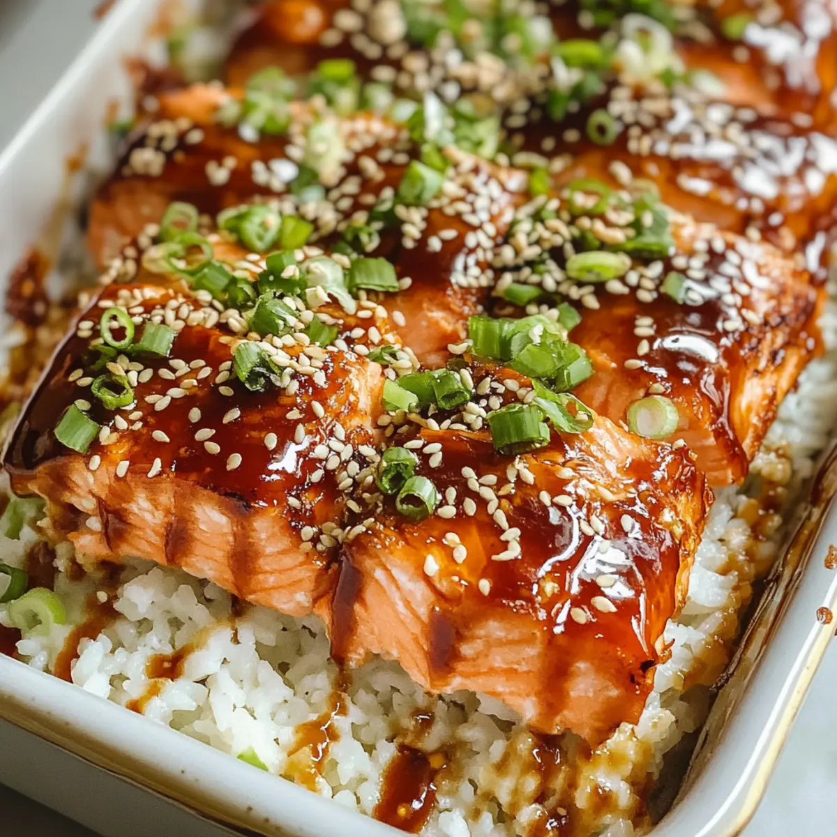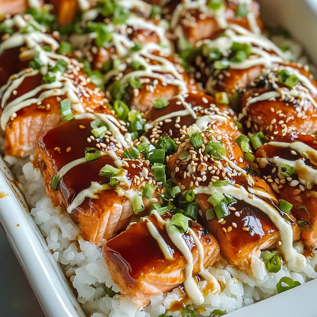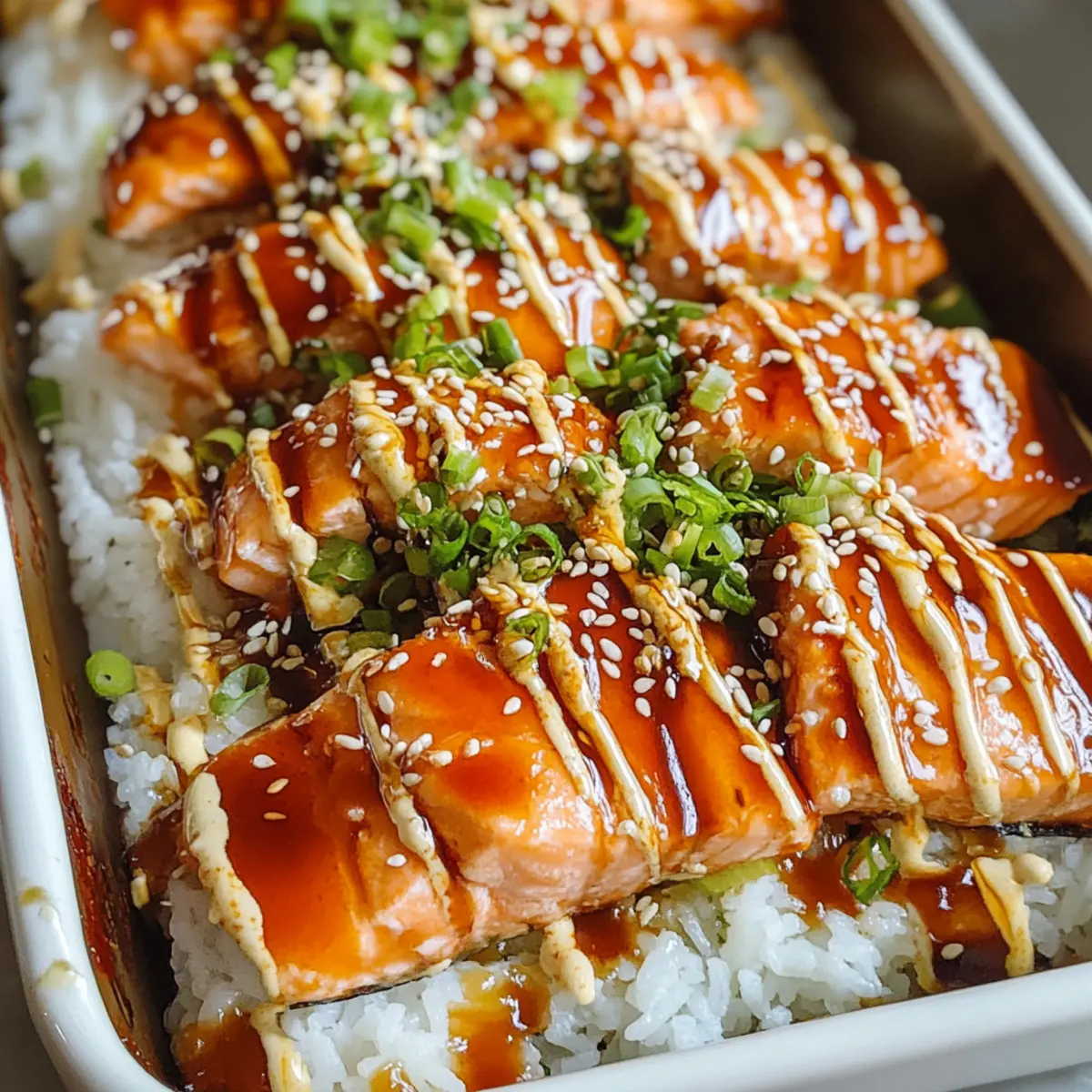 Es war einmal ein einfacher Abend, an dem ich das Verlangen nach etwas Warmem und Herzhaftem hatte. Diese Teriyaki Lachs Sushi Auflauf war die perfekte Lösung und verwandelte mein kleines Zuhause in eine asiatische Küche voller köstlicher Aromen. Die Kombination aus lockerem Sushi-Reis, zartem Lachs und der süß-salzigen Teriyaki-Sauce sorgt für ein wahres Geschmackserlebnis. Und das Beste? Diese unkomplizierte und familienfreundliche Mahlzeit lässt sich in kürzester Zeit zubereiten! Ideal für stressige Wochentage oder gesellige Abende mit Freunden. Neugierig, wie dieses köstliche Rezept in deiner Küche zum Leben erwacht? Lass uns gemeinsam loslegen! Warum wirst du dieses Rezept lieben? Einfachheit: Die Zubereitung ist unkompliziert und erfordert keine speziellen Kochfähigkeiten, sodass du ganz entspannt loslegen kannst! Herzhafter Geschmack: Die Kombination aus zartem Lachs und süß-salziger Teriyaki-Sauce wird deine Geschmacksknospen begeistern. Vielseitig: Das Rezept lässt sich leicht anpassen – probiere zum Beispiel, Lachs durch Hühnchen oder Tofu zu ersetzen. Familienfreundlich: Ideal für einen gemütlichen Abend mit der Familie, damit auch die Kleinen begeistert zuschlagen können. Schnell zubereitet: In weniger als einer Stunde hast du dieses köstliche Gericht auf dem Tisch, perfekt für einen stressfreien Wochentag. Verpasse nicht auch die leckeren Air Fryer Karottenchips als Beilage! Teriyaki Lachs Sushi Auflauf Zutaten Für den Reis • Sushi-Reis – bildet die perfekte Basis und sorgt für die ideale Konsistenz. • Wasser – notwendig zur Hydration des Reises beim Kochen. • Reisessig – fügt eine angenehme Säure hinzu, die den Geschmack des Reises verstärkt. • Zucker – balanciert die Säure des Essigs. • Salz – hebt die Aromen des gesamten Gerichts hervor. Für den Lachs • Lachsfilet (ohne Haut) – die Hauptproteinquelle, die Geschmack und Textur liefert. • Teriyaki-Sauce – verleiht dem Lachs eine süße und umami-reiche Note. • Sesamöl – sorgt für einen nussigen Geschmack, der das Gericht abrundet. Für die Kruste • Mayonnaise – schafft einen cremigen Belag, der die Aromen verbindet. • Sriracha – fügt Schärfe hinzu; nach Geschmack anpassen. • Frühlingszwiebeln – dienen als frische Garnitur, die das Gericht aufpeppt. • Sesamsamen – für einen nussigen Crunch und als optische Aufwertung. Für die Garnitur • Chopped Green Onions – sorgen für zusätzliche Frische und Farbe für einen schönen Look. Mit diesen Zutaten bist du bestens ausgestattet, um deinen eigenen Teriyaki Lachs Sushi Auflauf zu kreieren. Lass dich von den Aromen verzaubern und genieße ein herzhaftes Gericht, das die ganze Familie begeistern wird! Step-by-Step Instructions for Teriyaki Lachs Sushi Auflauf Step 1: Reis vorbereiten Spüle den Sushi-Reis gründlich unter kaltem Wasser ab, bis das Wasser klar ist, um überschüssige Stärke zu entfernen. Dies ist entscheidend für eine fluffige Konsistenz. Lass den Reis anschließend 30 Minuten stehen, bevor du ihn in einem Reiskocher oder einem Topf mit der doppelten Menge Wasser kochst. Koche den Reis gemäß den Anweisungen oder bringe das Wasser zum Kochen und lasse den Reis dann etwa 20 Minuten bei schwacher Hitze köcheln. Step 2: Reis würzen In einer kleinen Schüssel vermenge den Reisessig, den Zucker und das Salz, bis alles gut aufgelöst ist. Mische diese Mischung vorsichtig unter den frisch gekochten Sushi-Reis, während du darauf achtest, den Reis nicht zu zerdrücken. Lass den gewürzten Reis anschließend auf Raumtemperatur abkühlen, damit er perfekt für den Auflauf ist. Step 3: Lachs zubereiten Heize den Ofen auf 190°C vor. Lege das Lachsfilet auf ein mit Backpapier ausgelegtes Backblech, bestreiche es großzügig mit Teriyaki-Sauce und einem kleinen Schuss Sesamöl. Die Kombination dieser Aromen ist es, die den Teriyaki Lachs Sushi Auflauf so lecker macht. Backe den Lachs für etwa 15-20 Minuten, bis er durchgegart ist und sich leicht mit einer Gabel zerteilen lässt. Step 4: Lachs zerkleinern Nimm den Lachs nach dem Backen aus dem Ofen und lasse ihn einige Minuten abkühlen. Zerteile das Filet dann mit einer Gabel in mundgerechte Stücke. Achte darauf, dass die Stücke gleichmäßig groß sind, um eine gleichmäßige Verteilung im Auflauf zu gewährleisten. Die zarte Textur des Lachses wird die Basis des Auflaufs perfekt ergänzen. Step 5: Reis in die Form geben Fette eine 9×13-Zoll-Auflaufform leicht ein. Verteile den abgekühlten, gewürzten Sushi-Reis gleichmäßig auf dem Boden der Form und drücke ihn leicht an, damit er gut zusammenhält. Diese Schicht bildet die Grundlage für den Teriyaki Lachs Sushi Auflauf und sorgt für einen stabilen Halt. Step 6: Lachs auf dem Reis anrichten Lege die zerkleinerten Lachsstücke gleichmäßig auf die Schicht aus Sushi-Reis. Diese Kombination aus Reis und Lachs ist der Schlüssel zum herzhaften Geschmack des Auflaufs. Achte darauf, dass der Lachs gleichmäßig verteilt ist, um jeden Bissen köstlich zu machen. Step 7: Kruste vorbereiten In einer kleinen Schüssel vermische die Mayonnaise und die Sriracha. Du kannst die Menge der Sriracha je nach gewünschtem Schärfegrad anpassen. Verteile diese Mischung gleichmäßig über die Lachsschicht, sodass eine cremige, würzige Kruste entsteht, die im Ofen goldbraun wird. Step 8: Garnitur hinzufügen und backen Streue die gehackten Frühlingszwiebeln über die Mayonnaiseschicht und kröne das Ganze mit Sesamsamen für zusätzlichen Crunch. Backe den Auflauf im vorgeheizten Ofen für etwa 15-20 Minuten, bis die Oberseite goldbraun und blubbernd ist. Der verführerische Duft wird dich schon vor dem Servieren ins Wasser laufen lassen. Step 9: Servieren und genießen Nehme den Teriyaki Lachs Sushi Auflauf aus dem Ofen und träufle leicht zusätzliche Teriyaki-Sauce darüber. Lass ihn einige Minuten abkühlen, bevor du ihn in Quadrate schneidest. Serviere ihn warm und genieße die Kombination
