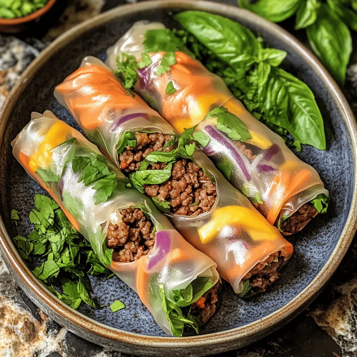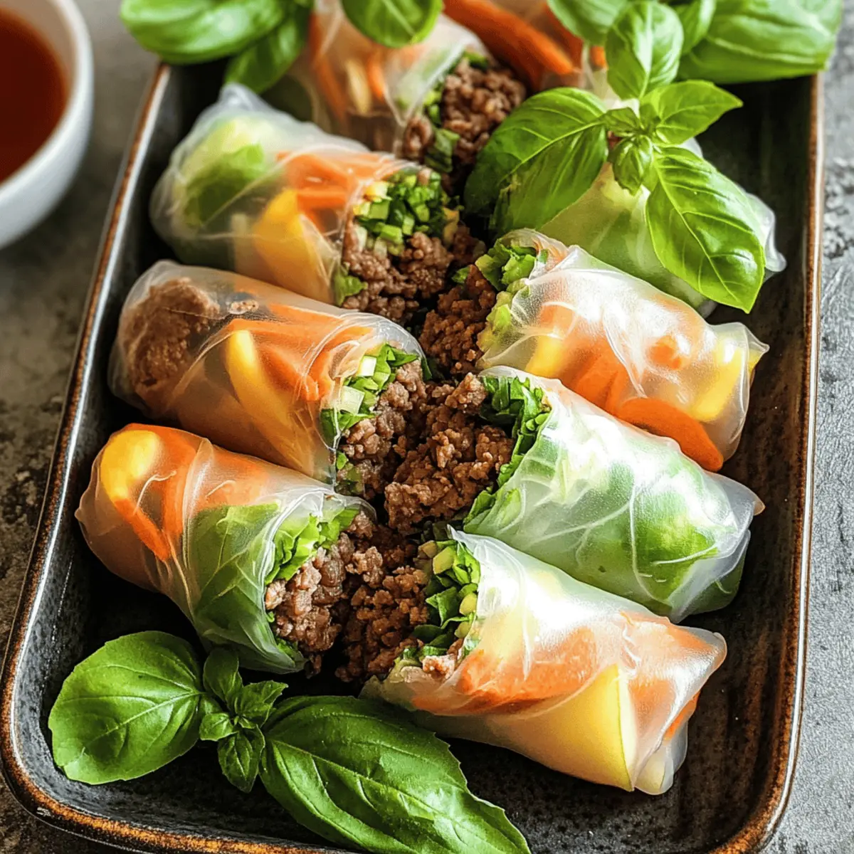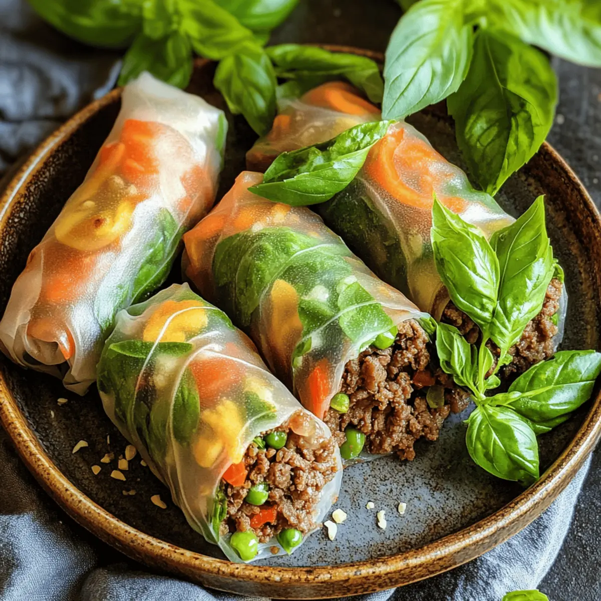 Jedes Mal, wenn ich den asiatischen Markt besuche, werde ich von den verlockenden Aromen der thailändischen Straßenküche angezogen. Diese Thai Basil Beef Rolls verkörpern genau das – ein Zusammenspiel von frischen Zutaten und erlesenen Gewürzen, das selbst die einfachsten Mahlzeiten in ein Festmahl verwandelt. Mit zartem, gewürztem Rinderhackfleisch und knackigem Gemüse, alles eingewickelt in zarte Reispapierblätter, sind sie nicht nur schnell in weniger als 30 Minuten zubereitet, sondern sie bringen auch gesunde Freude in deine Küche! Diese Rolls sind abwechslungsreich, sodass du sie nach deinem Geschmack anpassen kannst – ideal für ein schnelles Mittagessen oder besondere Anlässe. Bist du bereit, deine Familie und Freunde mit diesem köstlichen Snack zu begeistern? Warum wirst du dieses Rezept lieben? Einfachheit: Die Zubereitung dieser Thai Basil Beef Rolls ist denkbar einfach und erfordert keine anspruchsvollen Kochfähigkeiten. Frische Aromen: Die Kombination aus zartem Rinderhackfleisch, frischem Gemüse und aromatischen Basilikumblättern sorgt für ein wahres Geschmacksfeuerwerk. Gesund: Mit nur etwa 180 Kalorien pro Rolle sind sie eine gesunde Wahl, die voller Nährstoffe steckt. Vielseitigkeit: Du kannst die Füllung ganz nach Belieben variieren – wie wäre es mit einer Kombination aus gegrillten Thai Kokosnuss-Hühnchenspießen und frischen Avocados? Schnelligkeit: In weniger als 30 Minuten hast du diese leckeren Rollen auf dem Tisch, perfekt für eine schnelle Mahlzeit. Beliebtheit: Diese Rolls eignen sich hervorragend als Vorspeise oder leichtes Mittagessen und beeindrucken garantiert deine Gäste! Thai Basil Beef Rolls Zutaten • Entdecke die köstlichen Zutaten für die Zubereitung von Thai Basil Beef Rolls. Für die Füllung Mageres Rinderhackfleisch – bildet die herzhafte Proteinbasis und lässt die Aromen wunderbar zur Geltung kommen. Substitution: Verwende Garnelen für eine Meeresfrüchte-Variante. Sojasauce – verleiht der Füllung einen salzigen, umami-reichen Kick. Hoisin-Sauce – balanciert die Salzigkeit mit einer zarten Süße. Geriebene Karotten – bringen Crunch und eine lebendige Farbe in die Rolle. Gehackte Paprika – bieten Frische und Süße. Frische Basilikumblätter – das aromatische Herzstück, das dem Gericht seinen einzigartigen Duft verleiht. Für die Hülle Reispapierblätter – weich, dünn und perfekt für frische Rollen. Hinweis: Verwende warmes Wasser, um sie zu erweichen. Schritt-für-Schritt-Anleitung für Thai Basil Rindfleisch Rollen Step 1: Rinderhackfleisch anbraten Erhitze eine große Pfanne bei mittlerer Hitze und füge das mageres Rinderhackfleisch hinzu. Brate es für 5–7 Minuten an, bis es vollständig durchgegart und goldbraun ist. Rühre während des Bratens öfters um, damit das Fleisch gleichmäßig gart. Gleichzeitig, gib die Sojasauce und die Hoisinsauce hinzu, um dem Fleisch einen herzhaften Geschmack zu verleihen. Step 2: Gemüse hinzufügen Sobald das Rinderhackfleisch gebräunt ist, füge die geriebenen Karotten und die gehackten Paprika in die Pfanne. Rühre alles gut durch und lasse es für weitere 2–3 Minuten kochen. Auf diese Weise bleiben das Gemüse knackig und frisch, während die Aromen gut miteinander verschmelzen. Achte darauf, dass das Gemüse leuchtend und nicht zu weich wird. Step 3: Reispapier vorbereiten Fülle eine flache Schüssel mit warmem Wasser und tauche ein Reispapier-Blatt hinein. Halte es dort für etwa 15–20 Sekunden, bis es weich und biegsam wird. Hebe das Blatt vorsichtig aus dem Wasser und lege es auf ein sauberes, feuchtes Küchentuch. So bleibt das Reispapier geschmeidig und lässt sich leicht füllen. Step 4: Füllen und rollen Platziere einige frische Basilikumblätter und eine Portion der Rinderhackfleischmischung in die Mitte des Reispapiers. Achte darauf, nicht zu viel zu füllen, um das Rollen zu erleichtern. Klappe die Seiten des Reispapiers über die Füllung und rolle es dann fest auf, bis das Ende sicher verschlossen ist. Diese Thai Basil Rindfleisch Rollen sehen wunderbar aus und sind leicht zu handhaben. Step 5: Servieren Lege die frisch zubereiteten Thai Basil Rindfleisch Rollen auf eine Servierplatte. Es ist am besten, die Rollen sofort zu genießen, damit sie frisch und knackig bleiben. Du kannst sie mit verschiedenen Dips wie Erdnusssauce, süßer Chilisauce oder einer Soja-Limetten-Dressing servieren, um den Geschmack zu intensivieren. Thai Basil Beef Rolls Variationen Fühle dich frei, deine Thai Basil Beef Rolls nach deinem Geschmack zu individualisieren und entfessle deine Kreativität in der Küche! Meeresfrüchte: Ersetze das Rinderhackfleisch durch Garnelen für eine leckere Meeresfrüchte-Variante. Garnelen bringen einen frischen Geschmack und sind eine hervorragende Proteinquelle. Vegetarisch: Für eine fleischlose Option verwende Tofu und mariniere ihn in Sojasauce. Dieser Austausch bietet eine gesunde und reichhaltige Geschmacksalternative. Avocado: Füge ein paar Scheiben cremiger Avocado hinzu, um bei jedem Bissen eine samtige Textur zu genießen. Avocado macht die Rolle noch köstlicher und gehaltvoller. Vermicelli-Nudeln: Integriere gekochte Vermicelli-Nudeln für eine herzhaftere Rolle. Dies verleiht nicht nur Fülle, sondern einen zusätzlichen Geschmacksträger für die Gewürze. Scharf: Wenn du es gerne scharf magst, füge einige frische, dünn geschnittene Chili-Paprika hinzu oder serviere mit einer scharfen Chilisauce. Die Hitze wird das Geschmackserlebnis intensivieren. Frische Kräuter: Experimentiere mit anderen frischen Kräutern wie Minze oder Koriander für einen zusätzlichen Geschmacks-Kick. Diese Kräuter können die Aromen der Füllung wunderbar ergänzen. Süß: Ein Hauch von Mango oder Ananas kann eine süße Note hinzufügen, die eine erfrischende Balance zu den herzhaften Zutaten bietet. Diese Kombination überrascht die Geschmacksknospen. Dips: Vergiss nicht, verschiedene Dips auszuprobieren, um das Geschmackse