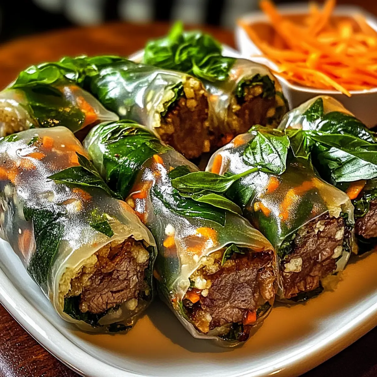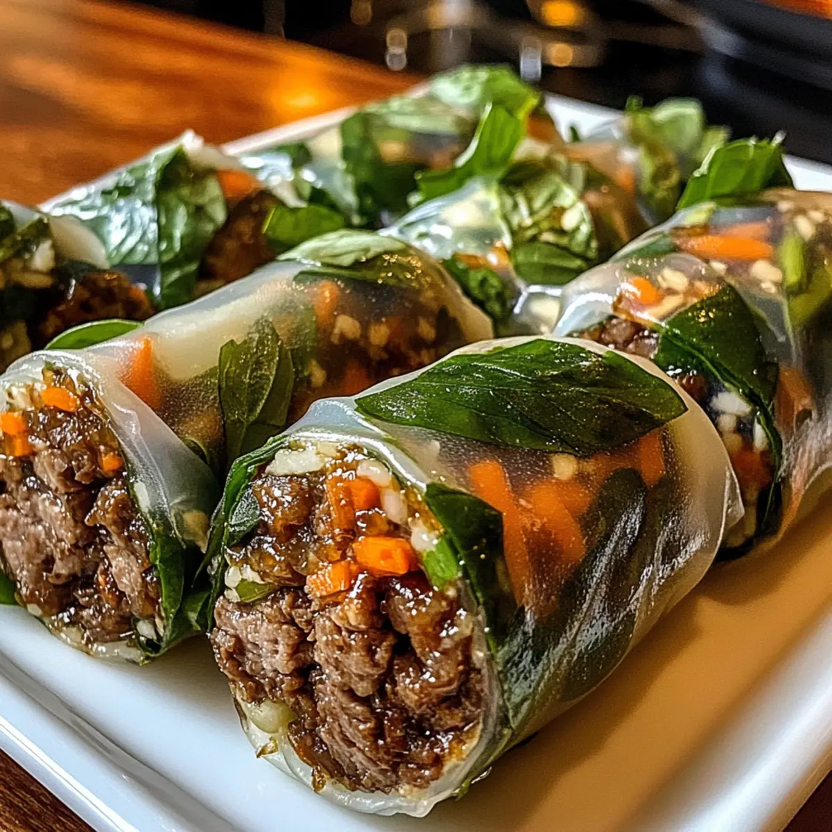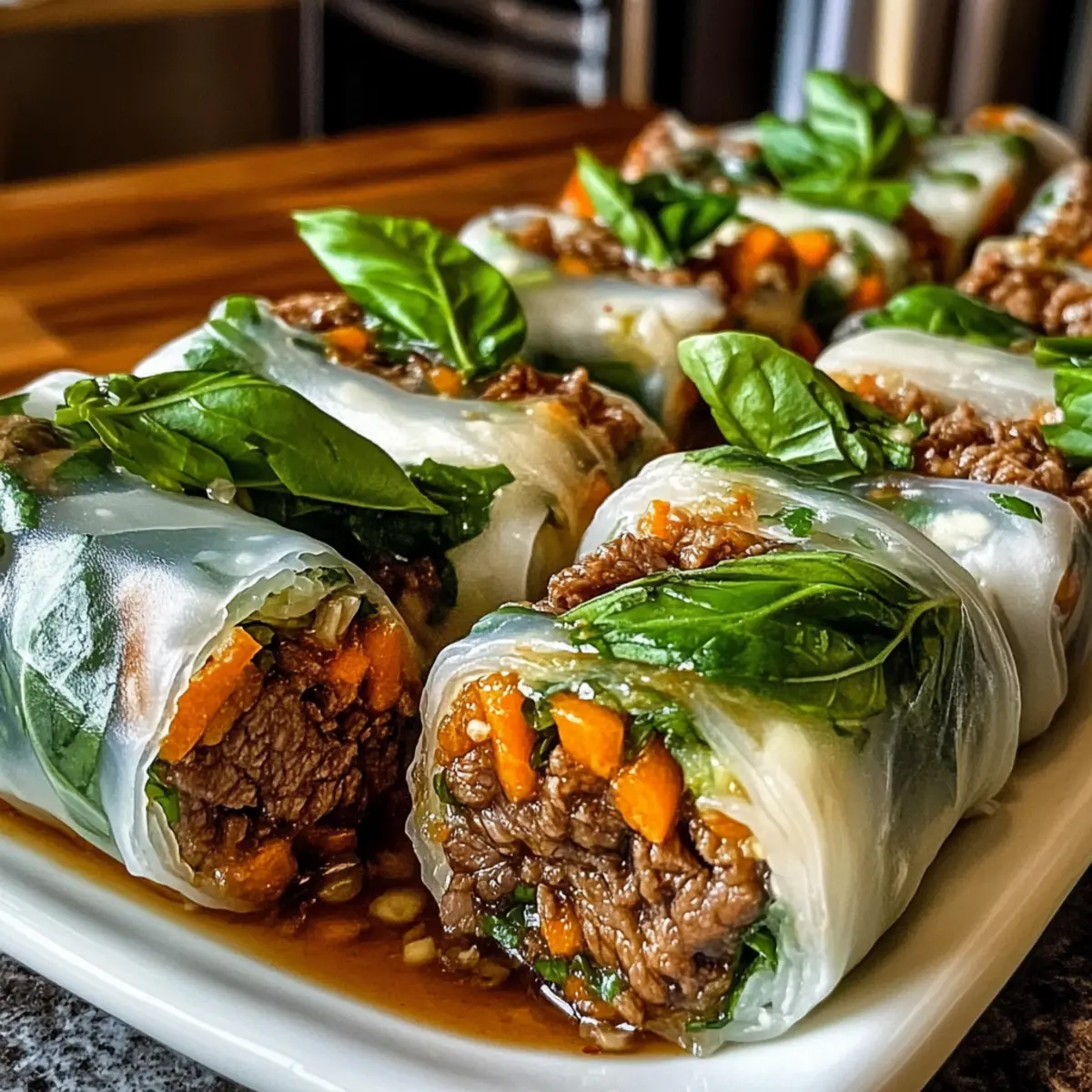 Beim ersten Biss in diese Thai-Basilikum-Rindfleisch-Rollen fühle ich mich direkt in die Straßen von Bangkok versetzt, wo die Aromen förmlich zum Leben erwachen. Diese kleinen, handlichen Köstlichkeiten vereinen saftiges, würziges Rindfleisch, frisches Gemüse und duftenden Basilikum – alles eingewickelt in zarte Reisblätter. Perfekt für warme Tage und mit einer Zubereitungszeit von unter 30 Minuten sind sie sowohl ein Genuss für schnelle Mittagessen als auch für festliche Anlässe. Ein weiterer Pluspunkt? Du kannst sie ganz nach deinem Geschmack anpassen, egal ob du mehr Gemüse, weniger Fleisch oder sogar eine Meeresfrüchteversion möchtest. Bist du bereit, deinen neuen Liebling zuzubereiten? Warum werden Sie diese Rinderrollen lieben? Einfachheit: Die Zubereitung dieser Thai-Basilikum-Rindfleisch-Rollen ist mühelos und erfordert keine komplizierten Kochtechniken. Ideal für alle, die schnell eine köstliche Mahlzeit zaubern möchten! Vielfalt: Passen Sie die Füllung ganz nach Ihrem Geschmack an! Ob mit knackigem Gemüse oder einer Meeresfrüchteversion – die Möglichkeiten sind endlos. Frische Geschmacksexplosion: Die Kombination aus der Würze des Rindfleischs und dem frischen Aroma des Basilikums sorgt für ein Geschmackserlebnis, das Ihre Sinne betört. Gesund und Nahrhaft: Mit magerem Rindfleisch und viel Gemüse sind diese Rollen eine gesunde Wahl für jede Mahlzeit. Perfekt, um ein bisschen Abwechslung in Ihre Diät zu bringen! Schnelle Zubereitung: In weniger als 30 Minuten sind diese Rollen fertig – so können Sie mehr Zeit mit Ihren Liebsten verbringen, ohne auf gutes Essen verzichten zu müssen. Begeisterung teilen: Diese leckeren Häppchen sind nicht nur ein Augenschmaus, sondern auch ein Hit bei jeder Feier oder Zusammenkunft. Wenn Sie noch mehr gesunde Ideen suchen, schauen Sie sich unsere Mini Protein Cheesecakes oder das Rezept für Protein Waffeln an! Thai-Basilikum-Rindfleisch-Rollen Zutaten Für die Füllung Mageres Rinderhackfleisch – sorgt für eine reichhaltige Proteinbasis; kann durch Garnelen für eine Meeresfrüchte-Version ersetzt werden. Sojasauce – fügt einen salzigen Umami-Geschmack hinzu; Tamari ist eine glutenfreie Alternative. Hoisinsauce – balanciert die Salzigkeit mit einer süßen Note; keine direkte Substitution erforderlich. Geraspelte Karotten – bringen Knusprigkeit und Farbe; auch andere knackige Gemüse wie Gurken sind möglich. Gehackte Paprika – bietet Frische und Süße; jede süße Paprika-Variante kann verwendet werden. Frische Basilikumblätter – der Schlüsselgeschmacksträger, der für ein erhebendes Aroma sorgt; essenziell für den Geschmack, jedoch kann man sie auch weglassen, was allerdings das Gericht verändert. Für die Rollschalen Reisblattwrapper – zarte, dünne Blätter, die perfekt für frische Rollen sind; richtig lagern, um ein Austrocknen zu vermeiden. Schritt-für-Schritt-Anleitungen für Thai-Basilikum-Rindfleisch-Rollen Step 1: Rinderhackfleisch anbraten Erhitze eine große Pfanne bei mittlerer Hitze und füge das mageres Rinderhackfleisch hinzu. Brate es für etwa 5–7 Minuten, bis es gleichmäßig gebräunt ist. Während des Bratens das Fleisch mit einem Holzlöffel zerteilen und die Sojasauce sowie die Hoisinsauce darüber geben. Rühre gut um, bis das Fleisch vollständig durchgegart ist und eine schöne Farbe hat. Step 2: Gemüse hinzufügen Gib die geraspelten Karotten und die gehackten Paprika in die Pfanne mit dem Rinderhackfleisch. Brate alles zusammen für weitere 2–3 Minuten, bis das Gemüse leicht weich, aber dennoch knusprig bleibt. Diese Mischung verleiht den Thai-Basilikum-Rindfleisch-Rollen Frische und Biss. Rühre alles gut durch, damit sich die Aromen vermischen. Step 3: Reisblätter vorbereiten Fülle eine flache Schüssel mit warmem Wasser. Tauche ein Reisblatt kurz (ca. 10–15 Sekunden) ins Wasser, bis es weich und flexibel wird. Achte darauf, nicht zu lange zu tauchen, damit das Blatt nicht zerreißt. Lege das eingeweichte Reisblatt auf eine saubere Arbeitsfläche oder ein feuchtes Küchentuch. Step 4: Füllung in die Reisblätter geben Platziere einige frische Basilikumblätter in der Mitte des Reisblattes, gefolgt von einer Portion der Rinderhackfleisch-Gemüse-Mischung. Achte darauf, genug Platz an den Rändern zu lassen, um die Rollen später gut schließen zu können. Die frischen Basilikumblätter sorgen für das charakteristische Aroma dieser Thai-Basilikum-Rindfleisch-Rollen. Step 5: Rollen formen Klappe die Seiten des Reisblattes über die Füllung und rolle das Blatt sorgfältig von unten nach oben auf. Achte darauf, dass die Rolle fest, aber nicht zu straff ist, damit die Füllung beim Rollen nicht herausquillt. Wiederhole diesen Vorgang mit den restlichen Reisblättern und der Füllung, bis alles aufgebraucht ist. Step 6: Servieren Serviere die frisch zubereiteten Thai-Basilikum-Rindfleisch-Rollen auf einem schönen Teller. Sie schmecken am besten sofort, kannst aber auch eine Auswahl an Dips wie Erdnusssauce oder süße Chili-Sauce bereitstellen. So wird das Geschmackserlebnis noch aufregender und die Rollen sind der Hit bei jeder Gelegenheit! Lagerungstipps für Thai-Basilikum-Rindfleisch-Rollen Raumtemperatur: Thai-Basilikum-Rindfleisch-Rollen sollten idealerweise sofort serviert werden, um die Frische zu genießen. Wenn sie länger stehen, besteht die Gefahr, dass die Reisblätter austrocknen. Kühlschrank: Die Rollen können in einem luftdichten Behälter für bis zu 2 Tage im Kühlschrank aufbewahrt werden. Wickeln Sie sie in Frischhaltefolie, um sie vor dem Austrocknen zu schützen. Gefrierfach: Diese Rinderrollen sind nicht optimal zum Einfrieren, da die Reisblätter beim Auftauen ihre Textur verlieren können. Es ist am besten, sie frisch zuzubereiten. Wiedererwärmen: Zum Aufwärmen einfach Dampf verwenden oder die Rollen für einige Sekunden in die Mikrowelle stellen, um sie leicht zu erwärmen, ohne die Füllung zu übergaren. Bereiten Sie I