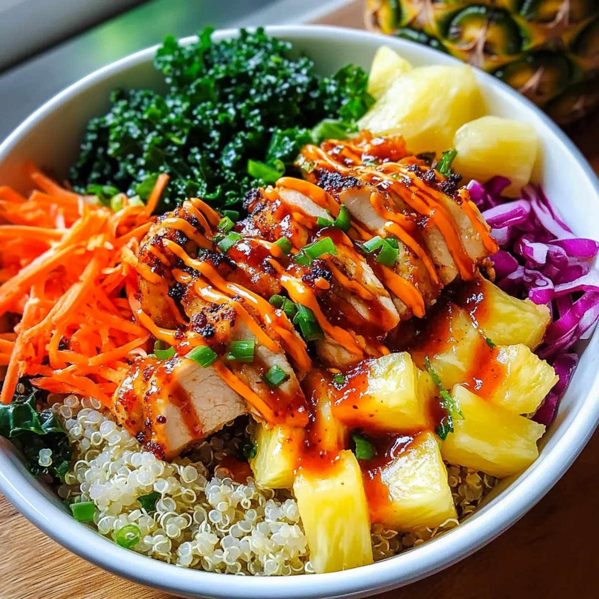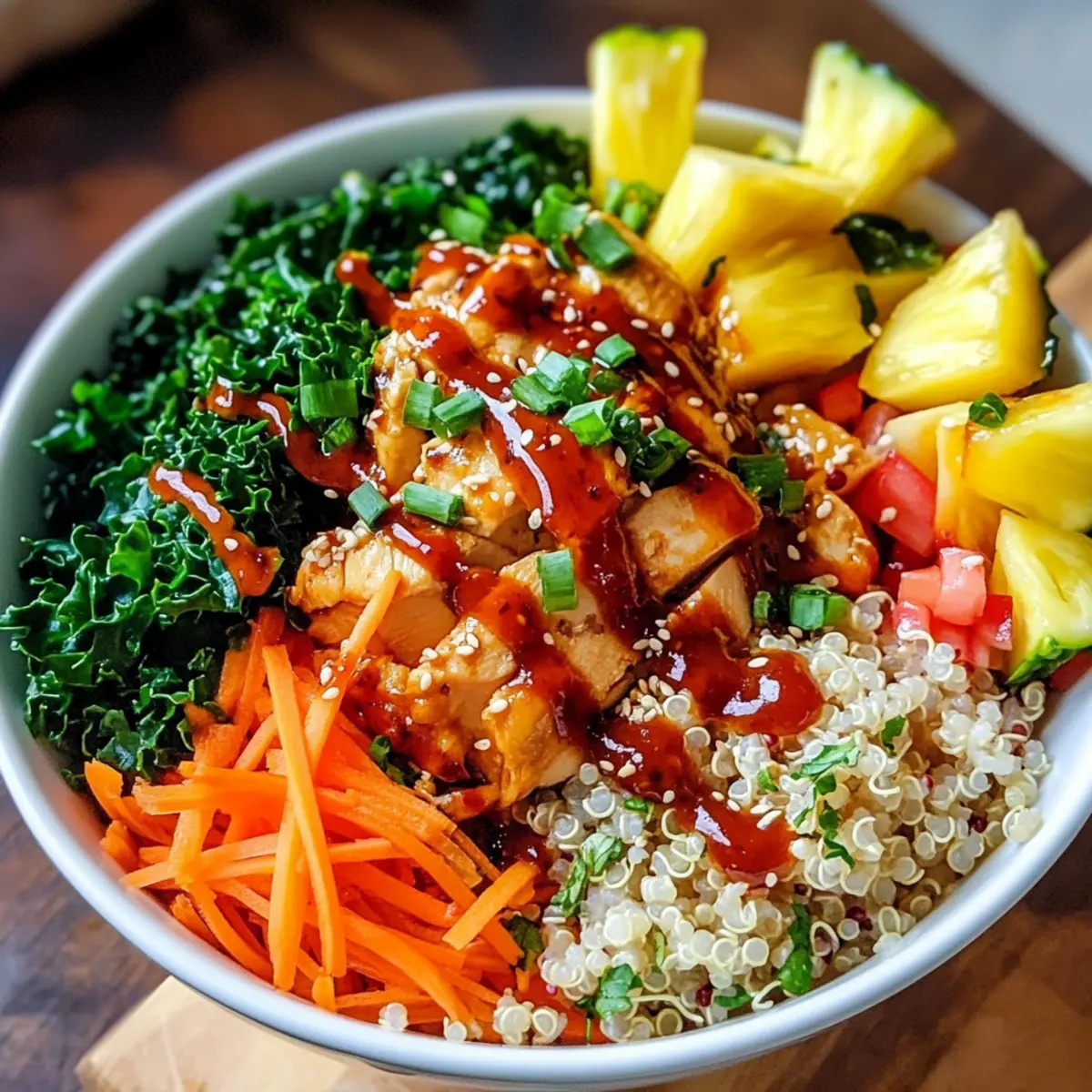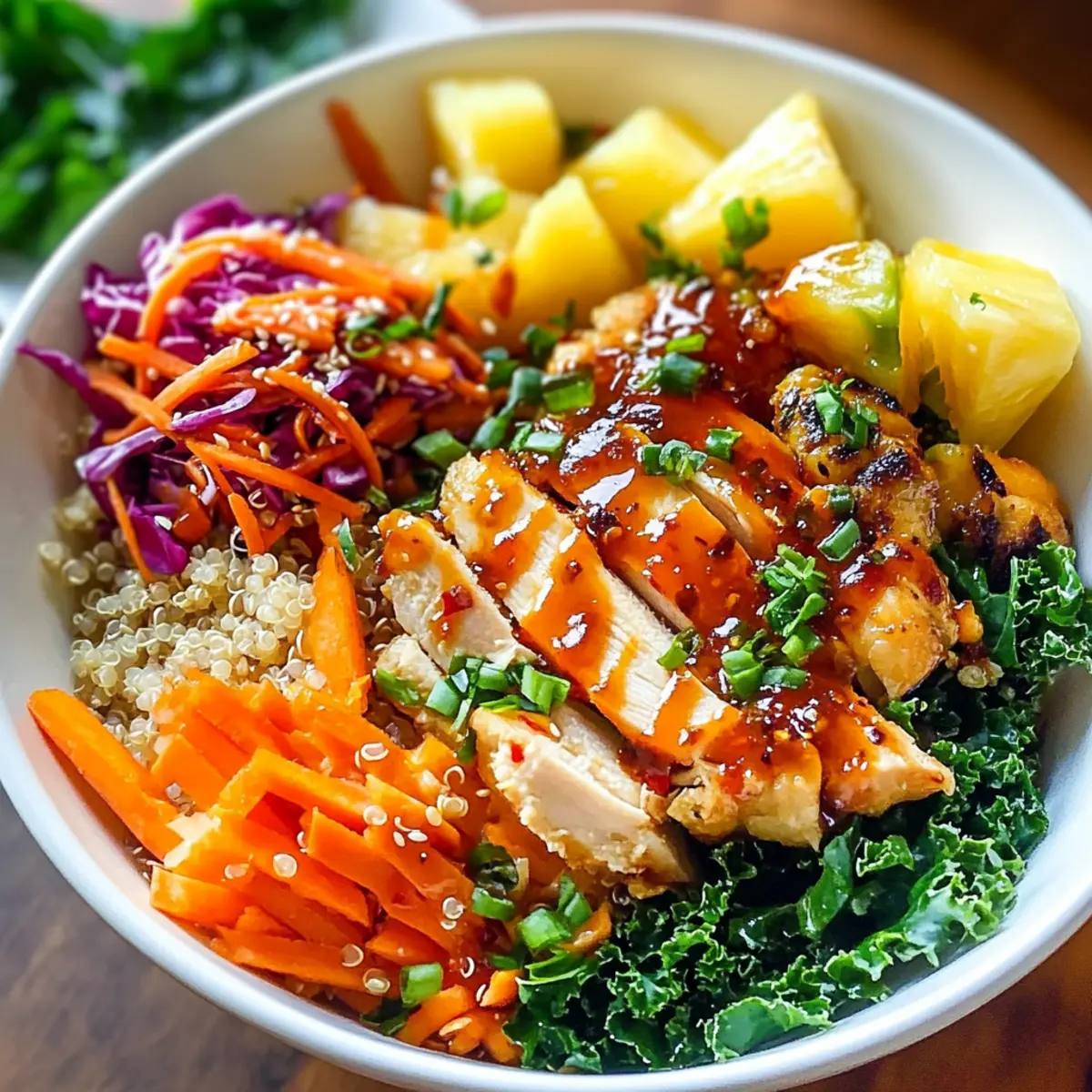 Was für eine Entdeckung! Meine neueste Kreation, die Thai Süß-Chili-Hühnchen Buddha-Schale, hat mir die Augen geöffnet für die Vielzahl an Geschmäckern, die in einer Schüssel vereint werden können. Diese köstliche Mischung aus zarter Quinoa, knackigem Gemüse und saftigem Hühnchen, überzogen mit einer verlockenden süß-scharfen Sauce, ist nicht nur eine wahre Geschmacksexplosion, sondern auch perfekt für alle, die gesund und schnell kochen möchten. In nur wenigen Minuten zubereitet, eignet sich diese Buddha-Schale hervorragend für Meal Prep und bringt jeden Tag frische Vitalität auf den Tisch. Neugierig, wie ihr diese bunte Kombination in eure Küchenerlebnisse integrieren könnt? Bleibt dran, denn das Rezept wartet auf euch! Warum wird diese Buddha-Schale Ihr Favorit? Vielfältige Aromen: Die Thai Süß-Chili-Hühnchen Buddha-Schale kombiniert süßliche und scharfe Aromen, die einfach unwiderstehlich sind. Einfach zuzubereiten: In wenigen Schritten köchelt diese nahrhafte Mahlzeit zusammen, perfekt für geschäftige Wochentage. Gesund und nahrhaft: Vollgepackt mit frischem Gemüse und Protein aus dem Hühnchen sorgt sie für eine ausgewogene Ernährung. Variationsmöglichkeiten: Dank vielseitiger Zutaten könnt ihr spielend leicht verschiedene Proteine oder Getreide verwenden. Entdeckt auch andere Meal Prep Ideen, um eurer Woche noch mehr gesunde Optionen hinzuzufügen! Beliebter Genuss: Diese Schale ist nicht nur köstlich, sondern auch ein Hit bei Freunden und Familie. Thai Süß-Chili-Hühnchen Zutaten • Für eine geschmackvolle Buddha-Schale! Quinoa – Basis der Schale, reich an Protein und bietet eine angenehme Textur. Ersatzzutat: Kann durch Reis, Nudeln oder andere Vollkornprodukte ersetzt werden. Wasser oder Kokosmilch – Wird zum Kochen der Quinoa verwendet und verleiht Geschmack und Cremigkeit. Alternative: Gemüsebrühe sorgt für zusätzlichen Geschmack. Grünkohl – Blattgemüse, das viele Vitamine liefert und für einen frischen Crunch sorgt. Tipp: Mit Öl, Zitronensaft und Salz massieren, um die Textur zu verbessern. Bohnensprossen – Fügen Knusprigkeit und Nährstoffe hinzu. Keine Ersetzungen nötig. Karotte – Bringt Süße und Farbe ins Spiel. Kann durch geriebenen Zucchini ersetzt werden. Ananas – Sorgt für eine süße und tropische Note. Optional: Mit Mango austauschen oder für weniger Süße ganz weglassen. Rote Paprika – Frische und Farbgeber. Ersetzen durch gelbe oder orange Paprika möglich. Rotkohl – Für Crunch und leuchtende Farbe. Kann durch grünen Kohl oder geraspelte Rosenkohl ersetzt werden. Gekochtes Hühnchen – Hauptproteinquelle, kann gerupft oder in Scheiben geschnitten werden. Hinweis: Benutzt für Bequemlichkeit Rotisserie-Hühnchen. Süß-Chili-Dressing – Sorgt für eine süße, scharfe Glasur. Selbstgemacht oder im Laden gekauft verwenden. Sesamsamen – Für zusätzlichen Biss und Geschmack obenauf streuen. Optional: Verwenden Sie zerstoßene Nüsse oder Samen nach Wahl. Frühlingszwiebeln – Für die Garnitur, fügt Frische hinzu. Ersetzungen: Schnittlauch oder Schalotten. Koriander – Frische Kräuter für zusätzlichen Geschmack. Weglassen, wenn unerwünscht, oder durch Petersilie ersetzen. Entdeckt, wie diese köstlichen Zutaten in der Thai Süß-Chili-Hühnchen Buddha-Schale harmonieren und genießt einen gesunden, schnellen Genuss! Schritt-für-Schritt-Anleitung für die Thai Süß-Chili-Hühnchen Buddha-Schalen Step 1: Quinoa kochen Bringen Sie 500 ml Wasser oder Kokosmilch in einem Topf zum Kochen und fügen Sie 200 g Quinoa hinzu. Reduzieren Sie die Hitze auf ein Minimum, decken Sie den Topf ab und lassen Sie die Quinoa 15-20 Minuten köcheln, bis sie weich und das Wasser aufgesogen ist. Rühren Sie gelegentlich um und prüfen Sie, ob die Körner schön fluffig sind. Step 2: Quinoa auflockern Nehmen Sie den Topf vom Herd und lassen Sie die Quinoa ein paar Minuten ruhen. Lockern Sie die Quinoa mit einer Gabel auf, sodass sie eine luftige Konsistenz erhält. Lassen Sie sie anschließend ein wenig abkühlen, während Sie die anderen Zutaten vorbereiten. Step 3: Gemüse vorbereiten Waschen und schneiden Sie während die Quinoa abkühlt die frischen Zutaten: massieren Sie 100 g Grünkohl mit etwas Öl und Zitronensaft für mehr Geschmack und Zartheit, und schneiden Sie 100 g Karotten, 150 g rote Paprika und 100 g Rotkohl in feine Streifen. Bereiten Sie darüber hinaus 200 g Bohnensprossen und 150 g Ananas vor. Step 4: Hühnchen zubereiten Falls Sie noch kein Gekochtes Hühnchen haben, braten Sie 250 g Hühnchenbrust in einer Pfanne mit etwas Öl bei mittlerer Hitze an, bis sie goldbraun und durchgegart ist. Dies dauert etwa 5-7 Minuten. Wenn das Hühnchen gar ist, lassen Sie es kurz abkühlen und zerkleinern Sie es. Step 5: Buddha-Schale zusammenstellen Nehmen Sie eine große Schüssel und fügen Sie die aufgelockerte Quinoa als Basis hinzu. Geben Sie die vorbereiteten Gemüse, das Hühnchen und die Bohnensprossen gleichmäßig darüber. Die bunten Zutaten sollten schön verteilt sein, um eine ansprechende Optik zu schaffen. Step 6: Mit Dressing verfeinern Träufeln Sie großzügig 100 ml süßes Chili-Dressing über die Buddha-Schale, um allen Zutaten einen köstlichen Glanz und Geschmack zu verleihen. Achten Sie darauf, dass das Dressing gleichmäßig verteilt ist. Sie können selbstgemachtes oder gekauftes Dressing verwenden, je nach Vorliebe. Step 7: Garnieren und Servieren Zum Schluss garnieren Sie die Thai Süß-Chili-Hühnchen Buddha-Schalen mit 2 Esslöffeln gerösteten Sesamsamen und frischen, in Ringe geschnittenen Frühlingszwiebeln sowie frischen Koriander. Servieren Sie die Schalen warm oder kalt – je nach Vorliebe können sie sofort genossen oder als Meal Prep verwendet werden. Lagerungstipps für Thai Süß-Chili-Hühnchen Buddha-Schalen Raumtemperatur: Wenn Sie die Buddha-Schalen für kurze Zeit draußen aufbewahren, sollten sie nicht länger als 2 Stunden bei Raumtemperatur stehen bl