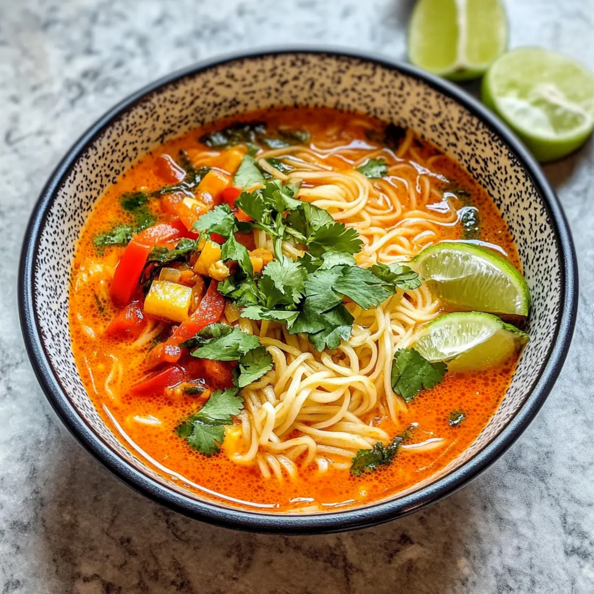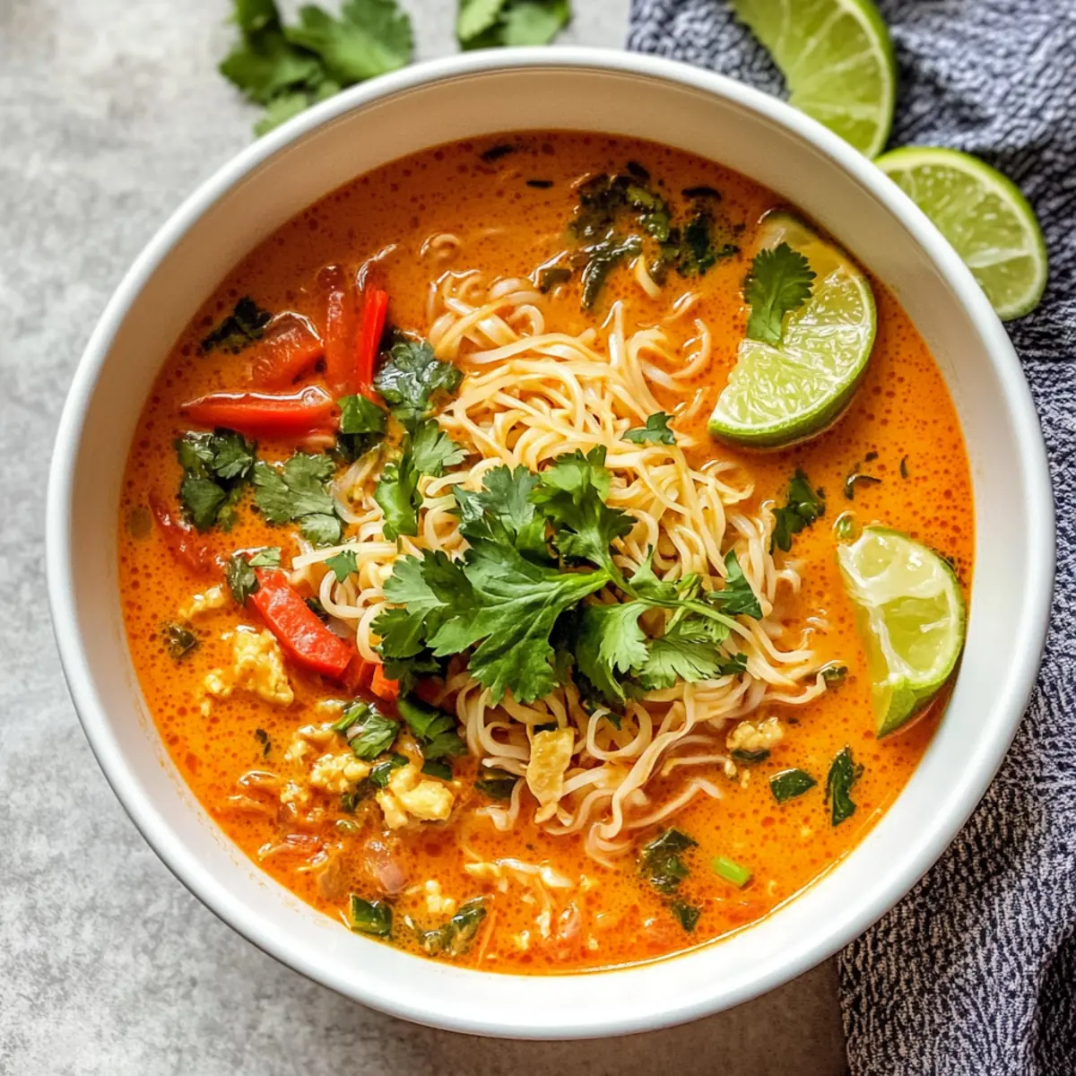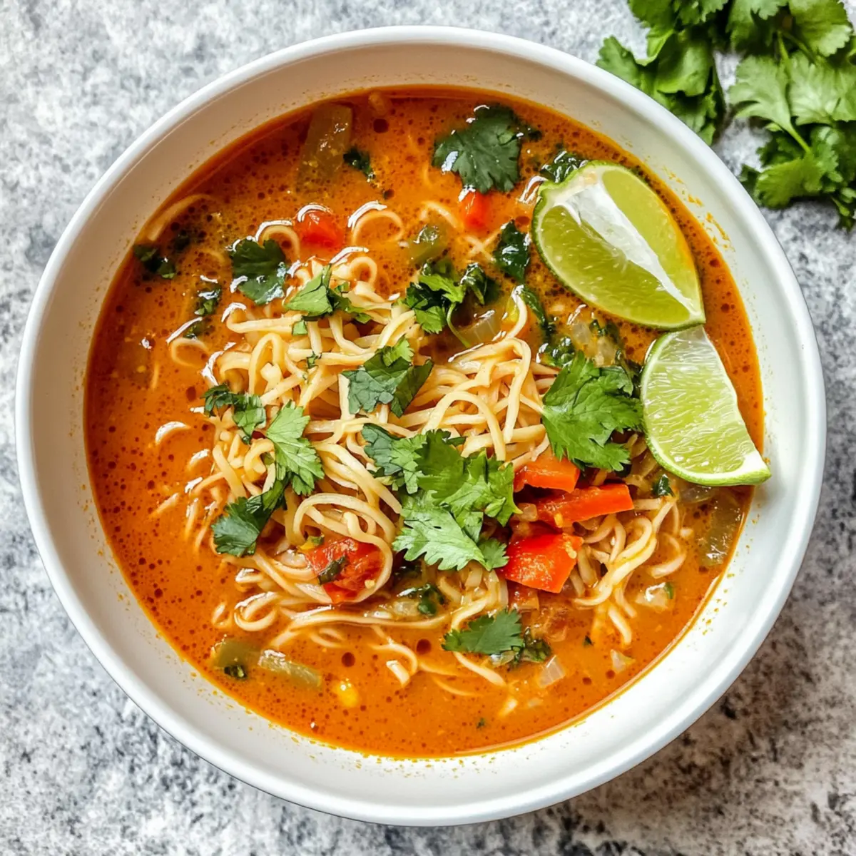 Hast du schon einmal die Sehnsucht nach einer warmen, duftenden Schüssel im Winter verspürt? Wenn es draußen kalt ist und man nach einer gemütlichen Umarmung in Form einer Mahlzeit sucht, ist die thailändische Currysuppe genau das richtige Rezept für dich. Diese wohltuende Suppe vereint süße und würzige Aromen, die dich von innen heraus aufwärmen. Mit einfachen, frischen Zutaten und aromatischer roter Currypaste zauberst du ein schnelles, glutenfreies und milchfreies Gericht, das selbst an hektischen Tagen Freude bereitet. Perfekt für diejenigen, die sich eine gesunde und köstliche Alternative zum Fast Food wünschen! Möchtest du wissen, wie schnell du diese geschmackvolle Suppe zubereiten kannst? Warum solltest du diese Suppe probieren? Einfachheit: Die Zubereitung ist unkompliziert und erfordert nur grundlegende Kochfertigkeiten, was sie perfekt für Kochanfänger macht. Aromatische Aromen: Die Kombination aus roter Currypaste, frischen Gemüsesorten und Kräutern schafft einen tiefen, herzhaften Geschmack, der deine Geschmacksknospen verwöhnt. Schnelle Zubereitungszeit: In weniger als 30 Minuten kannst du eine heiße Schüssel bereitstellen – ideal für hektische Tage! Vielseitig: Ob du Vegetarier bist oder Fleischliebhaber, diese Suppe lässt sich leicht anpassen, etwa mit Hühnchen oder Tofu, um deinen Bedürfnissen gerecht zu werden. Zudem passt sie hervorragend zu Gemüse-Reispapierrollen als Beilage. Gesund und nahrhaft: Glutenfrei und milchfrei ist diese Suppe eine großartige Option für Familien und Freunde mit unterschiedlichen Diätvorlieben. Sie ist eine gesunde Alternative zu typischen Fast Food-Mahlzeiten! Thailändische Currysuppe Zutaten • Für diese gesunde und schmackhafte thailändische Currysuppe brauchst du folgende Zutaten: Für die Brühe Rote Currypaste – sie ist die essentielle Geschmacksbasis; achte darauf, eine Marke ohne Konservierungsstoffe zu wählen. Gemüsebrühe – sie sorgt für eine reiche und herzhafte Basis; verwende eine natriumarme Brühe für bessere Kontrolle des Geschmacks. Für die Nudeln Reisnudeln oder Pad Thai-Nudeln – sie sind die Hauptkohlenhydratquelle und geben der Suppe die gewünschte Textur; andere Nudeltypen können das Ergebnis beeinträchtigen. Für das Gemüse Gelbe Zwiebel – fügt Süße und Tiefe hinzu; du kannst sie für einen milderen Geschmack durch Schalotten ersetzen. Rote Paprika – bringt Farbe und Süße; grüne Paprika sorgen für eine leicht bittere Note als Alternative. Karotten – verleihen der Suppe Süße und Knackigkeit; Babykarotten sind praktisch, achte nur darauf, sie kleiner zu schneiden. Für die Garnitur Koriander – der frische Kräutergeschmack bringt Helligkeit; alternativ kannst du frisches Basilikum verwenden, wenn dir das lieber ist. Limettenviertel – diese sorgen für die nötige Säure, um die Aromen auszubalancieren; alternativ kann auch Zitrone verwendet werden. Entdecke die Vielseitigkeit dieser thailändischen Currysuppe! Sie ist nicht nur ein Genuss für jeden Tag, sondern auch eine gesunde, glutenfreie und milchfreie Option für alle, die der Fast Food Routine entfliehen möchten. Schritt-für-Schritt-Anleitung zur Thailändischen Currysuppe Step 1: Gemüse vorbereiten Zuerst die gelbe Zwiebel, rote Paprika und Karotten in mundgerechte Stücke schneiden. Achte darauf, dass die Karotten gleichmäßig klein sind, damit sie in der Brühe gut garen. Bereite auch alle weiteren Zutaten vor, damit du während des Kochens alles griffbereit hast. Step 2: Gemüse anbraten In einem großen Topf bei mittlerer Hitze etwas Öl erhitzen. Die Zwiebeln hinzufügen und etwa 3-4 Minuten lang anbraten, bis sie glasig sind. Dann die rote Paprika und Karotten hinzufügen und für weitere 2-3 Minuten braten, bis das Gemüse leicht weich wird und duftend ist. Step 3: Currypaste hinzufügen Jetzt ist es Zeit, die rote Currypaste in den Topf zu rühren. Lass die Paste 1-2 Minuten anbraten, bis sie gut duftet und ihre Aromen entfaltet. Achte darauf, dass sie gleichmäßig verteilt ist, um die Geschmäcker optimal zur Geltung zu bringen. Step 4: Brühe und Nudeln kombinieren Gieße die Gemüsebrühe in den Topf und bringe alles zum Kochen. Sobald es kocht, die Reisnudeln hinzufügen und nach Packungsanweisung für etwa 6-8 Minuten kochen, bis sie zart sind. Rühre gelegentlich um, damit die Nudeln nicht am Boden kleben bleiben. Step 5: Fertigstellen und servieren Wenn die Nudeln gar sind, den frischen Koriander kurz vor dem Servieren unter die Suppe rühren. So bleiben die Aromen frisch. Serviere die thailändische Currysuppe heiß in Schalen und garniere sie mit Limettenvierteln für einen spritzigen Abschluss. Expertentipps für die thailändische Currysuppe Perfekte Nudelzubereitung: Achte darauf, die Reisnudeln nur kurz zu kochen, damit sie al dente bleiben und nicht matschig werden. Aromatische Brühe: Verwende hochwertige Gemüsebrühe, um die Aromen der thailändischen Currysuppe richtig zur Geltung zu bringen; natriumarme Brühen schmecken oft besser. Frische Kräuter: Für einen intensiveren Geschmack füge frischen Koriander erst kurz vor dem Servieren hinzu. Gemüsevarianten: Experimentiere mit verschiedenen Gemüsesorten wie Babyspinat oder grünen Bohnen, um zusätzliche Nährstoffe in die Suppe zu bringen. Lagerungstipps: Bewahre die übrige Suppe und die Nudeln getrennt auf, um zu vermeiden, dass die Nudeln weich werden; so bleibt die Konsistenz optimal. Vorbereitung der thailändischen Currysuppe für stressfreie Abende Die thailändische Currysuppe ist perfekt für die Vorbereitung, um dir wertvolle Zeit an geschäftigen Abenden zu sparen! Du kannst das Gemüse (Zwiebeln, Paprika und Karotten) bis zu 24 Stunden im Voraus schneiden und optimal in einem luftdichten Behälter im Kühlschrank aufbewahren, um die Frische zu bewahren. Die Brühe und die Currypaste können ebenfalls bereits vorbereitet und in einem luftdichten Behälter im Kühlschrank für bis zu 3 Tage gelagert w