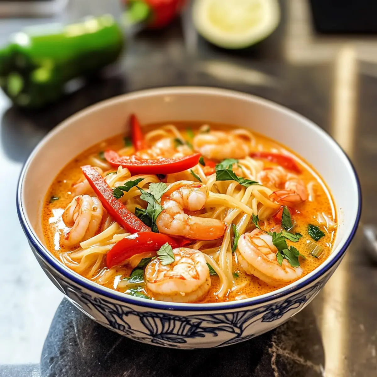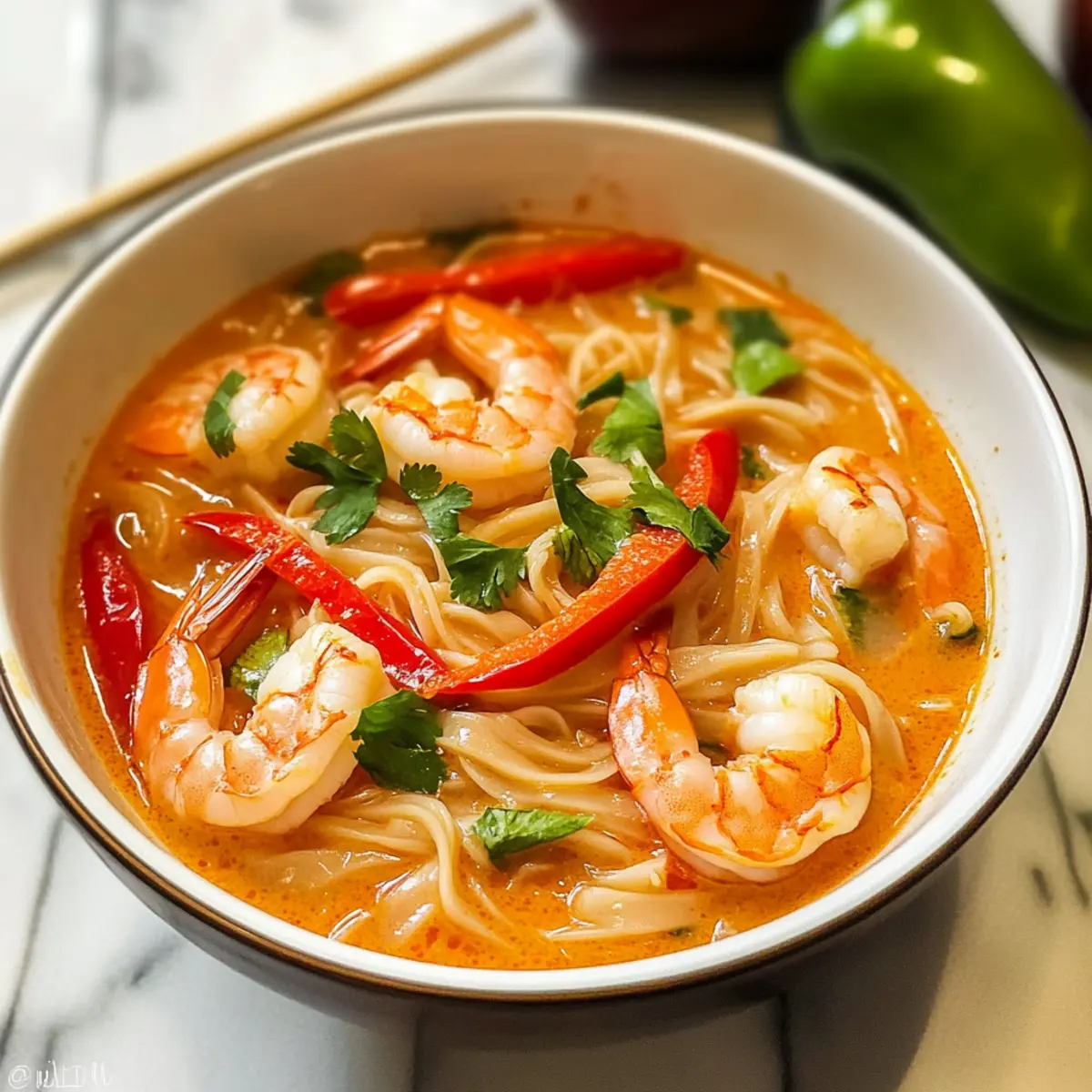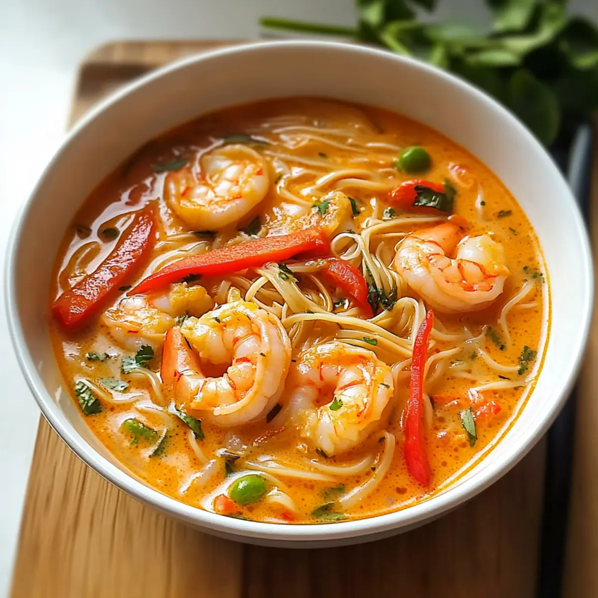 Während ich in der Küche stand und den unverwechselbaren Duft von frischem Ingwer und Kokosmilch ein atme, wurde mir klar, dass ich ein kleines Stück Thailand in meiner eigenen Wohnung zaubern konnte. Diese Thailändische Garnelensuppe mit Nudeln ist nicht nur ein Fest für die Sinne, sondern auch ein schnelles, glutenfreies Gericht, das in nur 15 Minuten zubereitet ist. Perfekt für geschäftige Tage, bietet diese herzliche Suppe nicht nur eine sättigende Mahlzeit, sondern auch eine gesunde Portion an Nährstoffen. Die Kombination aus zartgekochten Garnelen und den geschmeidigen Reisnudeln bringt den Hauch von Abenteuer auf den Tisch – ein Erlebnis, das sowohl erfahrene als auch neugierige Köche begeistert. Bist du bereit, mit mir auf diese kulinarische Reise zu gehen? Warum ist diese Suppe einzigartig? Schnelle Zubereitung: In nur 15 Minuten verwandelst du einfache Zutaten in ein geschmackvolles Gericht, das ideal für hektische Tage ist. Ein Topf, viele Aromen: Diese thailändische Garnelensuppe braucht nur einen Topf und sorgt somit für stressfreies Kochen und einfaches Aufräumen. Gesunde Wahl: Mit frischen Zutaten und einer glutenfreien Basis ist diese Suppe eine gesunde Alternative zu herkömmlichen Fast-Food-Gerichten. Anpassungsfähig: Du kannst sie leicht nach deinem Geschmack anpassen, indem du Hühnerfleisch oder Tofu austauschst. Für mehr Farbe einfach Gemüse wie Karotten oder Erbsen hinzufügen! Vielfältig im Genuss: Perfekt zum Lunch oder Dinner, diese Suppe bringt den Geschmack Thailands direkt auf deinen Tisch und ist sicher ein Hit bei Familie und Freunden. Schau dir auch unsere Tipps zur Variationen der Suppe an, um noch mehr Inspiration zu bekommen! Thailändische Garnelensuppe Zutaten • Für die Suppe Kokosöl – Verleiht der Suppe einen reichhaltigen Geschmack; du kannst auch pflanzliches Öl verwenden, wenn du es leichter magst. Gelbe Zwiebel – Bildet die geschmackliche Basis; keine Substitution empfohlen. Rote Paprika – Fügt Süße und Farbe hinzu; kann durch jede andere Paprika ersetzt oder weggelassen werden. Knoblauch – Hellt die Aromen auf; frischer Knoblauch wird empfohlen, aber Knoblauchpulver kann auch verwendet werden. Frisch geriebener Ingwer – Bringt Frische und Wärme; gemahlener Ingwer ist ein Ersatz, hat aber einen anderen Geschmack. Thailändische rote Currypaste – Gibt der Suppe den charakteristischen würzigen Kick; je nach Vorliebe anpassen. Gemüsebrühe – Bildet die Suppenbasis und vertieft die Aromen; kann durch Hühnerbrühe ersetzt werden. Kokosmilch – Macht die Suppe cremig und süß; Vollfette Kokosmilch ist ideal, niedrige Fettvarianten sind weniger cremig. Fischsauce – Sorgt für umami Tiefe; kann durch Sojasauce ersetzt oder weggelassen werden. Garnelen (geschält und entdarmt) – Die Hauptproteinquelle; schnell garend und aromatisch; kann durch Hähnchen oder Tofu ersetzt werden. Reisnudeln – Fügen Herzhaftigkeit und Textur hinzu; können durch andere Nudelsorten ersetzt werden, jedoch mit unterschiedlicher Kochzeit. Limettensaft – Bringt Frische und balanciert die Aromen; frischer Limettensaft ist optimal, auch flüssiger Zitronensaft ist möglich. Optionale Garnituren – Frischer Koriander, Frühlingszwiebeln und thailändische Chilis steigern Geschmack und Präsentation; individuell anpassbar. Diese thailändische Garnelensuppe mit Nudeln ist ein Fest für die Sinne und lässt sich unkompliziert zubereiten! Schritt-für-Schritt-Anleitung für Thailändische Garnelensuppe mit Nudeln Step 1: Kokosöl erhitzen Erhitze einen großen Topf bei mittlerer Hitze und füge 1 Esslöffel Kokosöl hinzu. Lass das Öl schmelzen, bis es leicht zu glänzen beginnt. Das ist der richtige Zeitpunkt, um mit der Zubereitung zu starten und die Basis für die köstliche thailändische Garnelensuppe mit Nudeln zu schaffen. Step 2: Zwiebel und Paprika anbraten Gib eine gewürfelte gelbe Zwiebel und eine in Streifen geschnittene rote Paprika in den Topf. Brate das Gemüse 4 Minuten lang an, bis es weich und leicht gebräunt ist. Dies sorgt für eine süße, aromatische Grundlage für deine Suppe, die die Aromen gut zur Geltung bringt. Step 3: Knoblauch, Ingwer und Currypaste hinzufügen Füge 2 gewürfelte Knoblauchzehen, 1 Esslöffel frisch geriebenen Ingwer und 2 Esslöffel thailändische rote Currypaste dazu. Brate alles für etwa 1 Minute an, bis die Aromen zu duften beginnen. Hier entfaltet sich der charakteristische Geschmack deiner Thailändischen Garnelensuppe mit Nudeln. Step 4: Brühe und Kokosmilch einrühren Gieße 4 Tassen Gemüsebrühe und 1 Dose Kokosmilch in den Topf. Füge 1 Esslöffel Fischsauce hinzu und bring die Mischung zum Kochen. Lass die Suppe für etwa 2 Minuten sprudelnd kochen, damit sich die Aromen gut vermischen und die Brühe Geschmack annimmt. Step 5: Garnelen und Nudeln kochen Gib 300 Gramm geschälte und entdarmte Garnelen sowie 150 Gramm Reisnudeln in den Topf. Koche alles zusammen für 3-4 Minuten, bis die Garnelen rosa und undurchsichtig sind. Achte darauf, dass die Nudeln weich sind – das zeigt dir, dass die thailändische Garnelensuppe mit Nudeln fertig ist. Step 6: Limettensaft einrühren und servieren Nimm den Topf vom Herd und presse den Saft einer frischen Limette hinein. Rühre alles gut um, um die Aromen zu verbinden. Serviere die Suppe sofort und garniere sie nach Belieben mit frischem Koriander oder Frühlingszwiebeln, um den Geschmack zu verfeinern. Variationen der Thailändischen Garnelensuppe Passe die thailändische Garnelensuppe nach deinem Geschmack an und entdecke neue Aromen und Texturen! Glutenfrei: Verwende glutenfreie Sojasauce anstelle von Fischsauce für eine passende Variante. Vegetarisch: Ersetze die Garnelen durch Tofu oder eine Mischung aus Kichererbsen und Gemüse für eine pflanzenbasierte Option. Schärfer: Füge frische Thai-Chilis oder mehr rote Currypaste hinzu, um die Schärfe zu erhöhen. Gemüsereiche Version: Integriere eine bunte Auswahl an Gemü