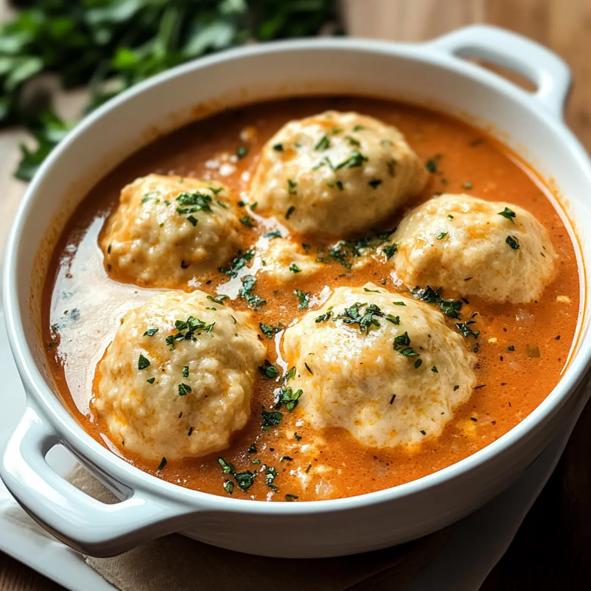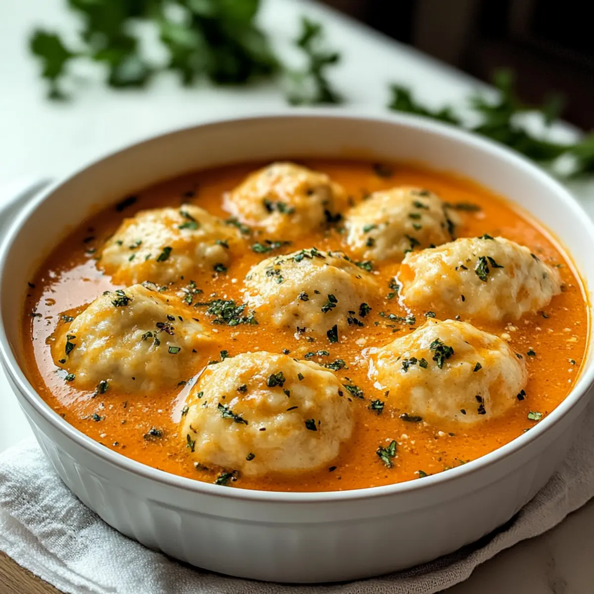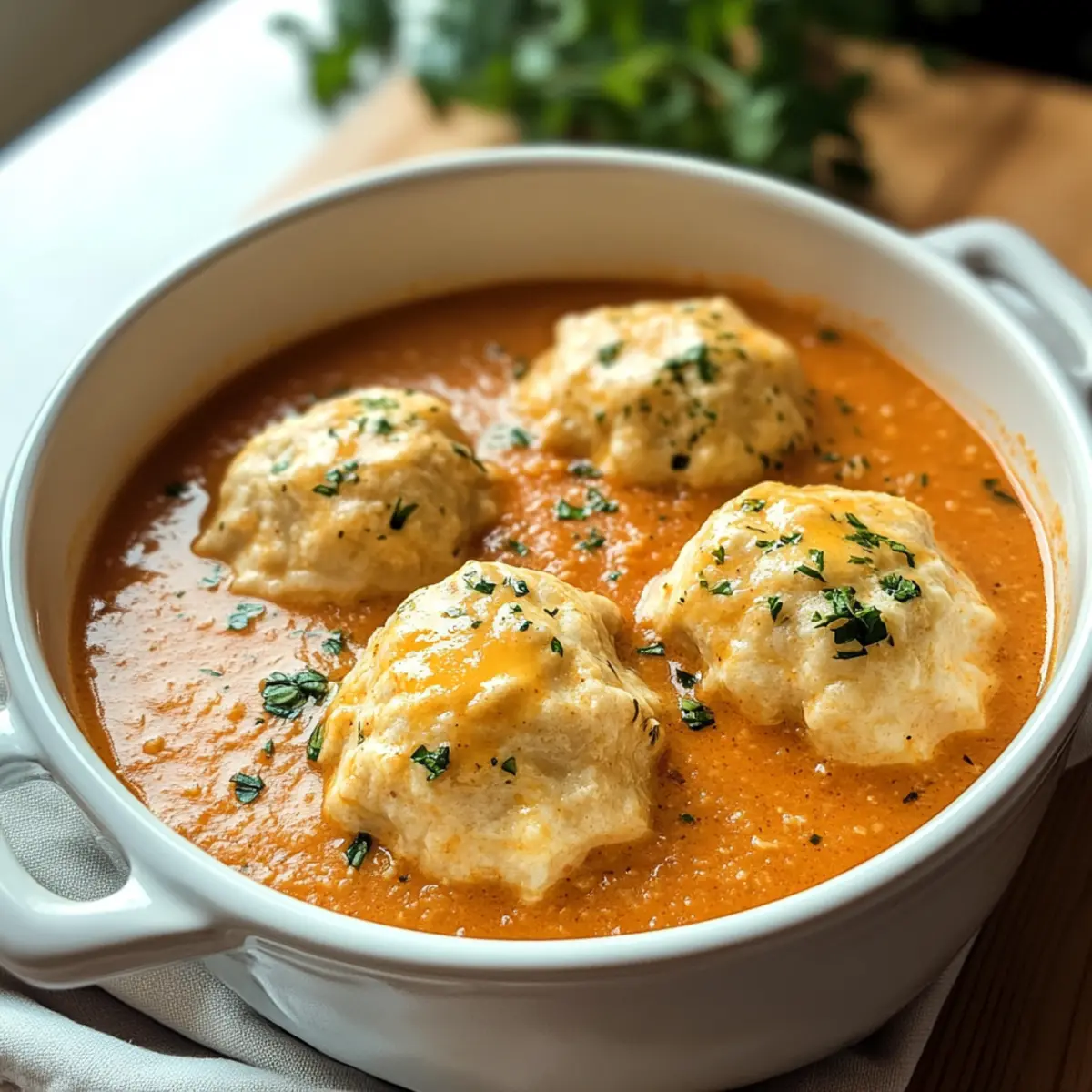 Die kalte Jahreszeit verlangt nach herzhaften Gerichten, die Körper und Seele wärmen. Nichts erfüllt dieses Bedürfnis besser als meine Tomatensuppe mit Cheddar-Bay-Dumplings. Diese Suppe ist nicht nur reich und cremig, sondern die köstlichen, käsigen Dumplings bringen eine ganz neue Dimension in das traditionelle Rezept. Perfekt geeignet, um die ganze Familie zu begeistern, ist dieses Gericht nicht nur schnell zubereitet, sondern auch ein echtes Komfortessen, das in jedem Löffel steckt. Wenn du also nach einer Möglichkeit suchst, die kalten Tage zu überstehen und ein wenig Wärme in deinem Zuhause zu verbreiten, dann lass uns gemeinsam in die Welt dieser köstlichen Suppe eintauchen. Bist du bereit, die Küche zum Ort der Gemütlichkeit zu machen? Warum wirst du dieses Rezept lieben? Wärme und Komfort: In kalten Monaten gibt es nichts Besseres als eine cremige Tomatensuppe, die dich von innen heraus wärmt. Käse-Liebhaber: Die zarten Cheddar-Bay-Dumplings sorgen für eine zusätzliche käsige Geschmacksexplosion in jedem Löffel. Schnell zubereitet: Diese herrliche Suppe lässt sich in kurzer Zeit zubereiten – perfekt für geschäftige Wochentage oder spontane Gäste. Vielseitig anpassbar: Mit einfachen Variationen kannst du sie nach deinem Geschmack anpassen. Füge frische Kräuter hinzu oder experimentiere mit verschiedenen Käsesorten, wie in meinem Rezept für Koreanische BBQ Fleischbällchen. Familiengerecht: Ob als Hauptgericht oder Beilage – diese Suppe ist ein Hit für die gesamte Familie und macht jeden Esstisch zum Ort der Gemütlichkeit. Mach dich bereit, diese köstliche Kombination aus Aromen und Texturen auszuprobieren! Zutaten für Tomatensuppe mit Cheddar-Bay-Dumplings • Hier sind die unverzichtbaren Zutaten für dieses herzliche Komfortessen: Für die Suppe Butter – Sorgt für Reichhaltigkeit und Geschmack im Grundrezept; als leichtere Alternative kann auch Olivenöl verwendet werden. Zwiebel – Fügt der Suppe Süße und Tiefe hinzu; kann durch Schalotten ersetzt werden für einen milderen Geschmack. Mehl – Verdickt die Suppe, indem es eine Mehlschwitze bildet; glutenfreies Mehl kann genutzt werden für eine glutenfreie Variante. Hühnerbrühe – Verleiht eine herzhafte Tiefe; Gemüsebrühe kann als vegetarische Option verwendet werden. Dosentomaten – Das Hauptgeschmackselement der Suppe; jede Art von Dosentomaten (stückig oder püriert) funktioniert. Zucker – Balanciert die Säure der Tomaten aus; kann weggelassen werden, wenn weniger Süße gewünscht ist. Salz und schwarzer Pfeffer – Unverzichtbar zum Nachwürzen. Für die Cheddar-Bay-Dumplings Biskuitmix – Die Grundlage für die Cheddar-Bay-Dumplings; du kannst auch ein eigenes Biskuitrezept verwenden, wenn gewünscht. Cheddar-Käse – Fügt den Dumplings Käsegeschmack hinzu; kann durch eine andere schmelzbare Käsesorte, wie Monterey Jack, ersetzt werden. Würzmischung für Dumplings – Verstärkt den Geschmack der Buttersoße; auch eine eigene Mischung aus Knoblauchpulver, Zwiebelpulver und Kräutern kann verwendet werden. Egal, ob du nach einer herzhaften Mahlzeit suchst oder die Zutaten in einer gesunden, wärmenden Tomatensuppe genießen möchtest – diese Tomatensuppe mit Cheddar-Bay-Dumplings wird dich nicht enttäuschen! Schritt-für-Schritt-Anleitung für Tomatensuppe mit Cheddar-Bay-Dumplings Step 1: Butter schmelzen Smeltet die Butter in einem großen Topf bei mittlerer Hitze. Fügt die gehackte Zwiebel hinzu und sautiert sie etwa 5 Minuten lang, bis sie weich und durchsichtig ist. Diese Basis sorgt für einen reichen Geschmack in der Tomatensuppe und sollte regelmäßig gerührt werden, um ein Anbrennen zu vermeiden. Step 2: Mehlschwitze zubereiten Streut das Mehl über die sautierten Zwiebeln und rührt kräftig um, um eine Mehlschwitze zu bilden. Lasst die Mischung für 1 Minute unter ständigem Rühren köcheln, bis sie leicht goldbraun wird. Diese Mehlschwitze verleiht der Tomatensuppe die gewünschte Cremigkeit und Textur, während der Geschmacksprozess beginnt. Step 3: Brühe und Tomaten hinzufügen Gießt langsam die Hühnerbrühe und die Dosentomaten in den Topf, während ihr kontinuierlich rührt, bis eine glatte, homogene Mischung entsteht. Bringt die Suppe zum Kochen und reduziert dann die Hitze auf eine niedrige Stufe. Lasst die Suppe 15 Minuten köcheln, damit sich die Aromen entfalten können. Step 4: Würzen und abschmecken Fügt Zucker, Salz und schwarzen Pfeffer nach Geschmack hinzu. Überprüft dabei die Konsistenz und den Geschmack der Suppe. Wenn die Tomatensuppe zu säuerlich ist, kann etwas mehr Zucker helfen, die Aromen wieder ins Gleichgewicht zu bringen. Step 5: Suppe pürieren Für eine besondere Cremigkeit könnt ihr Teile der Suppe mit einem Stabmixer pürieren, bis sie schön glatt und samtig ist. Alternativ könnt ihr die Suppe auch portionsweise in einem Standmixer pürieren. Gebt die pürierte Suppe zurück in den Topf und erwärmt sie sanft. Step 6: Biskuitmix zubereiten Bereitet den Biskuitmix gemäß den Anweisungen auf der Verpackung vor. Dies dauert normalerweise nur wenige Minuten. Achtet darauf, die Zutaten gut zu vermengen, um eine gleichmäßige Konsistenz für die Cheddar-Bay-Dumplings zu erreichen. Step 7: Dumplings in die Suppe geben Nehmt mit einem Esslöffel portionsweise den Biskuitteig und lasst ihn sanft in die köchelnde Suppe fallen. Deckt den Topf ab und lasst die Dumplings für 15-20 Minuten kochen, bis sie aufgegangen und durchgegart sind. Achtet darauf, die Dumplings nicht zu überladen, damit sie gleichmäßig garen. Step 8: Butter und Gewürze anrühren In der Zwischenzeit schmelzt 2 Esslöffel Butter in einem kleinen Topf und mischt die Gewürzmischung für Dumplings hinein. Rührt, bis alles gut vermengt ist. Diese Butter sorgt für zusätzlichen Geschmack und Glanz bei den Dumplings. Step 9: Servieren Nehmt den Topf vom Herd und gebt die Dumplings vorsichtig auf die heiße Suppe. Serviert die Tomatensuppe mit 