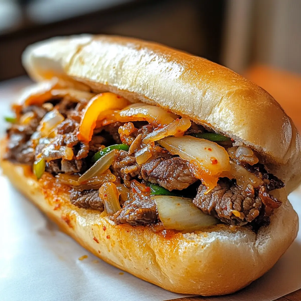 Entdecke das unwiderstehliche koreanisch inspirierte Kimchi Bulgogi Cheesesteak – eine köstliche Fusion für gesellige Abende.