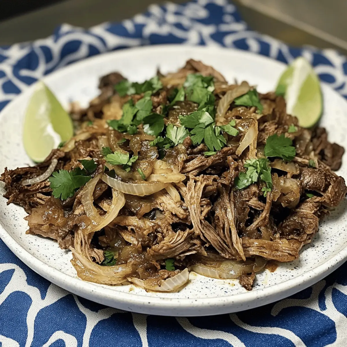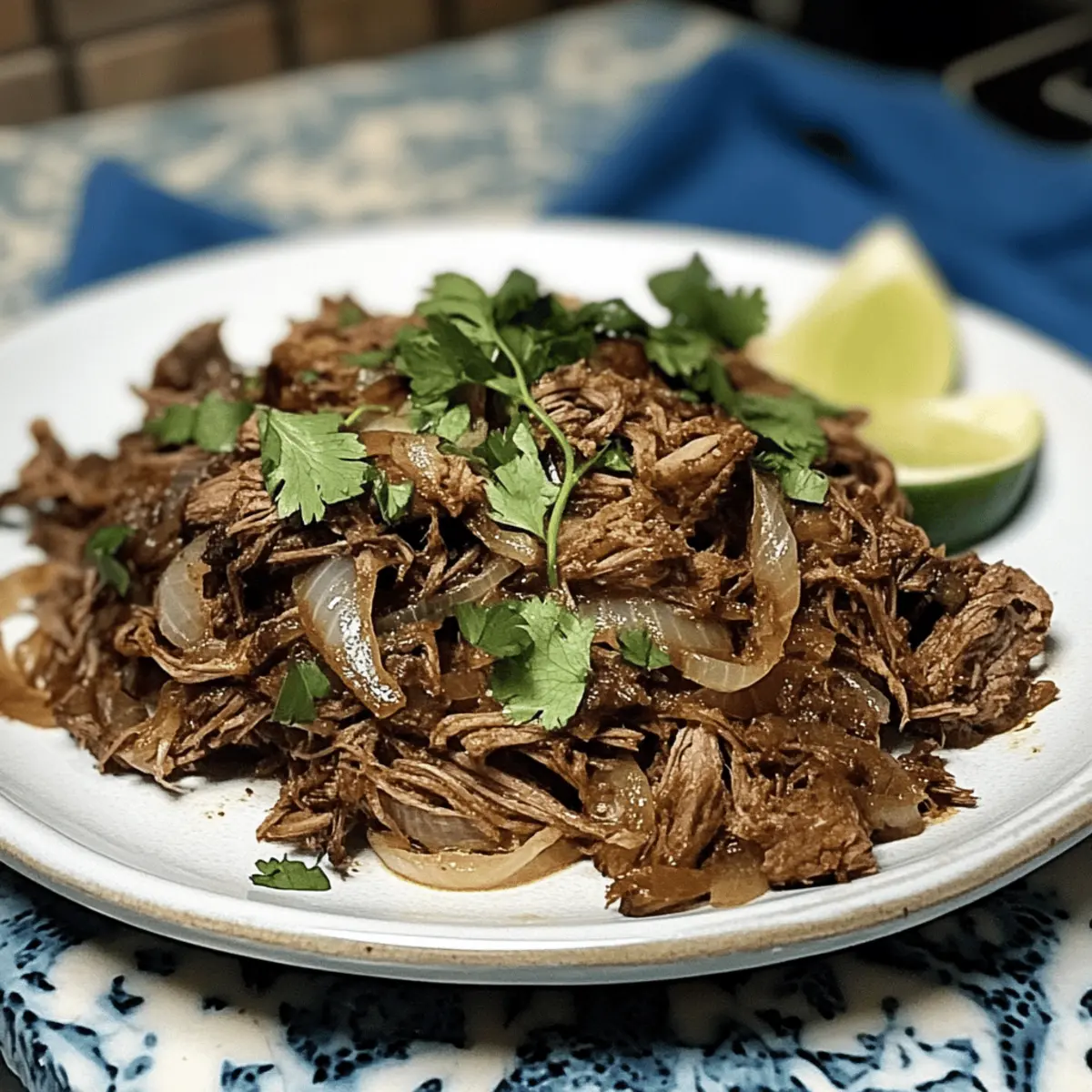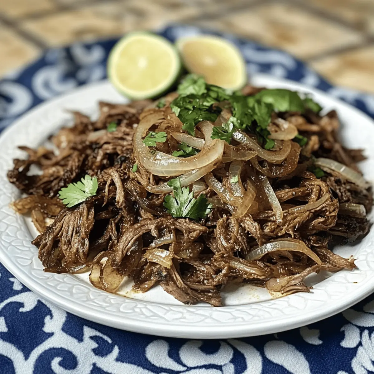 Während ich die köstlichen Düfte der kubanischen Küche erlebe, trifft mich plötzlich der Gusto, etwas Außergewöhnliches zu zaubern. Mein Herz schlägt für Vaca Frita, das köstliche Gericht, das „gebratene Kuh“ bedeutet und es schafft, jeden Abend in ein festliches Erlebnis zu verwandeln. Mit zartem, mariniertem Rindfleisch, das in einer Mischung aus Knoblauch, Limetten- und Orangensaft eingelegt wird, und dann perfekt knusprig angebratenen Zwiebeln, stammt diese einfache, aber geschmackvolle Hauptspeise direkt aus den herzlichen Küchen Kubas. Vaca Frita ist nicht nur ein schneller Genuss nach einem langen Tag, sondern auch ein wahrer Publikumsliebling, der bei Familienfeiern und gemeinsamen Essen strahlt. Seid ihr bereit, gemeinsam neue kulinarische Höhen zu erklimmen? Warum ist Vaca Frita so besonders? Einfachheit: Die Zubereitung von Vaca Frita ist unkompliziert und erfordert nur grundlegende Kochkenntnisse. Mit wenigen Zutaten zaubern Sie ein auténtisches Gericht, das Eindruck hinterlässt. Reichhaltiger Geschmack: Die perfekte Kombination aus marinierter, zartem Rindfleisch und knusprigen Zwiebeln sorgt für ein Geschmacksprofil, das sowohl Liebhaber der kubanischen Küche als auch Neulinge begeistert. Vielfalt: Ob als Hauptgericht mit Reis und Bohnen oder als Teil eines Buffets, Vaca Frita passt sich jeder Gelegenheit an und lässt sich wunderbar variieren, zum Beispiel als Pollo Vaca Frita mit Hähnchen. Schneller Genuss: Diese köstliche Speise lässt sich wunderbar vorbereiten und ist somit ideal für stressige Wochentage oder spontane Zusammenkünfte. Familienfavorit: Vaca Frita bringt das Familienessen zusammen und lässt jede Mahlzeit zu einem besonderen Ereignis werden, das alle lieben werden. Verpassen Sie nicht die Gelegenheit, dieses kubanische Klassikgericht selbst zuzubereiten und vielleicht sogar mit einer frischen Persille zu garnieren oder ein paar Streifen Avocado hinzuzufügen! Zutaten für Vaca Frita • Entdecken Sie die verschiedenen Zutaten, die für dieses köstliche Gericht erforderlich sind. Für das Fleisch Flank Steak oder magerer Brisket (900 g) – Hauptproteinquelle mit intensivem Geschmack; ersetzt durch Sirloin für eine leichtere Variante. Für die Marinade Knoblauchzehen (6, gehackt) – verstärkt den Geschmack; passen Sie die Menge für einen milden Geschmack an. Limetten (Saft und Schale von 2) – sorgt für die nötige Säure und Frische; kann durch Zitronensaft ersetzt werden. Orangen (Saft und Schale von 1) – fügt Süße und Zitrusnoten hinzu; verwenden Sie Mandarinen für einen anderen Geschmack. Sazon (1 Esslöffel) – Gewürzmischung, die das Gesamtgeschmackprofil verstärkt; alternativ eine Mischung aus Kreuzkümmel, Knoblauchpulver und Paprika benutzen. Lorbeerblätter (2) – geben dem Gericht erdige Aromen; normalerweise nicht ersetzbar, kann aber weggelassen werden. Für das Braten Gelbe Zwiebeln (4 große, geteilt) – bringen Süße und Tiefe beim Karamellisieren; statt dessen können Sie Schalotten für einen milderen Geschmack verwenden. Olivenöl (120 ml, geteilt) – sorgt für Fettgehalt und Geschmack; können durch neutrales Öl ersetzt werden. Salz & Pfeffer (3 Teelöffel zusammen) – wichtig zur Würze, nach Geschmack anpassen. Optional Hühnchenbrühe (60 ml) – fügt Feuchtigkeit und Geschmacksvertiefung hinzu; kann durch Gemüsebrühe ersetzt werden. Petersilie (1/2 Tasse, fein gehackt) – für Garnitur und Frische; kann für eine einfachere Präsentation weggelassen werden. Genießen Sie die Zubereitung dieser hervorragenden Vaca Frita und lassen Sie sich von den Aromen der kubanischen Küche verzaubern! Schritt-für-Schritt-Anleitung für Klassische Cuban Vaca Frita Step 1: Rindfleisch marinieren Mischen Sie das Flank Steak mit Limettensaft, Orangensaft, gehacktem Knoblauch, Sazon, Lorbeerblättern, Salz und Pfeffer in einer großen Schüssel. Stellen Sie sicher, dass das Fleisch gut bedeckt ist. Lassen Sie es mindestens 2 Stunden im Kühlschrank marinieren, idealerweise über Nacht für einen intensiveren Geschmack. Step 2: Rindfleisch kochen Füllen Sie einen großen Topf mit Wasser und fügen Sie das marinierte Rindfleisch hinzu. Bringen Sie das Wasser zum Kochen und reduzieren Sie dann die Hitze, um es etwa 1 bis 1,5 Stunden bei mittlerer Hitze sanft köcheln zu lassen. Das Fleisch ist gar, wenn es zart ist und leicht auseinanderfällt. Step 3: Rindfleisch zerkleinern Nehmen Sie das Rindfleisch aus dem Topf und lassen Sie es leicht abkühlen. Mit zwei Gabeln zerkleinern Sie das Fleisch gründlich, bis Sie feine Stücke haben. Dieser Schritt ist wichtig, um die Zartheit in jedem Bissen der Vaca Frita zu gewährleisten. Step 4: Zwiebeln sautieren Erhitzen Sie in einer großen Pfanne 60 ml Olivenöl bei mittlerer Hitze. Fügen Sie die Hälfte der geschnittenen gelben Zwiebeln hinzu und sautieren Sie sie, bis sie weich und leicht goldbraun sind, was etwa 5 bis 7 Minuten dauert. Die Zwiebeln verleihen der Vaca Frita eine süße und aromatische Note. Step 5: Rindfleisch knusprig braten Fügen Sie das zerkleinerte Rindfleisch zu der Pfanne mit den Zwiebeln hinzu und mischen Sie alles gut durch. Erhöhen Sie die Hitze auf hoch und braten Sie das Fleisch für etwa 5 bis 10 Minuten, bis die Ränder knusprig sind und eine goldbraune Farbe annehmen. Achten Sie darauf, gelegentlich umzurühren, damit es nicht anbrennt. Step 6: Servieren Garnieren Sie die fertige Vaca Frita mit fein gehackter Petersilie und servieren Sie sie heiß. Diese köstliche Speise passt hervorragend zu Reis, Bohnen oder Tostones. Genießen Sie die Aromen und die gesellige Atmosphäre, die dieses traditionelle kubanische Gericht mit sich bringt. Vaca Frita Variationen & Alternativen Es gibt so viele kreative Wege, um Vaca Frita anzupassen und zu variieren! Lassen Sie Ihrer Fantasie freien Lauf und erleben Sie die Aromen auf eine neue Art und Weise. Hähnchen statt Rind: Verwenden Sie zartes Hähnchenfleisch für eine leichtere Option 