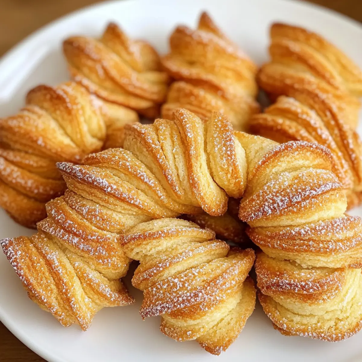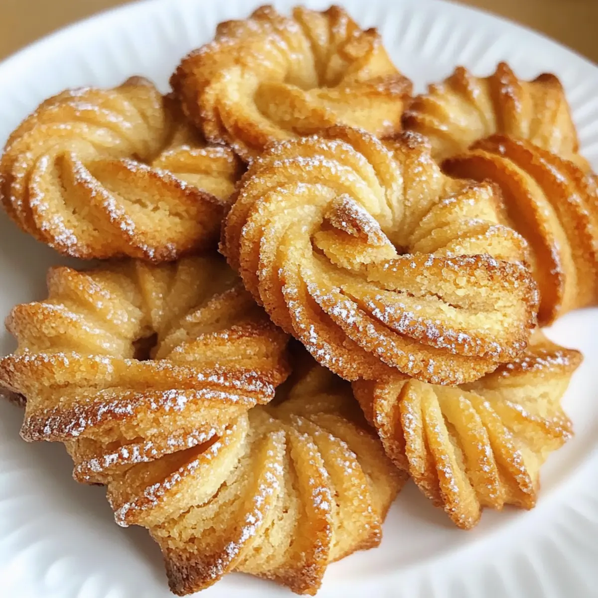 In einer kleinen, gemütlichen Küche, wo der Duft von frisch gebackenem Gebäck die Luft erfüllt, entstehen Erinnerungen, die ein Leben lang bleiben. Die Verdrehte Kekse mit eingewalztem Zucker sind nicht nur ein Rezept, sondern ein Stück meiner Kindheit, das während jeder Weihnachtszeit wieder zum Leben erweckt wird. Diese köstlichen Kekse vereinen die knusprige Karamellschicht außen mit einem weichen, geschichteten Teig innen, der einfach unwiderstehlich ist. Perfekt für all jene, die sich eine Auszeit vom hektischen Alltag gönnen wollen, sind sie ein echter Genuss und zudem kinderleicht zuzubereiten. Ob als süßer Snack zu einer Tasse Kaffee oder als Highlight auf dem festlichen Plätzchenteller – diese Kekse werden Groß und Klein gleichermaßen begeistern. Bereit, den Zauber selbst zu erleben? Lass uns gemeinsam backen! Warum sind diese Kekse so besonders? Einzigartiger Geschmack: Die Kombination aus knusprigem Karamell und einem weichen, lagerten Teig macht jeden Biss zu einem Erlebnis. Einfache Zubereitung: Die Schritte sind simple und erfordern nur wenige Zutaten, die du wahrscheinlich bereits zu Hause hast. Perfekt für Feste: Ob zu Weihnachten oder gemütlichen Nachmittagen, diese Kekse sind der Hit auf jedem Plätzchenteller! Vielseitig: Du kannst mit verschiedenen Zuckern und Aromen experimentieren – wie wäre es mit einem Hauch Zimt für eine zusätzliche Note? Tradition: Diese Kekse sind ein Stück Heimat, das Geschichten aus der Kindheit in sich trägt und Generationen verbindet. Lass dich von der Magie dieser Verdrehte Kekse ~ Mit eingewalztem Zucker verzaubern! Verdrehte Kekse Zutaten • Diese Zutaten bilden die Grundlage für die köstlichen Verdrehte Kekse mit eingewalztem Zucker. Für den Teig Aktive Trockenhefe – sorgt für das Aufgehen der Kekse und eine luftige Textur; nicht mit Schnellhefepulver tauschen. Warmes Wasser – aktiviert die Hefe; idealerweise zwischen 37-43°C verwenden. Zucker – sorgt für Süße und hilft bei der Karamellisierung; vanillierter Zucker verstärkt den Geschmack. Weißes Mehl – gibt den Keksen Struktur; genau abmessen für bestes Ergebnis. Kochsalz – verstärkt den Geschmack und stärkt die Glutenstruktur. Gesalzene Butter – bringt Reichhaltigkeit und eine zarte Konsistenz; gut gekühlt verwenden. Große Eier – binden die Zutaten und sorgen für Feuchtigkeit. Saure Sahne – sorgt für die nötige Feuchtigkeit und einen leichten Säurekick; kann durch Joghurt ersetzt werden. Vanilleextrakt – verleiht den Keksen ein zusätzliches Aroma. Für die Zuckerschicht Vanillezucker – verstärkt den süßen Geschmack; kann durch Zimtzucker für eine besondere Note ersetzt werden. Kristallzucker – sorgt für die knusprige Karamellschicht auf der Außenseite der Kekse. Mit diesen Zutaten wirst du die magischen Verdrehte Kekse ~ Mit eingewalztem Zucker kreieren, die nicht nur lecker sind, sondern auch Erinnerungen wecken! Schritt-für-Schritt-Anleitung für Verdrehte Kekse ~ Mit eingewalztem Zucker Step 1: Hefe aktivieren In einer kleinen Schüssel das warme Wasser (37-43°C) mit der aktiven Trockenhefe und einem Teelöffel Zucker vermischen. Rühren und etwa 10 Minuten stehen lassen, bis die Mischung schäumt. Dies zeigt an, dass die Hefe aktiv ist und die Grundlage für die luftigen Verdrehte Kekse bildet. Step 2: Trockene Zutaten vorbereiten In einer großen Schüssel das weiße Mehl und das Kochsalz vermengen. Die gekühlte, gesalzene Butter in kleine Stücke schneiden und mit einem Pastry Cutter oder den Fingern einarbeiten, bis die Masse die Konsistenz von grobem Reis hat. Dies schafft eine lockere Grundlage für die Kekse. Step 3: Mischungen kombinieren Gib die schaumige Hefemischung in die Schüssel mit den trockenen Zutaten. Füge die großen Eier, die saure Sahne und den Vanilleextrakt hinzu. Mit einem Holzlöffel oder den Händen vermengen, bis ein weicher Teig entsteht, der gut zusammenhält und nicht mehr an den Händen klebt. Step 4: Teig kühlen Teig in zwei gleich große Portionen aufteilen und zu Patties formen. In Frischhaltefolie einwickeln und für mindestens 4 Stunden oder über Nacht im Kühlschrank kühlen. Dadurch wird der Teig fester und erleichtert das Rollen und Falten in den nächsten Schritten. Step 5: Zuckermischung vorbereiten In einer separaten Schüssel den Vanillezucker mit dem Kristallzucker vermischen. Diese Mischung ist essenziell für die Zuckerschicht der Verdrehte Kekse und verleiht ihnen den knusprigen Karamellüberzug, der sie so unwiderstehlich macht. Step 6: Teig ausrollen Eine Arbeitsfläche mit der Hälfte der vorbereiteten Zuckermischung bestreuen und ein Teigpatty darauf ausrollen, bis ein Rechteck von etwa 30×40 cm entsteht. Dies sorgt dafür, dass der Zucker gut in den Teig eingearbeitet wird, was für geschmackliche Tiefe sorgt. Step 7: Zucker einkneten Die Ränder des ausgerollten Teigs umklappen, um die Zuckermischung zu umschließen. Dann den Teig in Drittel falten, erneut ausrollen und diesen Schritt insgesamt drei Mal wiederholen. Dies schafft die köstlichen Schichten, die die Verdrehte Kekse so besonders machen. Step 8: Schneiden und Formen Den gefalteten Teig in schmale Streifen schneiden und jeden Streifen zweimal verdrehen. Die Gedrehten Kekse auf ein mit Folie belegtes Blech legen und darauf achten, dass sie genügend Platz zum Aufgehen haben. Diese Vorbereitung ist entscheidend für die gleichmäßige Backzeit und die Form der Kekse. Step 9: Backen Den Ofen auf 190°C vorheizen. Die Kekse umgekehrt auf ein weiteres Blech legen (doppelte Bestuhlung) und 15-20 Minuten backen, bis sie goldbraun sind. Dies sorgt dafür, dass die Kekse gleichmäßig garen und eine schöne Farbe erhalten. Step 10: Abkühlen Die Kekse sofort nach dem Backen auf ein Kuchengitter übertragen, damit sie nicht am Blech kleben bleiben. Lass sie dort vollständig abkühlen, damit die knusprige Karamellschicht perfekt zur Geltung kommt. Diese Verdrehte Kekse ~ Mit eingewalztem Zucker we