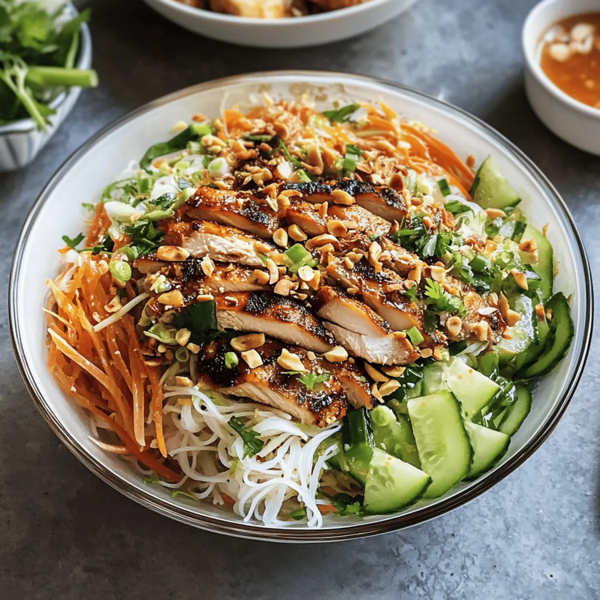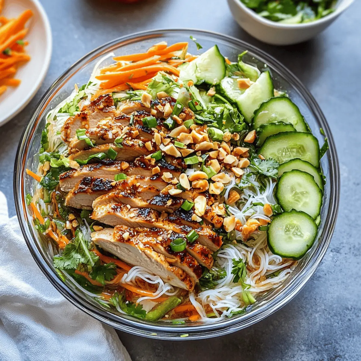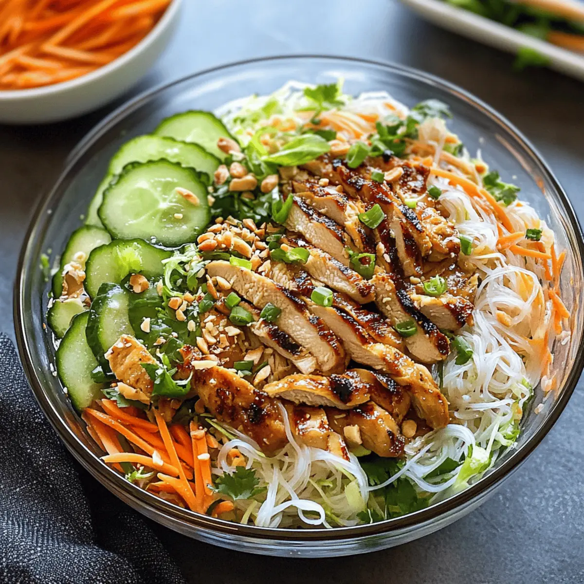 Es war ein heißer Sommertag, als ich in meiner Küche experimentierte, um ein leichtes und erfrischendes Gericht zu schaffen. Genau dann kam mir der Gedanke an einen vietnamesischen Nudelsalat mit smoky gegrilltem Hühnchen. Diese köstliche Kombination aus zarten Vermicelli-Nudeln, knackigem Gemüse und dem rauchigen Aroma des Huhns wird in einem würzigen Dressing serviert, das perfekt für laue Abende ist. Mit nur wenigen Zutaten lässt sich dieser gesunde Sommer-Salat im Handumdrehen zubereiten und bietet die perfekte Gelegenheit, die Grillkünste aufzufrischen. Egal, ob als vollwertige Hauptspeise oder als gesunder Snack für die Mittagspause – dieser Nudelsalat ist ein wahrer Genuss! Neugierig auf die Zubereitung? Lasst uns gleich loslegen! Warum ist dieser Salat so besonders? Frische Aromen: Der vietnamesische Nudelsalat präsentiert eine harmonische Mischung aus frischem Gemüse und zartem Hühnchen, die jeden Bissen zu einem Genuss machen. Einfach zuzubereiten: Die Zubereitung ist kinderleicht und benötigt nur wenige grundlegende Kochfähigkeiten, perfekt für alle, die in der Küche experimenting möchten. Gesunde Wahl: Mit einer Vielzahl an frischen Zutaten ist dieser Salat nicht nur lecker, sondern auch nährstoffreich und ideal für sommerliche Tage. Vielseitig: Tauschen Sie das Hühnchen gegen Garnelen oder Tofu aus, um verschiedene Geschmäcker auszuprobieren. Diese Flexibilität macht ihn zu einem idealen Gericht für jeden Gaumen! Fürs schnelle Essen: Die Reste können problemlos im Kühlschrank aufbewahrt werden, was ihn zu einer hervorragenden Option für schnelle Mittagessen in der Woche macht. Lassen Sie sich von diesem Rezept inspirieren und kombinieren Sie es mit anderen leckeren Gerichten wie Chili Nudeln Mit, um Ihren Speiseplan zu bereichern! Die Zutaten für den Vietnamese Nudel-Salat • Für das Dressing Reiswein-Essig – sorgt für eine angenehme Säure; unbedingt für den authentischen Geschmack verwenden, kann auch durch Apfelessig ersetzt werden. Honig oder Agavendicksaft – fügt eine süße Note hinzu, um die Säure des Dressings auszugleichen; Honig sorgt für eine komplexere Geschmacksnuance. Sojasauce – bringt umami Tiefe ins Spiel; verwenden Sie glutenfreie Sojasauce für eine glutenfreundliche Option. Süße Chilisauce – verleiht dem Dressing Süße und Schärfe; die Menge kann nach Geschmack angepasst oder für eine mildere Variante ganz weggelassen werden. Knoblauch – intensiviert den Geschmack mit seinem aromatischen Profil; frischer Knoblauch ist für den besten Geschmack empfehlenswert. Frischer geriebener Ingwer – bringt Wärme und Frische ins Dressing; kann durch gemahlenen Ingwer ersetzt werden, frischer ist jedoch vorzuziehen. Extra-natives Olivenöl – dient dem Würzen des Huhns und des Dressings; kann durch Sesamöl für ein anderes Aroma ersetzt werden. • Für den Salat Boneless Skinless Chicken Thighs – die Hauptproteinquelle mit intensivem Geschmack; Hühnerbrust kann für eine magerere Option verwendet werden. Vermicelli-Reisnudeln – die Basis des Salats, leicht und zäh; können durch Engelshaar-Nudeln ersetzt werden, wenn Vermicelli nicht verfügbar ist. Karotten (julienniert) – fügen Süße und Knusprigkeit hinzu; andere saisonale Gemüse können ebenfalls verwendet werden. Gurke (julienniert) – sorgt für einen erfrischenden Biss; jede knusprige Gurkensorte ist geeignet. Bohnensprossen – bringen Frische und Textur; können weggelassen werden, sind aber eine köstliche Ergänzung. Frische Frühlingszwiebeln, Minze und Koriander – sind entscheidende Kräuter für Geschmack und Frische; passen Sie die Kräuter je nach Verfügbarkeit und Vorliebe an. Gehackte geröstete Erdnüsse – fügen Knusprigkeit und nussigen Geschmack hinzu; können für eine nussfreie Variante weggelassen werden. Dieser Vietnamese Nudelsalat mit grilled chicken ist nicht nur gesund, sondern auch ein wahrer Genuss, den man an heißen Sommertagen erleben sollte! Schritt-für-Schritt-Anleitung für den Vietnamese Nudel-Salat mit smoky gegrilltem Hühnchen Step 1: Dressing vorbereiten Mischen Sie Reiswein-Essig, Honig, Sojasauce, süße Chilisauce, Knoblauch und frischen Ingwer in einem Mixer. Mixen Sie die Zutaten, bis eine glatte Sauce entsteht. Abschmecken und nach Ihrem Geschmack mit Salz und Pfeffer würzen. Stellen Sie das Dressing in den Kühlschrank und lassen Sie es mindestens 20 Minuten ziehen, damit sich die Aromen gut entfalten können. Step 2: Hühnchen grillen Reiben Sie die entbeinten und hautlosen Hühnerschenkel mit etwas extra-nativem Olivenöl ein und würzen Sie sie großzügig mit Salz und Pfeffer. Heizen Sie Ihren Grill oder Grillpfanne auf mittelhohe Hitze vor und grillen Sie das Hühnchen für etwa 6-7 Minuten pro Seite, oder bis die innere Temperatur 75 °C erreicht. Nach dem Grillen das Hühnchen mit Hoisinsauce bestreichen und in Scheiben schneiden. Step 3: Nudeln kochen Bereiten Sie die Vermicelli-Reisnudeln gemäß den Anweisungen auf der Verpackung vor. In der Regel lassen Sie die Nudeln 4-5 Minuten in kochendem Wasser ziehen, bis sie weich sind. Gießen Sie die Nudeln ab und spülen Sie sie unter kaltem Wasser ab, um die Garzeit zu stoppen und sie abzukühlen. Legen Sie die Nudeln beiseite, während Sie die anderen Zutaten vorbereiten. Step 4: Zutaten kombinieren In einer großen Schüssel die abgekühlten Vermicelli-Nudeln, die juliennierten Karotten, Gurken, Bohnensprossen und die geschnittenen Kräuter wie Minze und Koriander vermengen. Fügen Sie die gegrillten Hühnchenstücke sowie die gehackten Erdnüsse hinzu. Achten Sie darauf, alles gleichmäßig zu mischen, sodass sich die frischen Zutaten gut verteilen. Step 5: Salat anrichten Gießen Sie das vorbereitete Dressing über die Nudel-Gemüse-Mischung. Vorsichtig alles durcheinanderheben, damit der Salat gleichmäßig mit dem Dressing überzogen wird. Lassen Sie den Salat zwischen 10 und 15 Minuten ruhen, damit die Aromen gut durchziehen. Serv