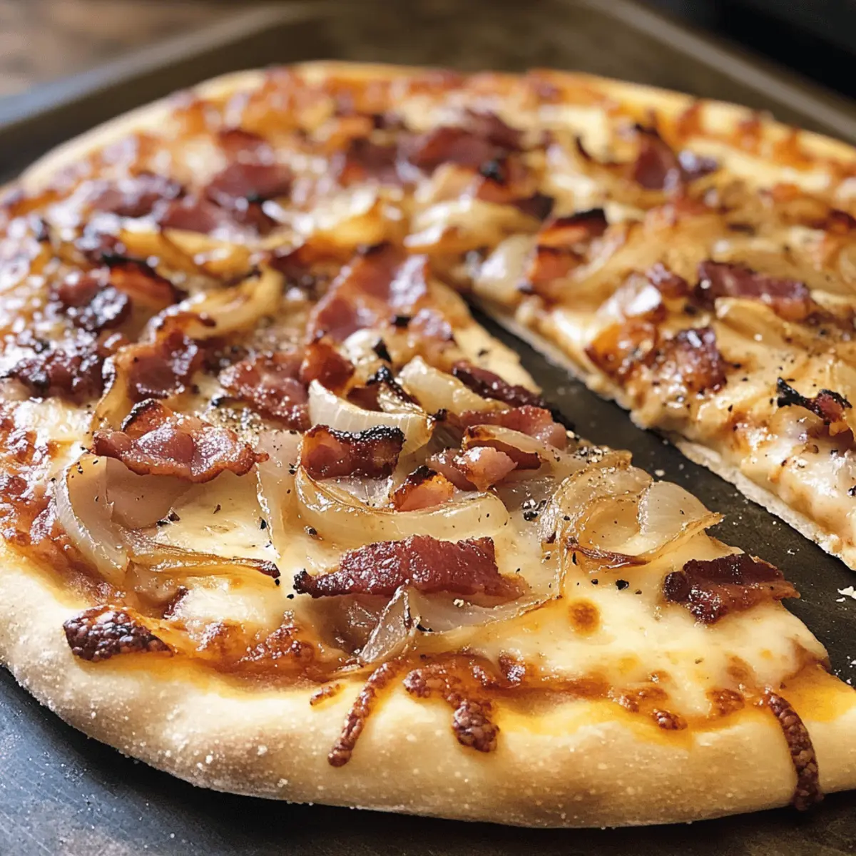 Diese Vollkorn-Bacon-Pizza mit karamellisierten Zwiebeln ist ein köstlicher Genuss voller nostalgischer Aromen und gesunder Zutaten.