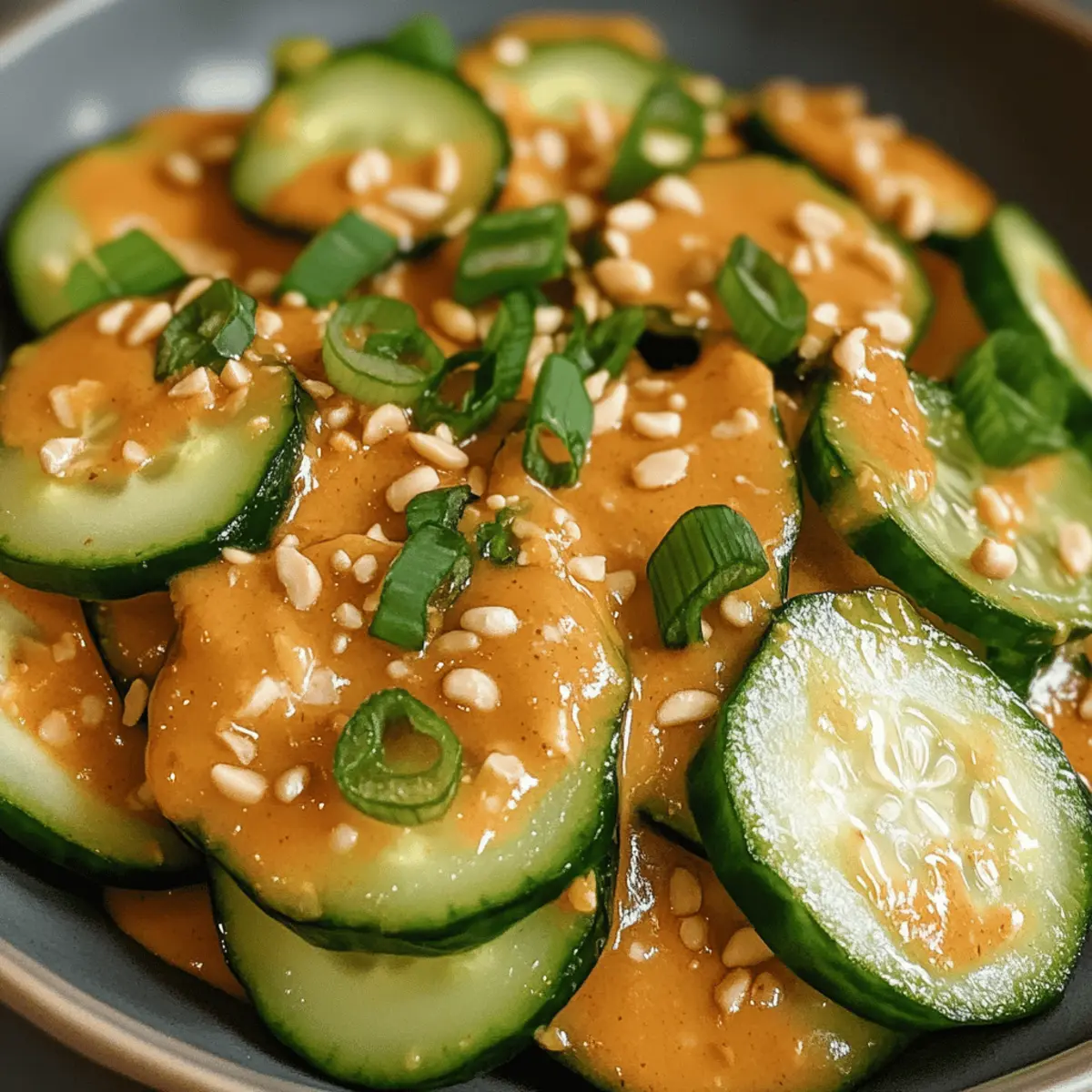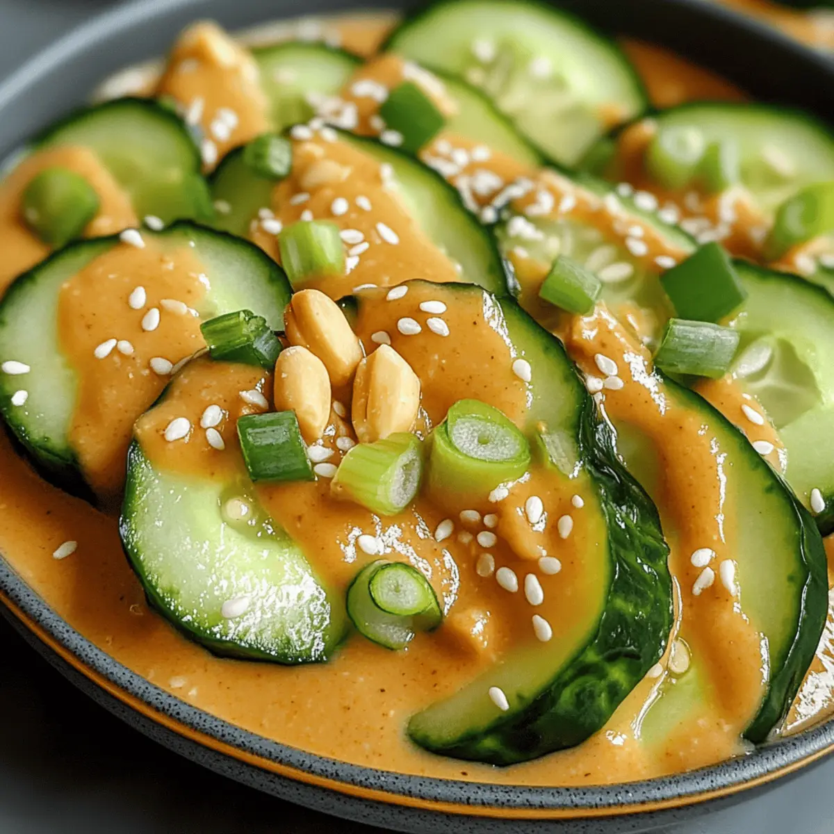 In einem Café in Thailand entdeckte ich einst eine faszinierende Kombination: knusprige Gurken umhüllt von einer würzigen Erdnusssauce. Diese Erfahrung inspirierte mich, ein Rezept für Cucumbers in Spicy Peanut Sauce zu kreieren, das nicht nur erfrischend, sondern auch unglaublich vielseitig ist. Die Mischung aus knackigen, frischen Gurken und einer cremigen, scharfen Sauce macht dieses Gericht zum perfekten Snack oder als Beilage zu jedem Essen. Ein weiteres Plus: Die Zubereitung dauert nur wenige Minuten! Egal, ob für ein Sommer-Barbecue oder ein schnelles Abendessen unter der Woche, dieses Rezept ist ein echter Gewinner. Wer kann da schon widerstehen? Sind Sie bereit, Ihren Gaumen mit dieser köstlichen Kombination zu verwöhnen? Warum werden Sie dieses Rezept lieben? Einfachheit: Die Zubereitung ist kinderleicht und benötigt nur grundlegende Küchenkenntnisse. Frische Aromen: Knackige Gurken treffen auf eine cremige, würzige Erdnusssauce, die jeden Biss zum Erlebnis macht. Vielseitig: Perfekt als Snack, Beilage oder sogar alleine genossen – Sie können das Rezept ganz nach Ihrem Geschmack anpassen! Gesund und nährstoffreich: Vegan, kalorienarm und vollgepackt mit frischem Gemüse, ist dies eine wunderbare Wahl für leichte Mahlzeiten. Schnell: In nur wenigen Minuten zubereitet – ideal für hektische Wochentage oder spontane Gäste. Wie wäre es mit einer Kombination? Probieren Sie dazu unser Kinder Bueno Dessert oder den Crack Frühstücks Slider für ein perfektes Menü! Zutaten für Würzige Erdnusssoße zu frischen Gurken Für den Salat • Englische Gurken – bieten eine frische und knackige Basis für den Salat. Substitution: Persische Gurken sind eine Alternative, können jedoch die Bitterkeit verändern. • Erdnüsse – sorgen für Biss und Nussigkeit. Substitution: Cashew- oder Mandelnüsse können für einen anderen Geschmack verwendet werden. • Weiße Sesamkörner – verbessern den Geschmack und die Präsentation. Hinweis: Toastete Sesamkörner können verwendet oder weggelassen werden. • Frühlingszwiebeln – bringen Frische und einen leicht zwiebeligen Geschmack. Substitution: Schnittlauch ist eine Alternative. • Rote Pfefferflocken – optional für zusätzliche Schärfe. Hinweis: Auch extra Sriracha kann verwendet werden, um die Schärfe zu erhöhen. Für das Dressing • Cremige Erdnussbutter – ist die Hauptzutat im Dressing und verleiht Reichtum. Substitution: Crunchy Erdnussbutter für mehr Textur. • Ahornsirup – fügt Süße hinzu, um die Aromen auszubalancieren. Substitution: Agavendicksaft oder Honig für Nicht-Veganer. • Wasser – reguliert die Dicke und Konsistenz des Dressings. Hinweis: Kaltwasser sorgt für ein glatteres Dressing. • Niedriges Natrium Sojasauce – fügt Umami-Geschmack zum Dressing hinzu. Substitution: Tamari für glutenfreie Option. • Sriracha – sorgt für einen scharfen Kick. Substitution: Jede Chili-Sauce kann je nach Schärfewunsch verwendet werden. • Reisessig – fügt Säure hinzu, um die Aromen aufzuhellen. Substitution: Apfelessig kann ebenfalls verwendet werden. • Sesamöl – bringt einen nussigen Geschmack und Aroma. Substitution: Kann für ein leichteres Dressing weggelassen werden. Schritt-für-Schritt-Anleitung für Würzige Erdnusssoße zu frischen Gurken Step 1: Gurken vorbereiten Schneiden Sie die englischen Gurken dünn und legen Sie sie in eine große Schüssel. Achten Sie darauf, gleichmäßige Scheiben zu schneiden, um eine schöne Textur zu gewährleisten. Etwa 5 Minuten reichen aus, um dies zu erledigen. Step 2: Knusprige Zutaten hinzufügen Hacken Sie die Erdnüsse grob und streuen Sie sie zusammen mit den weißen Sesamkörnern und den gehackten Frühlingszwiebeln in die Schüssel mit den Gurken. Für einen zusätzlichen Schärfekick können Sie rote Pfefferflocken hinzufügen. Diese Mischungen sorgen für eine knusprige Textur, die Ihrer Salatkreation Leben einhaucht. Step 3: Dressing zubereiten In einer separaten Schüssel die cremige Erdnussbutter, den Ahornsirup, das Wasser, die Sojasauce, die Sriracha, den Reisessig und das Sesamöl vermischen. Mit einem Schneebesen gut vermengen, bis die Mischung glatt und cremig ist. Dieser Schritt sollte etwa 3-5 Minuten in Anspruch nehmen und zaubert das würzige Dressing für Ihren Gurkensalat. Step 4: Kombinieren Gießen Sie das Dressing über die Gurkenmischung in der großen Schüssel. Verwenden Sie eine Zange oder einen großen Löffel, um alles sanft zu vermengen, und stellen Sie sicher, dass alle Zutaten gut mit dem Dressing umhüllt sind. Dies sollte nicht länger als 2 Minuten dauern. Step 5: Garnieren und Servieren Bestreuen Sie den Salat mit zusätzlichen Sesamkörnern und Frühlingszwiebeln als Garnitur. Servieren Sie den Salat sofort oder lassen Sie ihn für 10-15 Minuten im Kühlschrank ziehen, damit sich die Aromen intensivieren. Egal, ob Sie ihn frisch genießen oder vorbereitet haben, dieser Würzige Erdnusssoße zu frischen Gurken wird ein Hit sein! Was passt zu Würziger Erdnusssoße zu frischen Gurken? Frische und köstliche Aromen erwarten Sie, wenn Sie diese erfrischende Kombination für Ihr nächstes Essen zusammenstellen. Gegrillte Garnelen: Die zarten, rauchigen Aromen der Garnelen harmonieren perfekt mit dem würzigen Dressing und machen Ihr Gericht noch raffinierter. Reisnudelsalat: Ein leichter Reisnudelsalat mit frischem Gemüse ergänzt die Gurken und bietet zusätzlich eine sättigende Komponente für Ihr Essen. Mango-Salat: Süße, saftige Mangostücke bringen einen herrlichen Kontrast zu der scharfen Erdnusssoße und bereichern die Geschmackserlebnisse. Röster-Wrapp: Verwenden Sie das Salatmix als Füllung in einem Wrap mit frischem Gemüse, um eine tragbare Mahlzeit voller Geschmack und Textur zu genießen. Limettenwasser: Ein kühles Getränk mit frischem Limettensaft bringt Erfrischung und unterstreicht die Aromen des Salats, während es gleichzeitig hydratisiert. Kokosnuss-Kekse: Diese weichen Keks